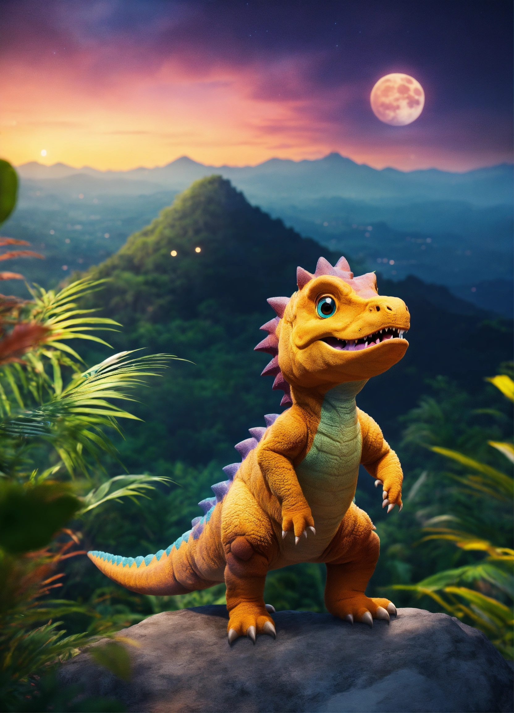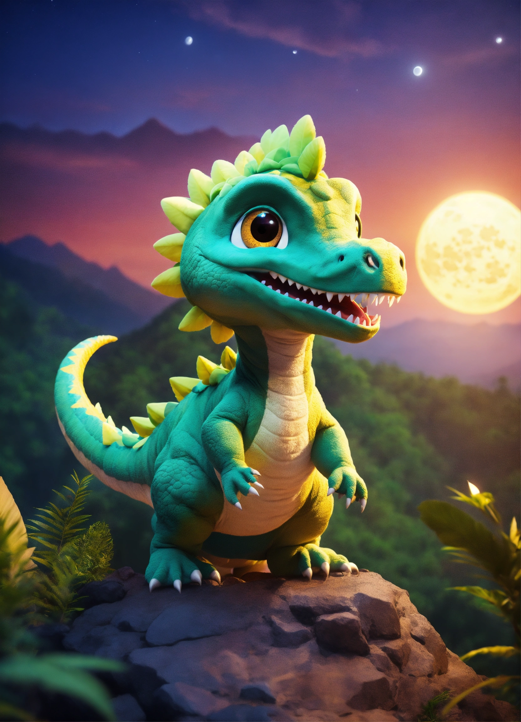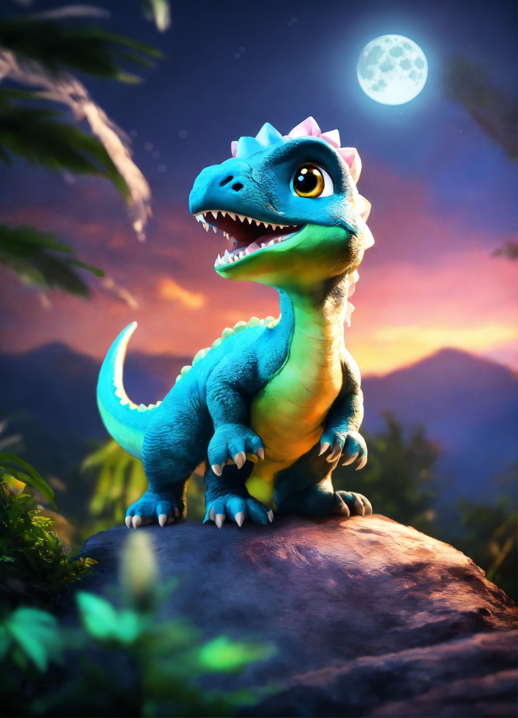 An adorable and fluffy baby t-res dinosaur with big color eyes, roaring on the top of a mountain with jungle in the background, with soft feathers, night and full moon background, with blur background, high quality, 8k