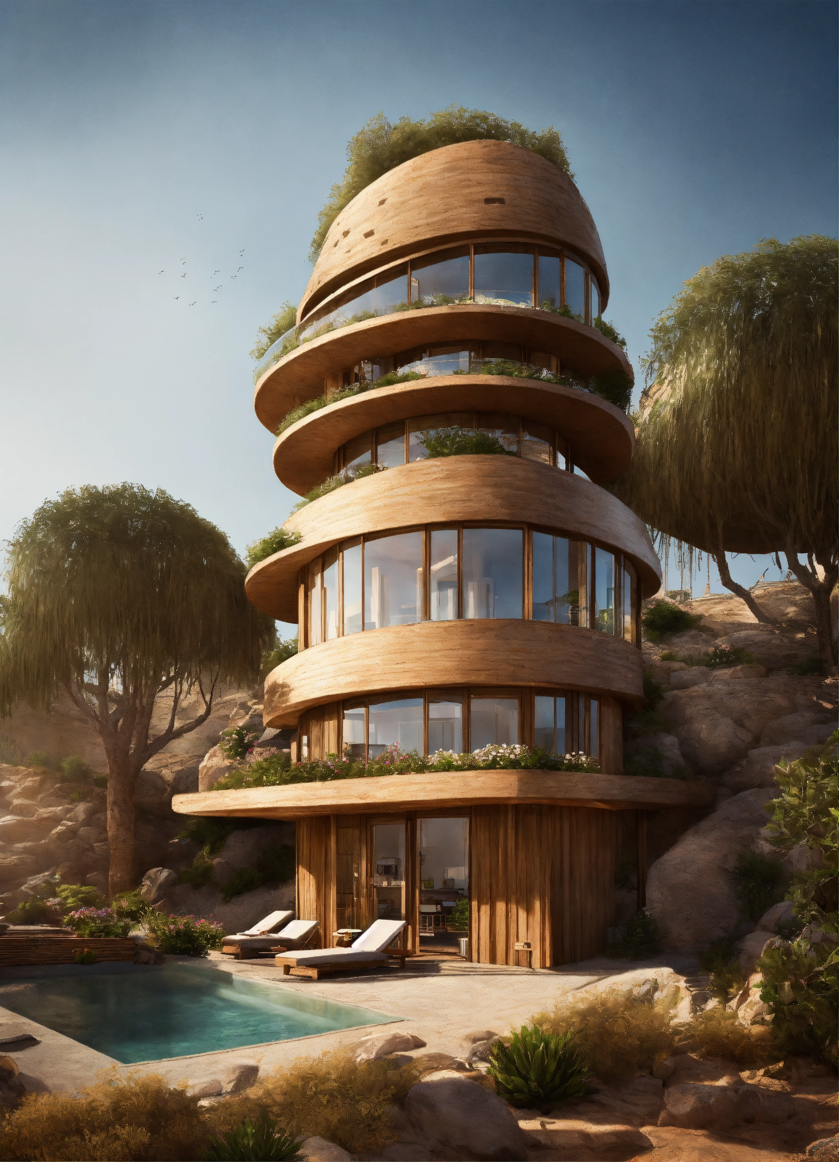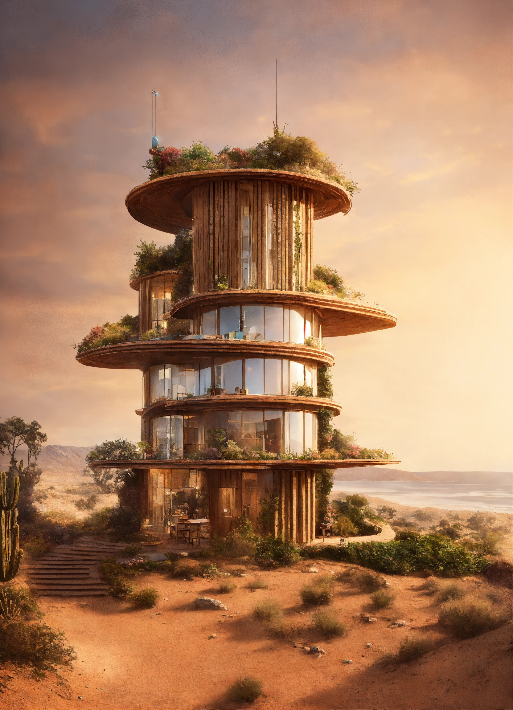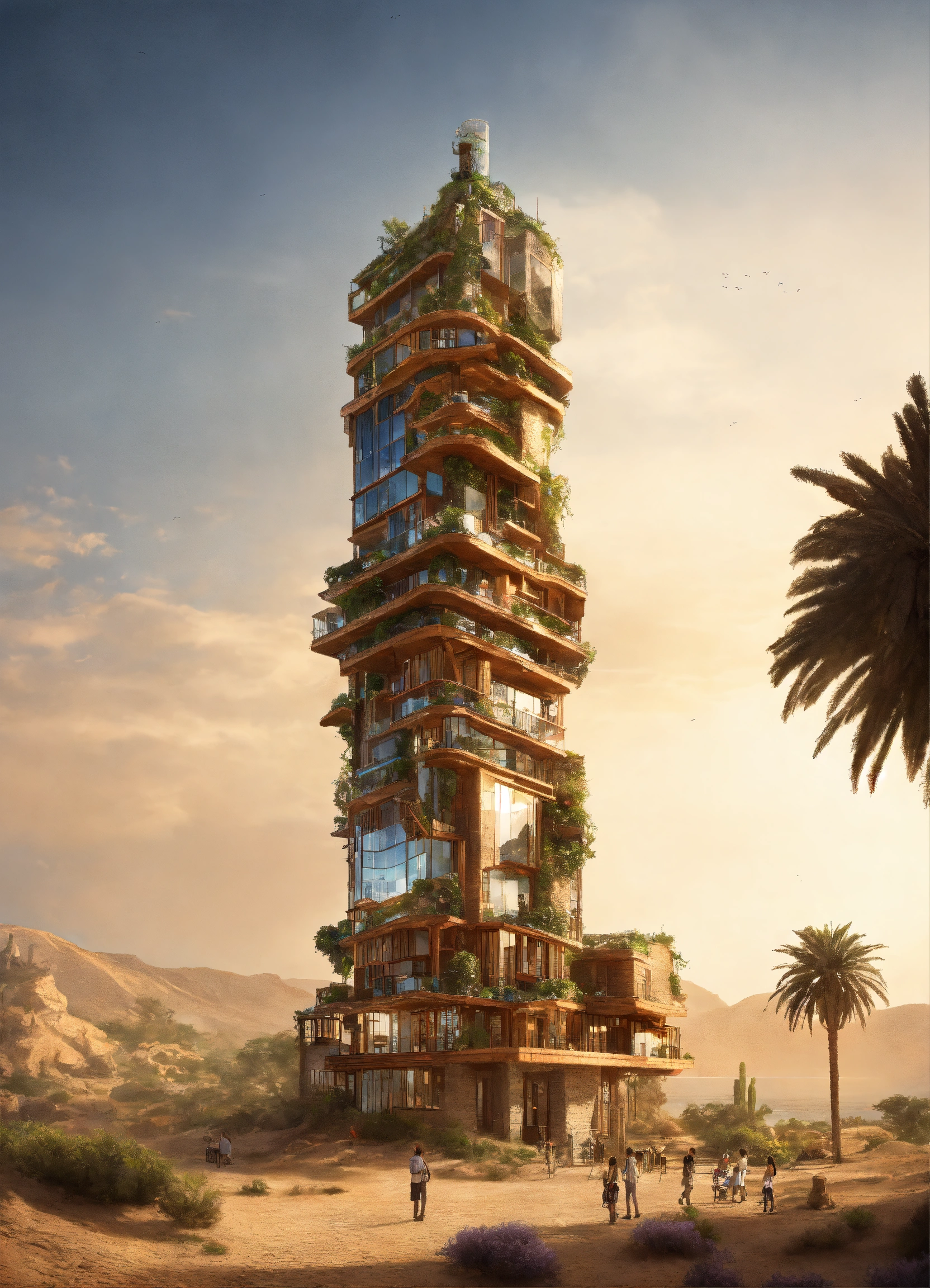 A side view, a futuristic tower hosting town houses inside with gardens, with wood and stone, at the desert bu the sea.