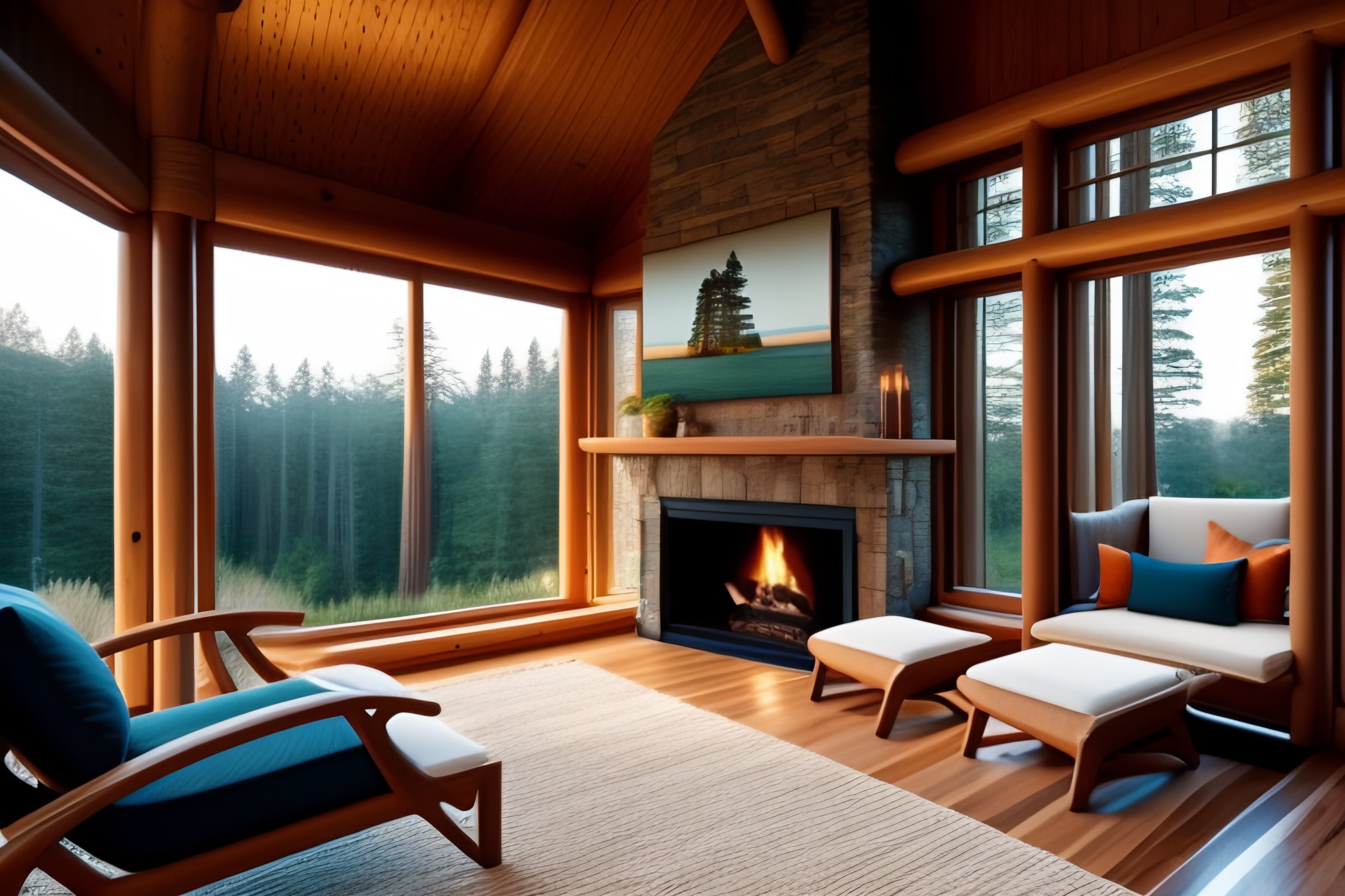 Reading nook with bookshelves and fireplace overlooking redwood forest