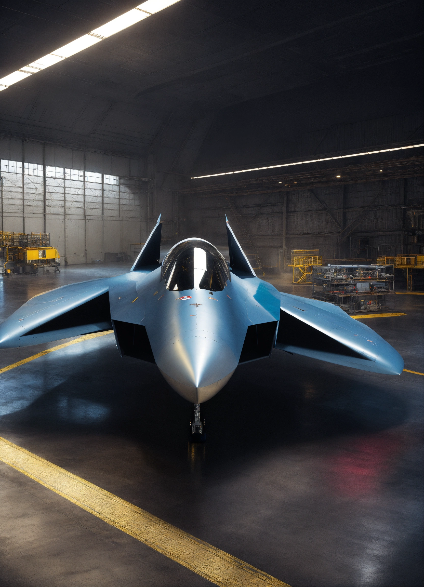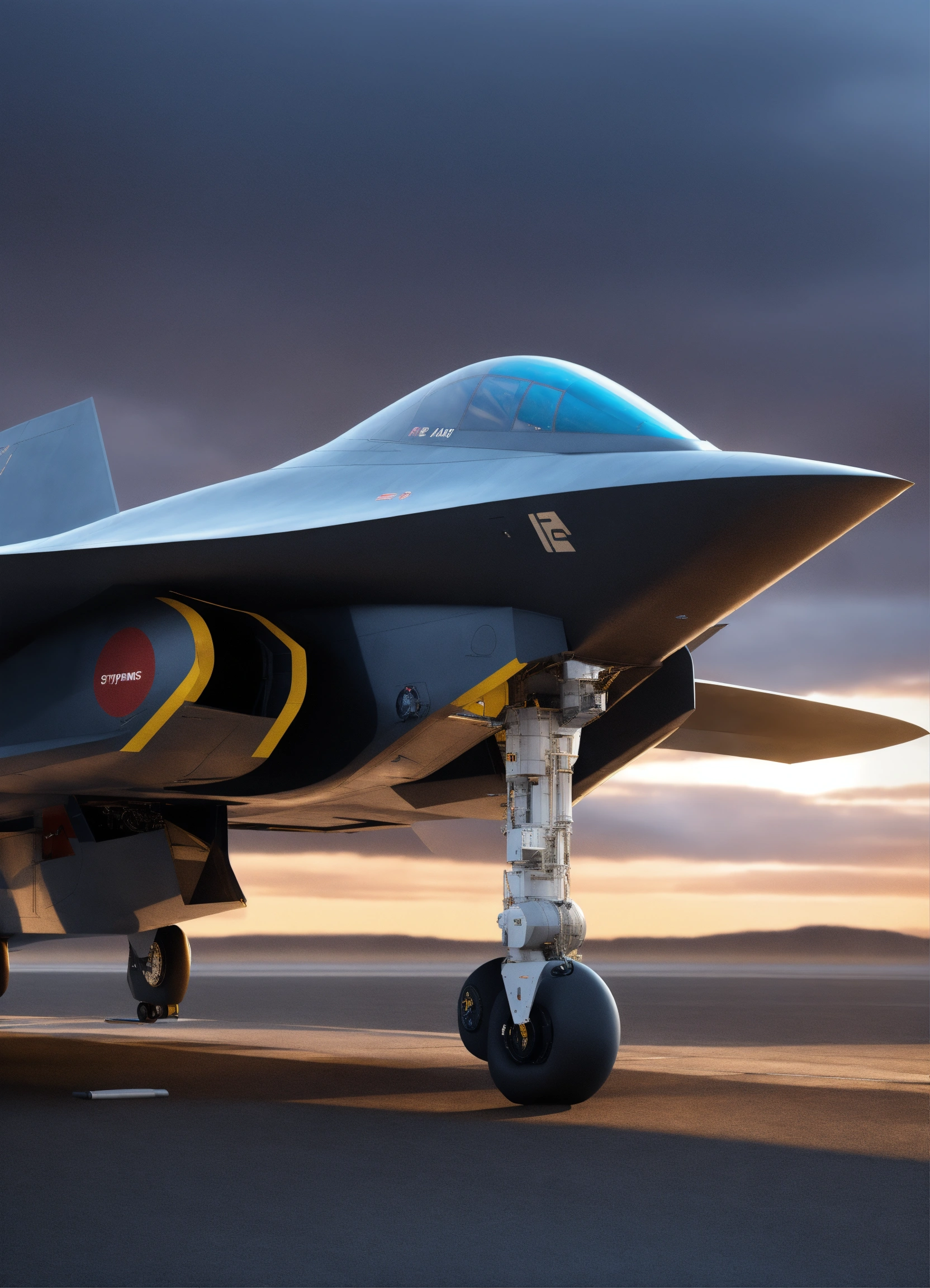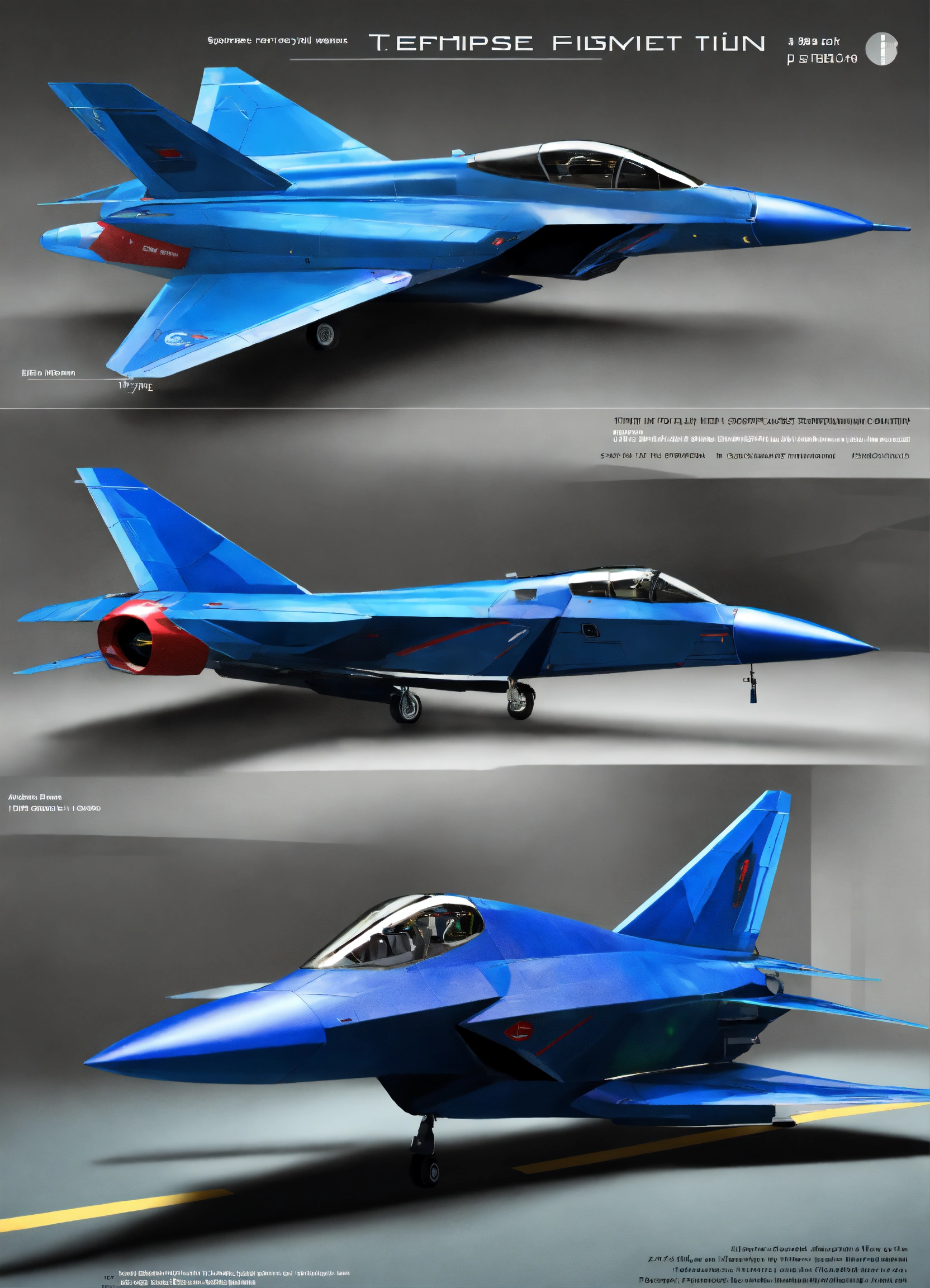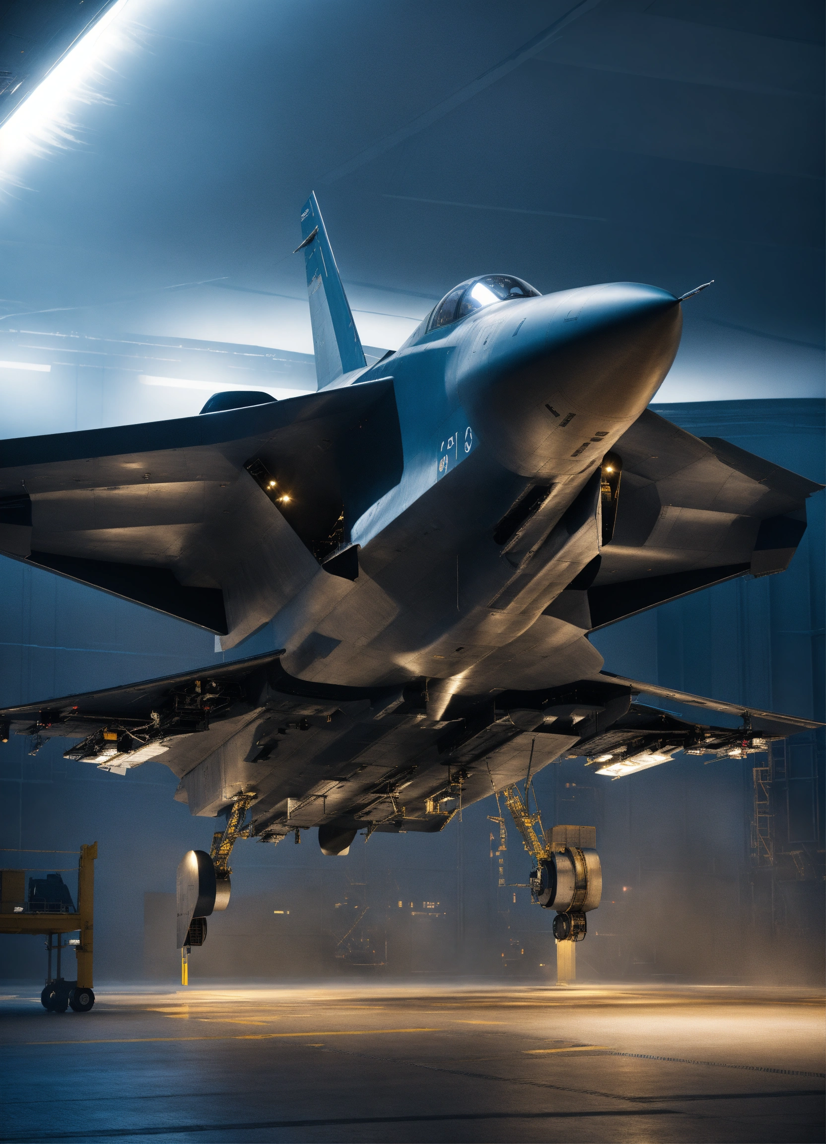 Generate an image of a spaceship resembling a bae systems tempest fighter jet. the spaceship should be viewed at an angle from the bottom left, with the entire craft visible. the bottom half of the spaceship should have a sleek, dark blue shiny metal texture, while the top half should be a light blueish-grey. the spaceship's ramp should be depicted as open and resting on the floor