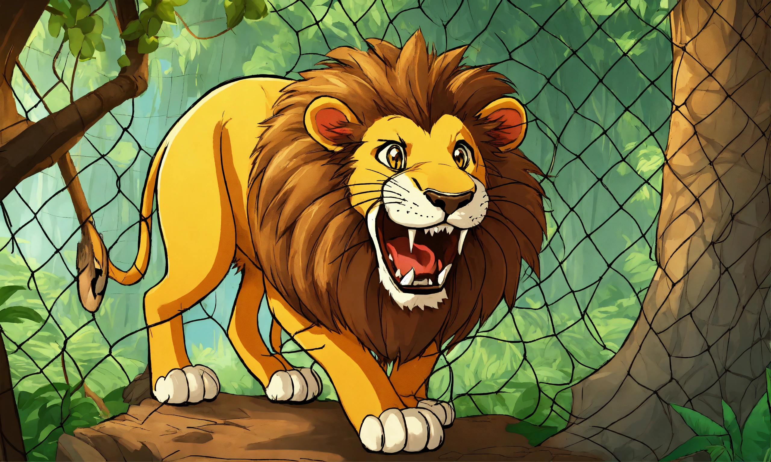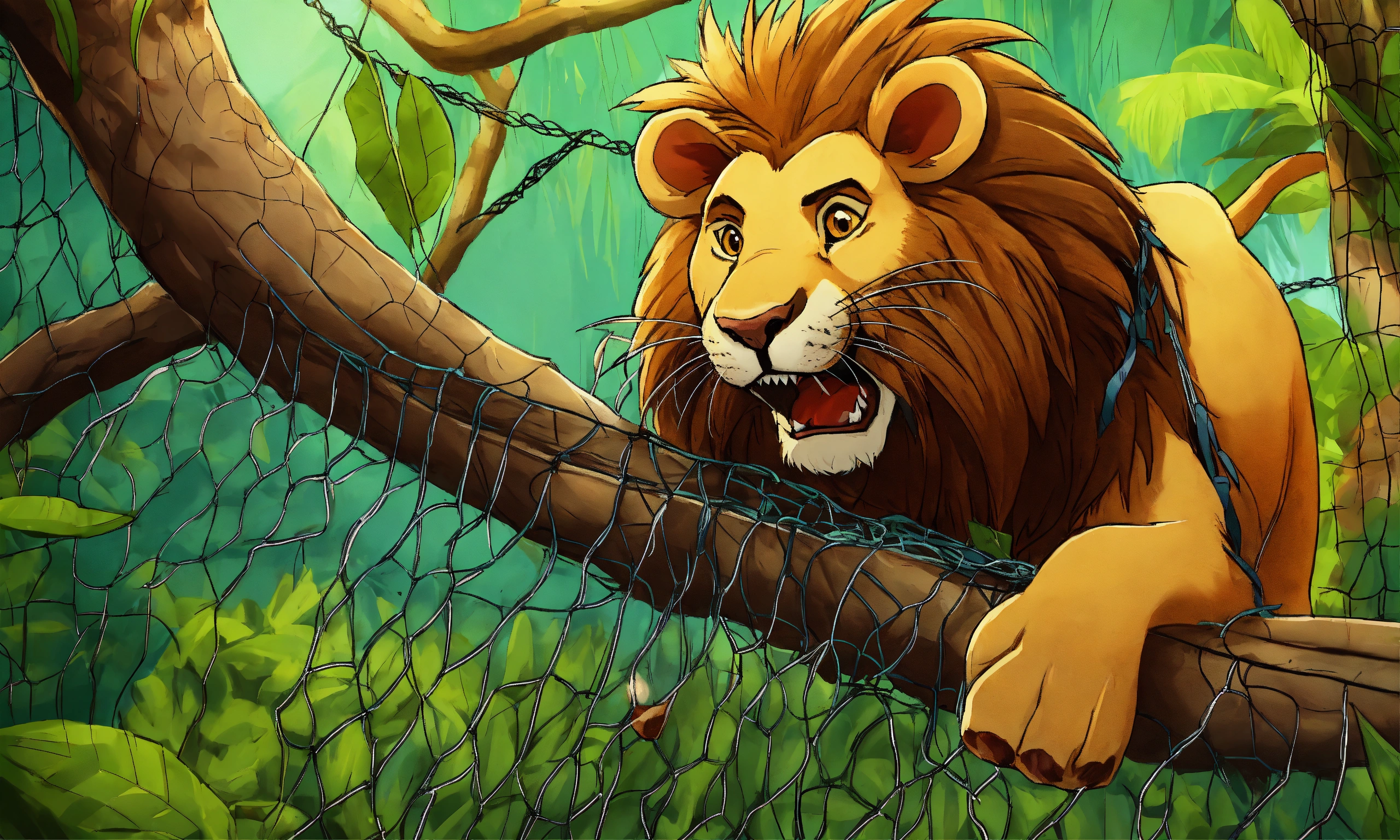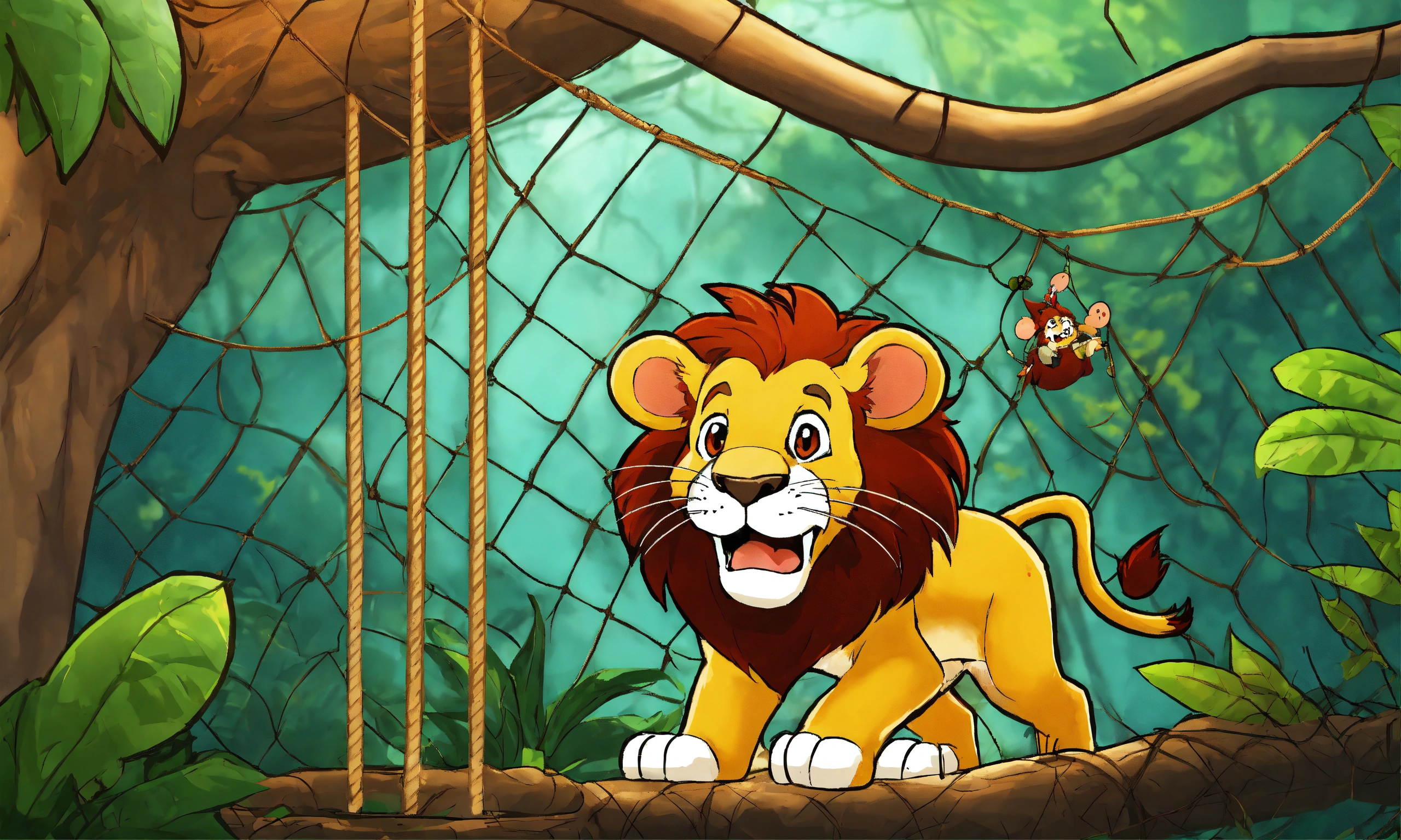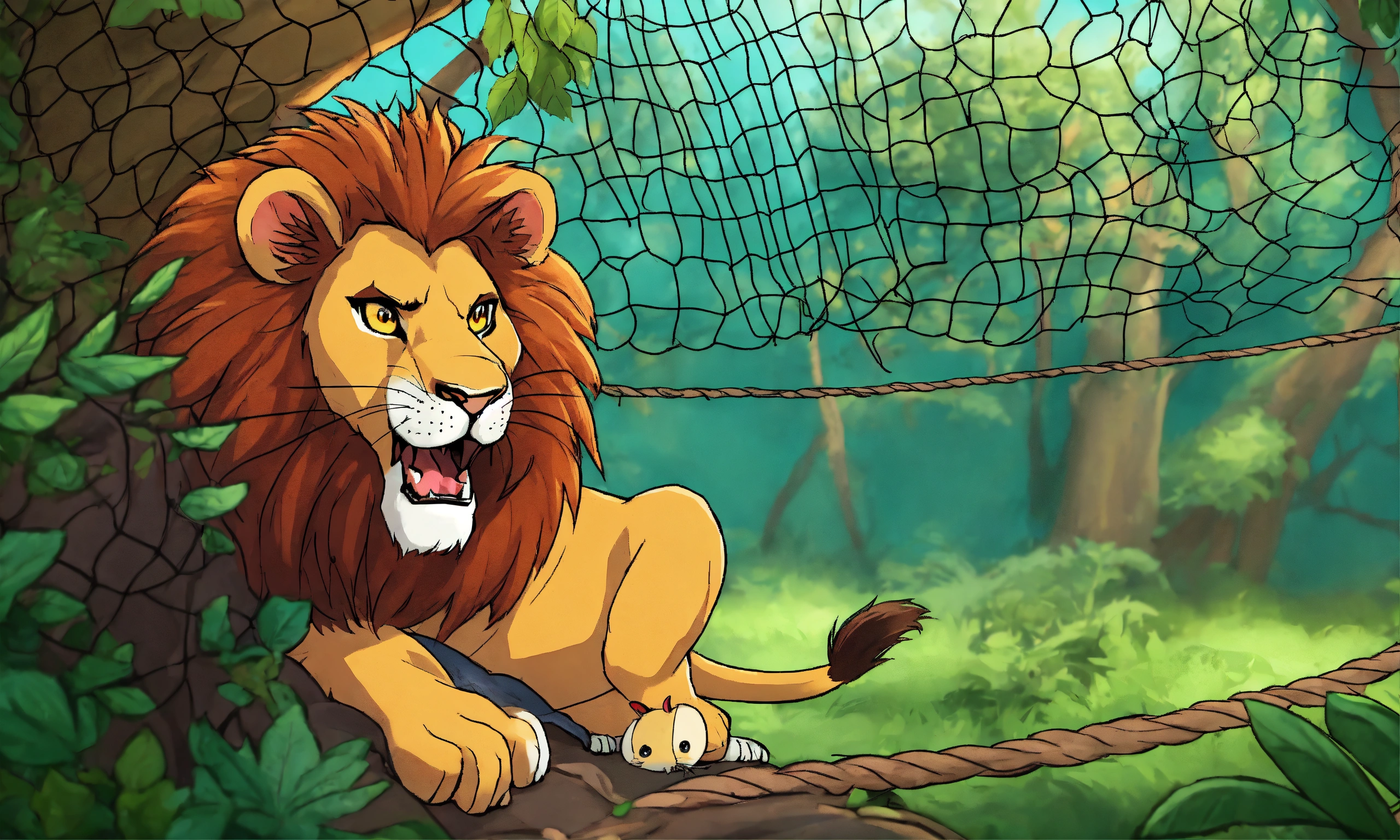 Cartoon big lion was captured and trapped in a net and hang to the tree and with mouse sharp teeth, the mouse nibbled through the net in jungle