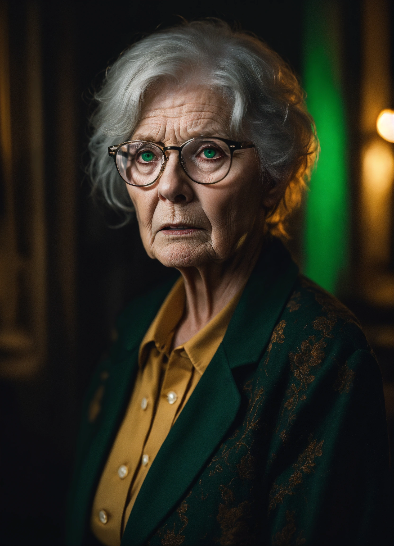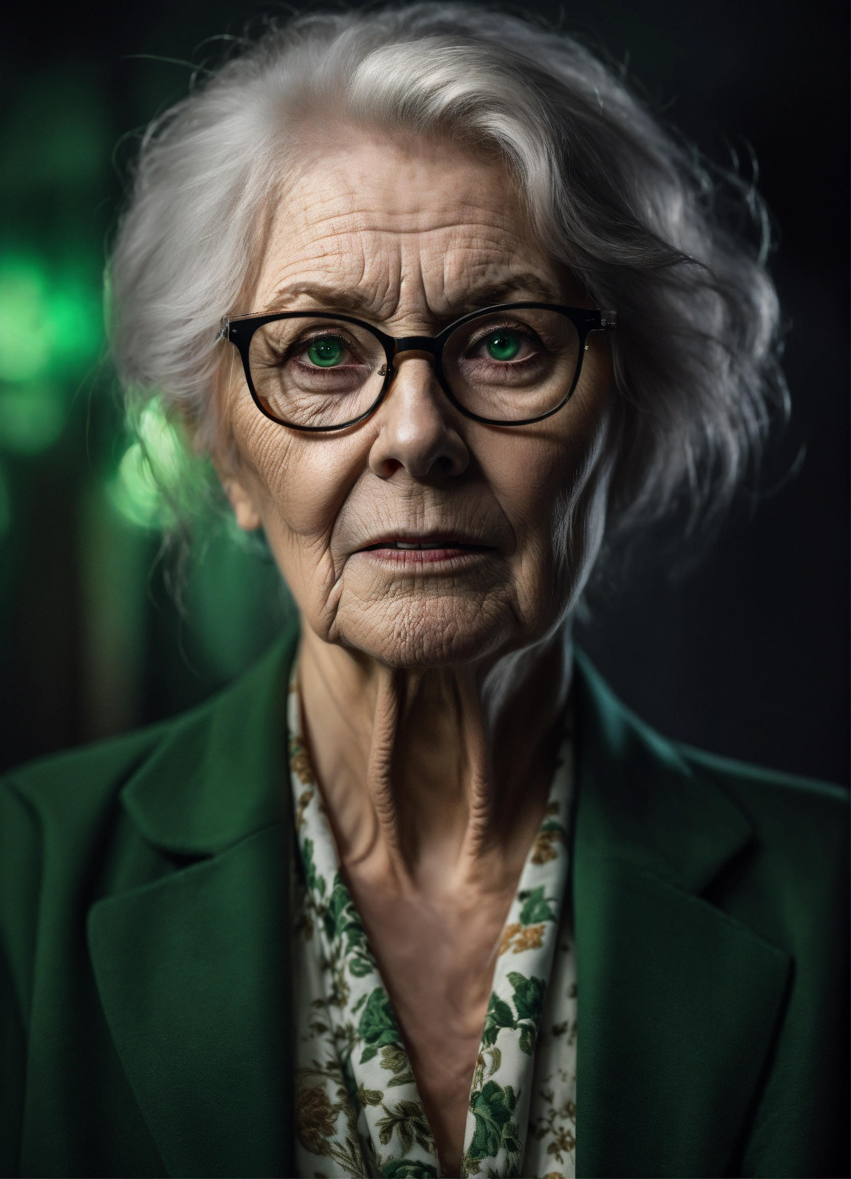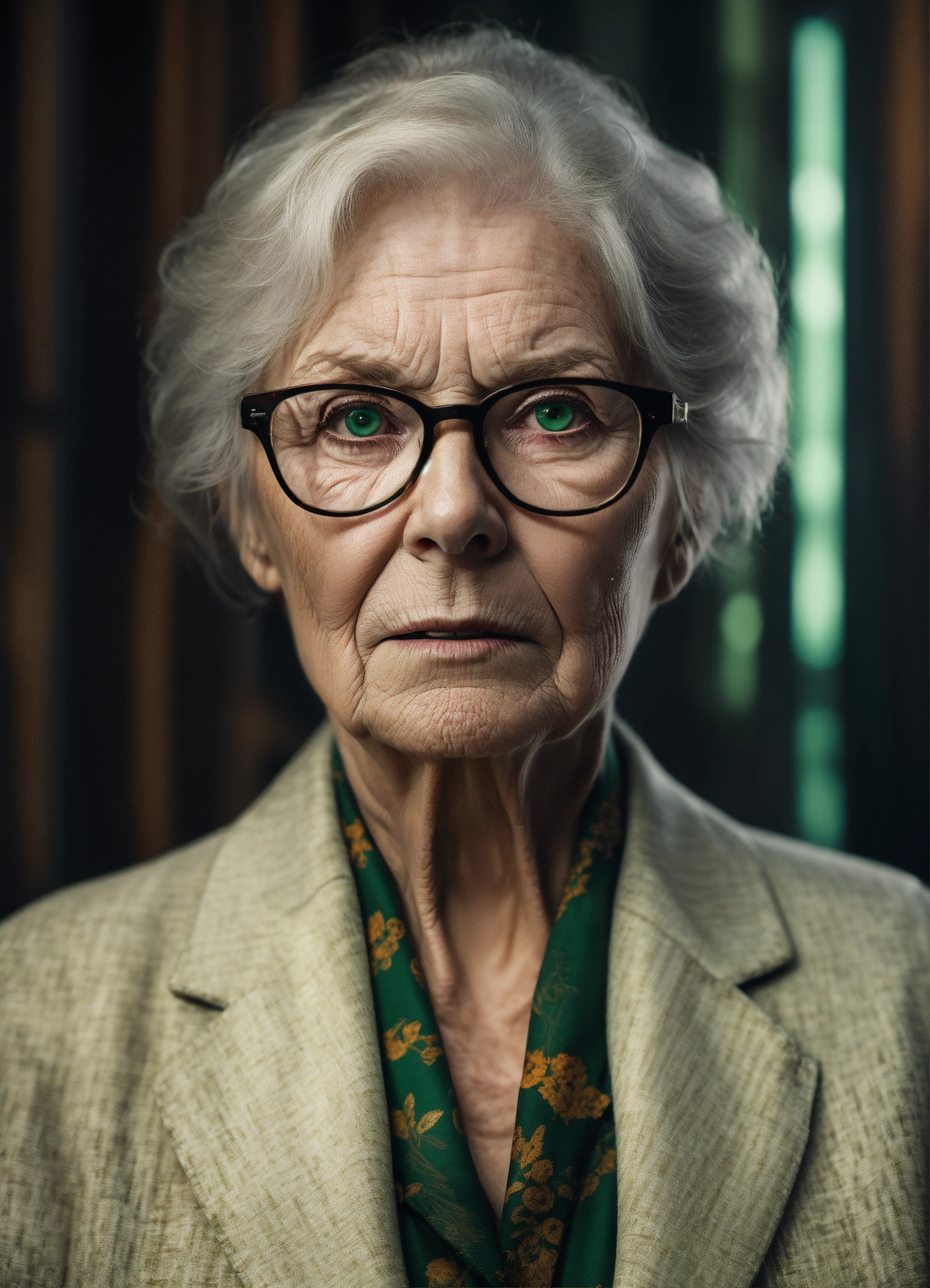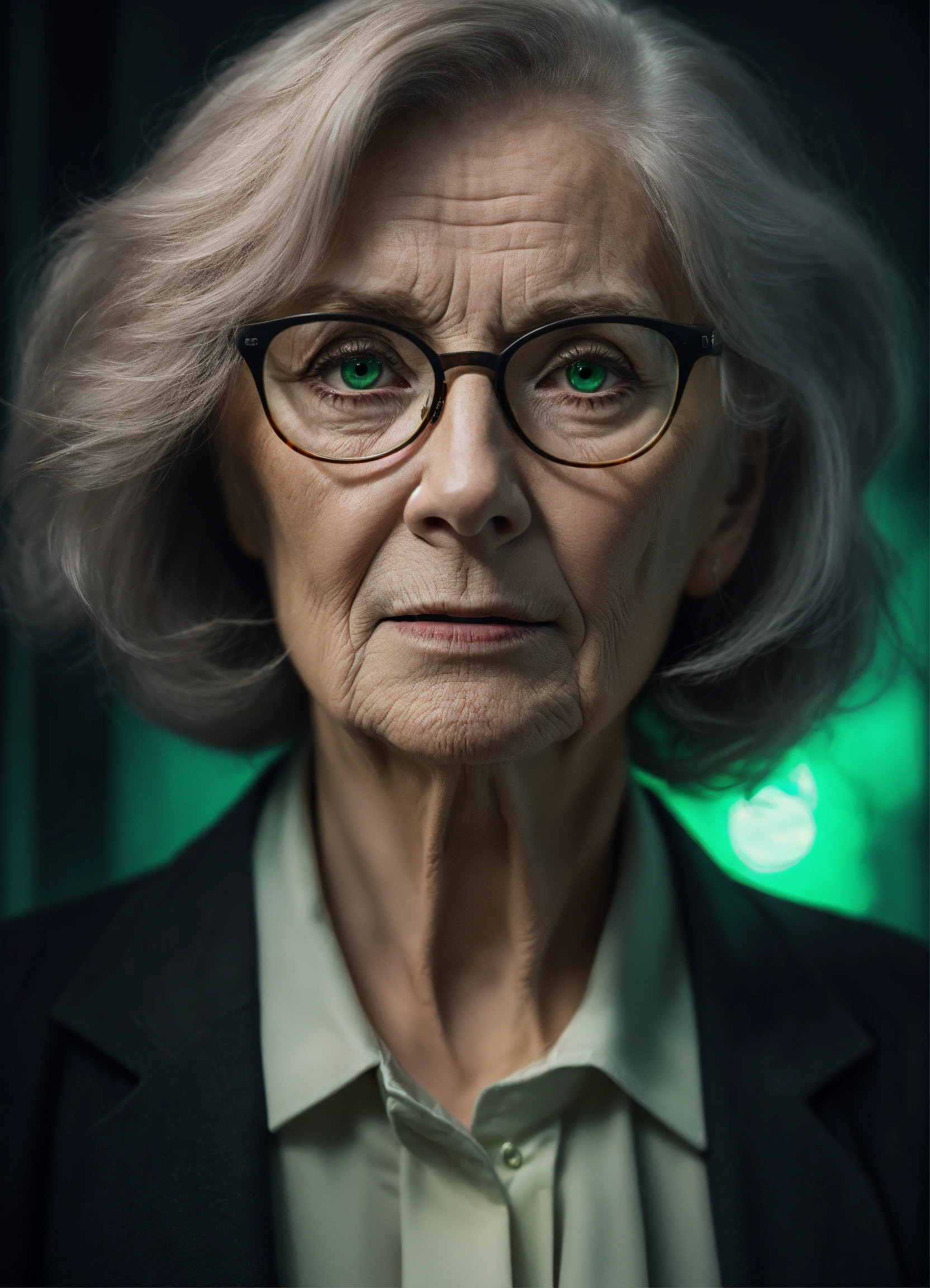 A realistic photograph of a scary white 70-year-old woman, with an intimidating scary serious expression, dark green eyes, scary face, with ginger gray hair, with glasses, wearing a black blazer, very dramatic illumination, hyperdetailed, hyperrealistic, 8 k