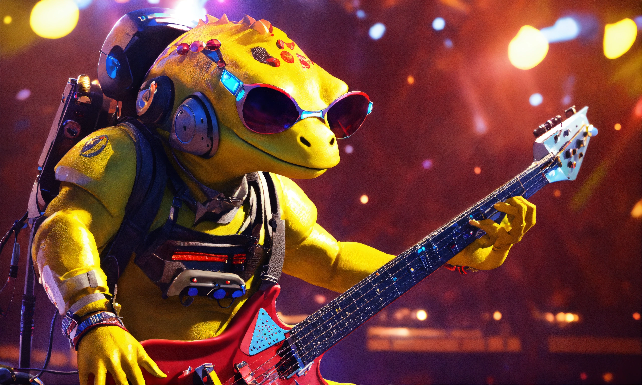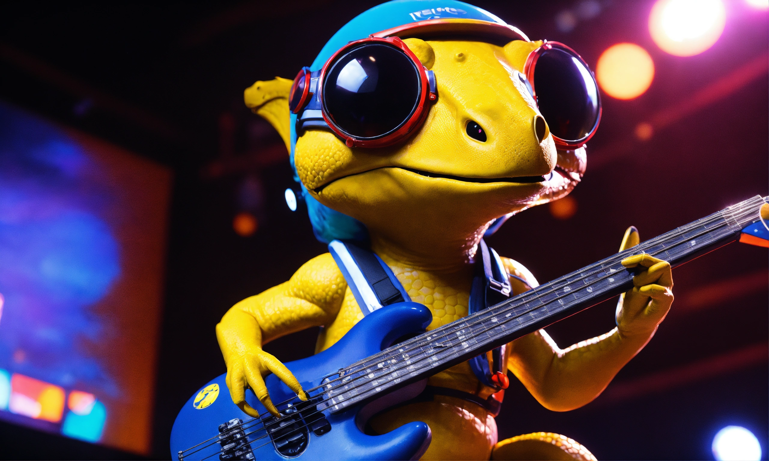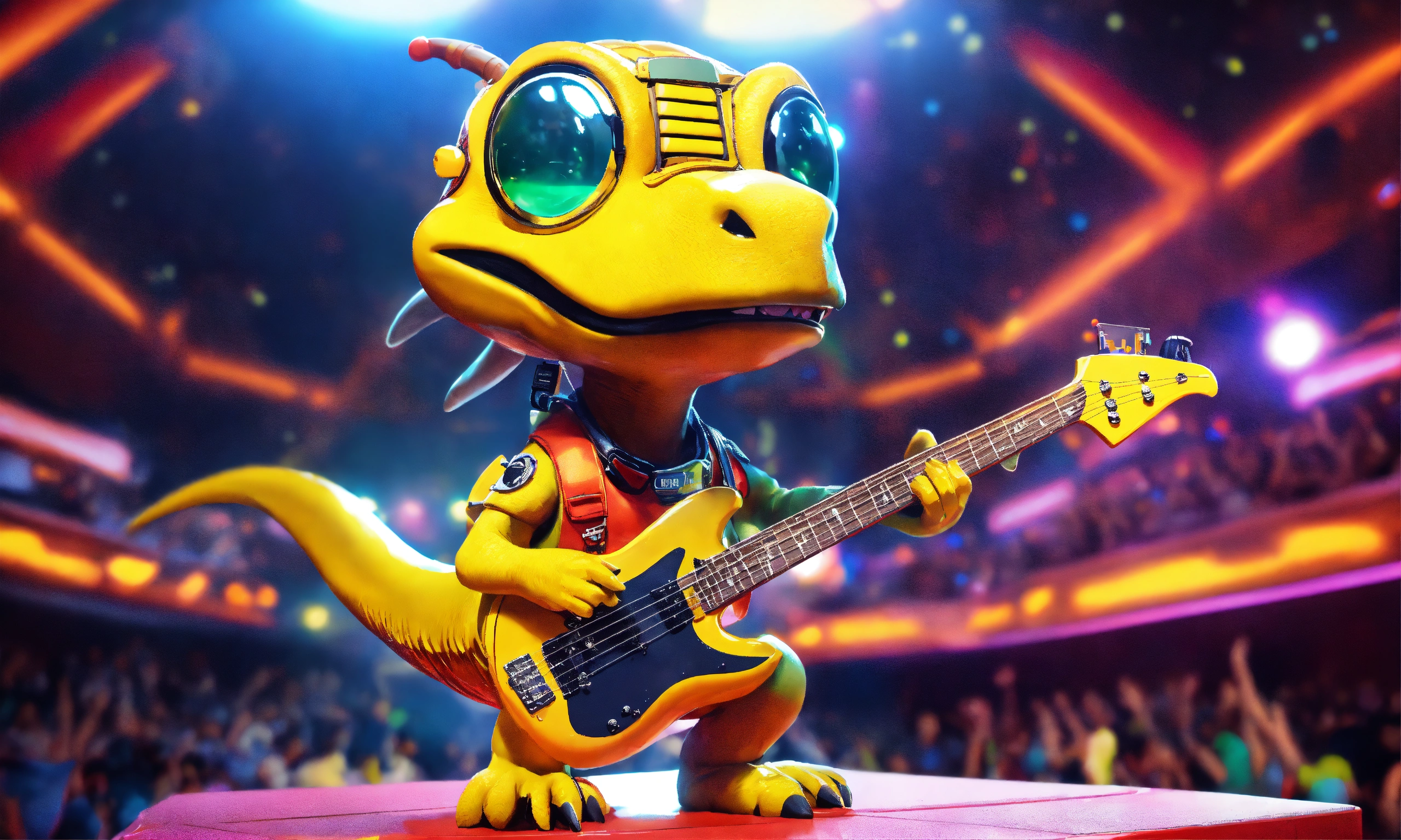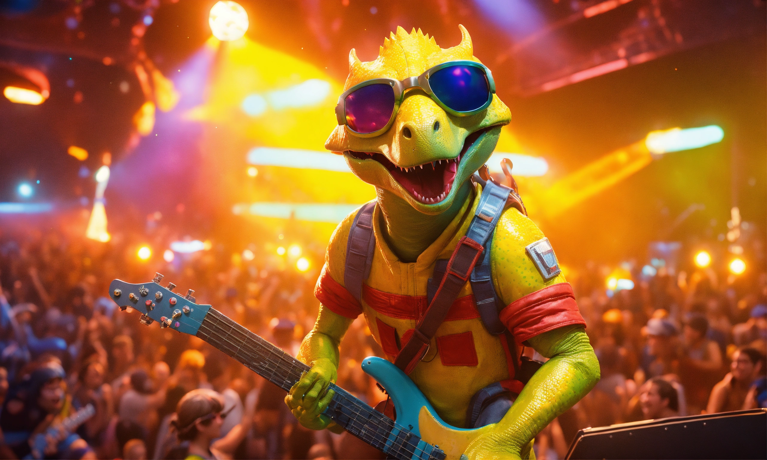 Close up on 1000 lb lovable fun yellow alien cartoon dinosaur with red spots and space gear, he wearing cool sun glasses, playing a hi tech space bass blaster with his band on stage at a concert on venus, its like a rave with all types of humanoids and alien creatures dancing and enjoying the music, pixar, unreal engine