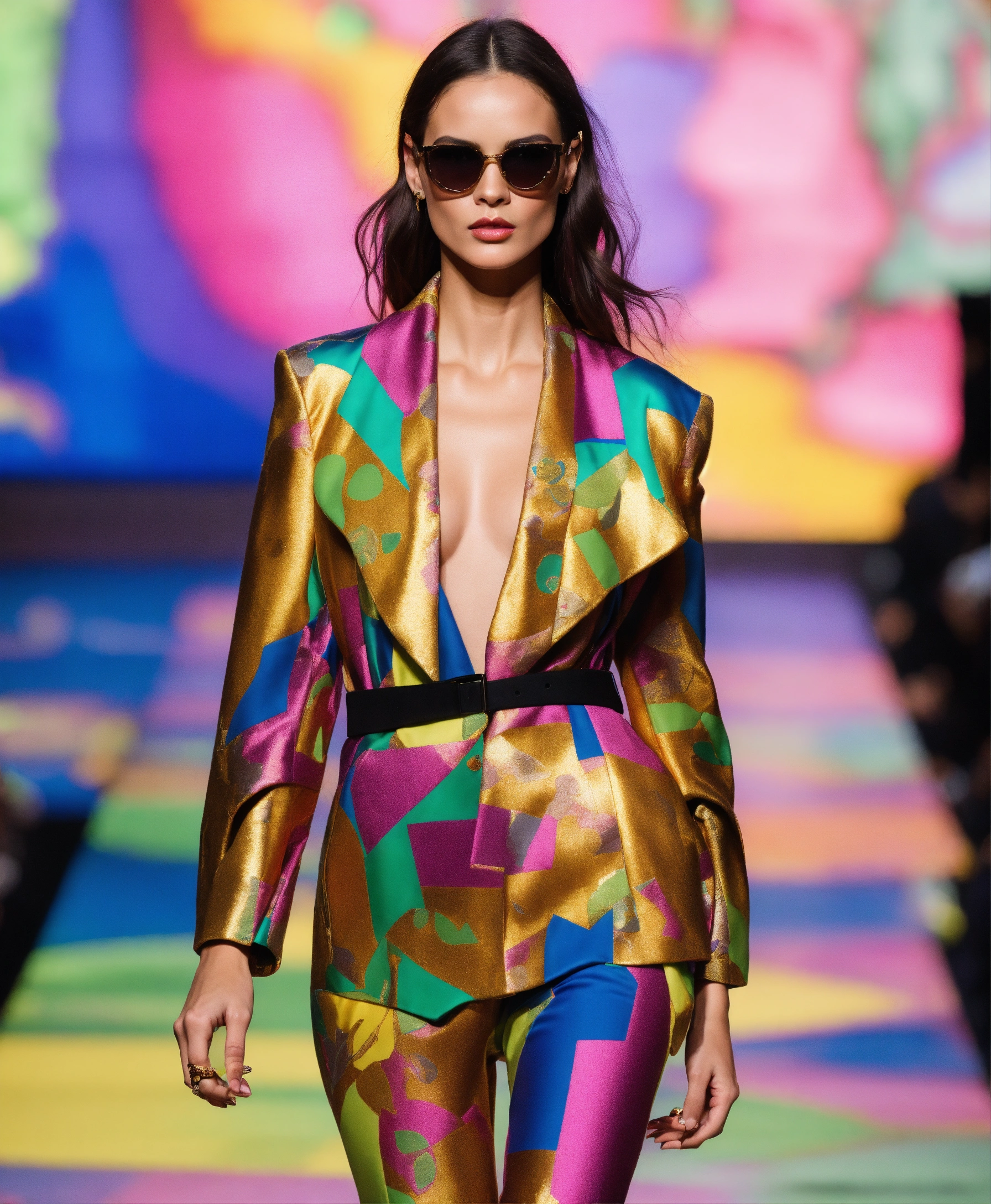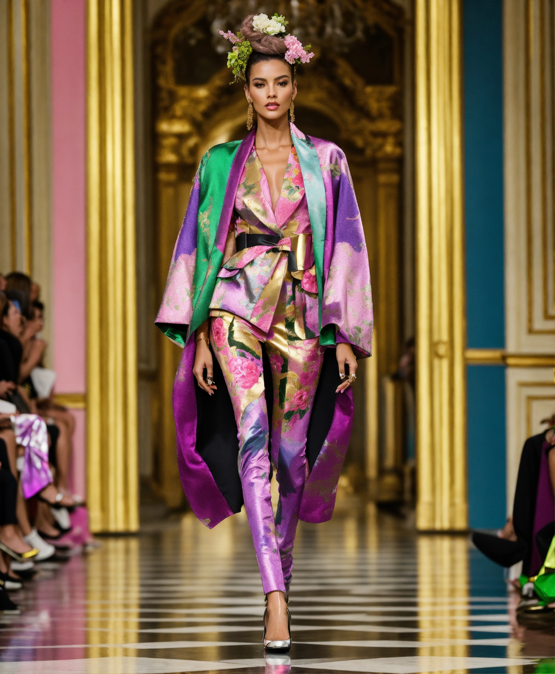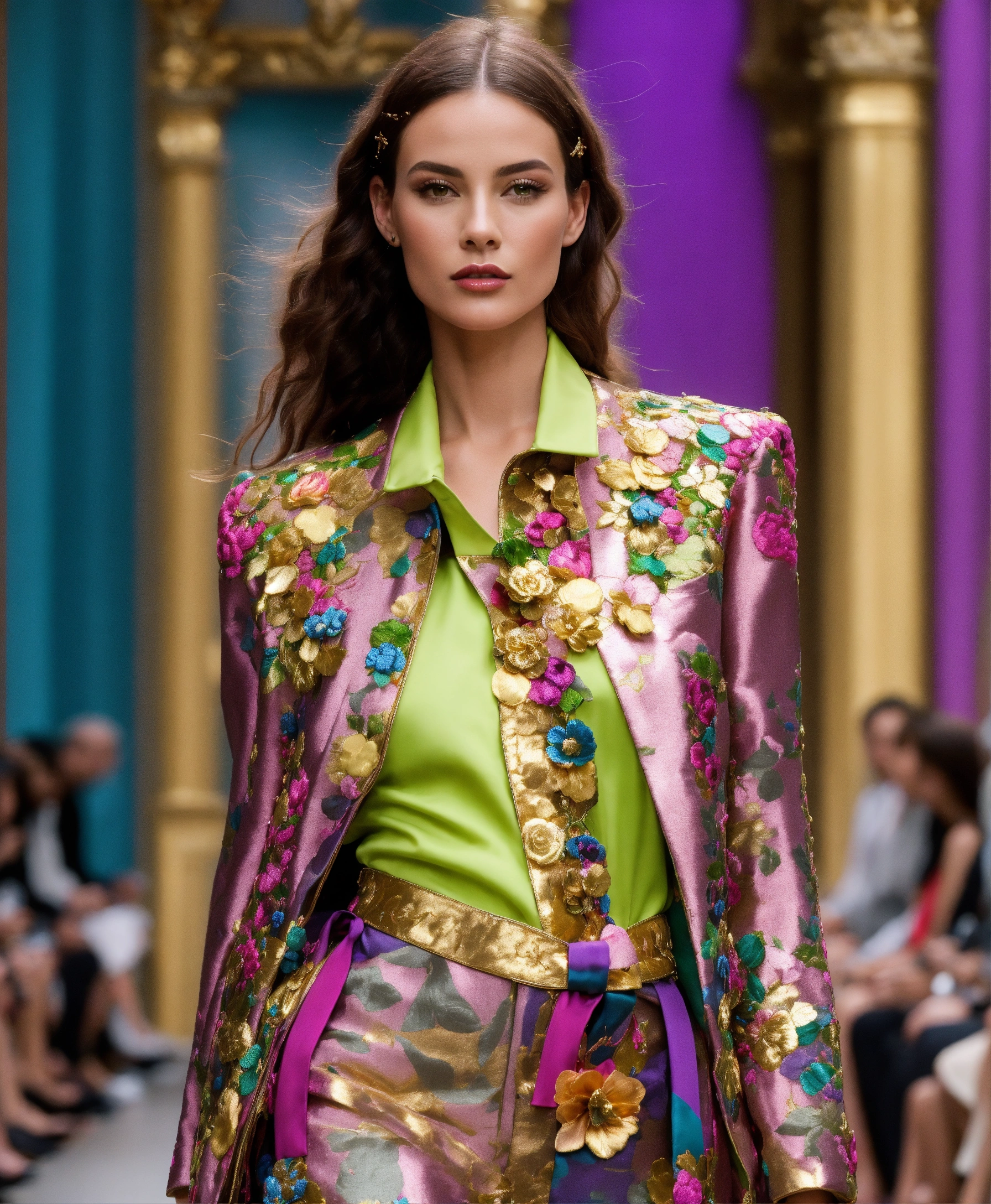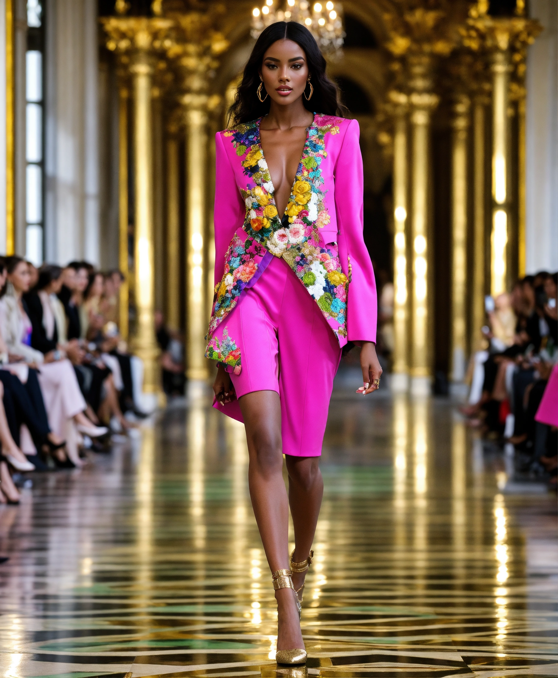 Ultra realistic full body photo of a chic french model walking the runway modeling summer designer novelty interesting complex unusual street sporty classy modern dolman sleeve outfit brave, paris versailles details cutouts and and gold geometric pattern floral structured tailored jacket pink gold green lilac peridot silver magenta lime fuchsia yellow blue black gray copper mauve bronze haute couture ultimate elegance beautiful luxurious awesome wealthy resplendent magnificent sublime 12k
