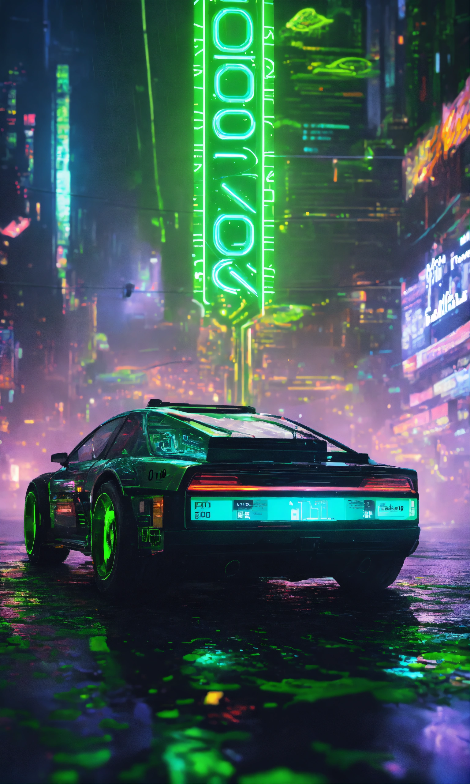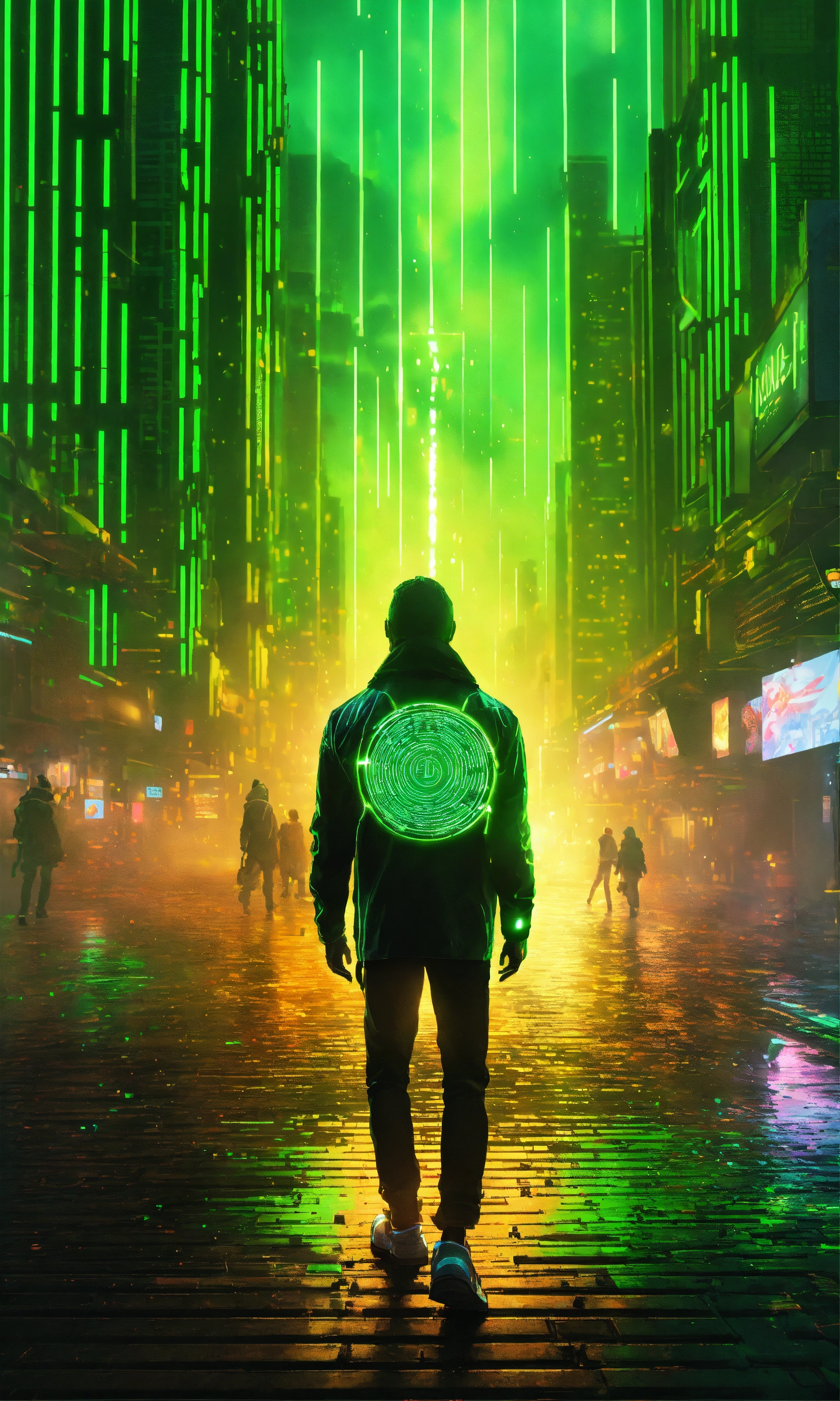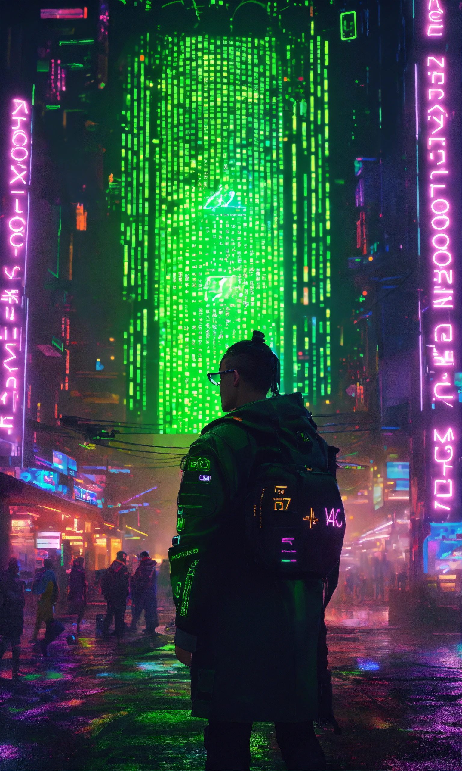 Text text male half android, green and black futuristic, cyberpunk coder, cutting-edge software for mathematical analysis of football games. immersed in a neon-lit futuristic ambient with lots of computer. lightning bolts are emanating from its eyes as it skillfully operates a computer, processing intricate statistics and data related to football matches. in the background, a mesmerizing rain of binary code, displaying '010101' patterns, falls from the sky, creating a matrix-style atmosphere. the image is in 8k resolution, hyper-realistic, and hyper-detailed. the neon lights cast vibrant glows on the android's figure, and volumetric lighting enhances the cyberpunk ambiance.