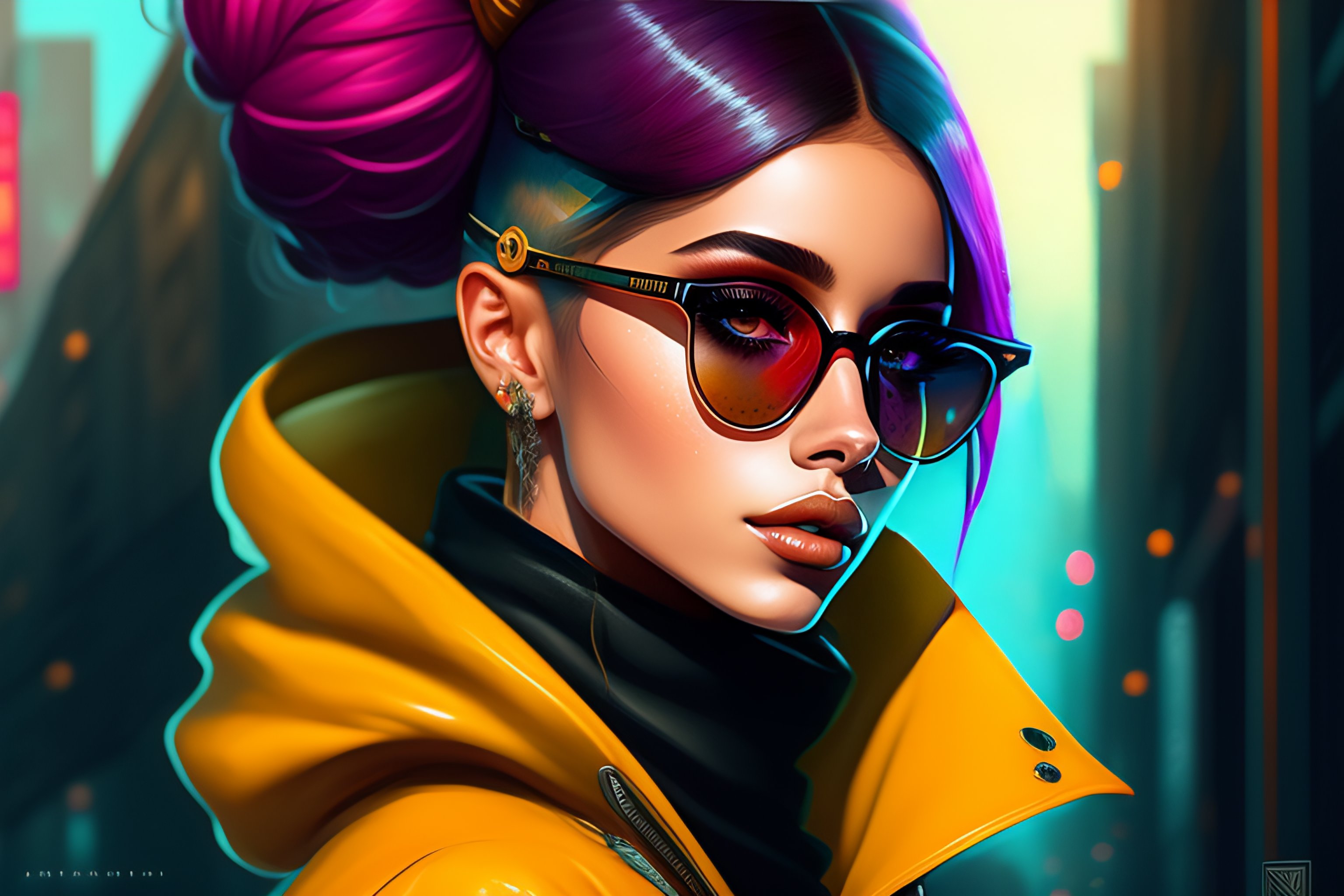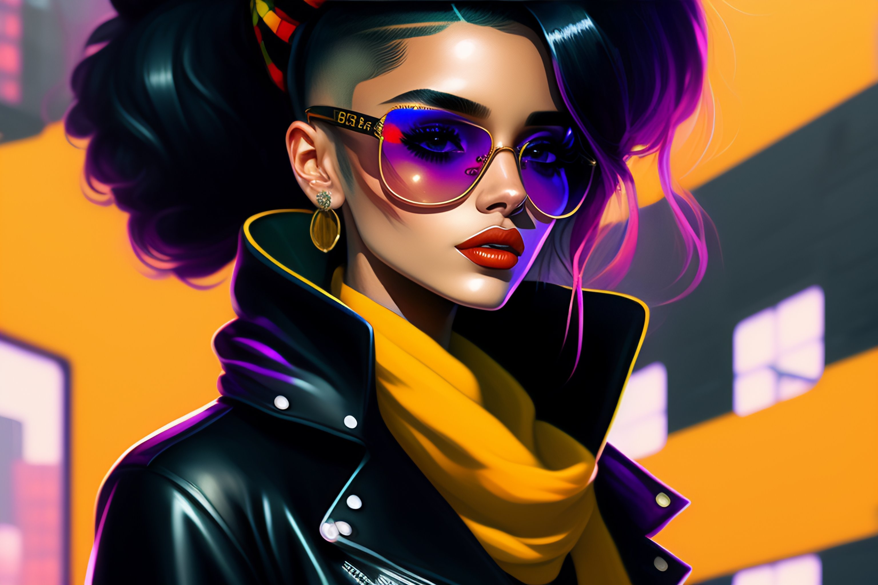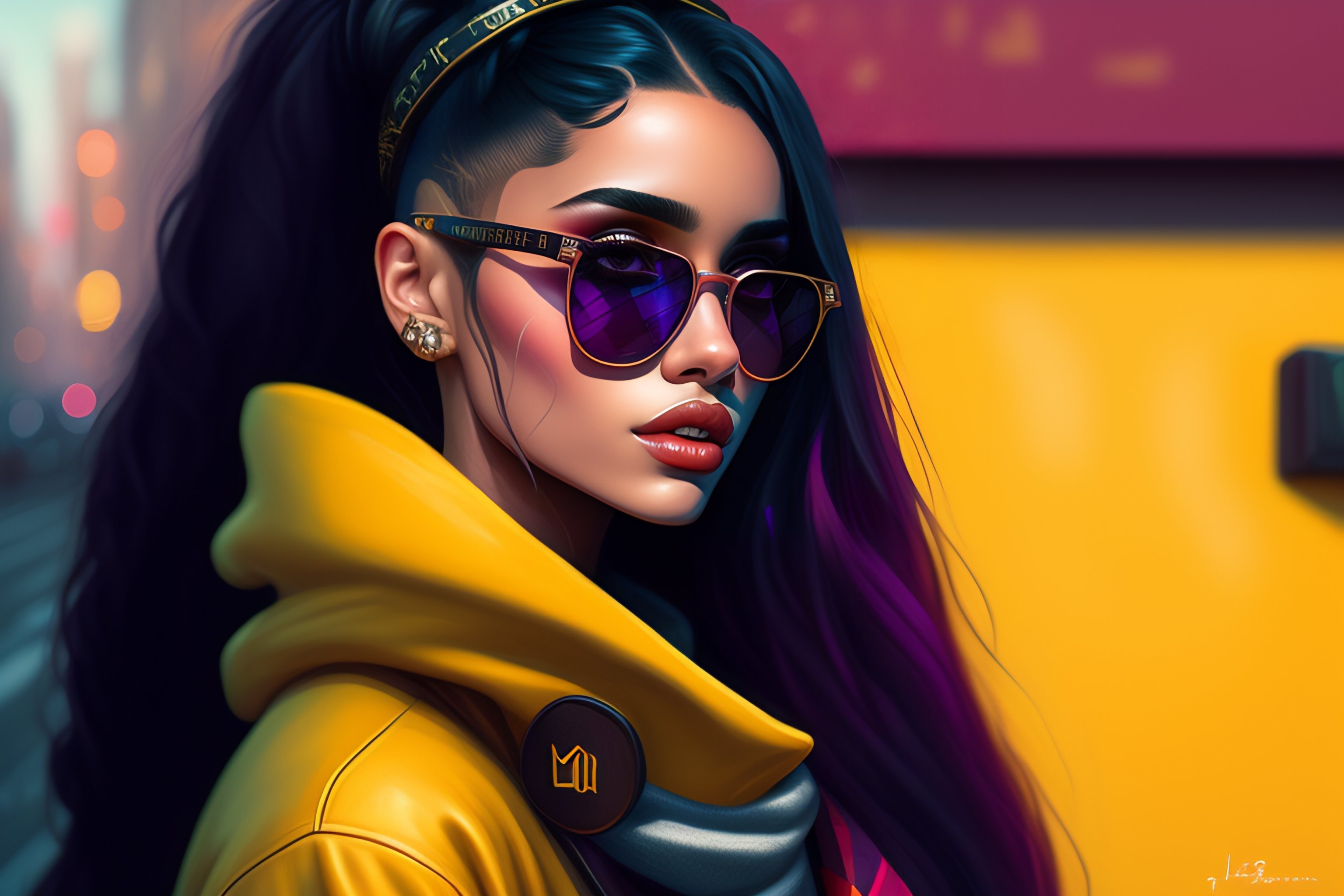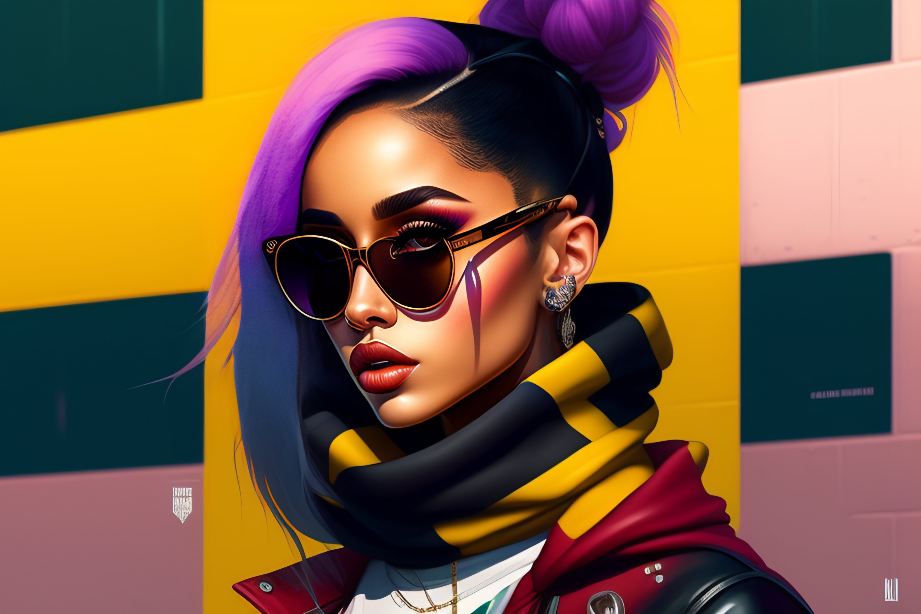 Highly detailed portrait of a sewer emo punk woman student like ariana grande, sunglasses, tartan scarf, by atey ghailan, by greg rutkowski, by greg tocchini, by james gilleard, by joe fenton, by kaethe butcher, gradient yellow, black, brown and magenta color scheme, grunge aesthetic!!! graffiti tag wall background