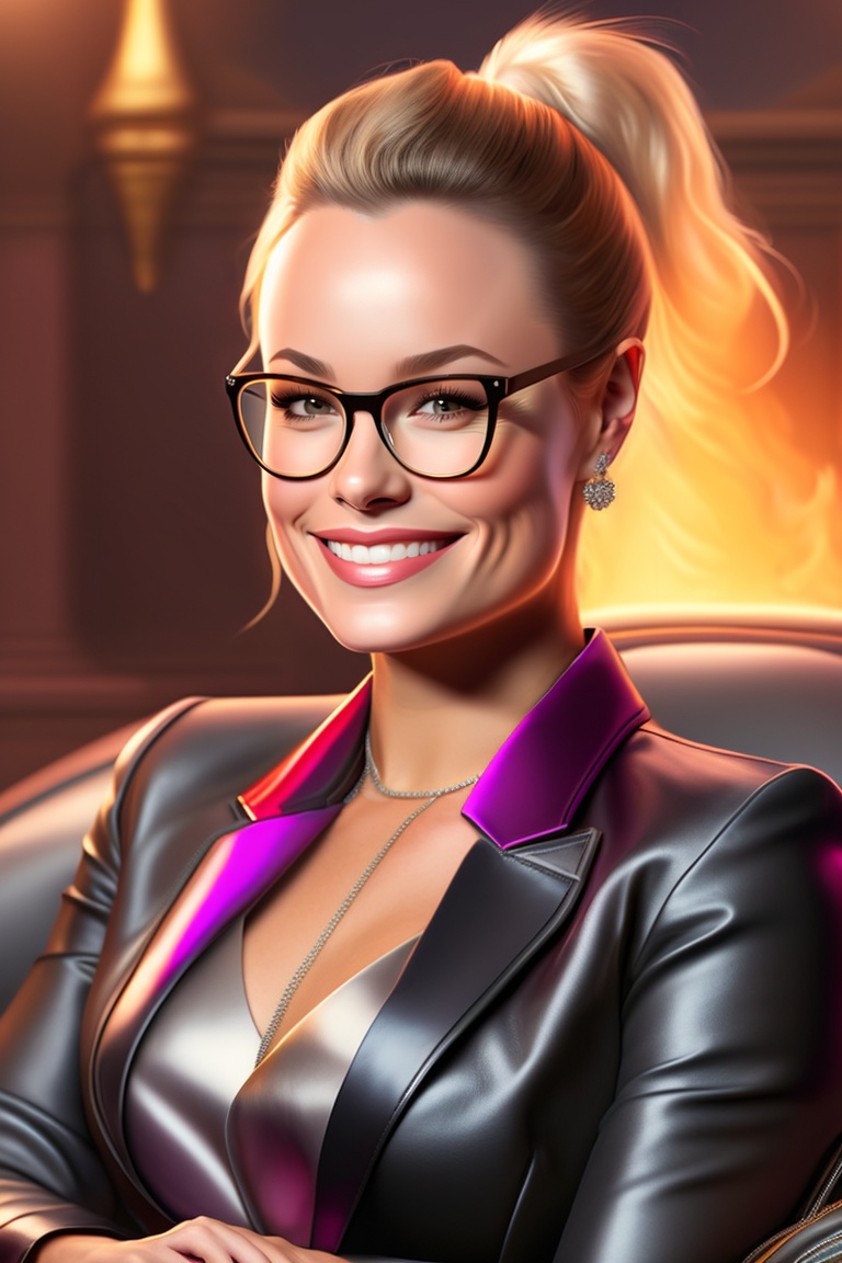 Brie larson, ponytail hair, black leather pants, smiling, designer glasses, pink lipstick, hyper detailed, dynamic pose, elegant, highly detailed, sharp focus, fireplace background, sitting