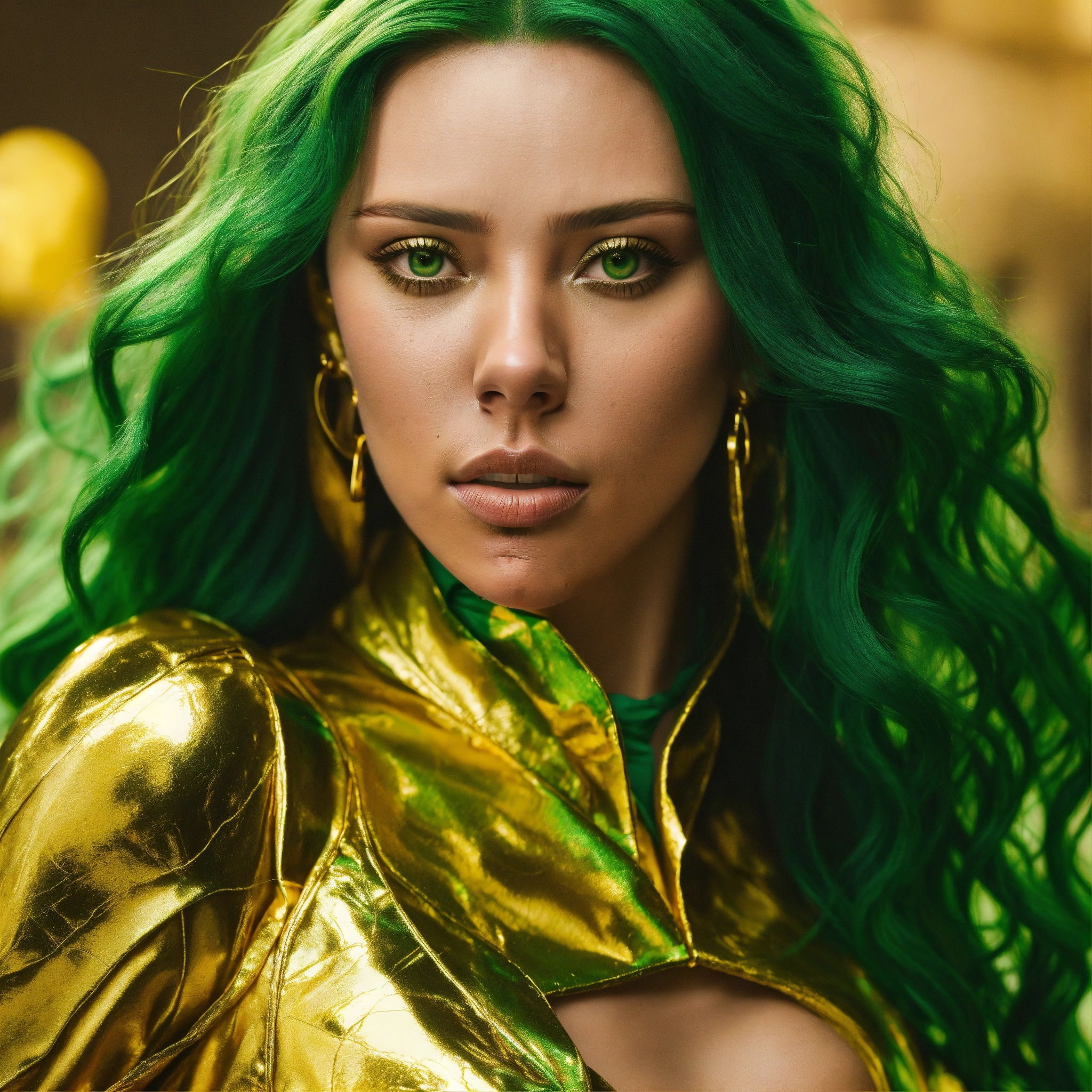 Gold full body scarlett johanssonin with long silky green hair, full body outfit, golden face, green eyes, gold makeup