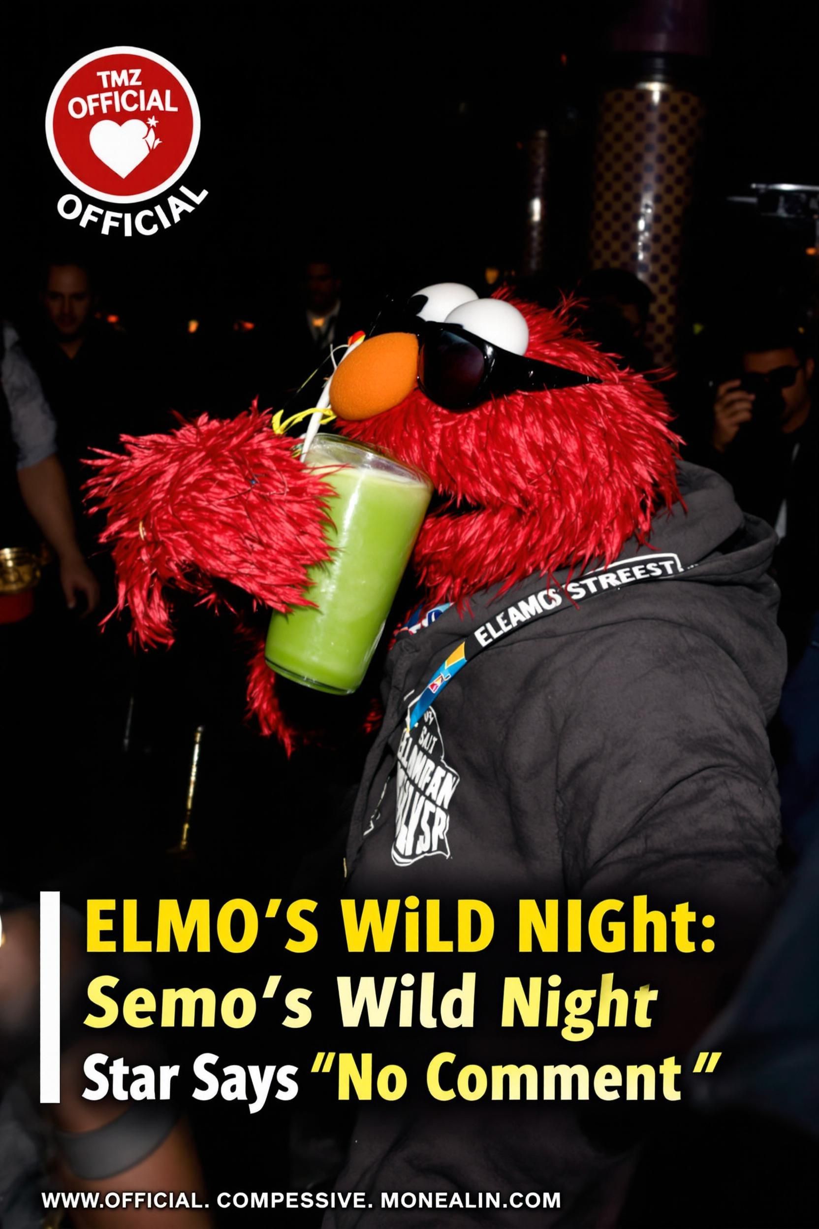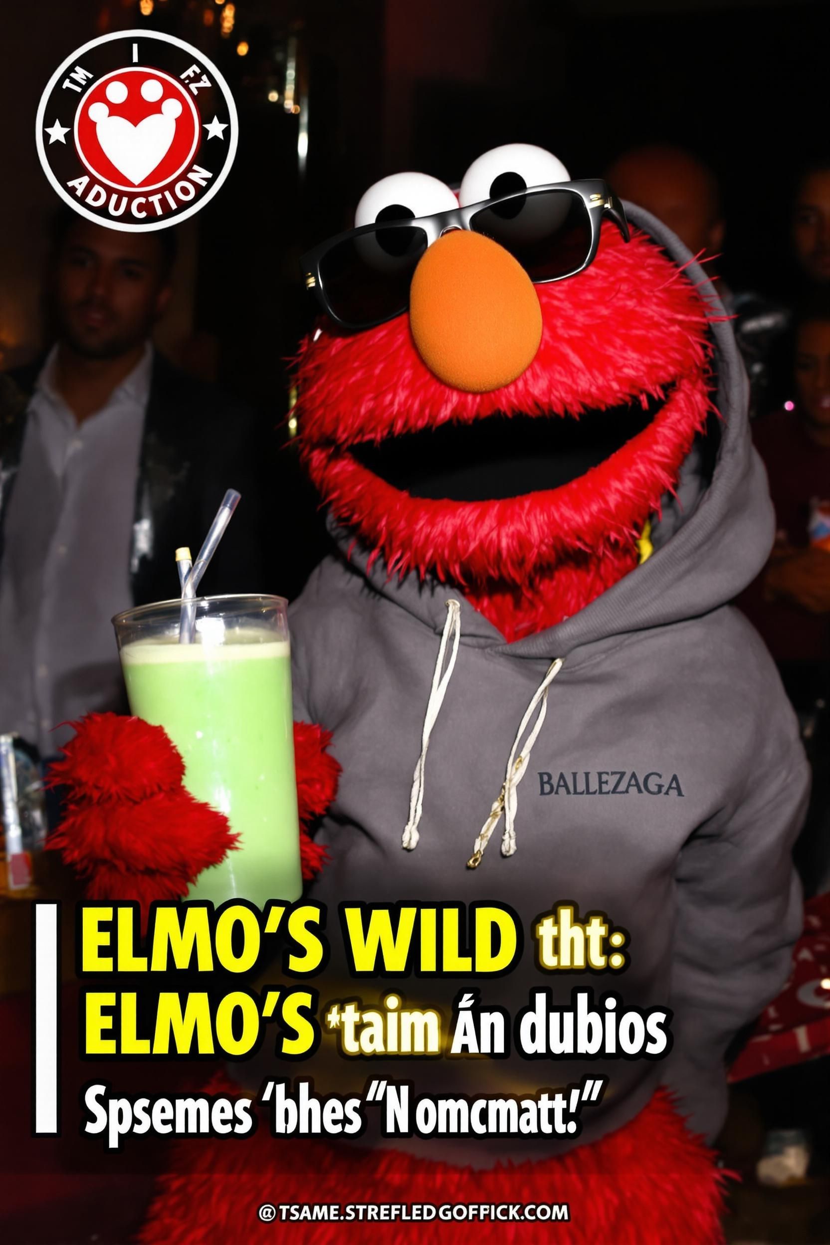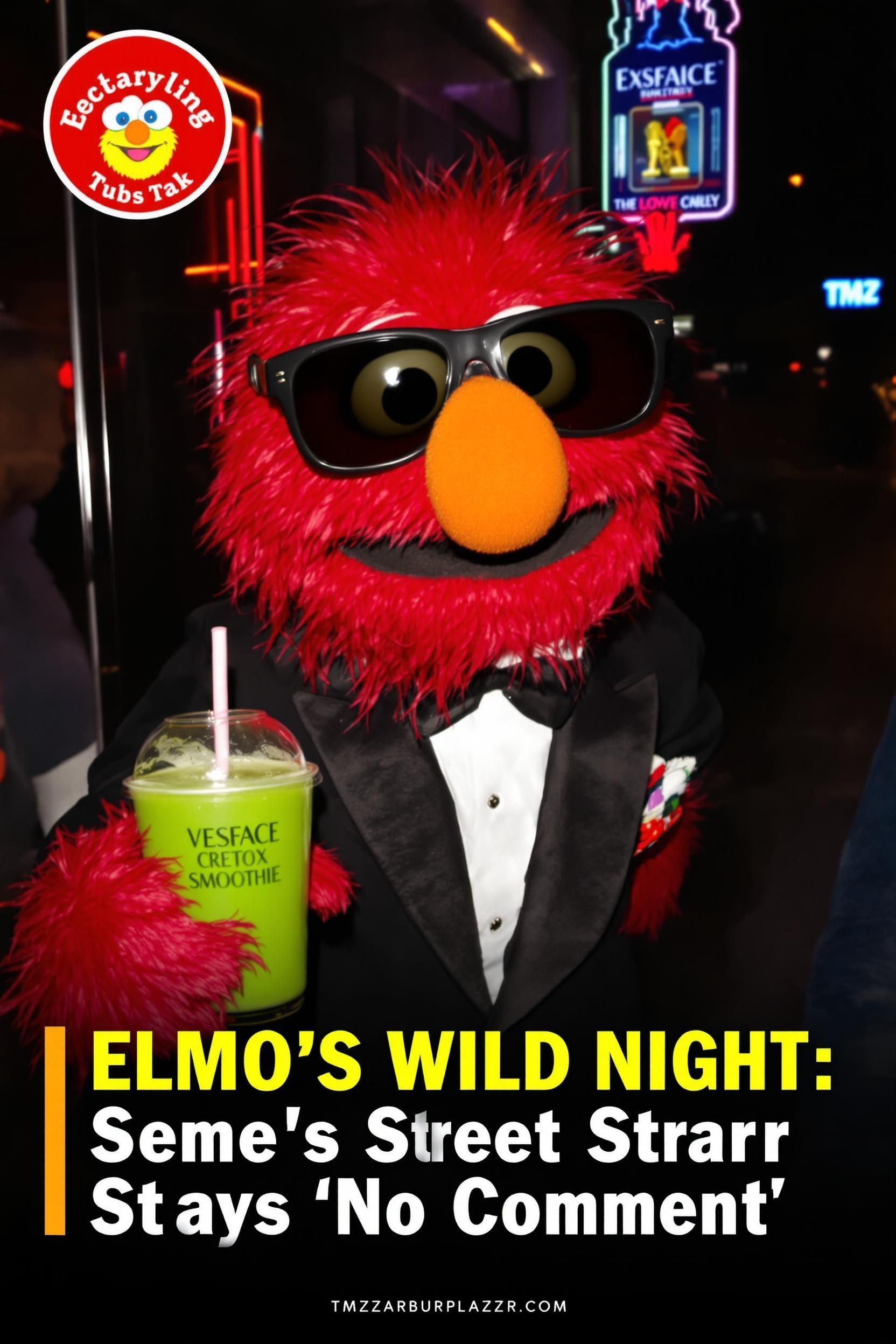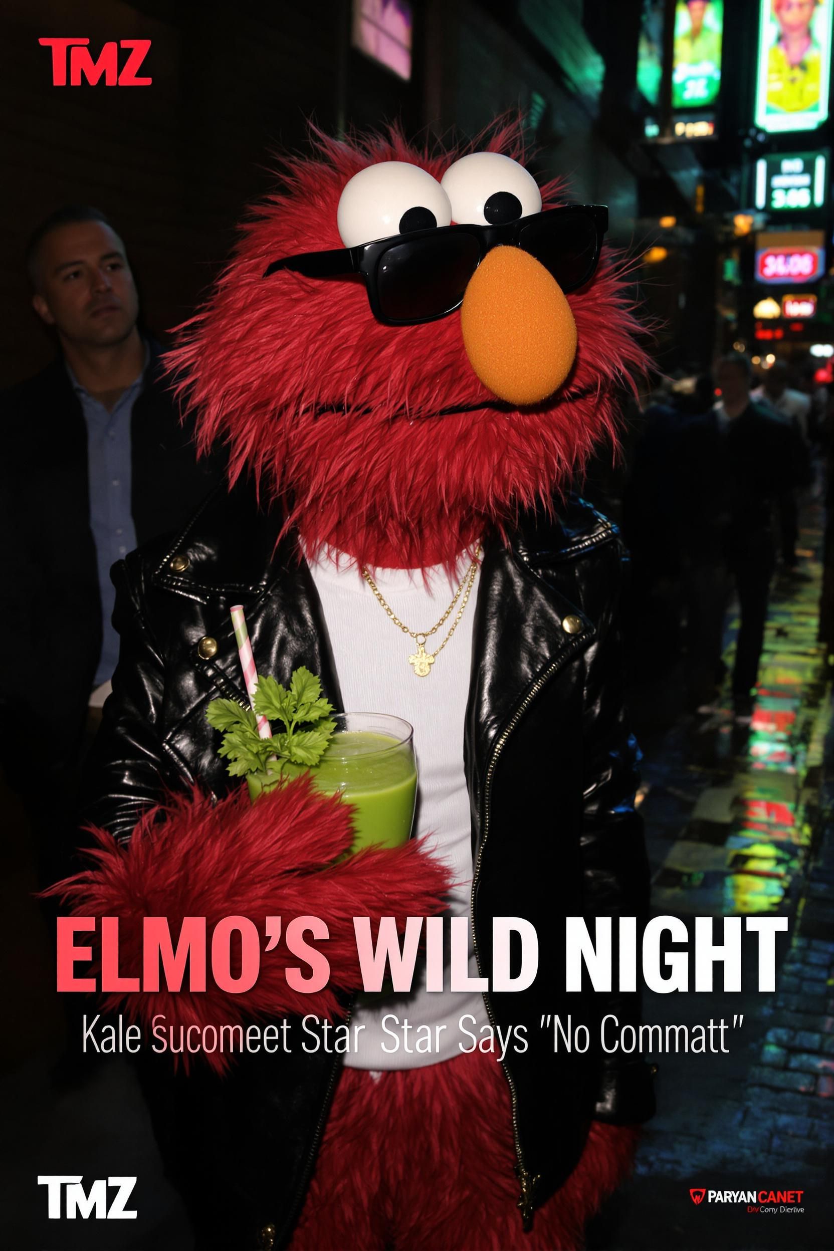 Paparazzi photo of elmo caught leaving a nightclub at 3am, designer sunglasses slightly askew, holding a green smoothie and avoiding eye contact with the camera. tmz watermark in corner. headline reads "elmo's wild night: sesame street star says 'no comment