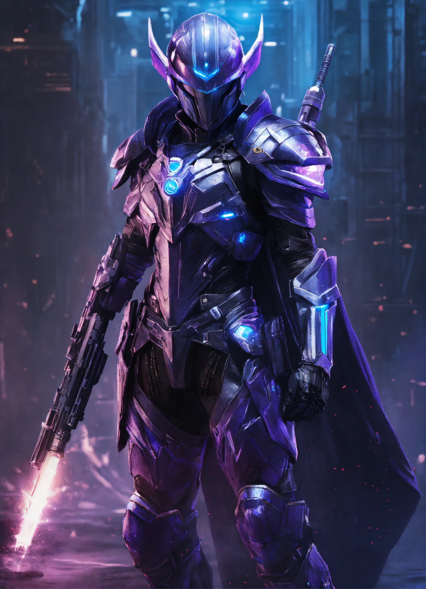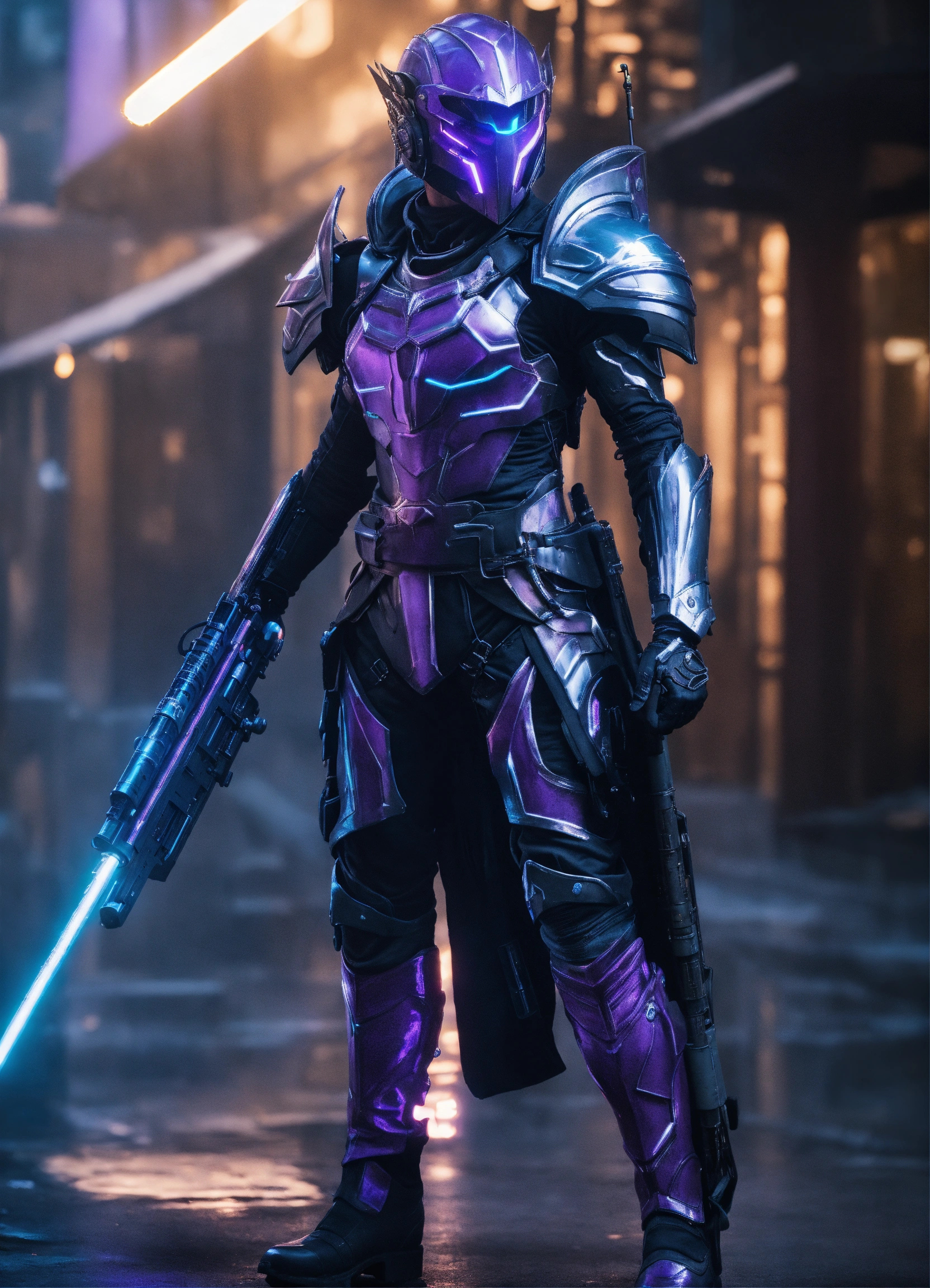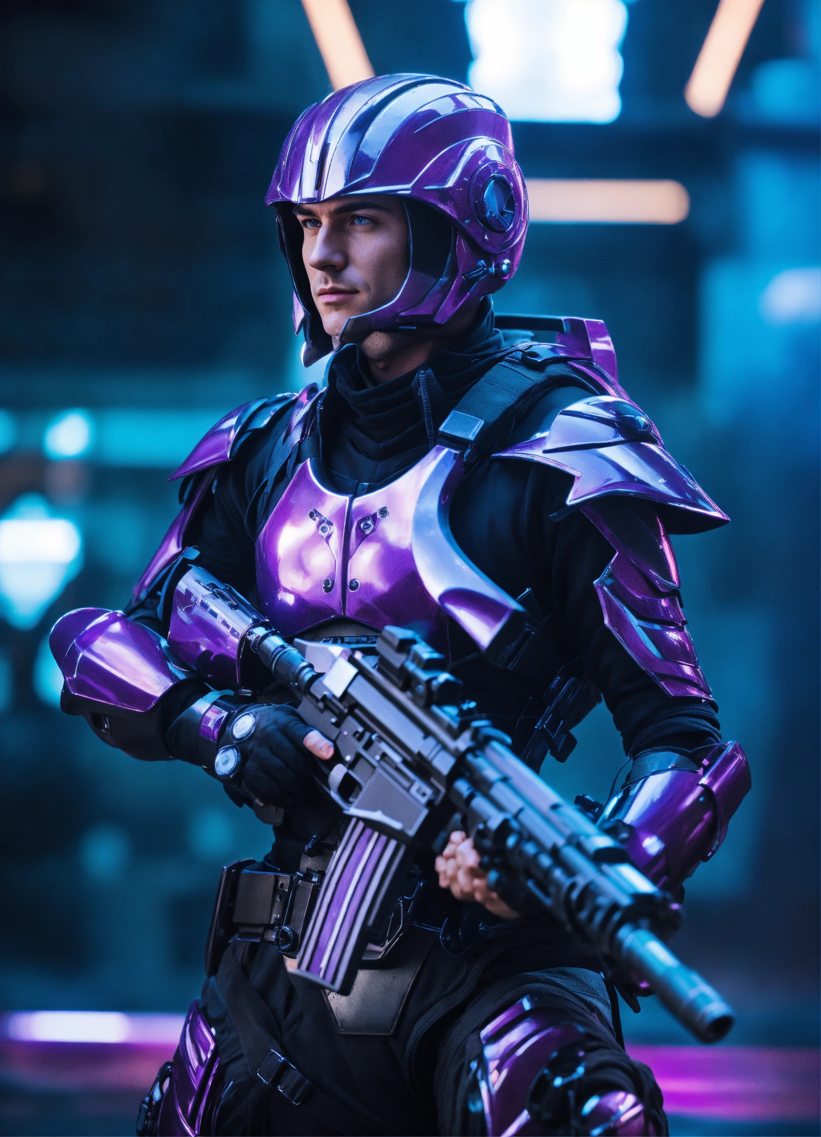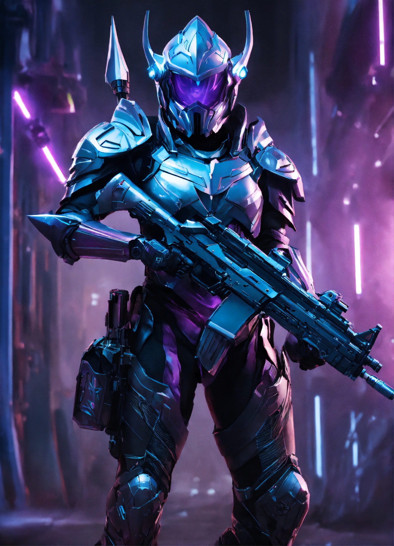Full body of a high elf sci fi soldier wearing heavy sci fi elven armor, cybernetic black and purple and light blue armor and helmet, boots, male, holding a light machine gun with both hands, full body, hd