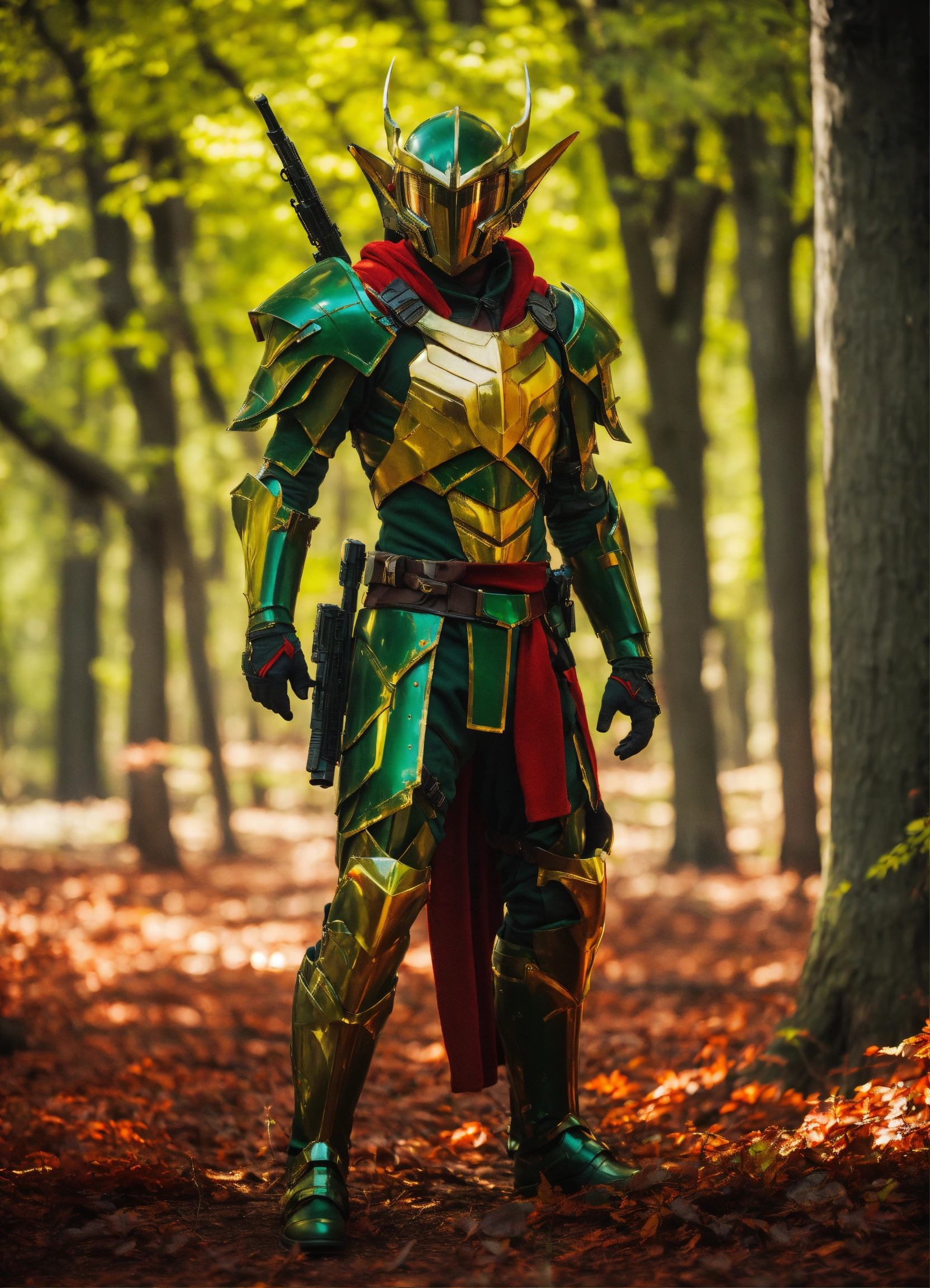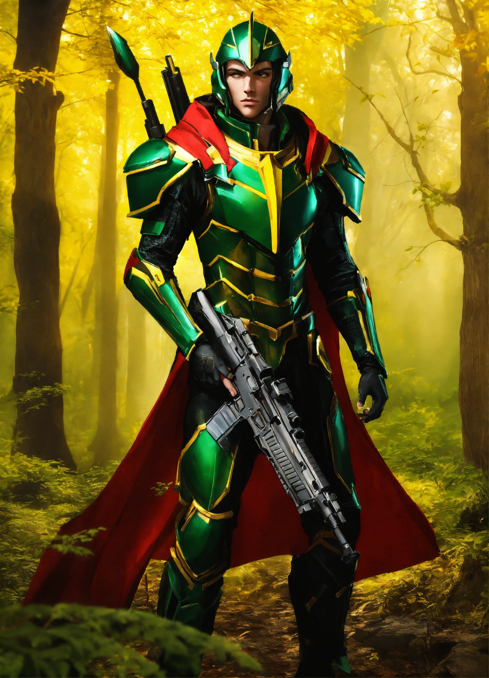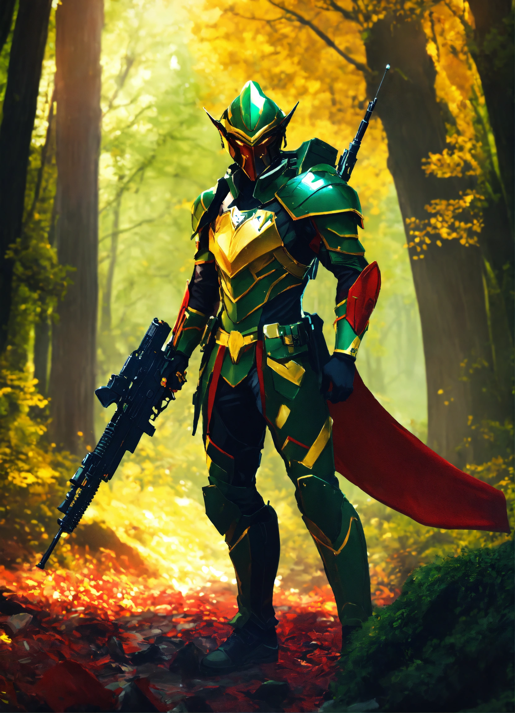 High elf sci fi soldier wearing sleek sci fi armor, dark green and red and yellow armor, male, holding an assault rifle with both hands, full body, standing in an oak forest, hd