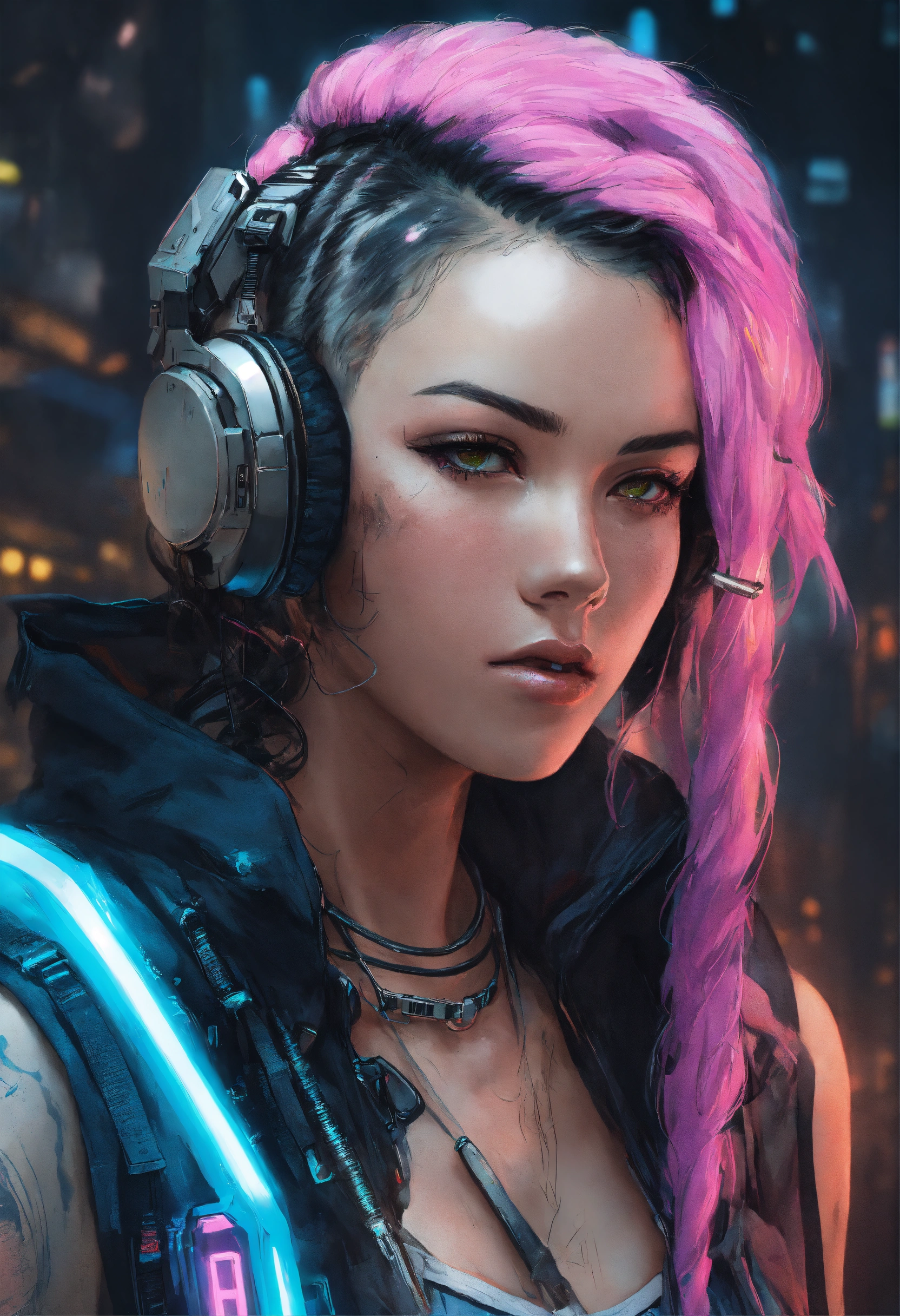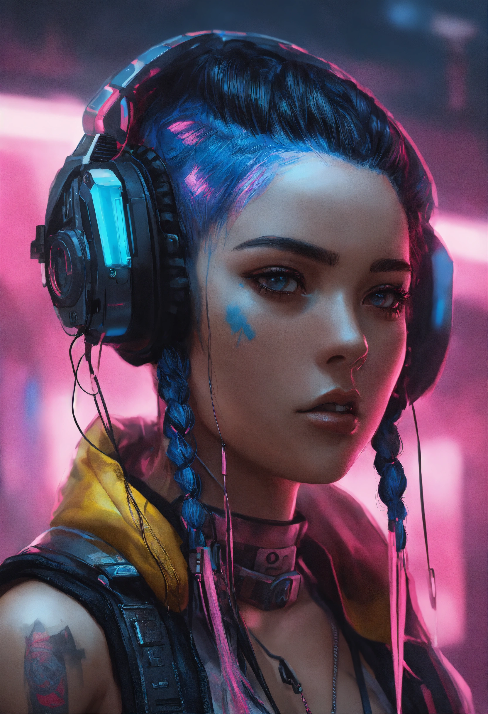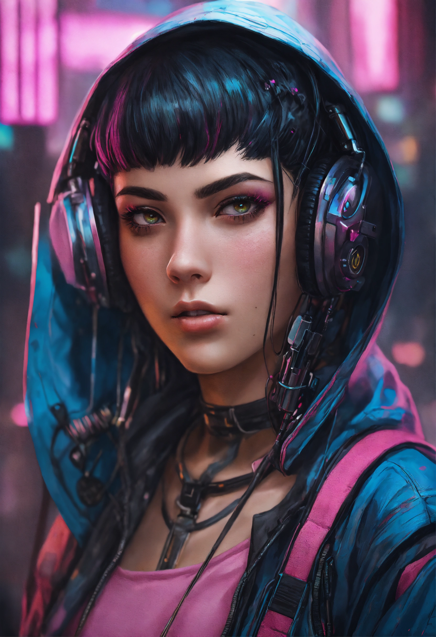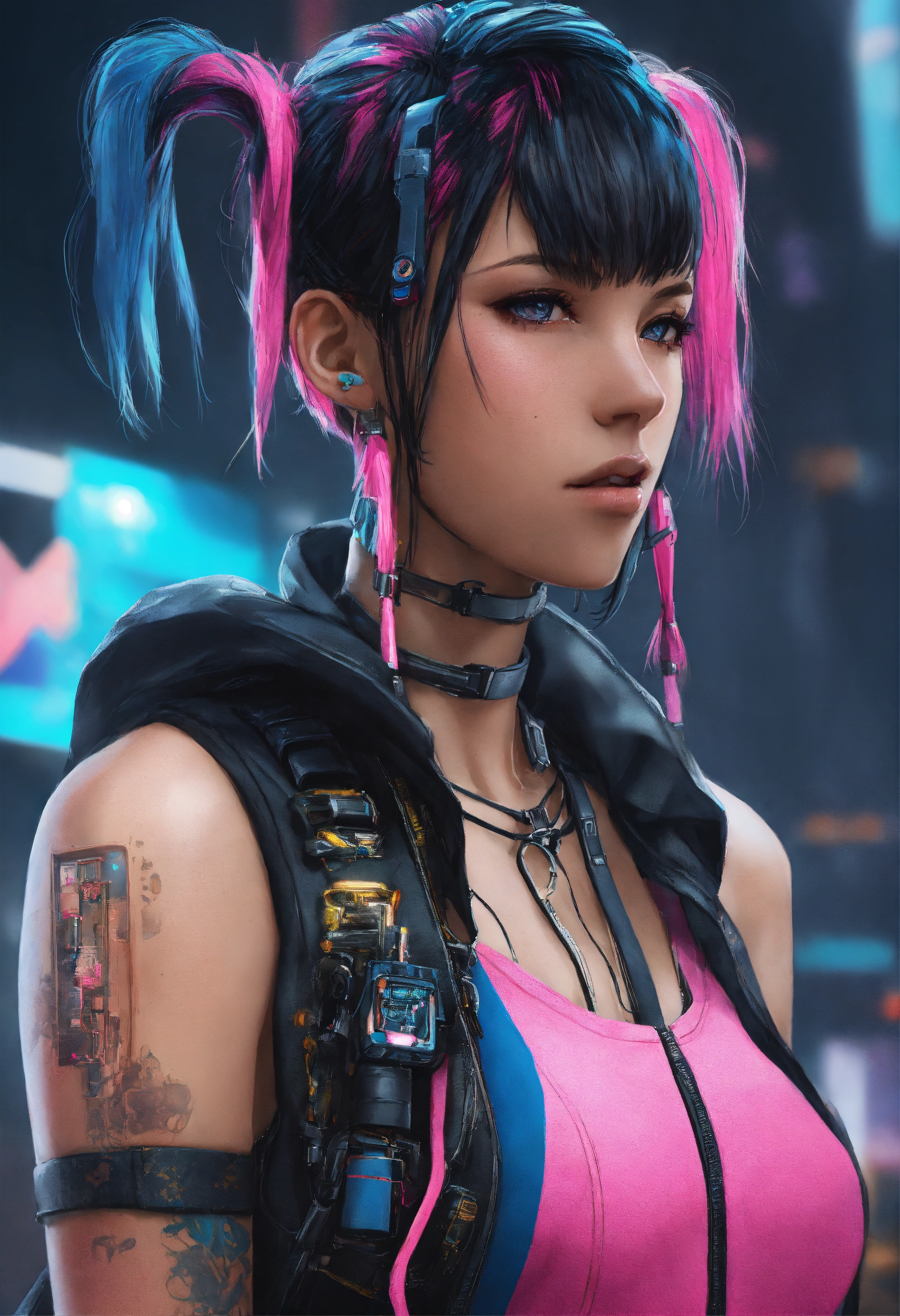 Highly detailed portrait of a cyberpunk woman, with two pigtails, shaven sides, black hair with pink tips, blue sleeveless hood