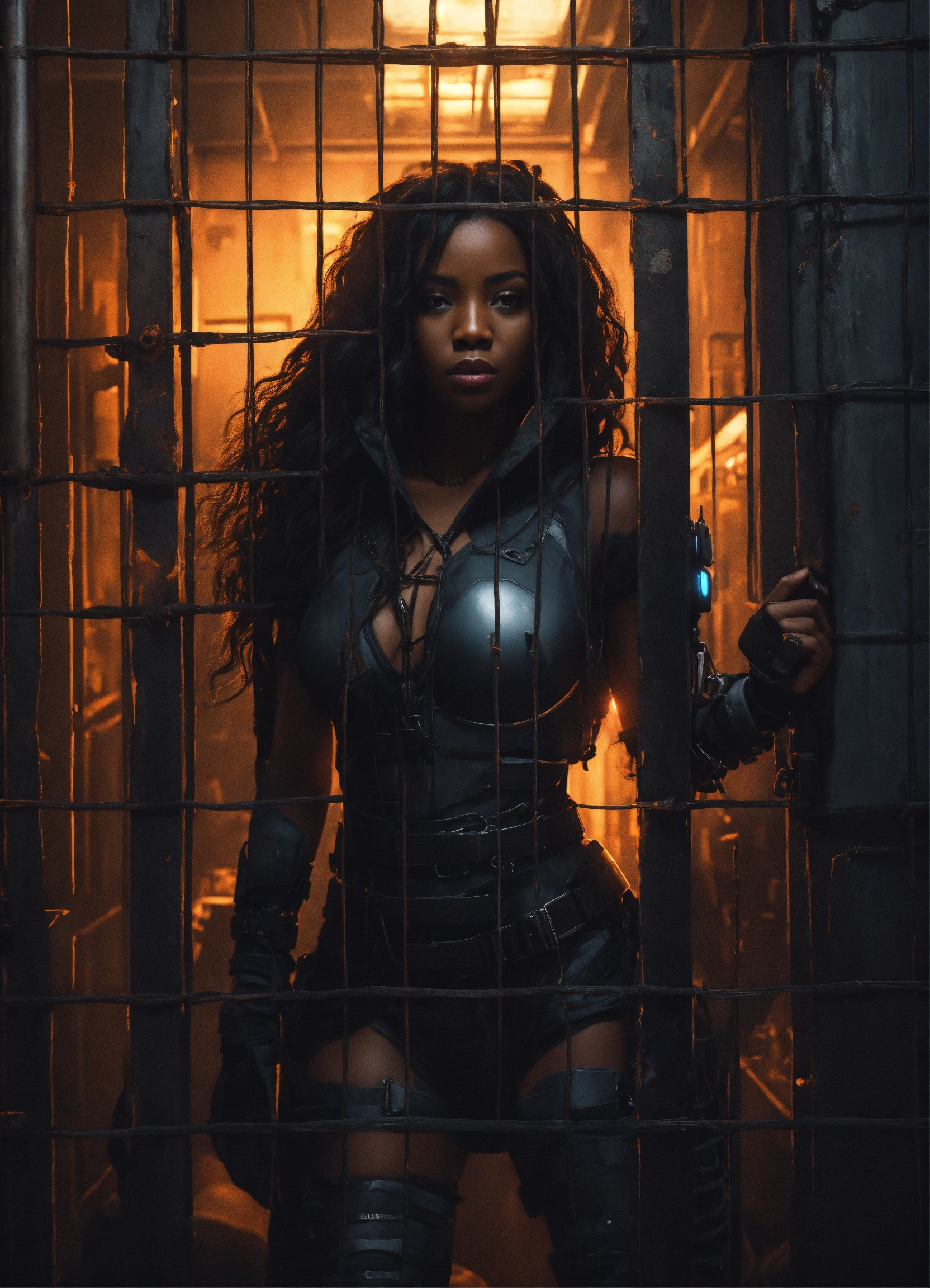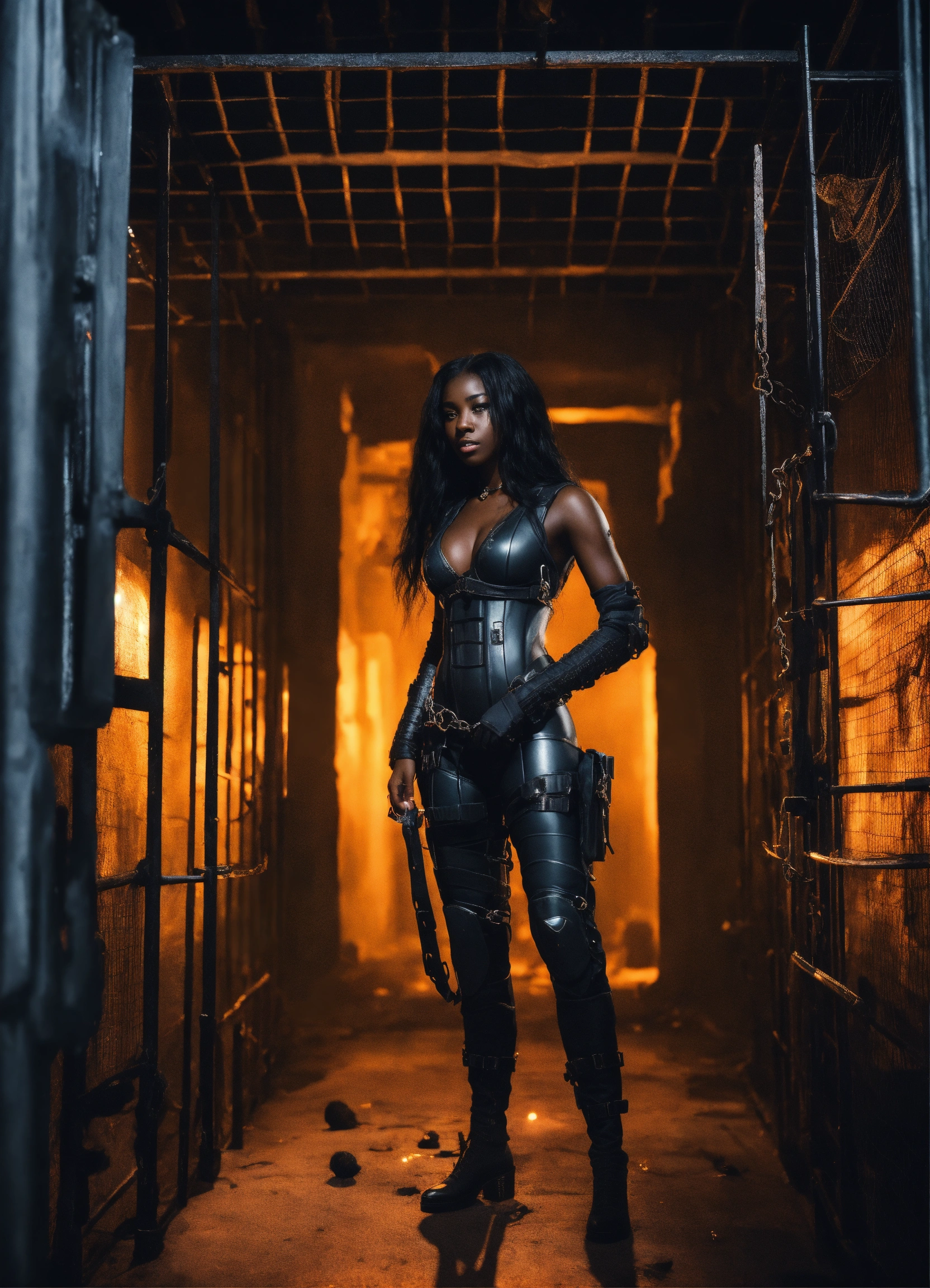 Handcuffed, a beautiful black girl goddess, a beautiful prisoner with long dark hair wearing tattered remains of a super spy stealth suit, held captive in a dark spooky cell with monstrous guards in the backgroundl, resolution 8k, insanely detailed