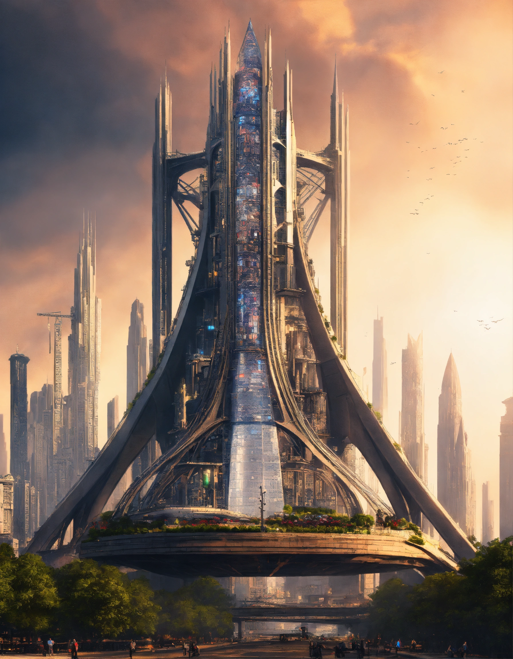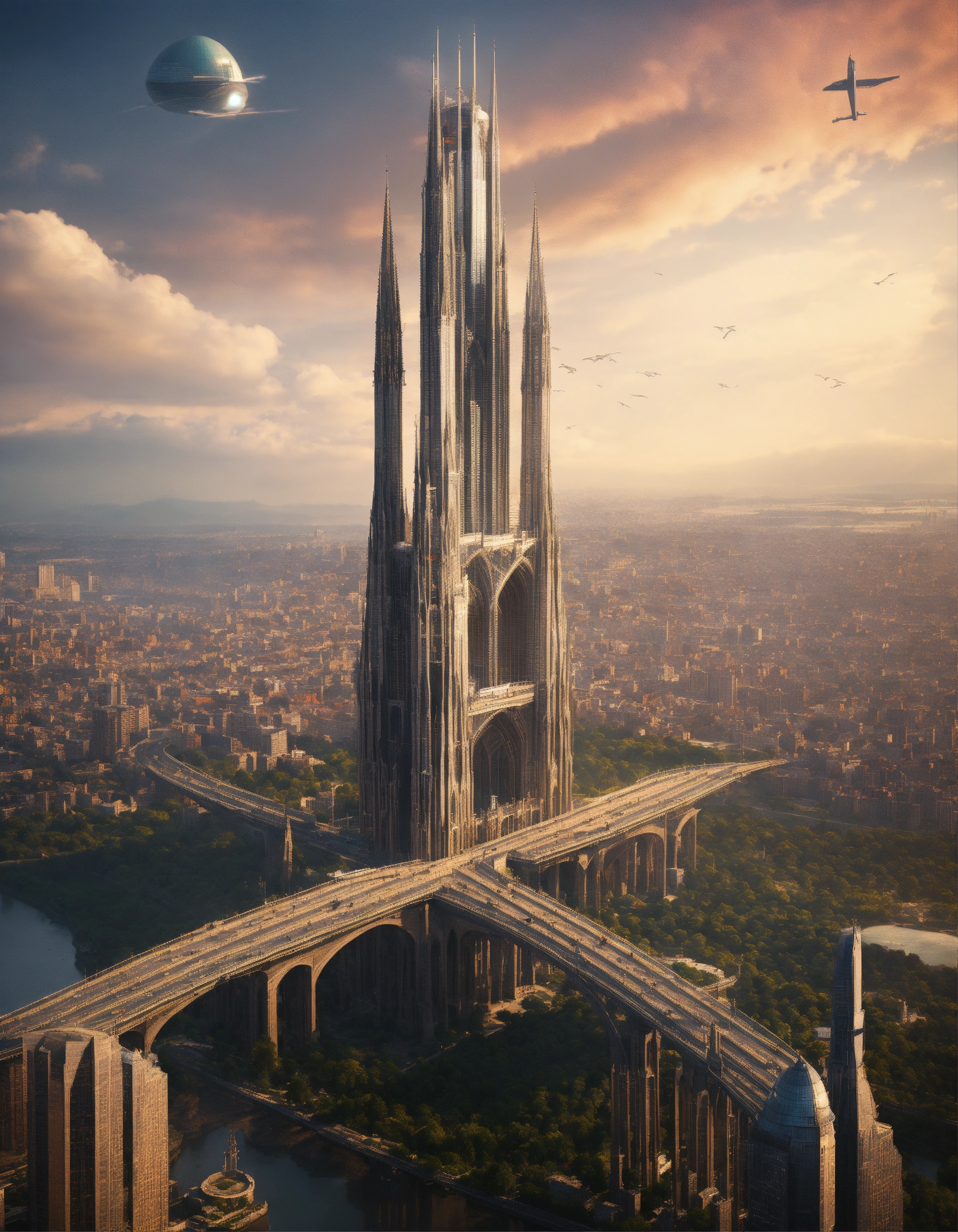 Futuriatic gothic cathedral skyscraper tower high apace complex extreme super hyper ultra bridge city