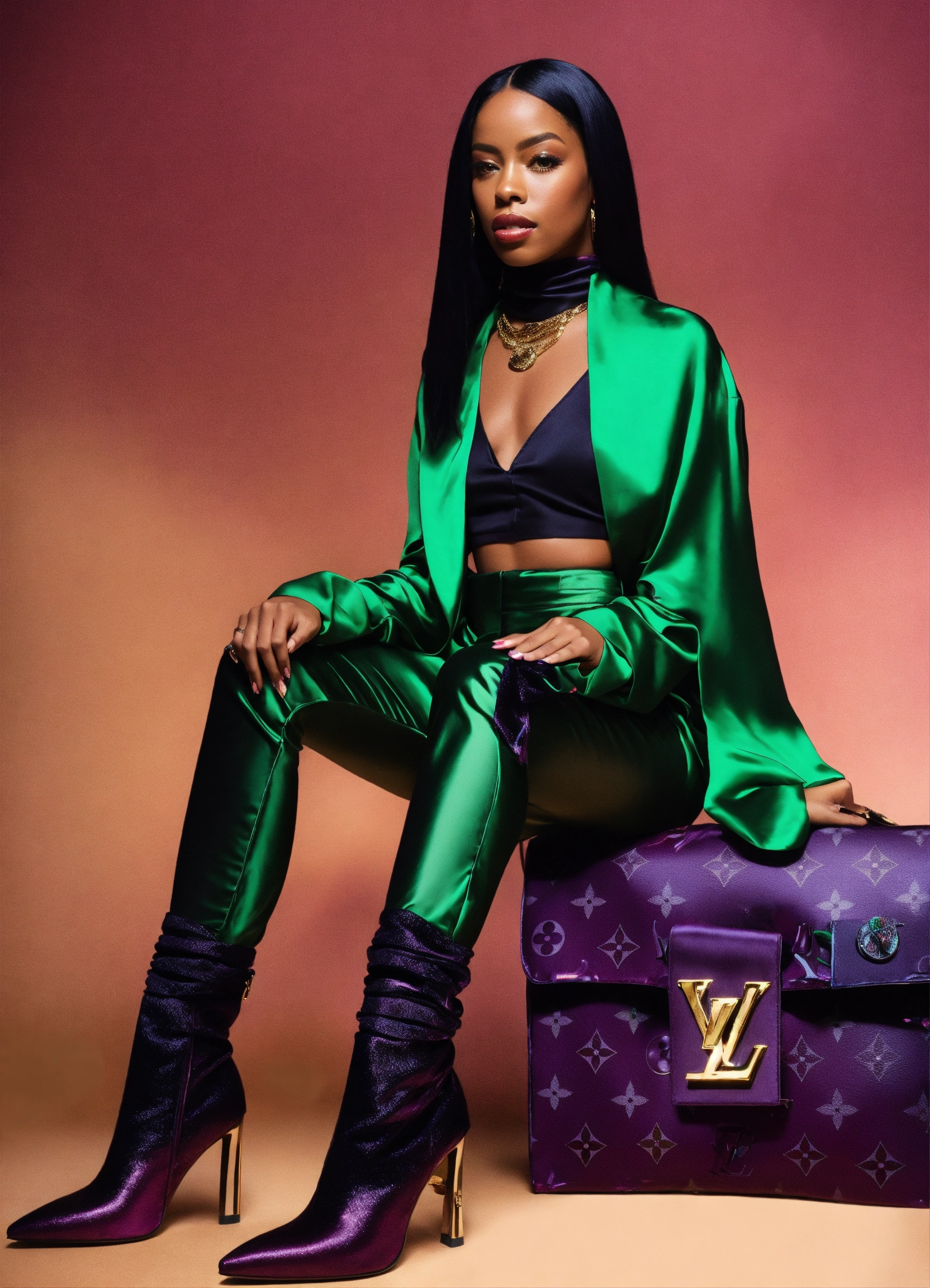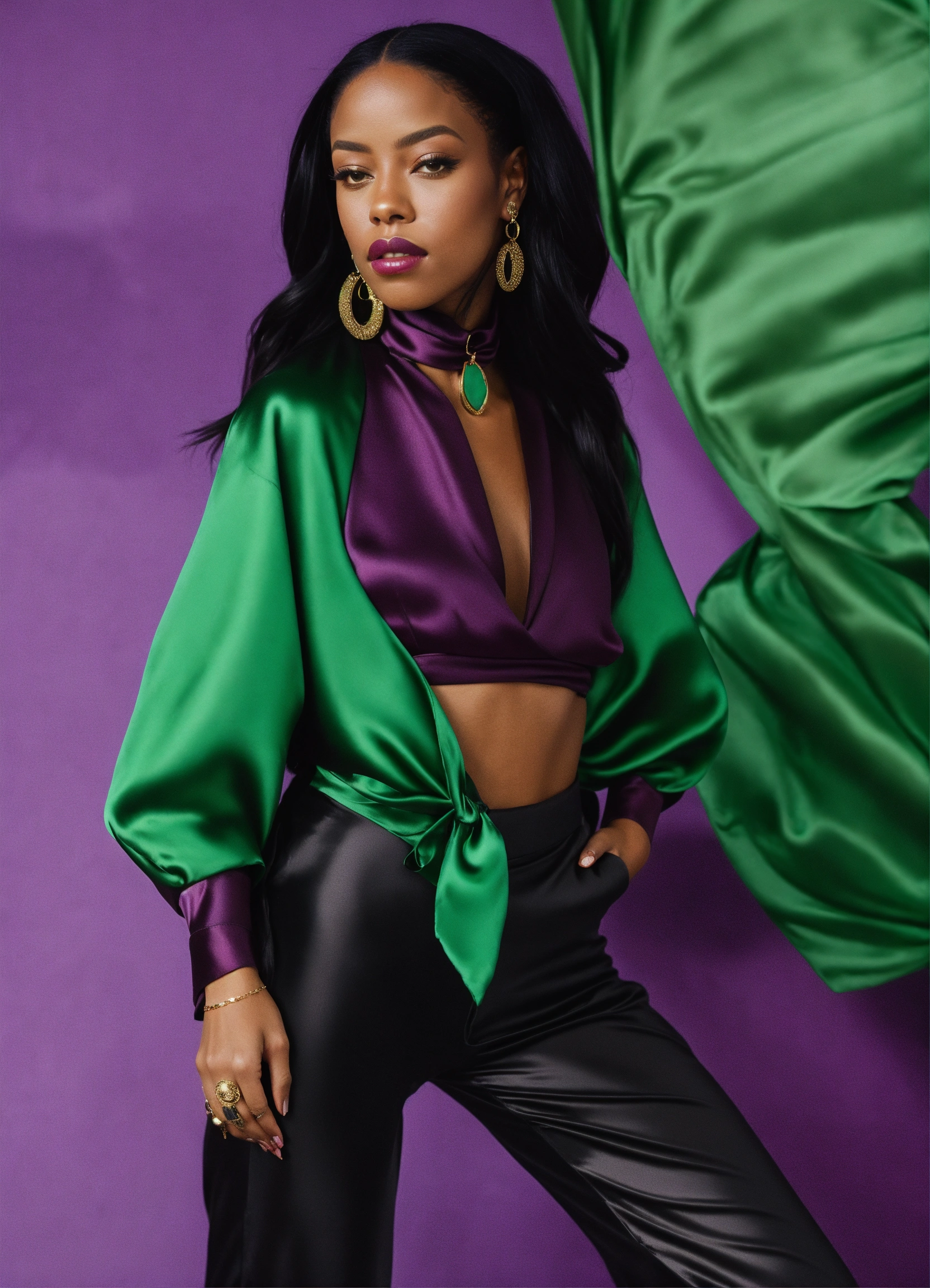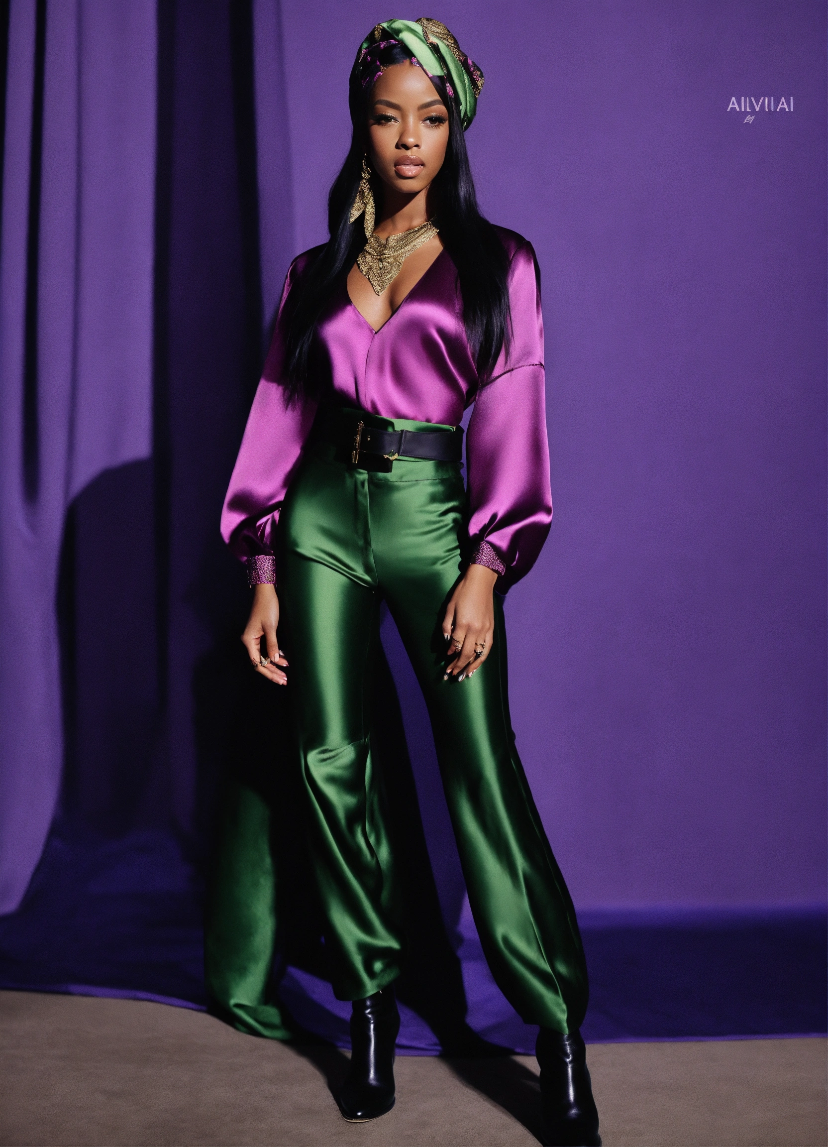 Aaliyah glamorous plum, black, and green louis vuitton style silk outfit, with pants and heeled boots and a bandanna.