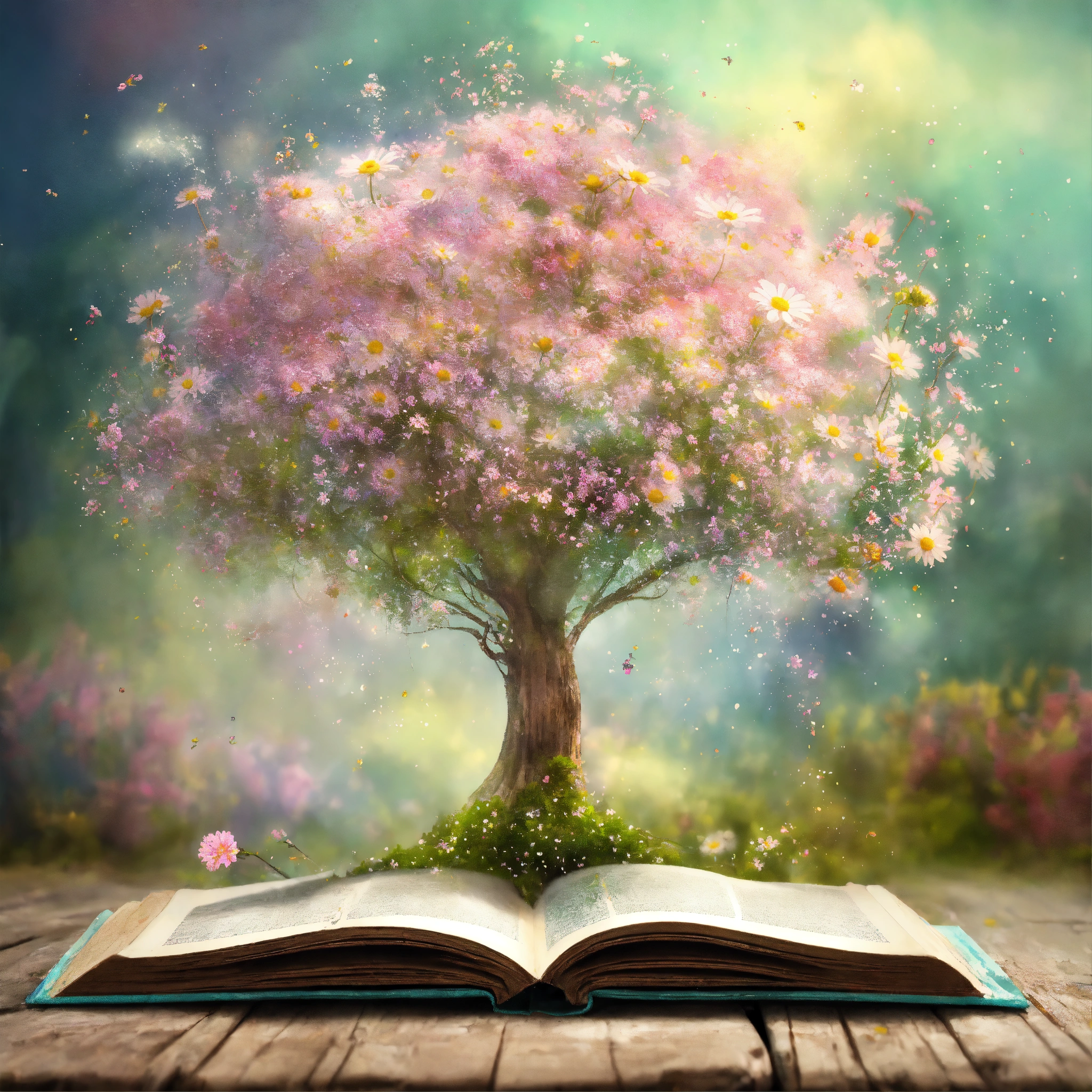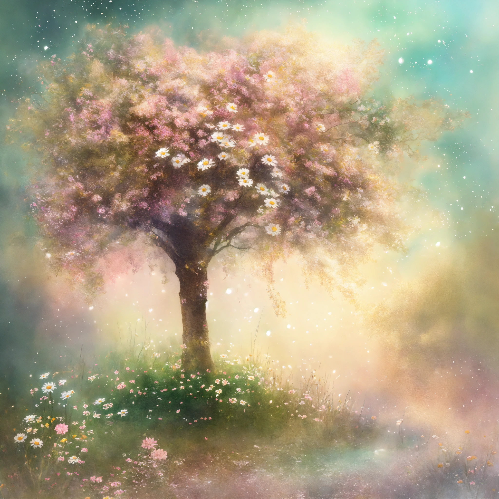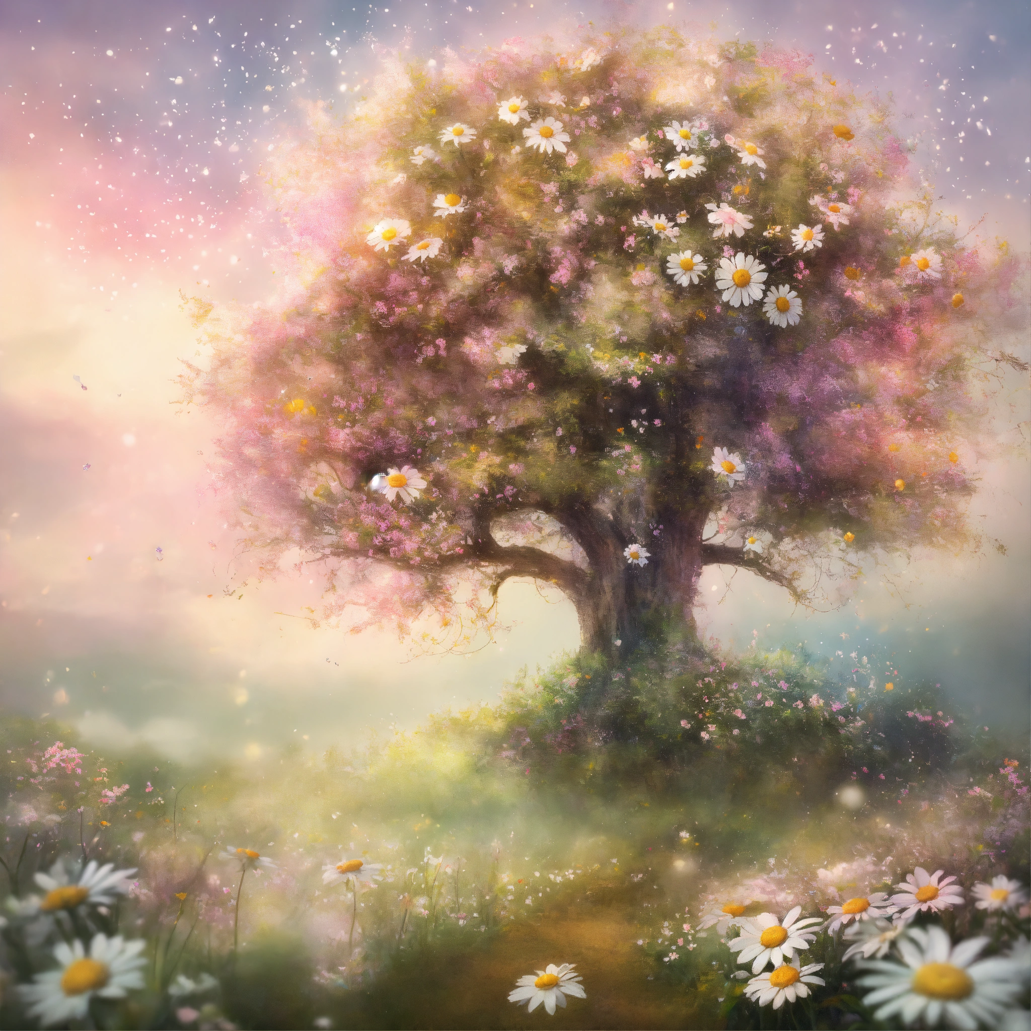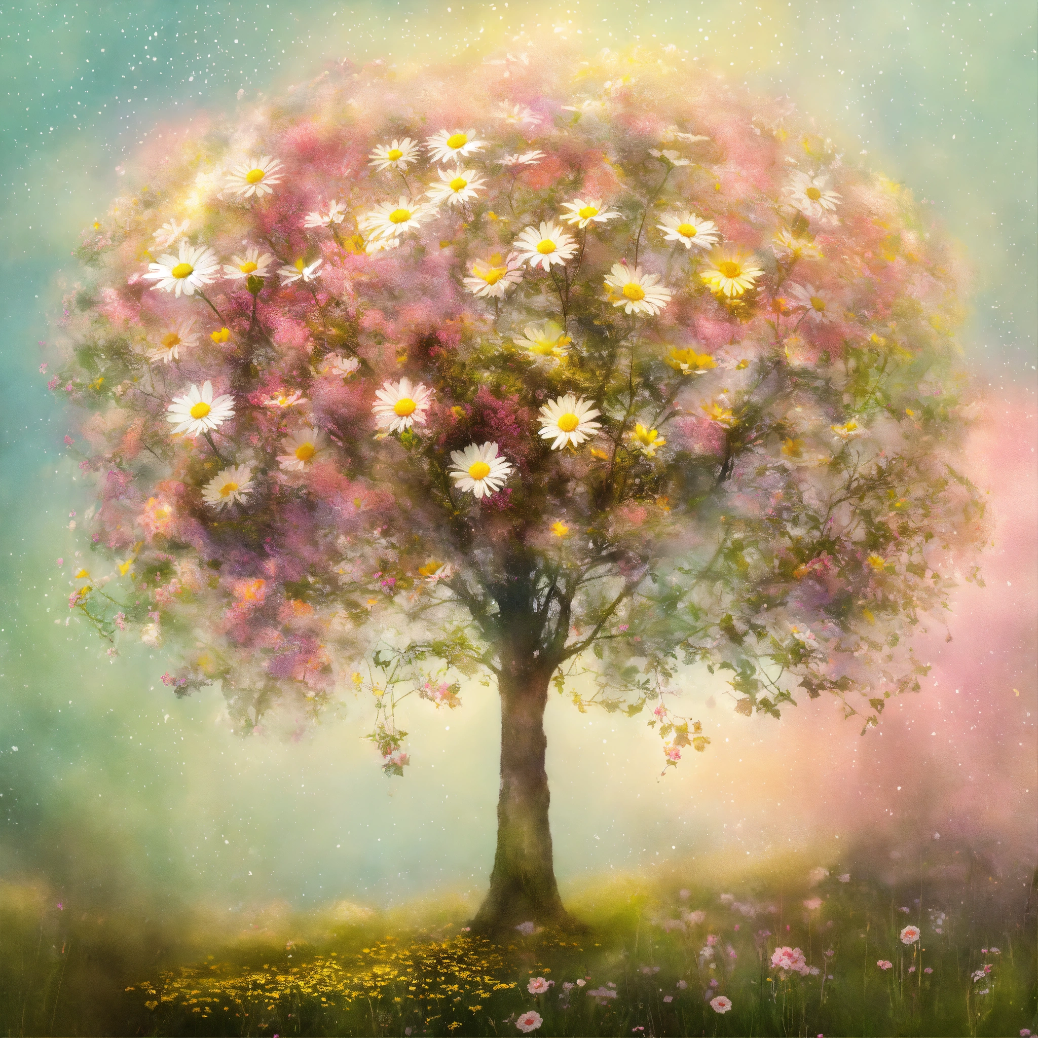 Shabby chic dreamy mist pastel junk journals daisy flower tree swirling magical fairytale abstract art style