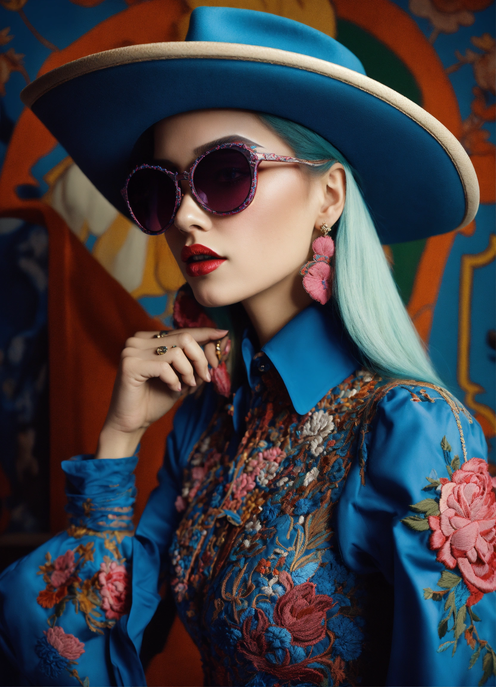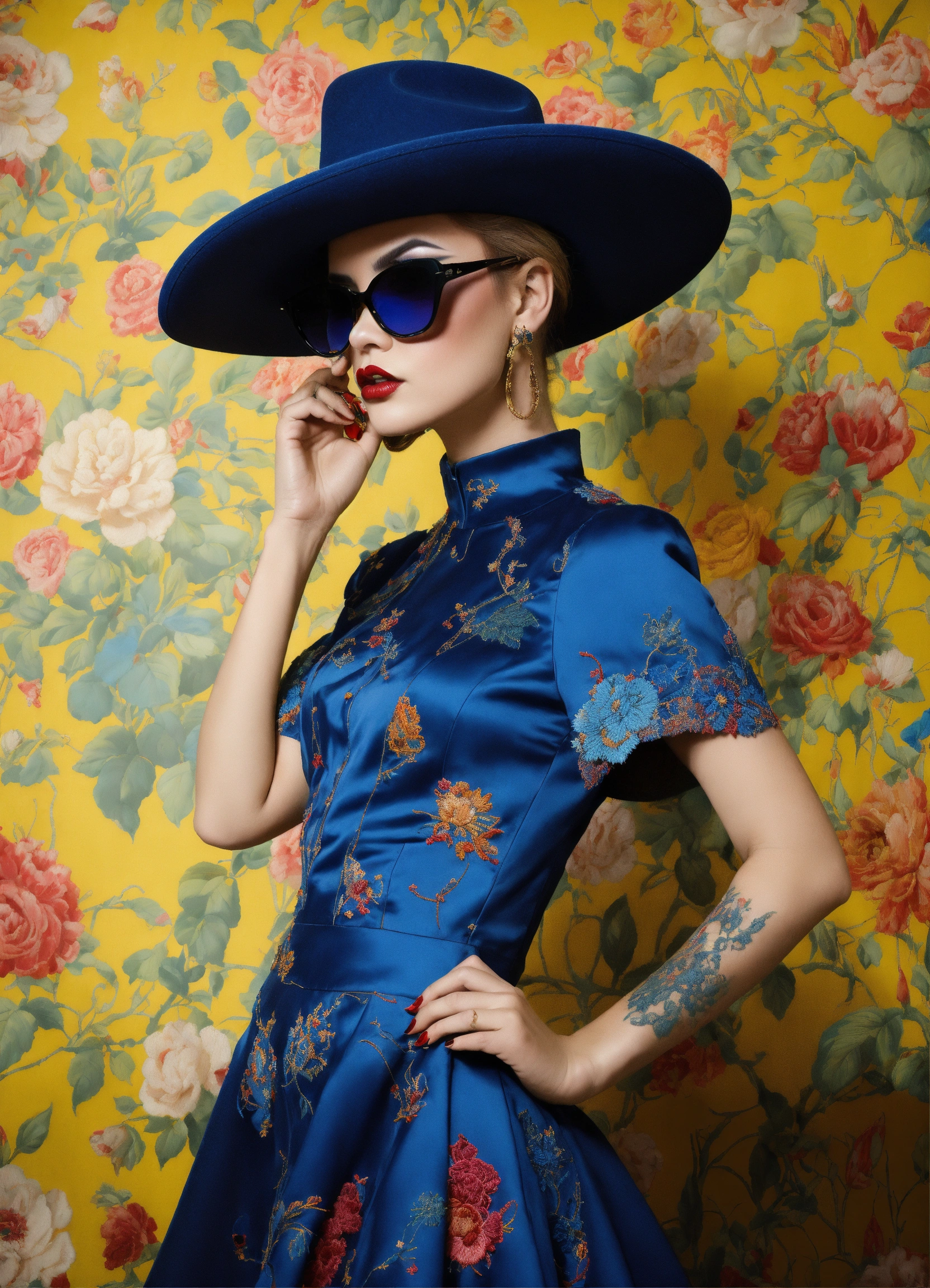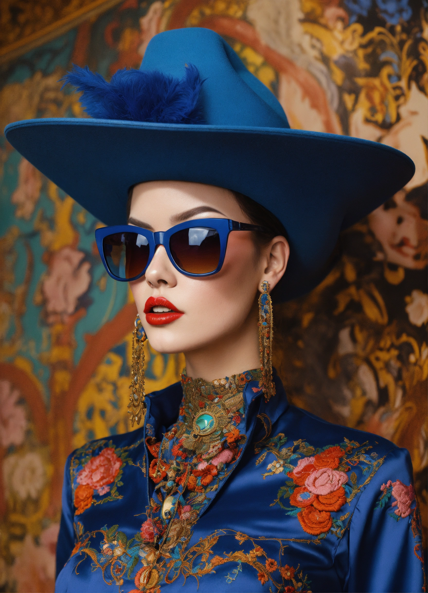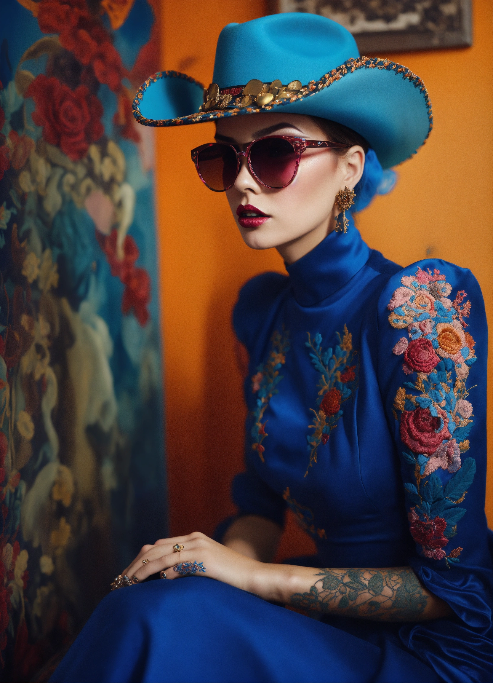 Medium-full shot, profile half body photography, in the office, a punk 80's model woman with dramatic makeup and a 50's cowboy hat, wearing a deep blue, vibrant, detailed embroidered dress, large sunglasses, 80 degree view, art by sergio lopez, natalie shau, james jean, salvador dali.