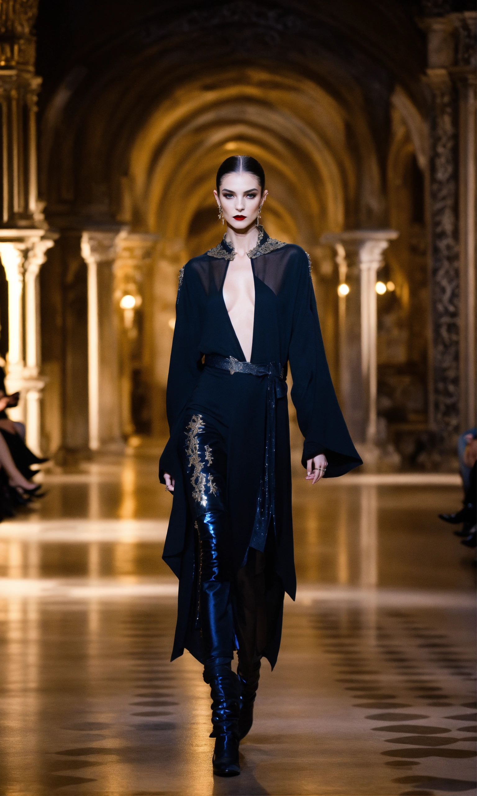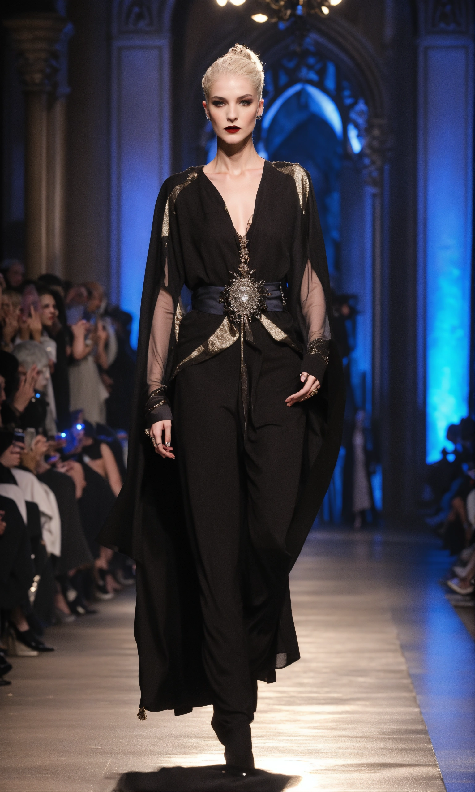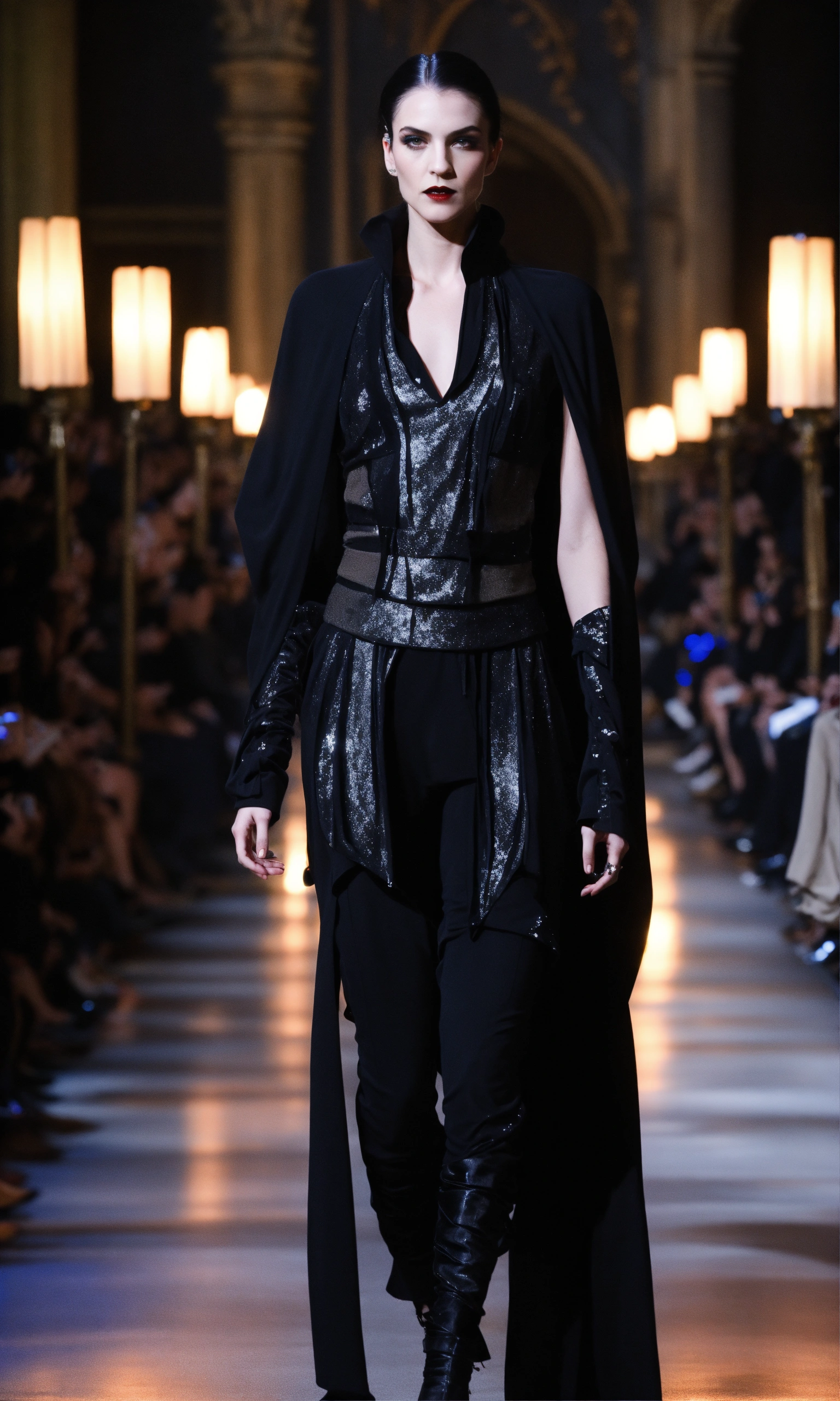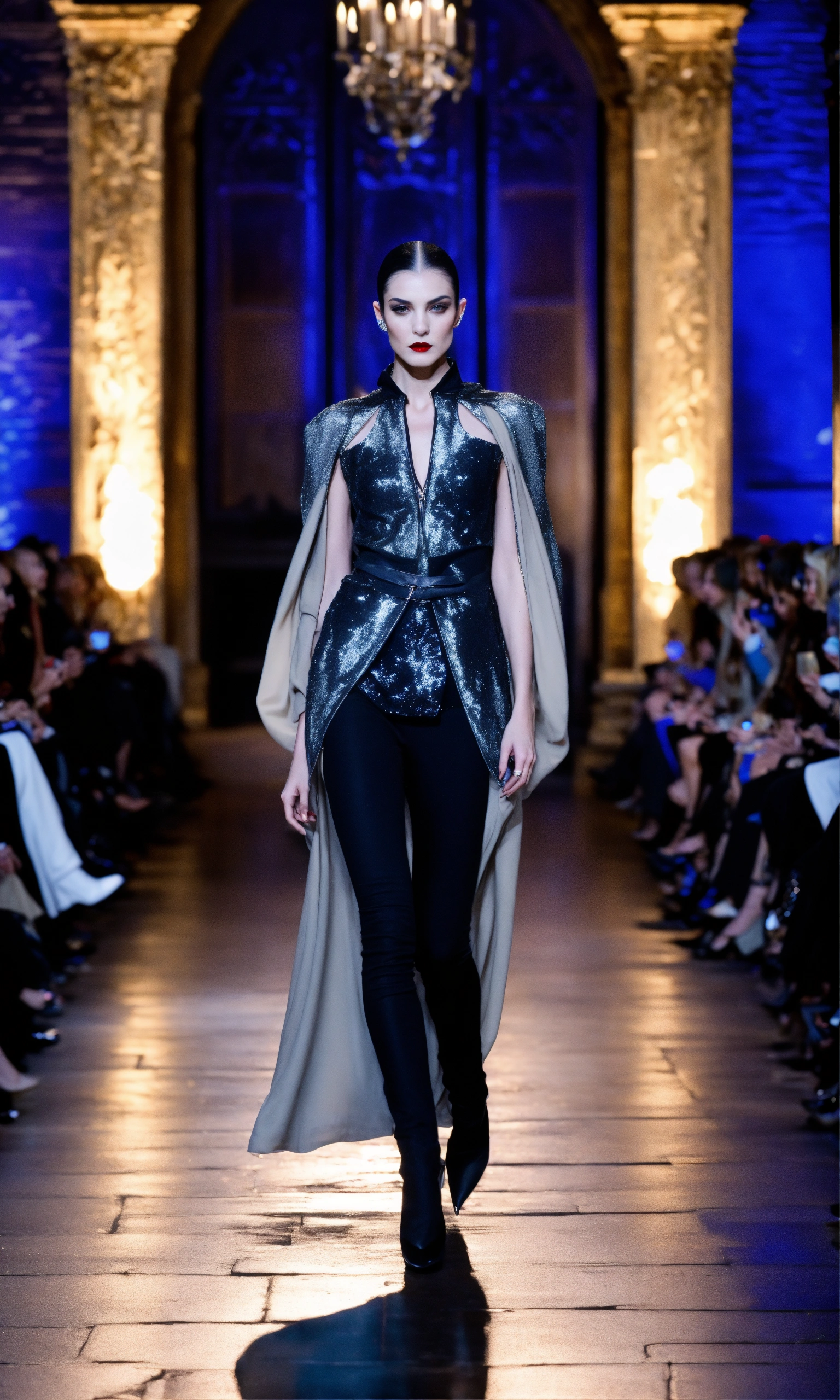 Lothlorien androgynous royal vampire walking runway during vamp fashion week wearing dolman sleeve dark donna karan vamp fashion in black, white, grey, beige, pearl, stone, metallics, shimmer walking runway in a dark goth castle with blue light