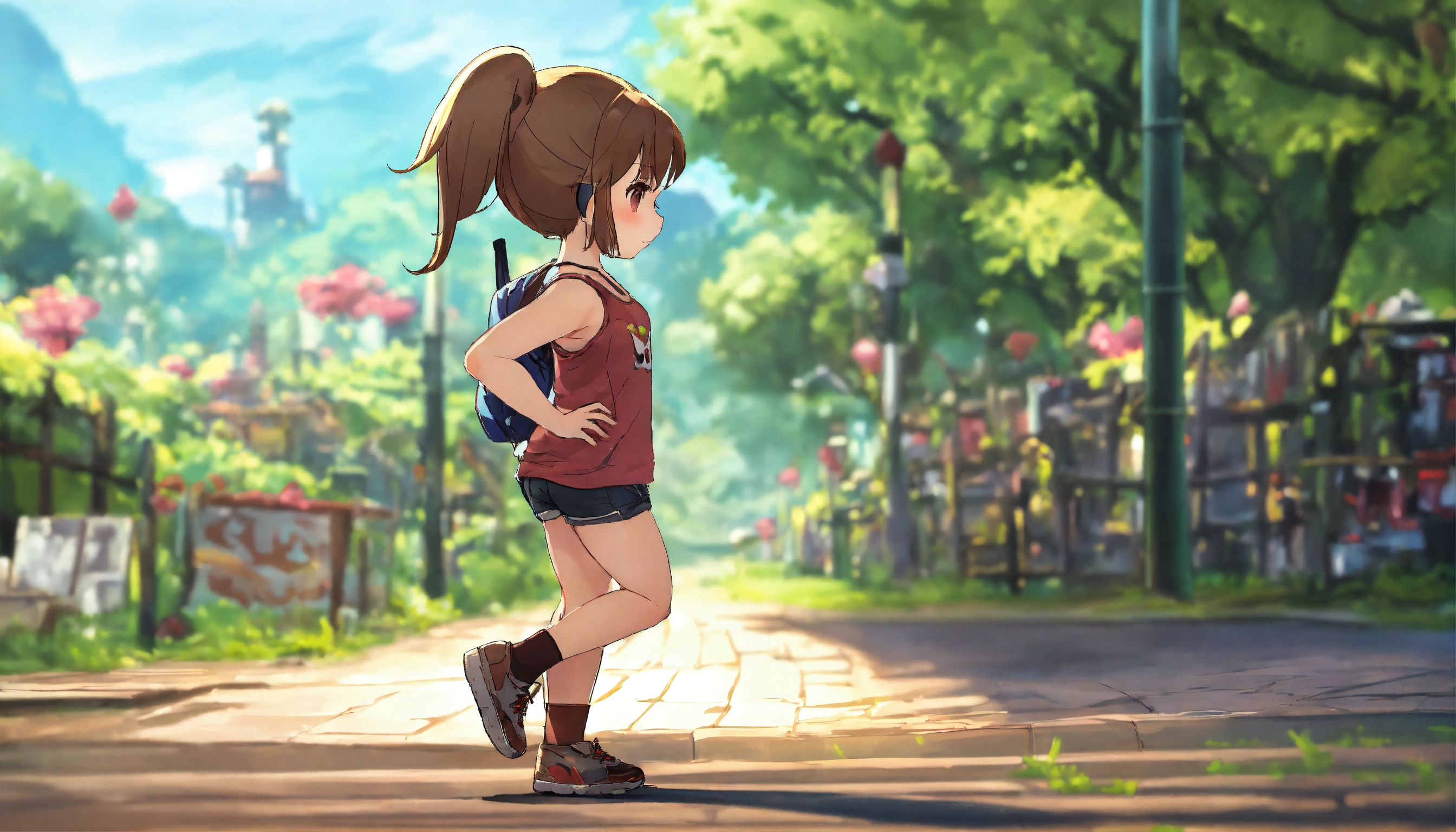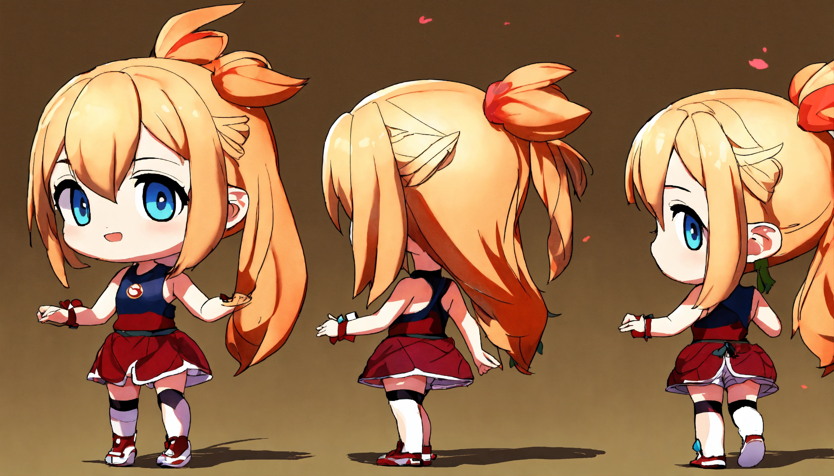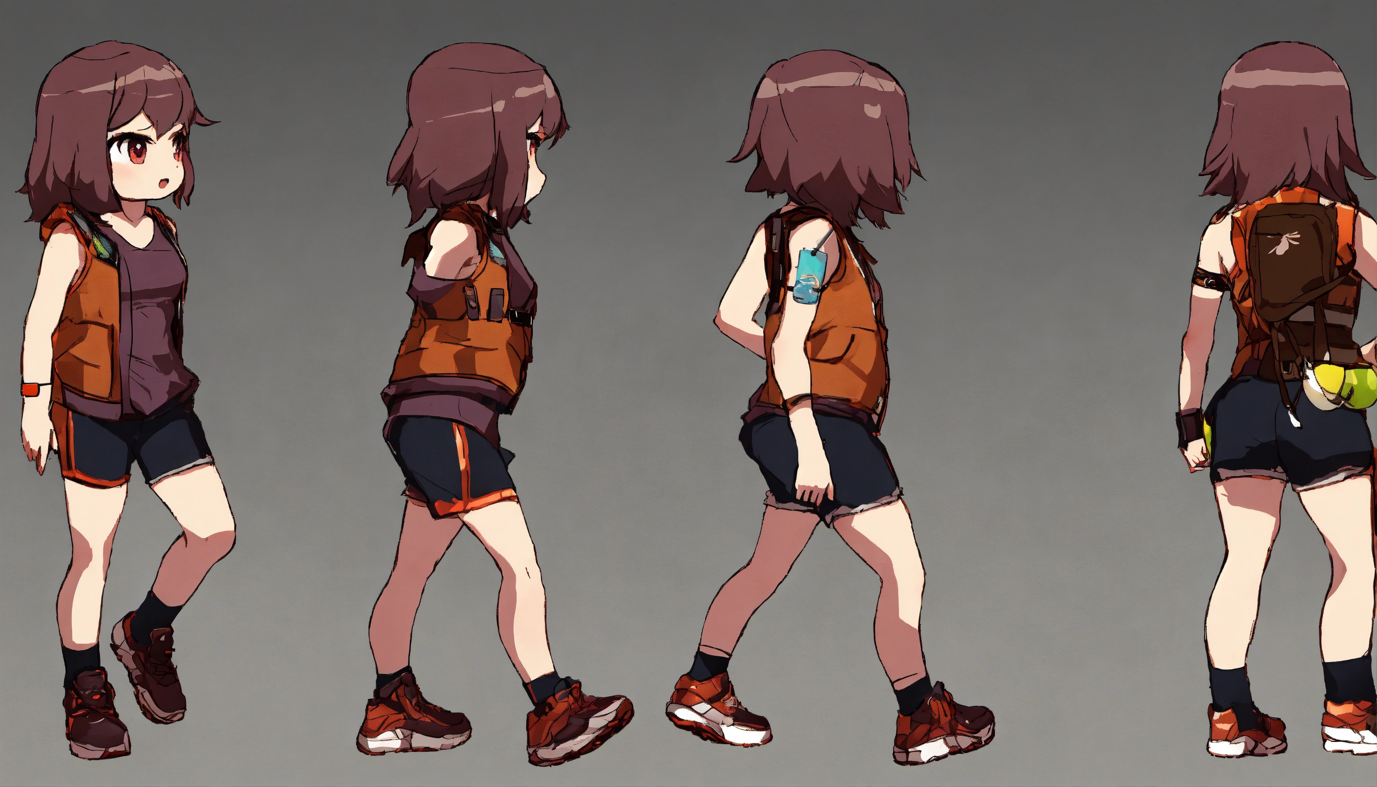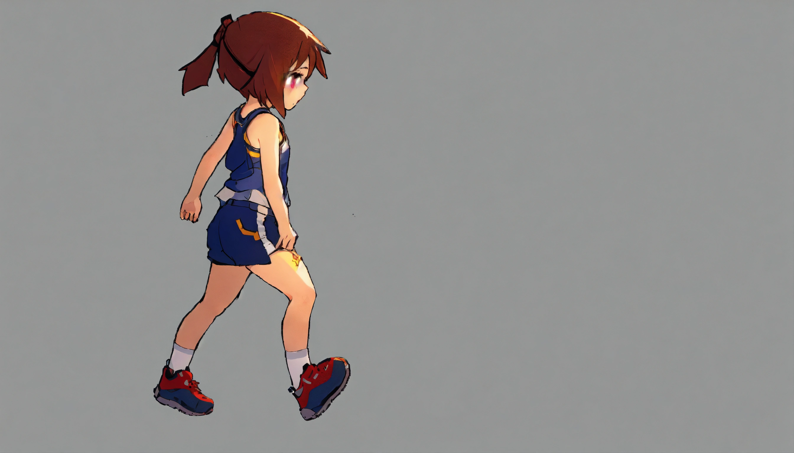Game art, girl, tank top, shorts, walking, (side view), full body view, chibi propotions, blank background, no outline