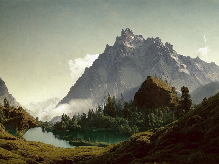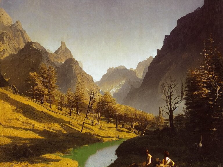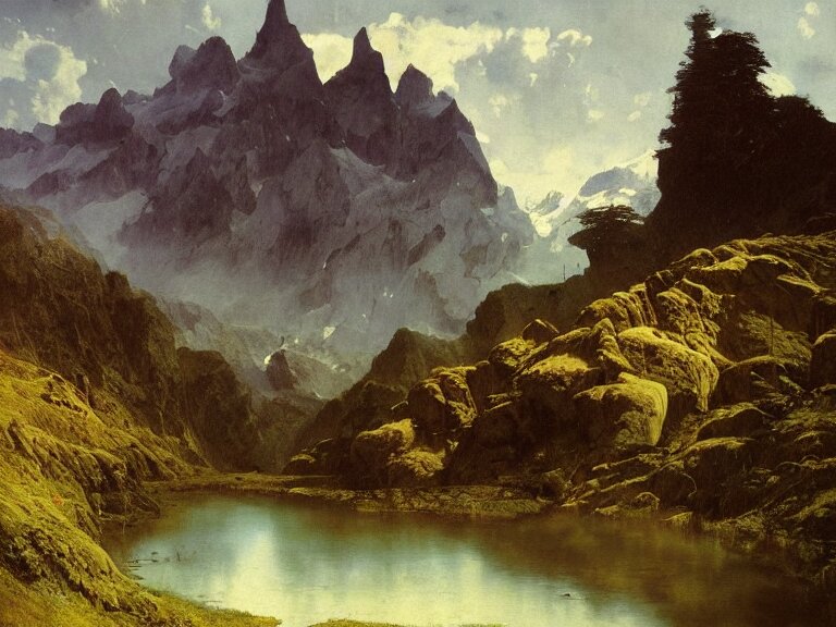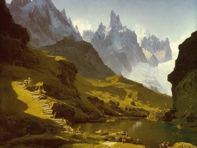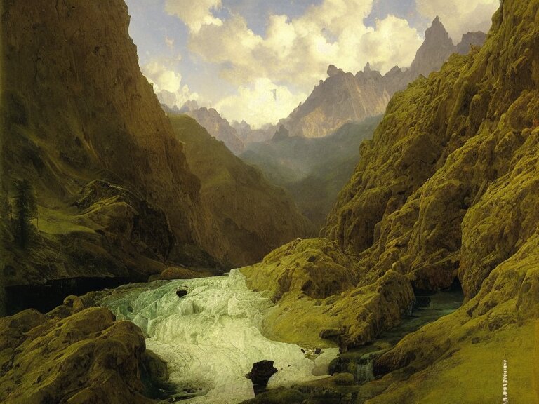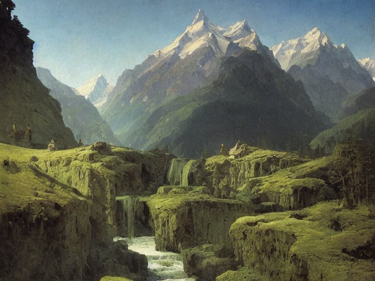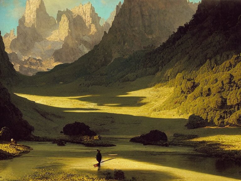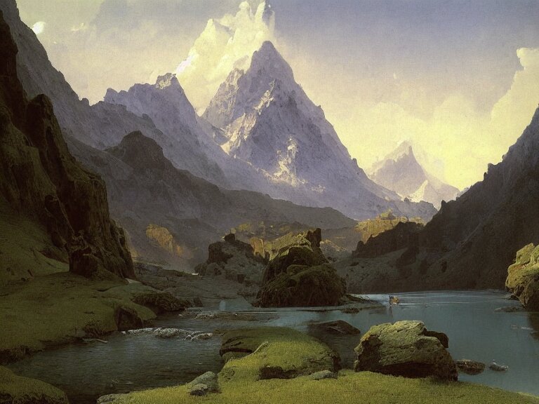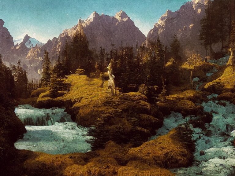 An oil painting of an alpine river and a distaint mountain on a beautiful morning by beksinski carl spitzweg and tuomas korpi. baroque elements, full-length view. baroque element. intricate artwork by caravaggio. trending on artstation. 8k