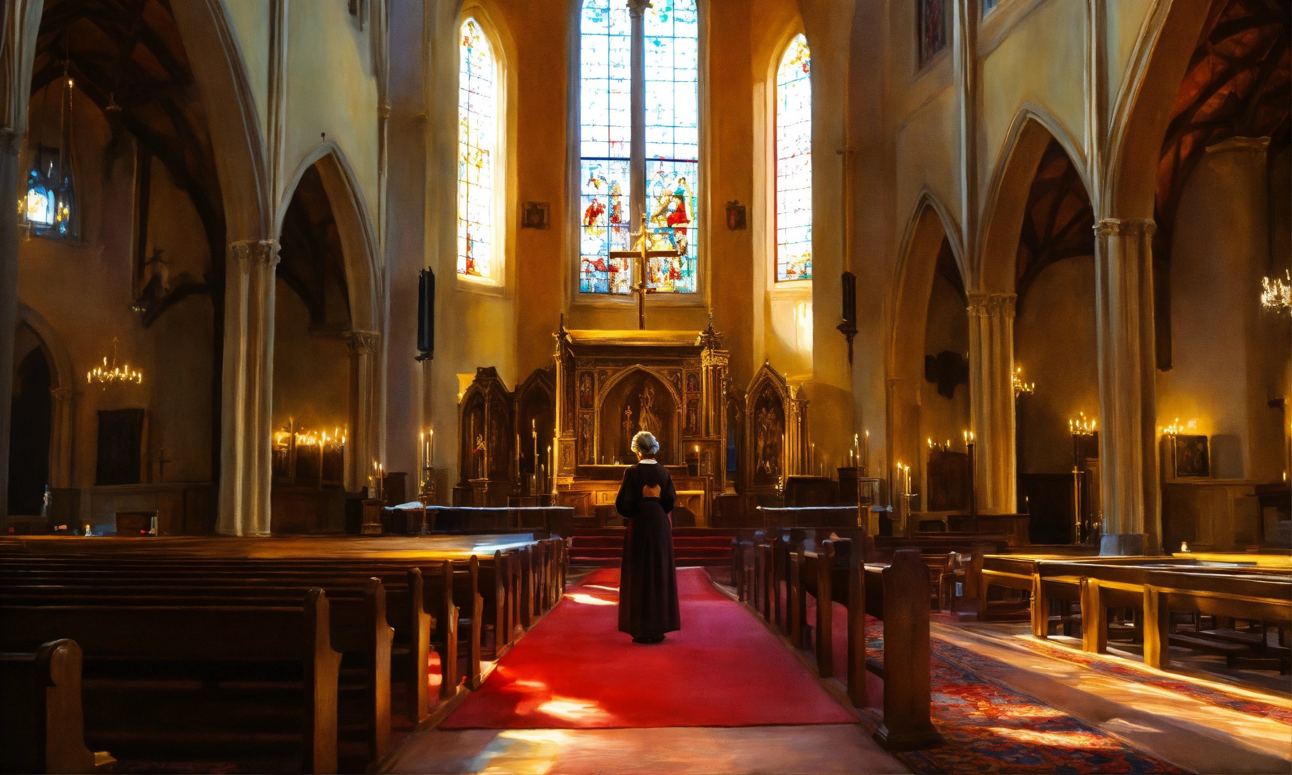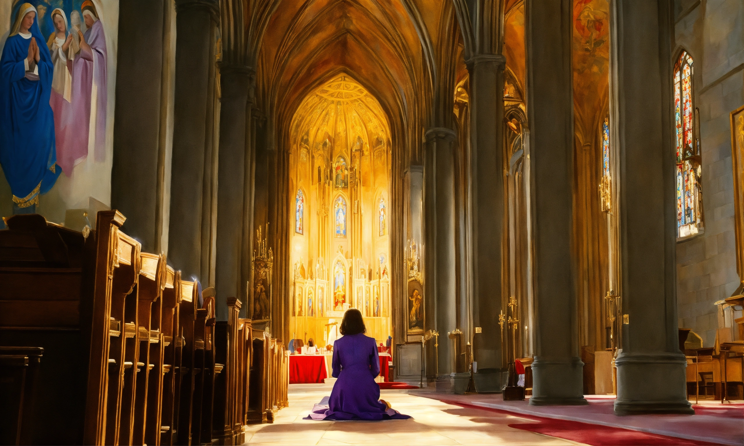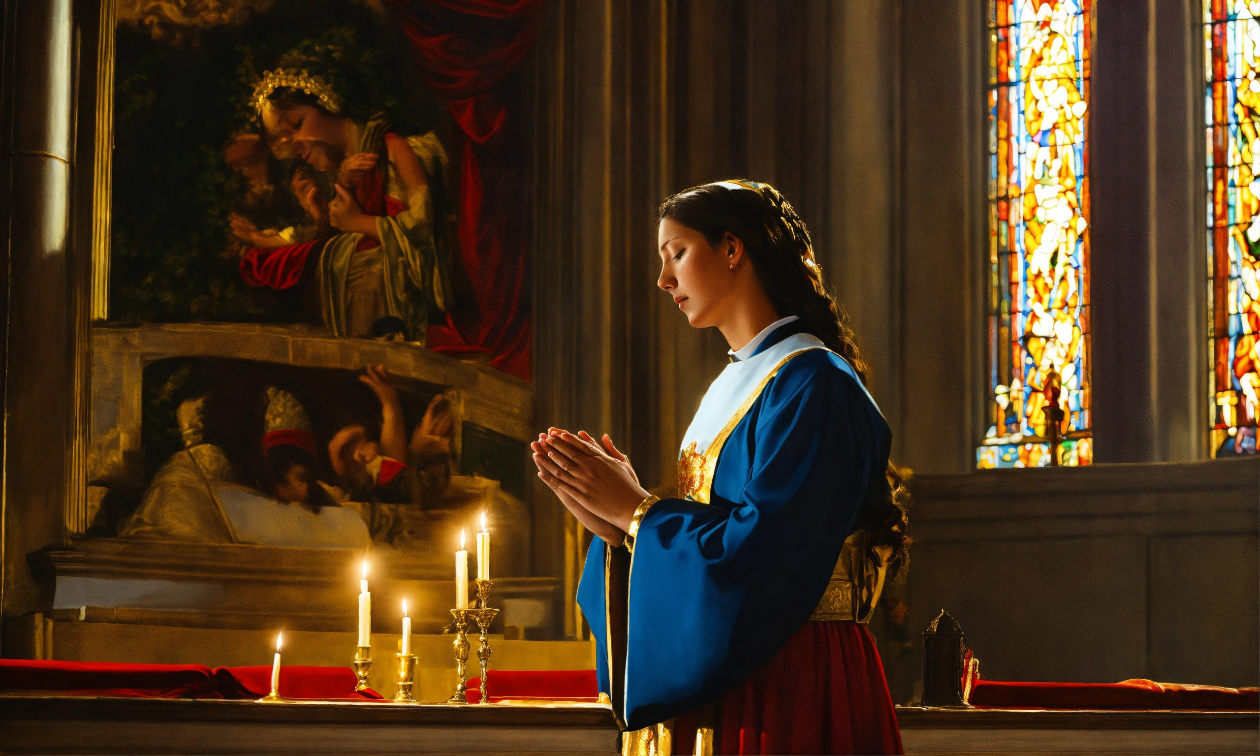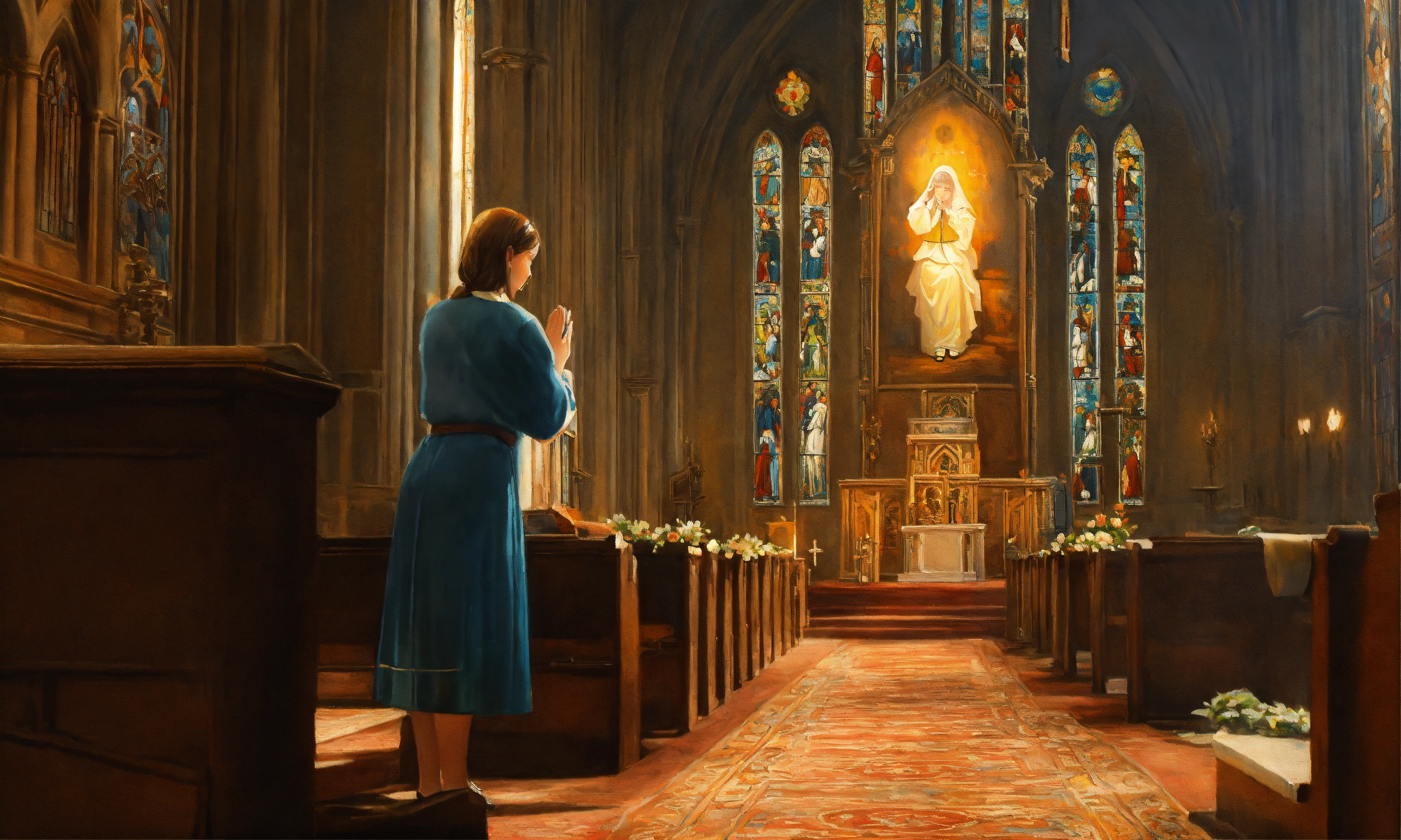 Oil painting of a woman in church praying to god