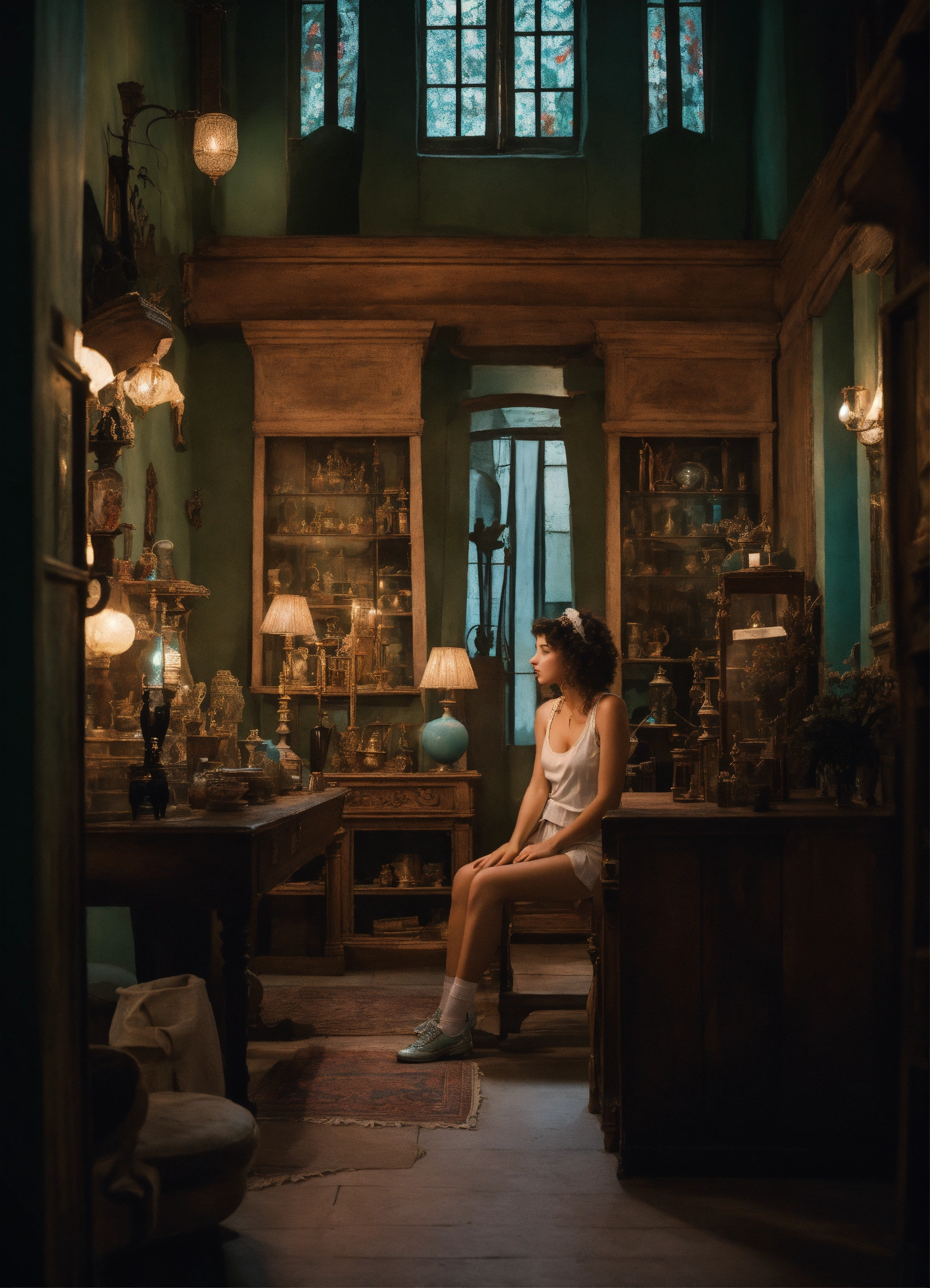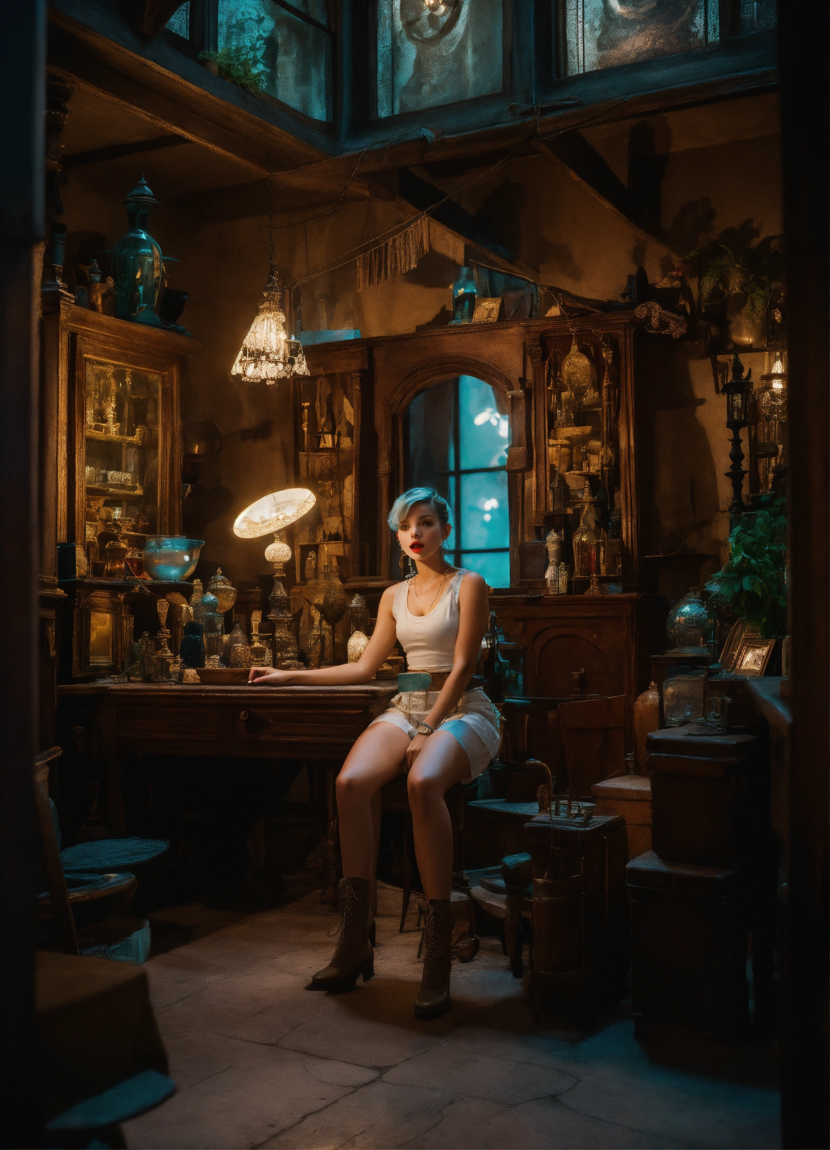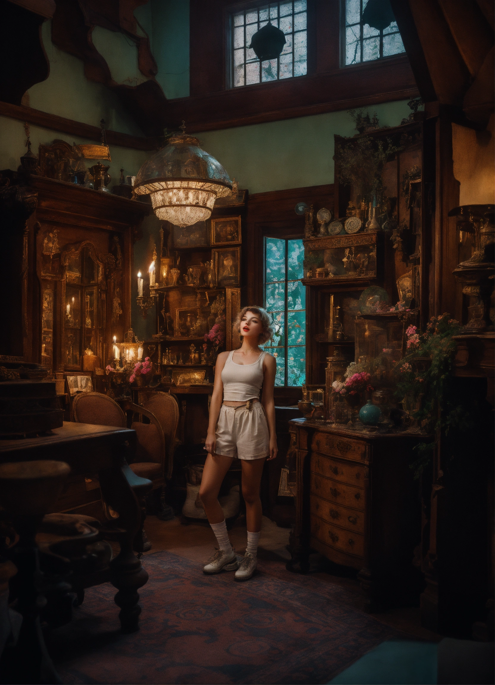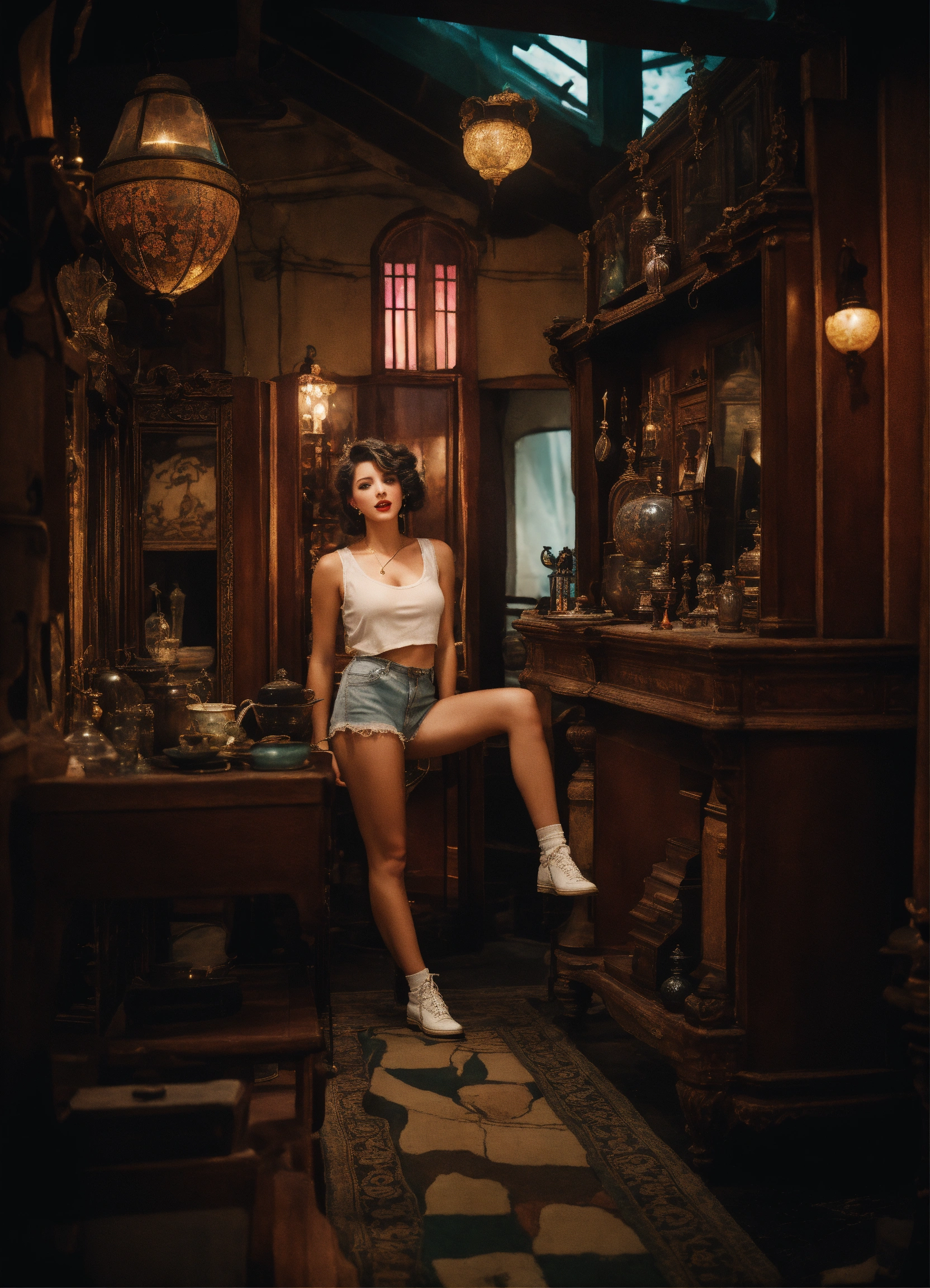 A hyper-realistic photograph of "within a medieval parlor, a mischievous poltergeist playfully rearranges antique curiosities, extremely cute and desirable french young woman with a white shirt tank top and a short, retro-futuristic vaporwave aesthetic." 64k, editorial shot, muted colors, silent colors