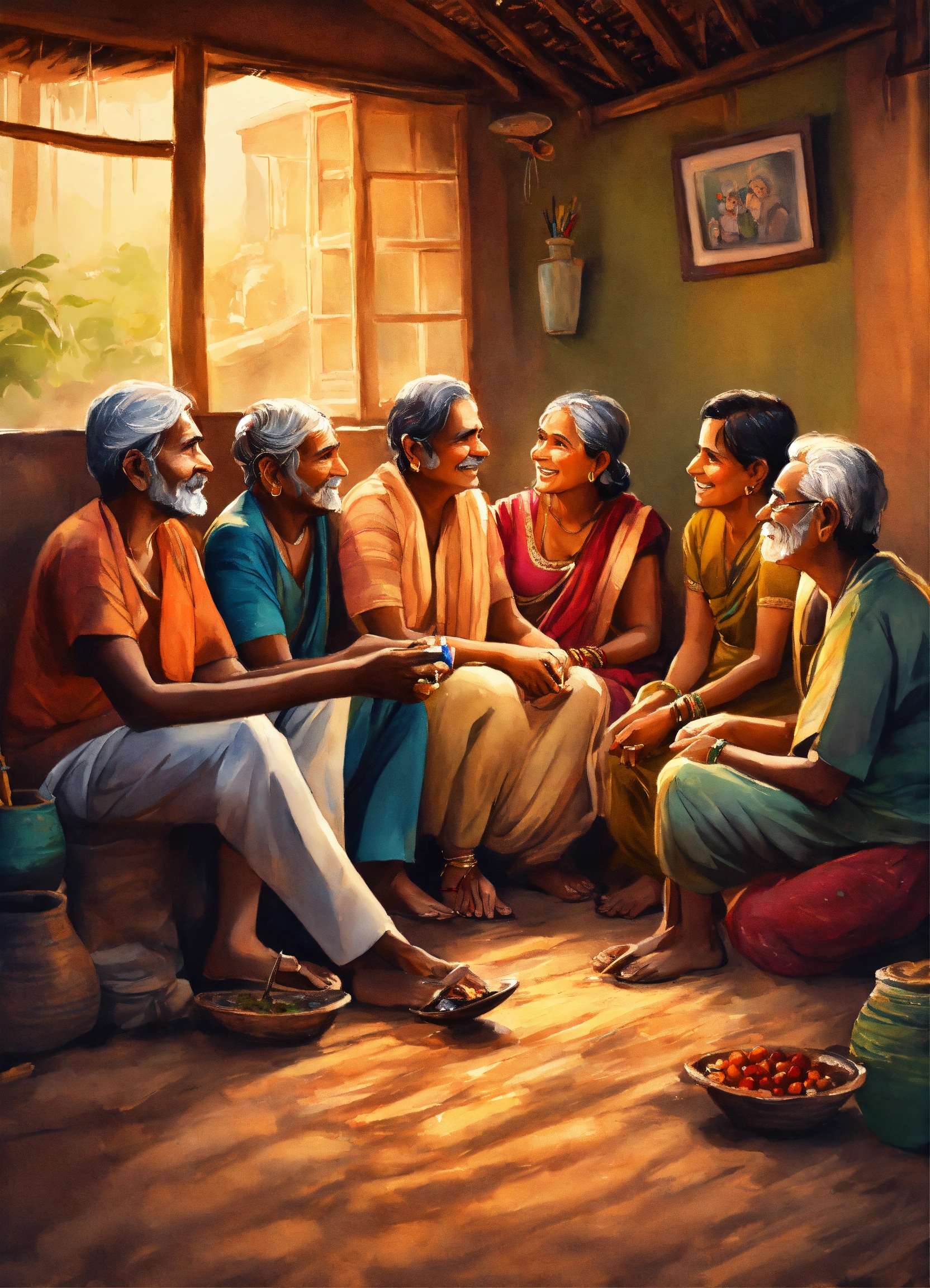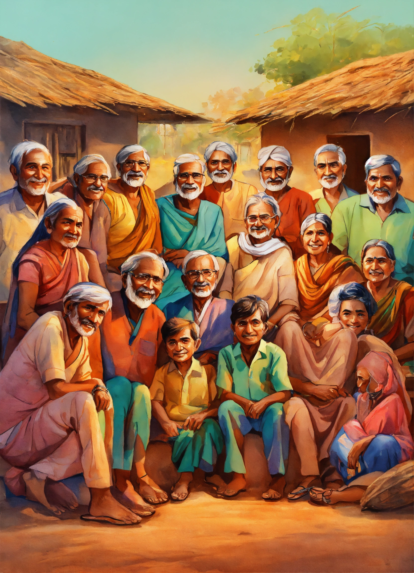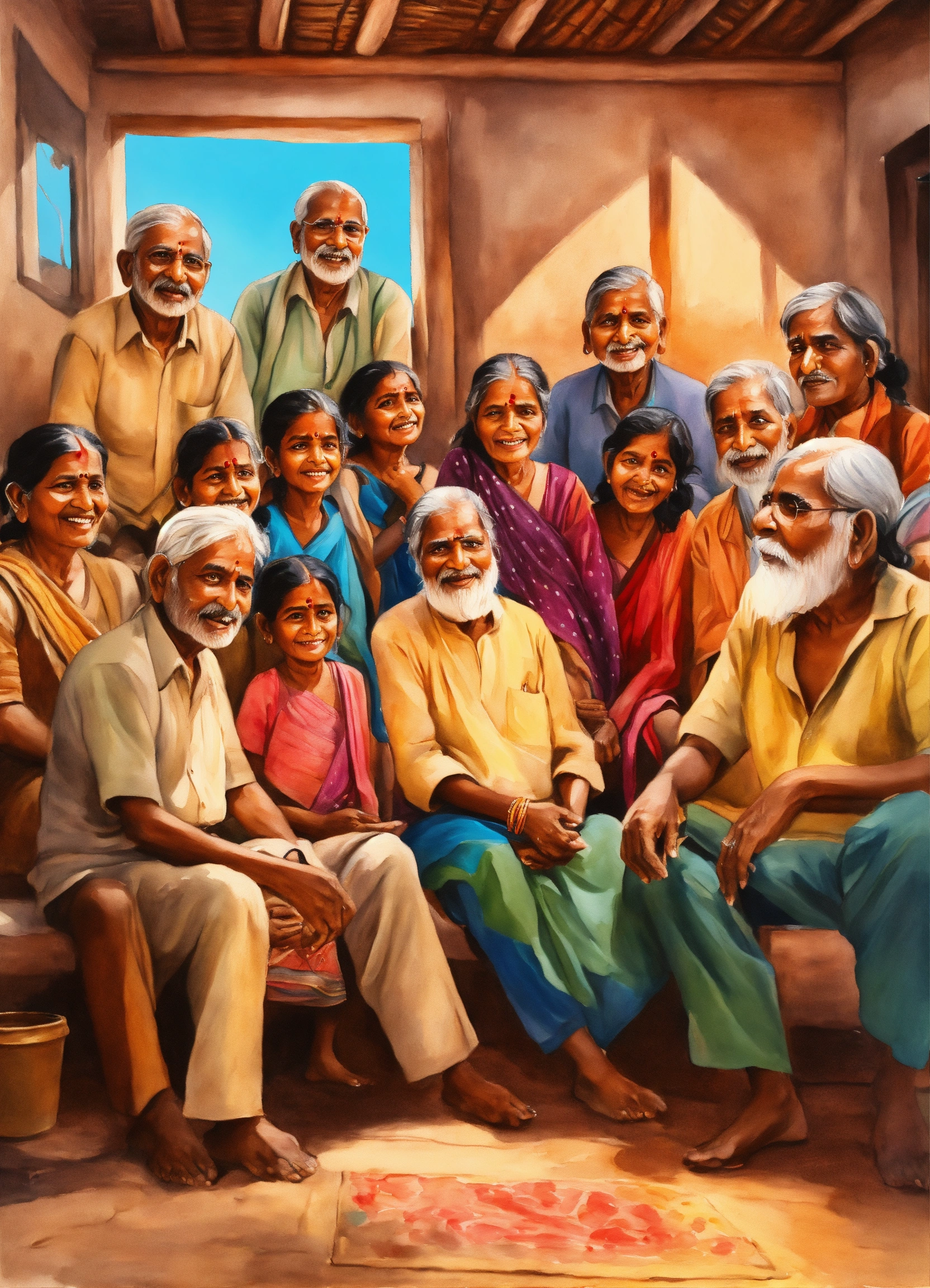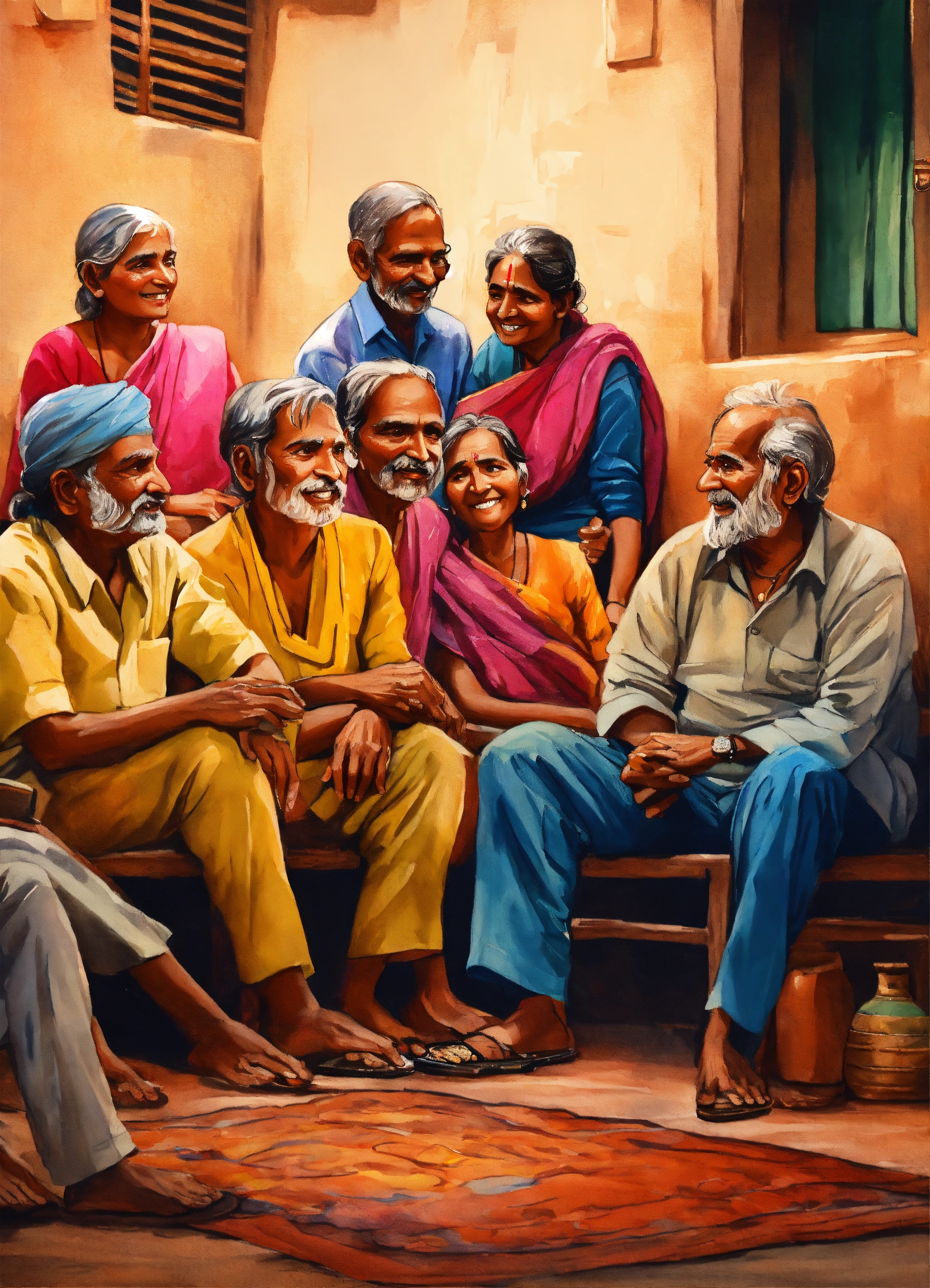 A hand drawn painting of a group of indian villagers including children, middle aged people, and old people, sitting together watching a tv, smiling, 8k, sharp, detailed, vibrant, vivid
