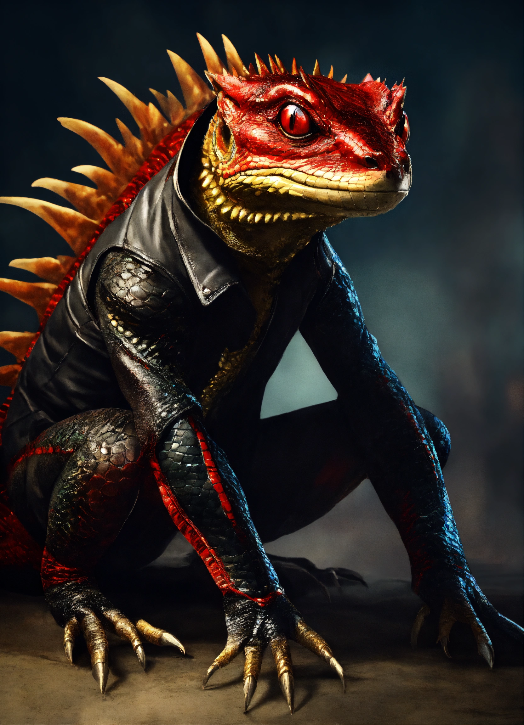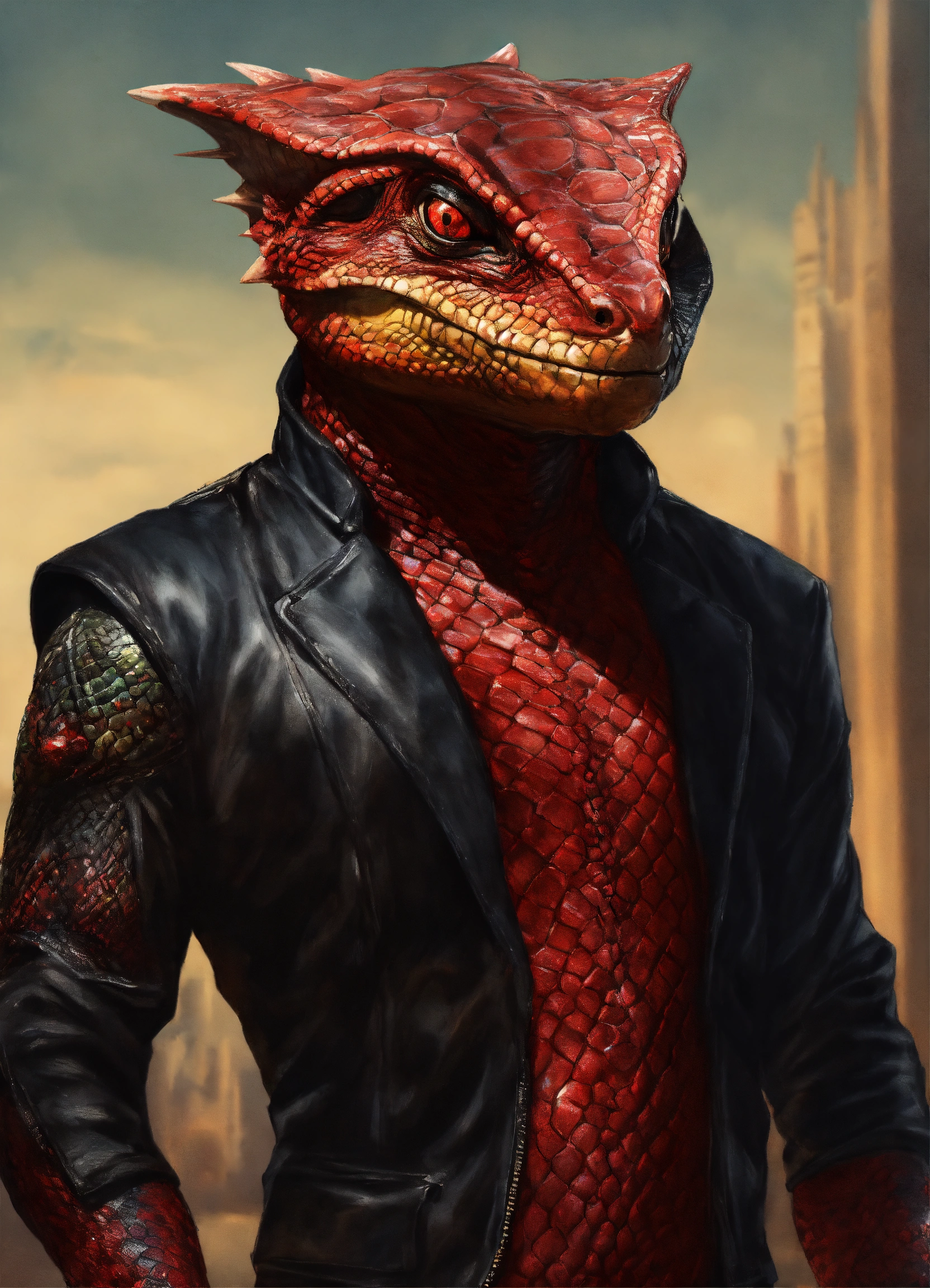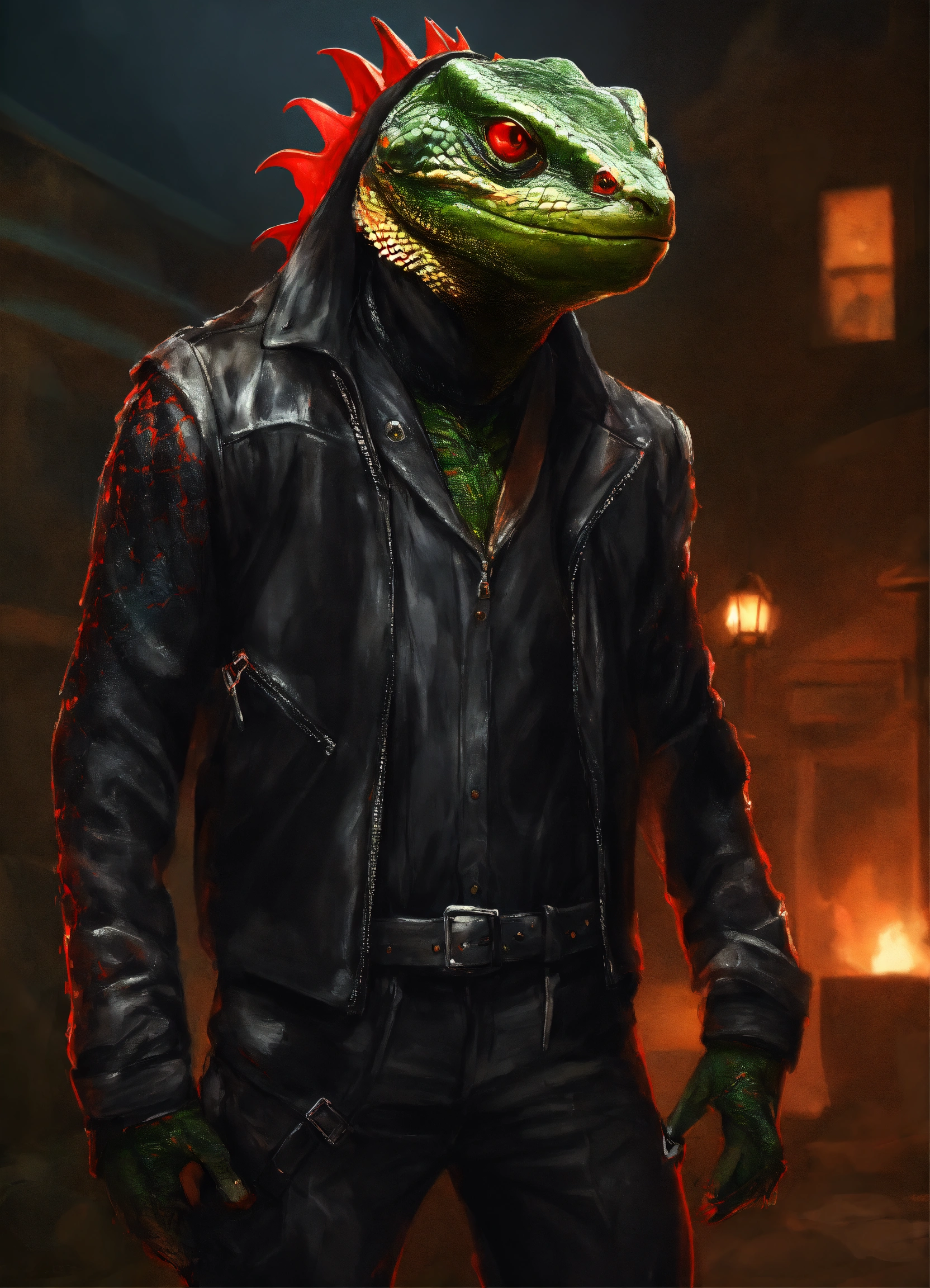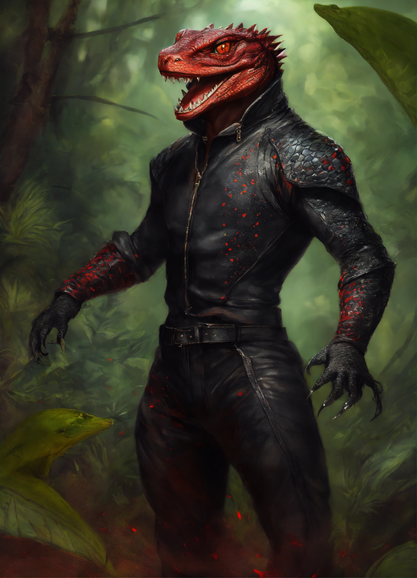 Realistic drawing a full body portrait of a mutant lizard-human hybrid, with red reptilian eyes. feline smile. wearing a black leather outfit.