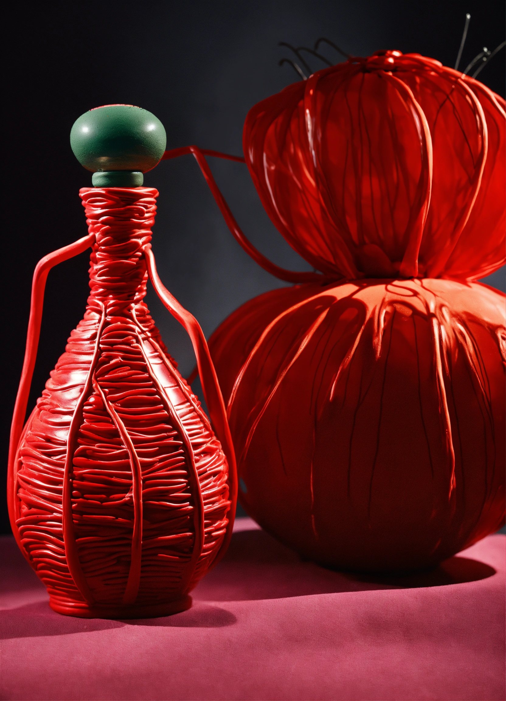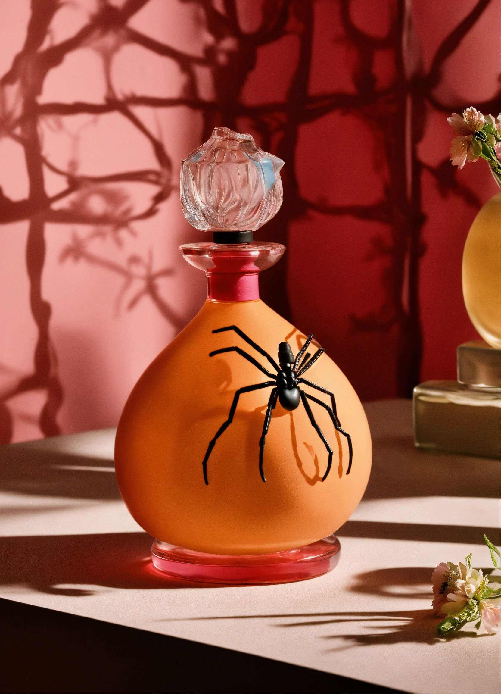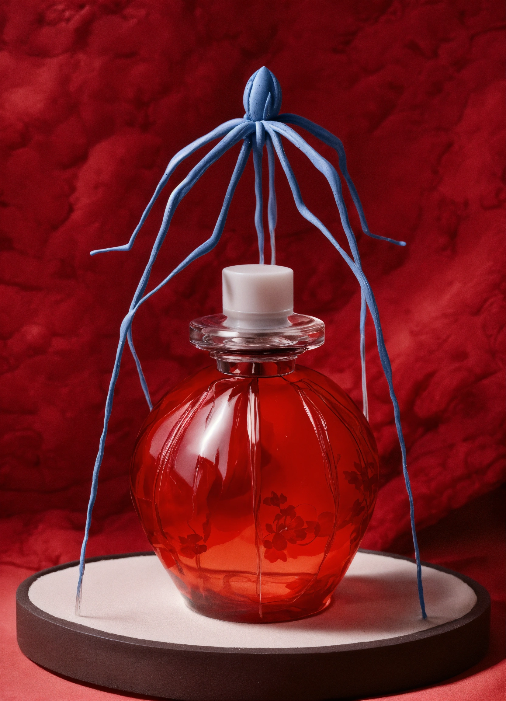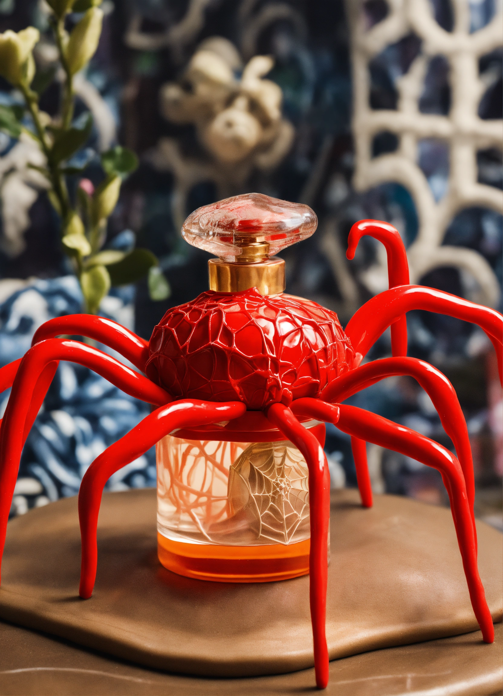 Hand-made modeling clay work. floral-inspired scent bottle, louise bourgeois, her sculpture called "maman" representing a huge spider combined with perfume bottle, gallery art exposition, close up view on fragrance bottles, louise bourgeois the 90s virtual artist universe