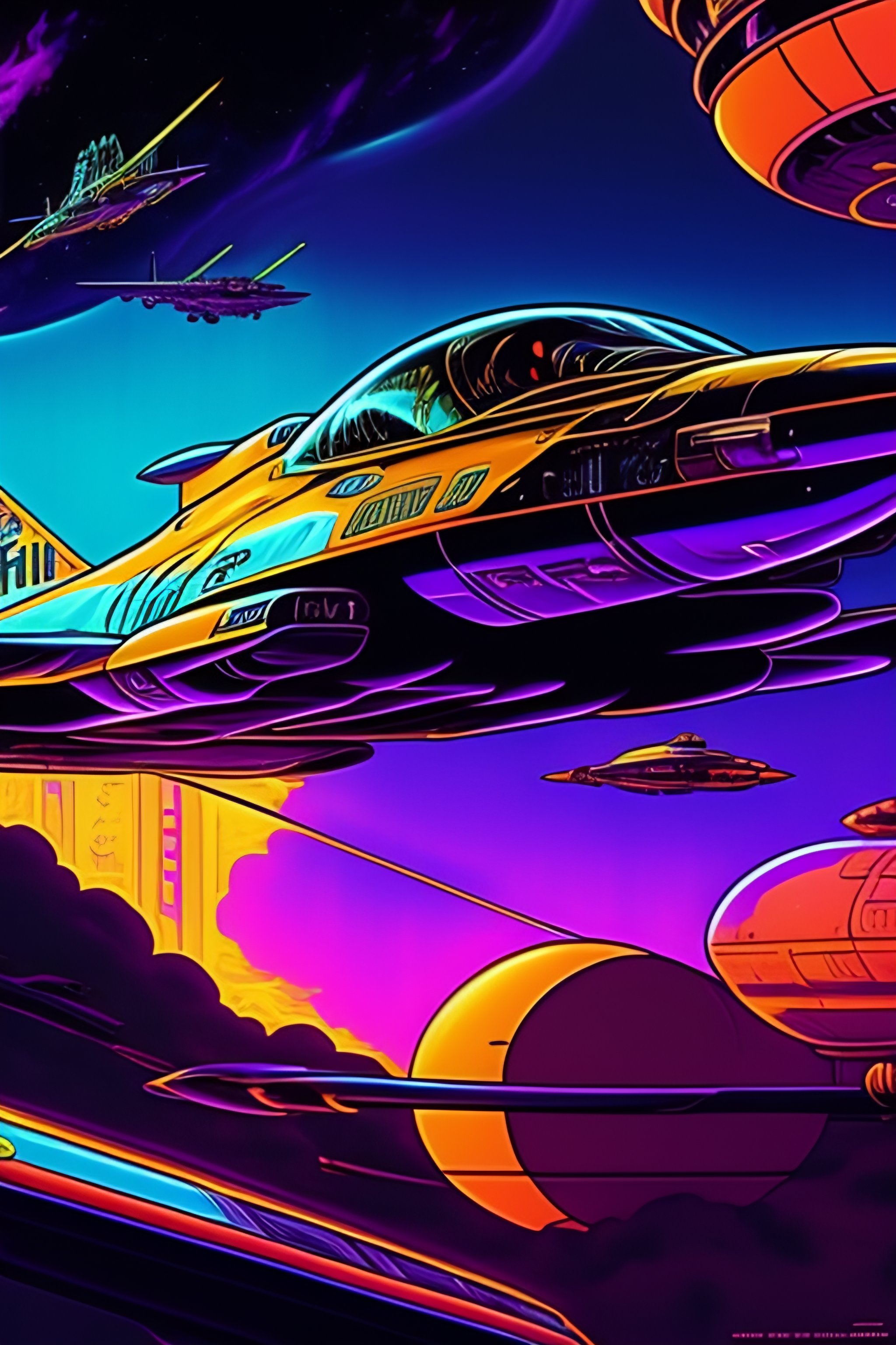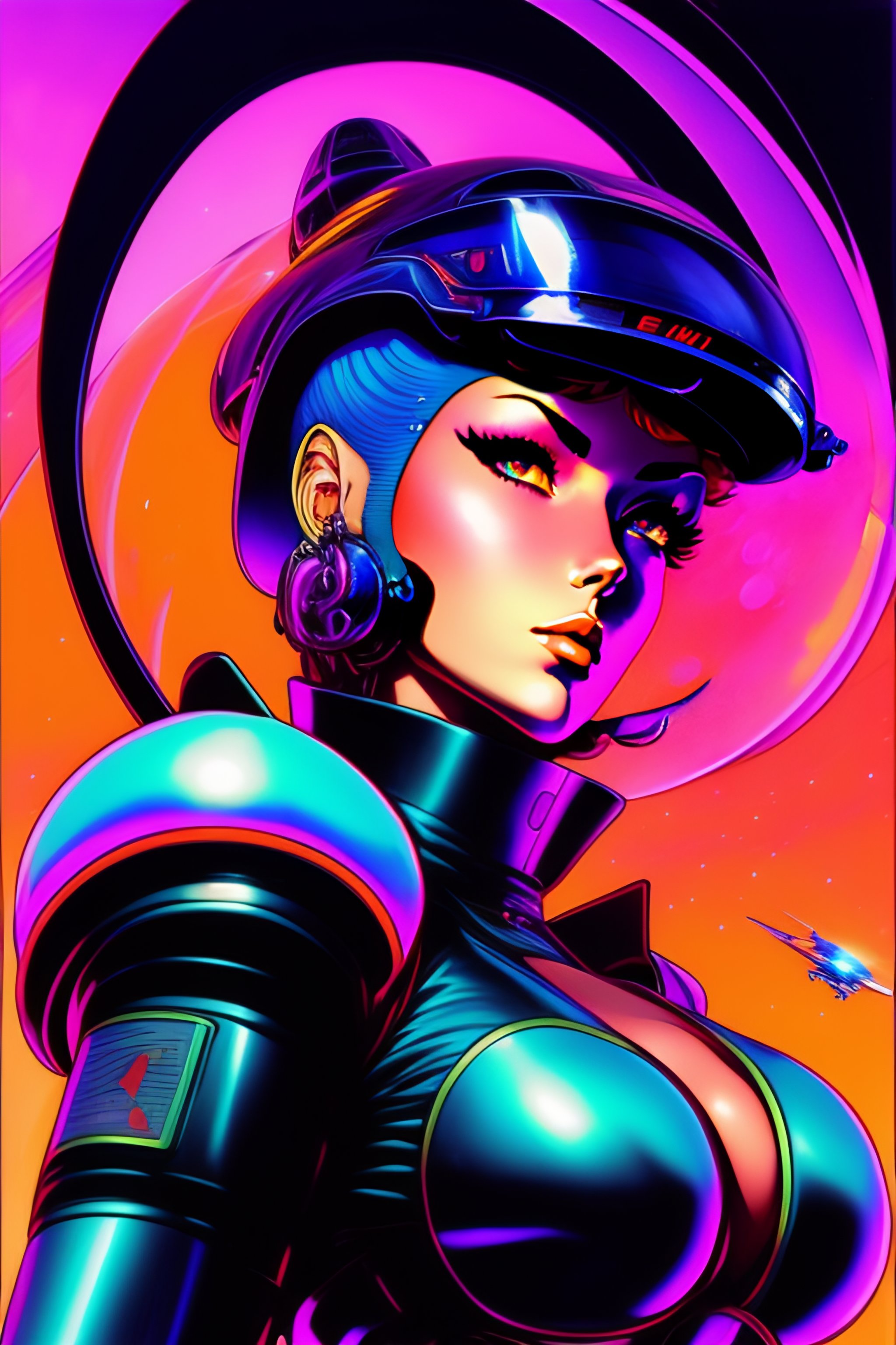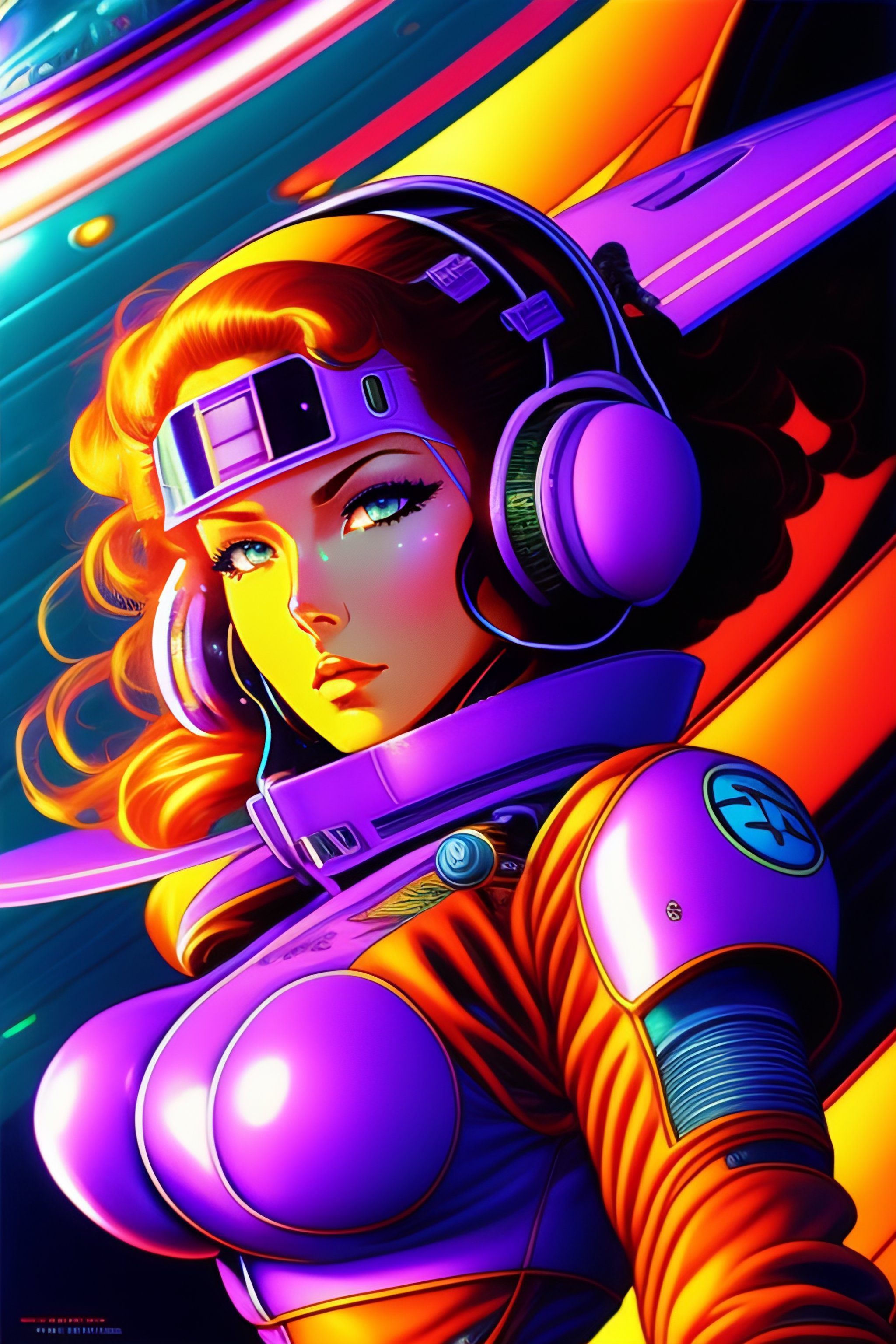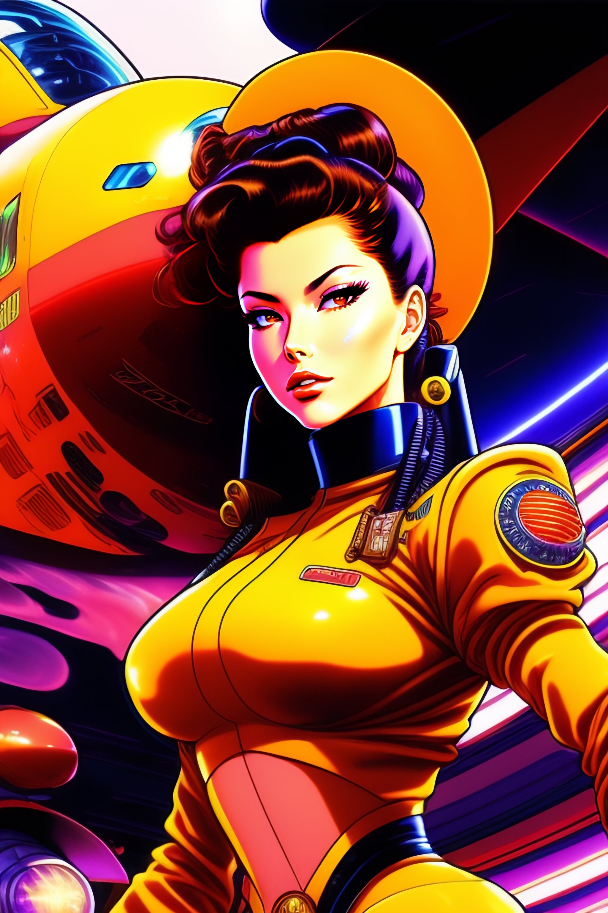Fighter jet, vintage 90's anime style. soviet girl, cluttered starship interior; alien from movie alien art; by hajime sorayama, greg tocchini, virgil finlay, sci-fi, colors, neon lights. line art.