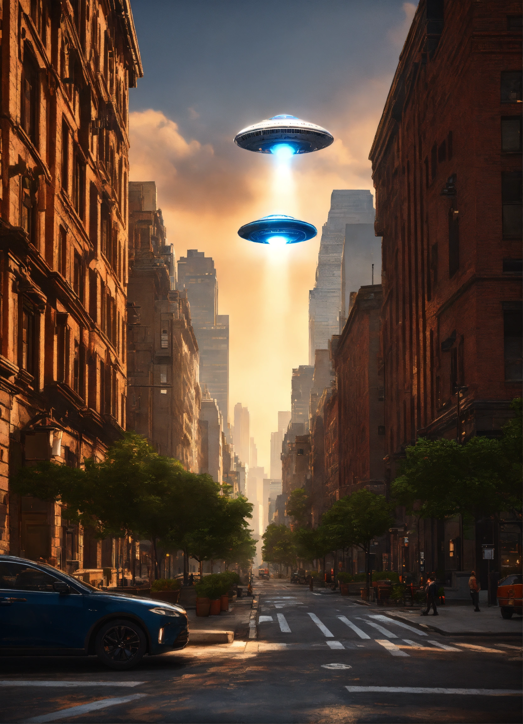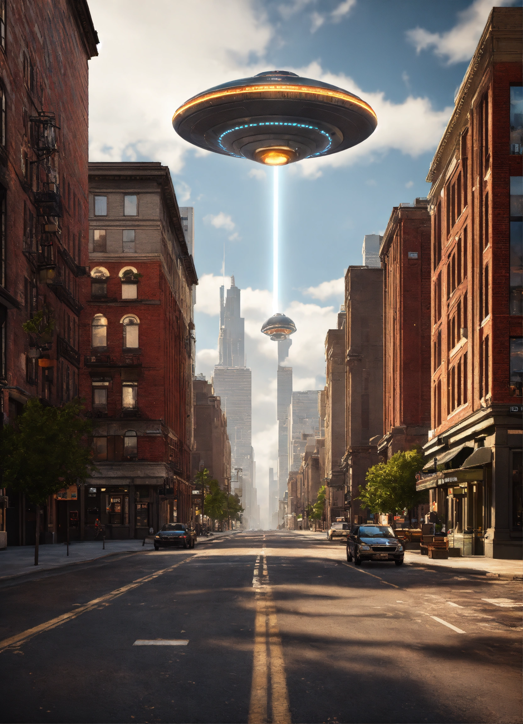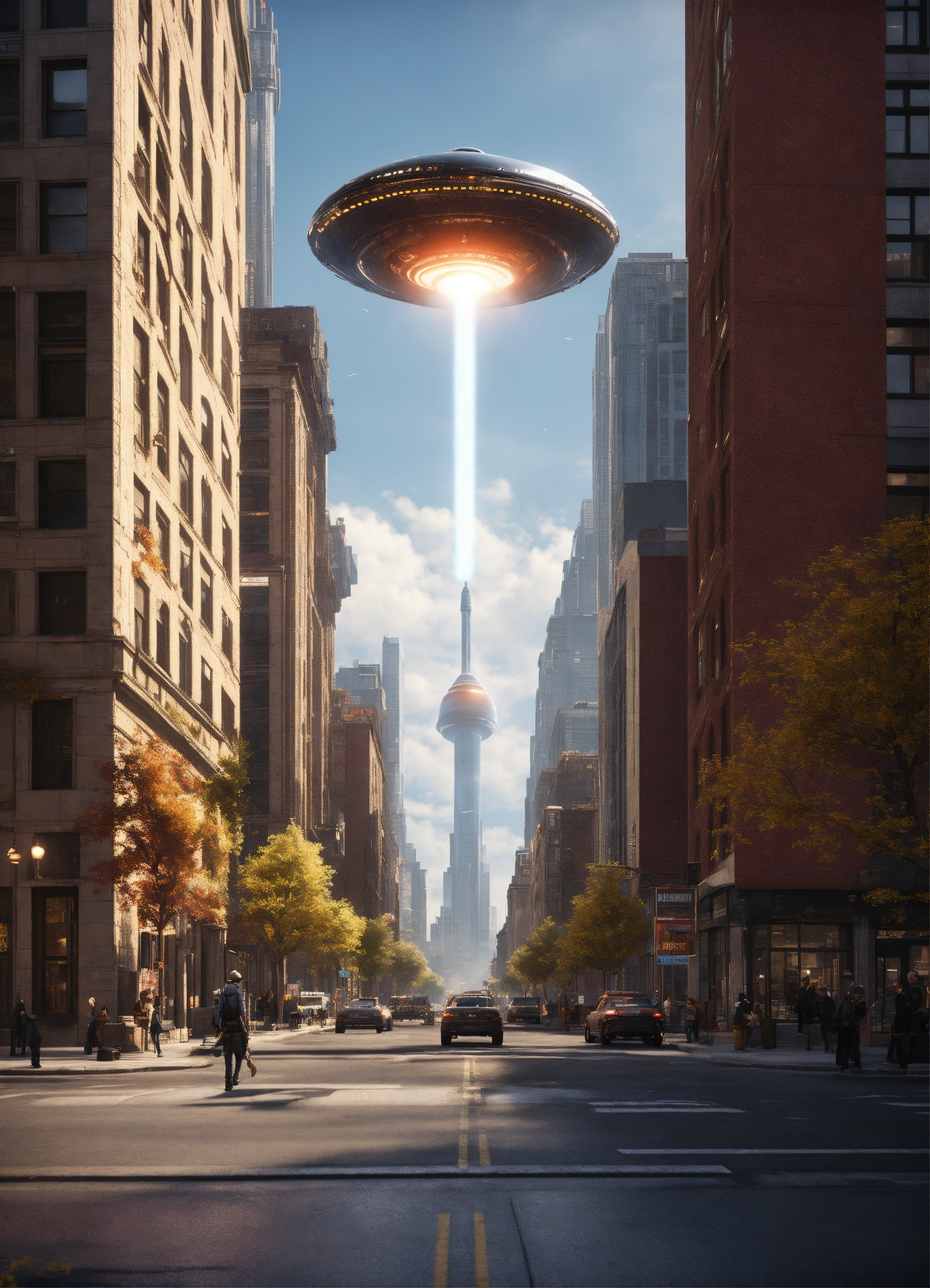 A realistic photograph of a new your city street scene where the buildings part down the middle to reveal a ufo approaching, unreal engine, super detailed