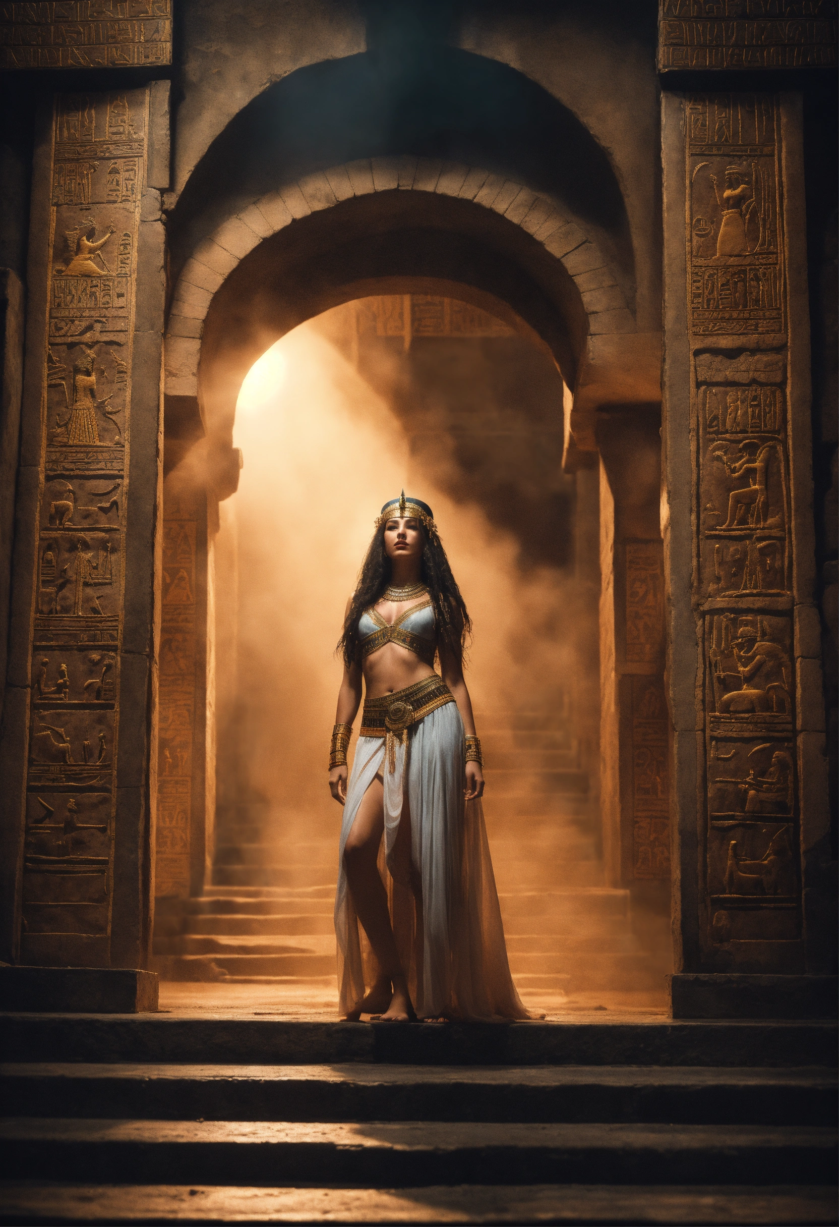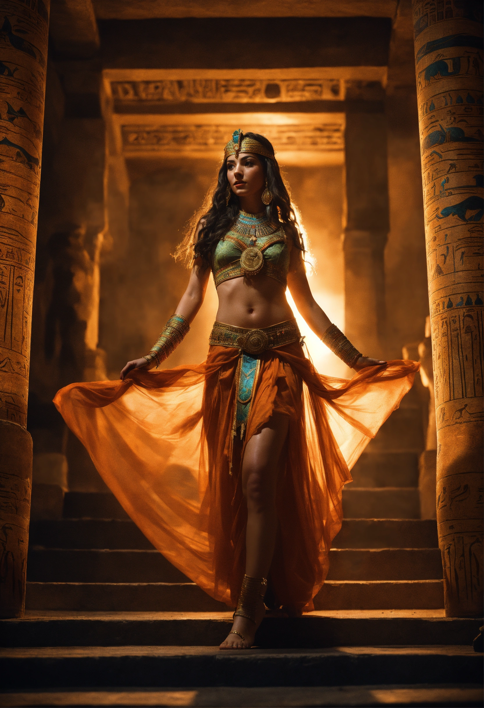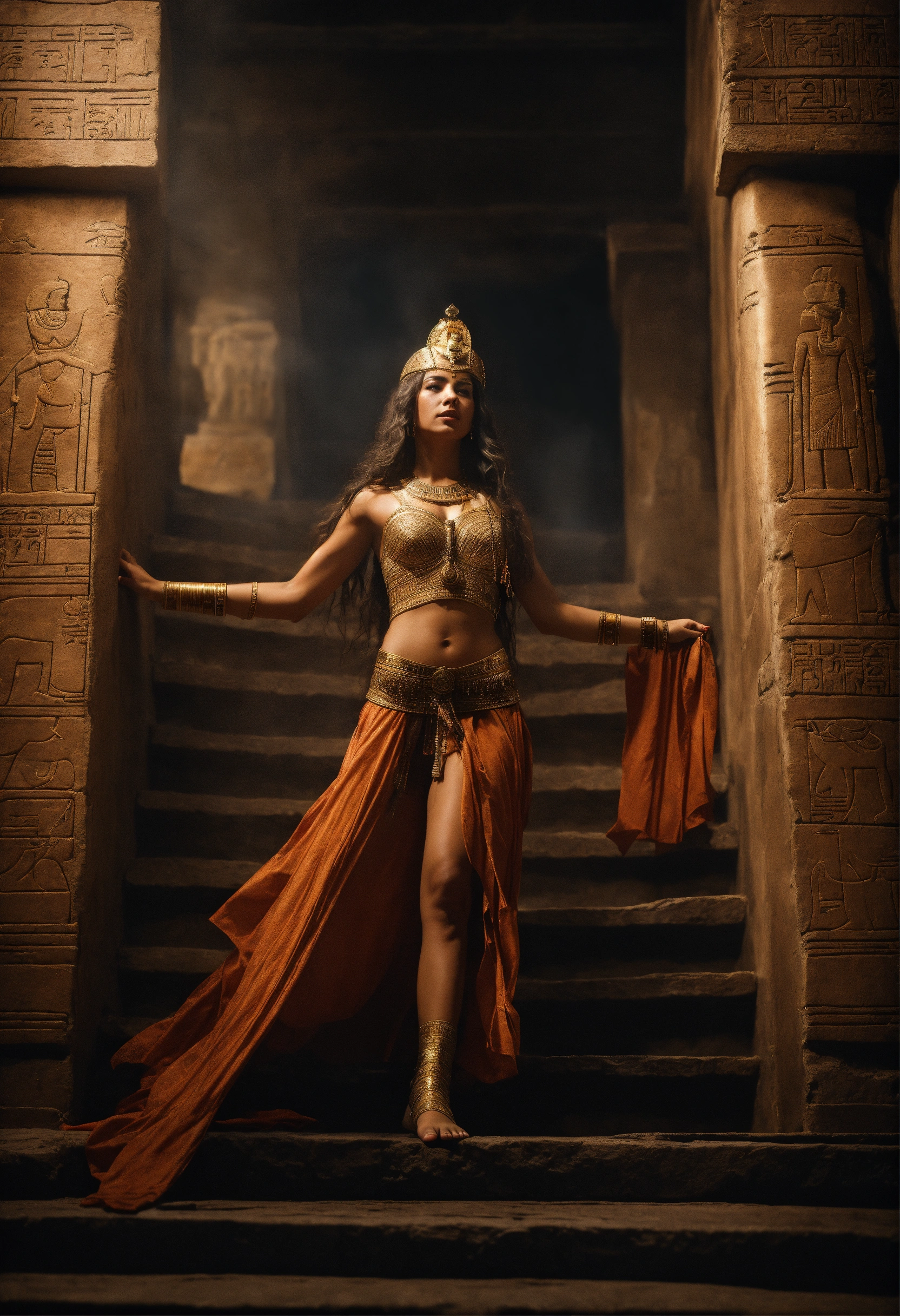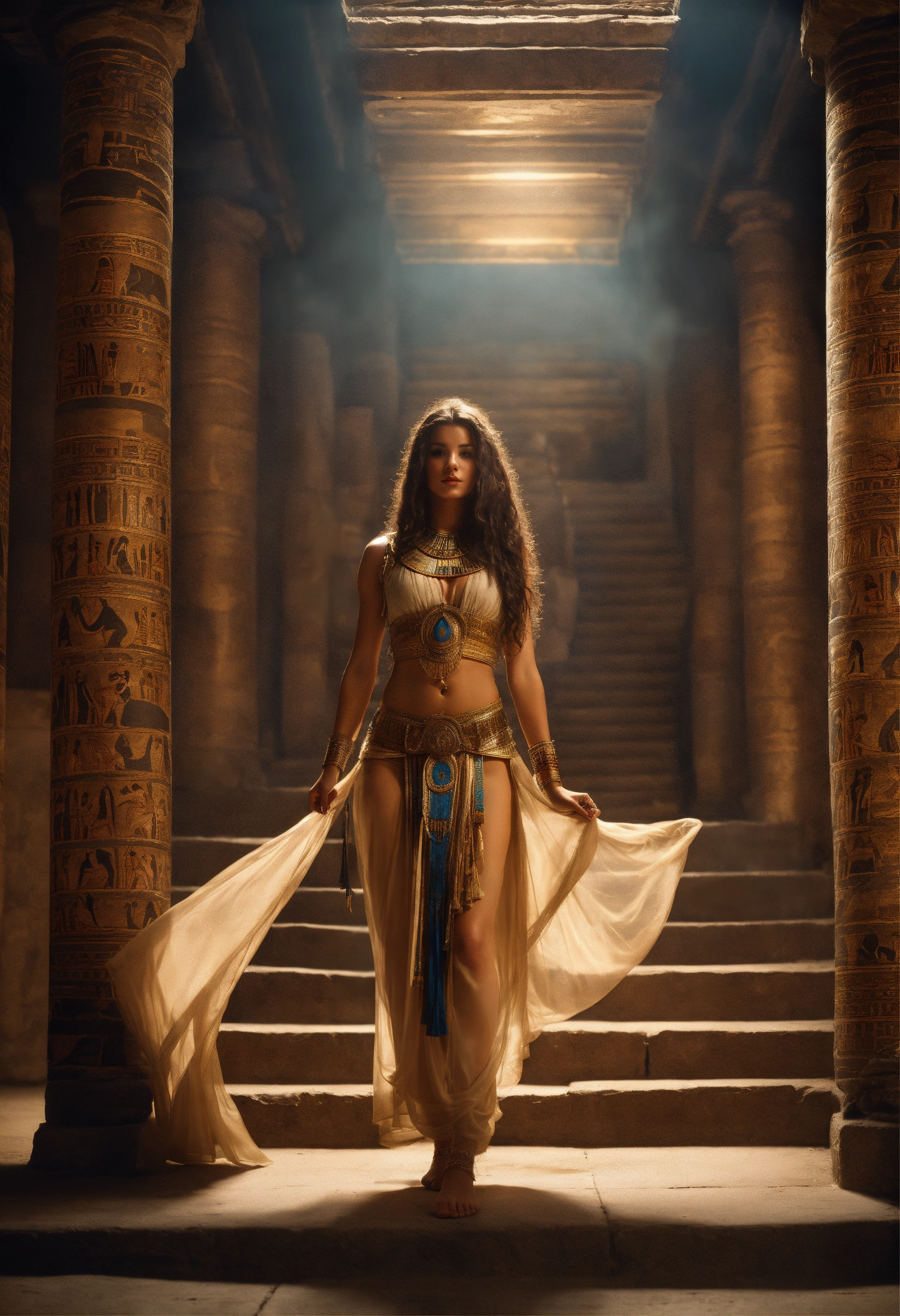 An epic fantasy scene in ancient egypt featuring a gorgeous and beautiful female with long hair, bare feet, in attractive outfit of a crete dancer, in full height, going down the stairs in a dark vault. mysterious and misty atmosphere. side view, sharp detail.