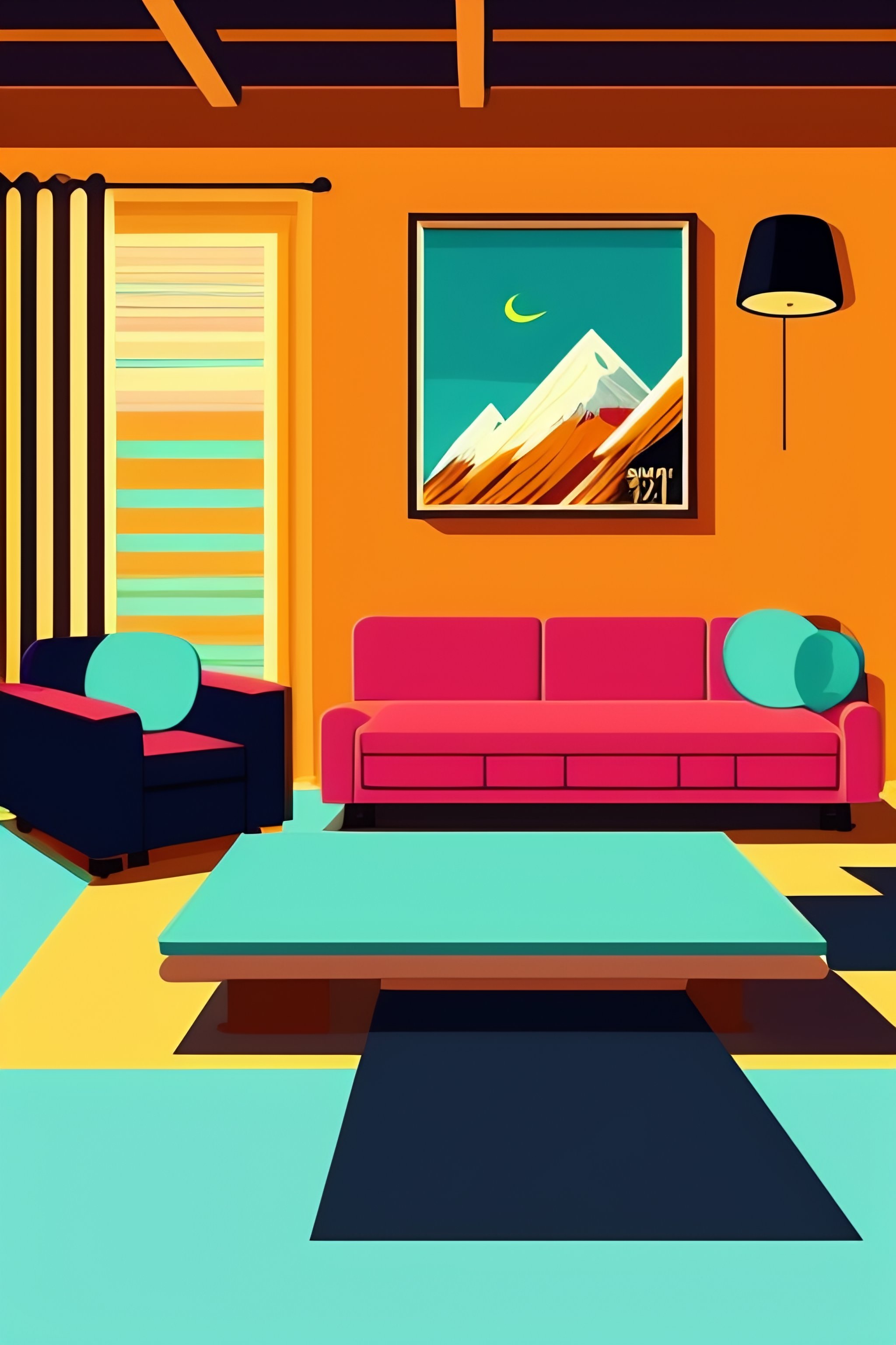 2d cartoon background in the style of south park of a family living room in the 1980's, midwest, couch and a tv, kitchen in the background. flat, retro, colorful