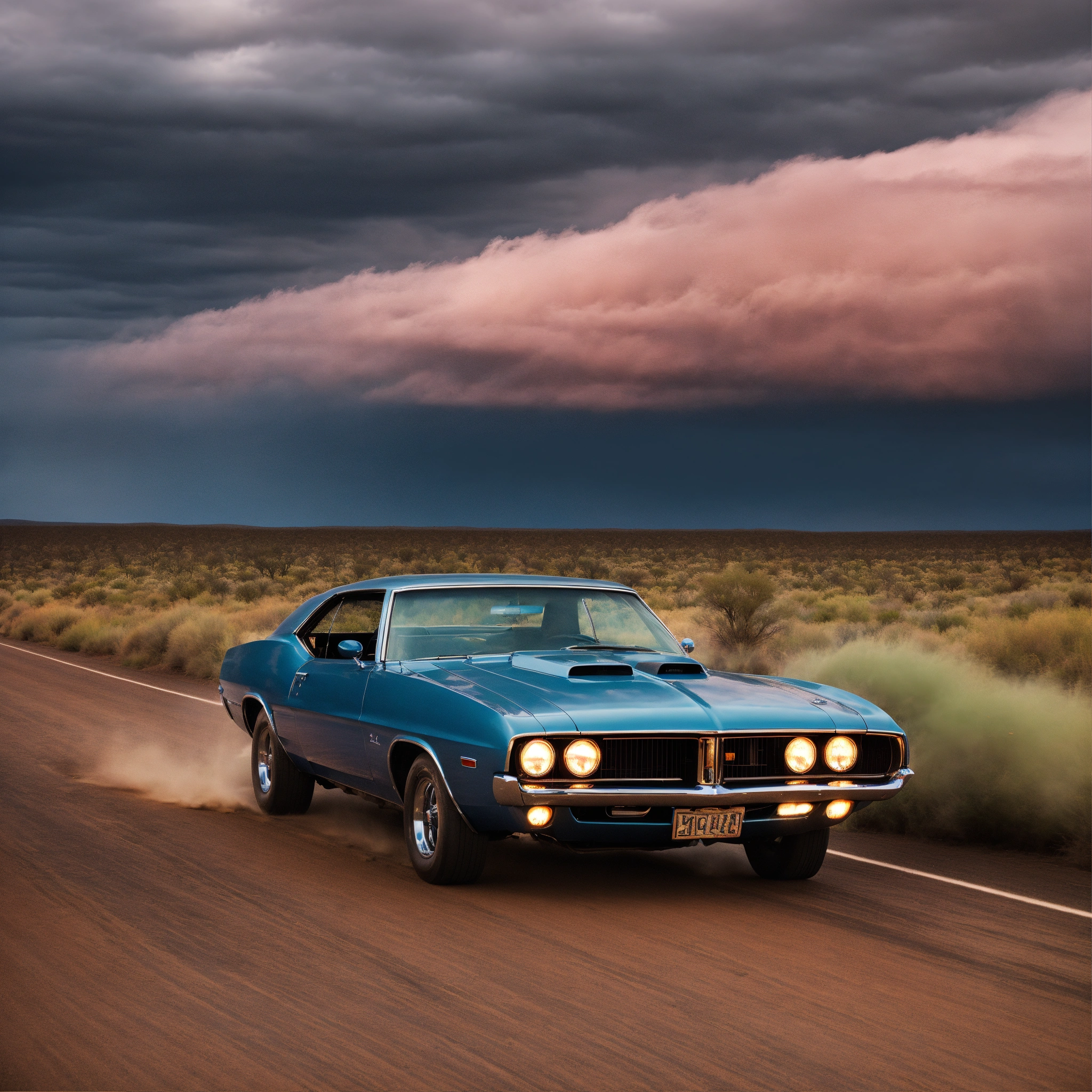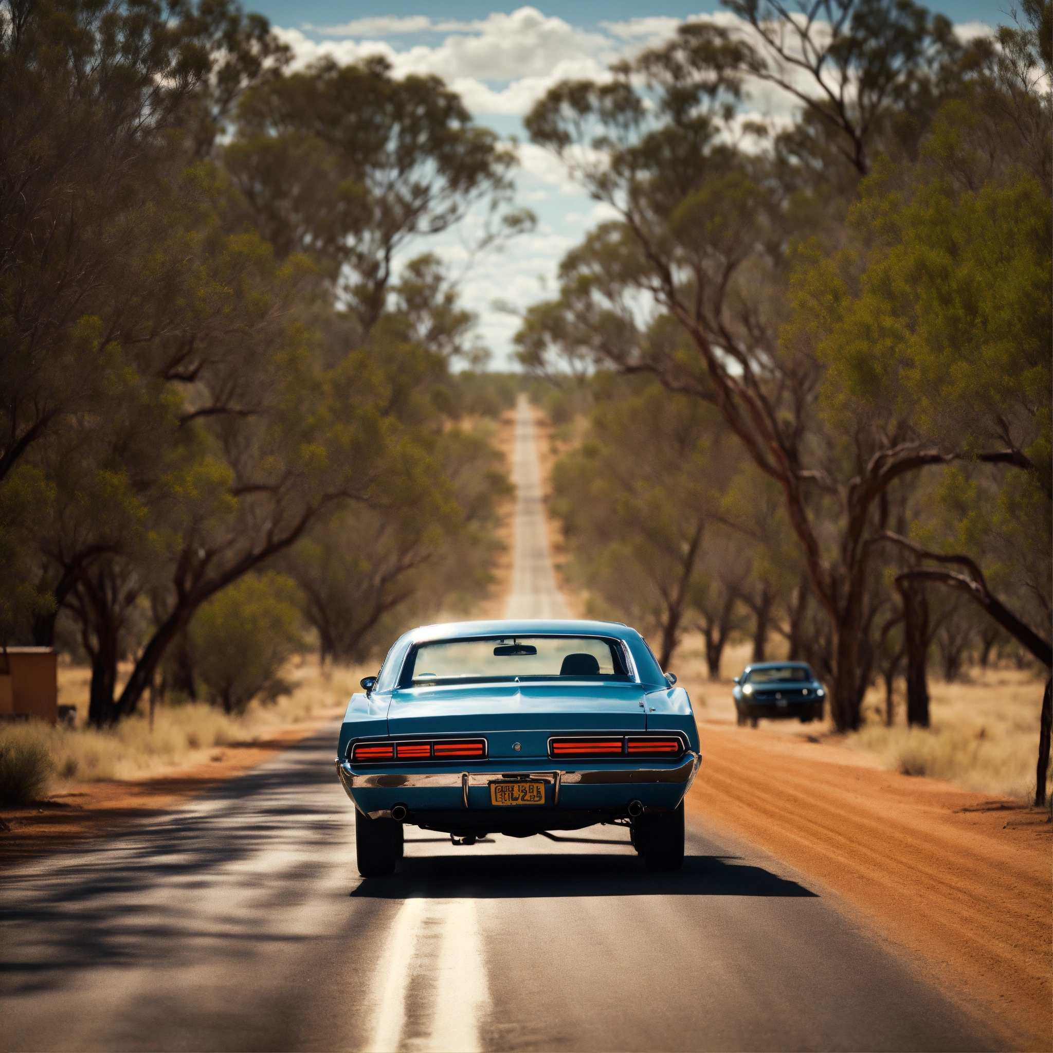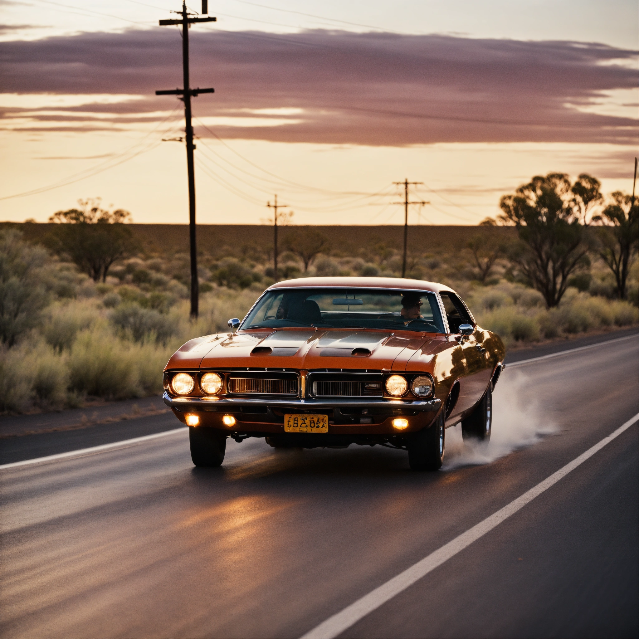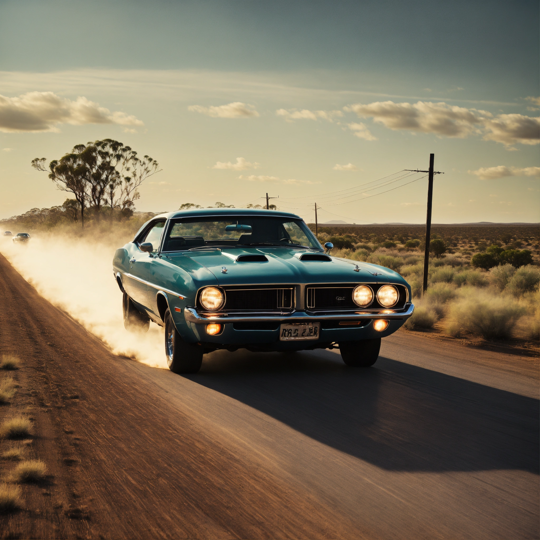 A photograph of a classic muscle car driving on a wide road in the outback, gregory crewdson style wide format