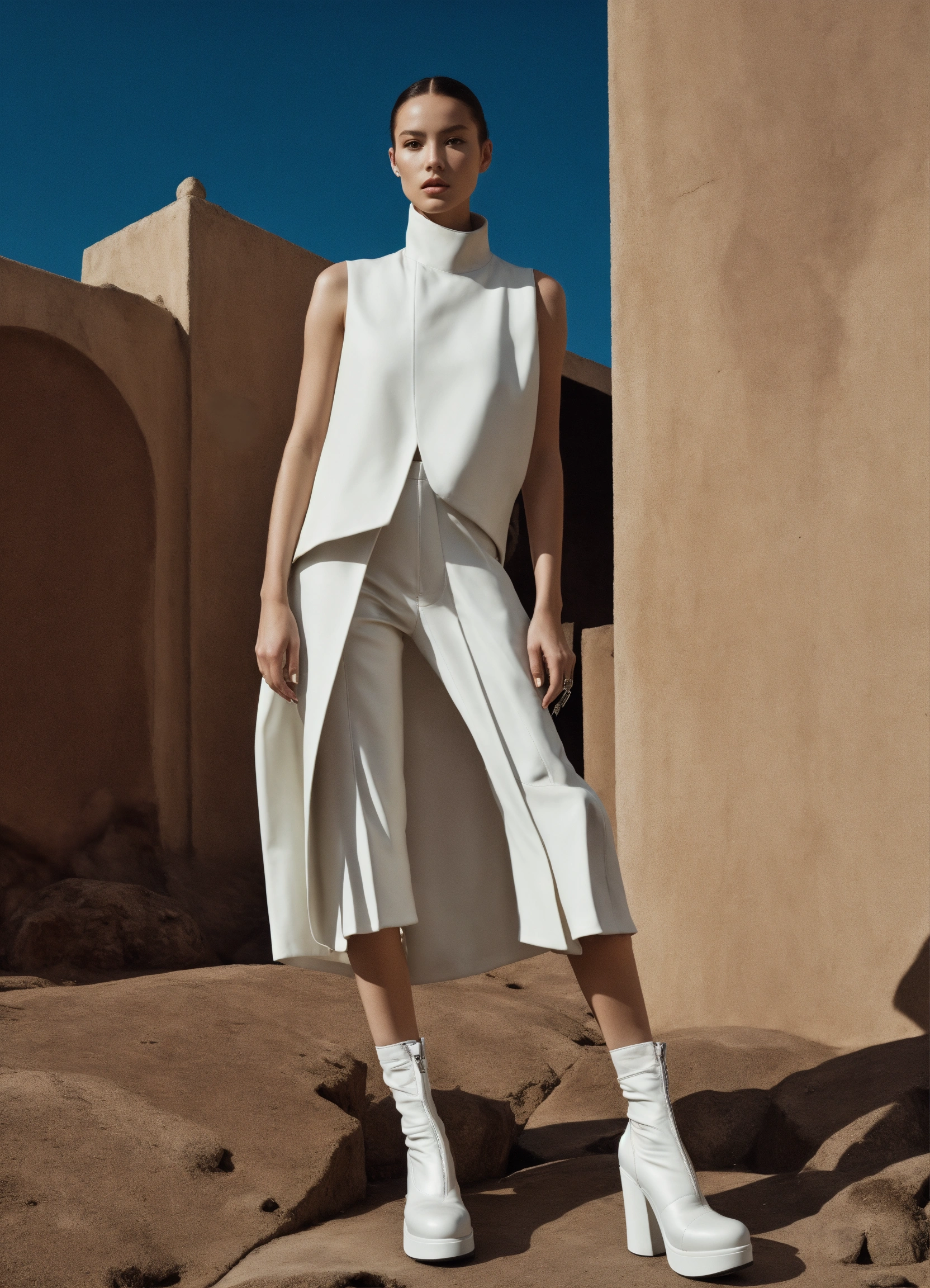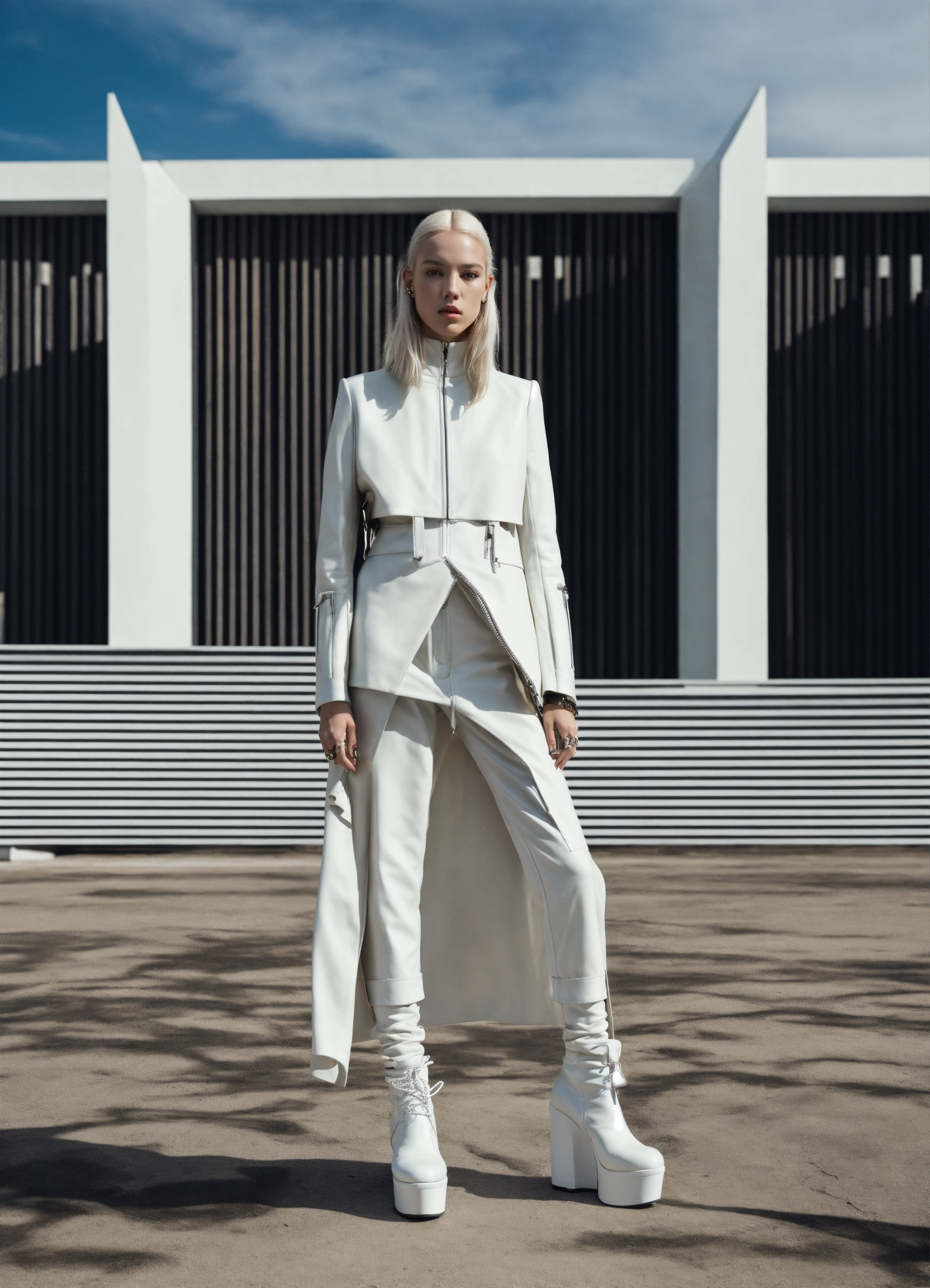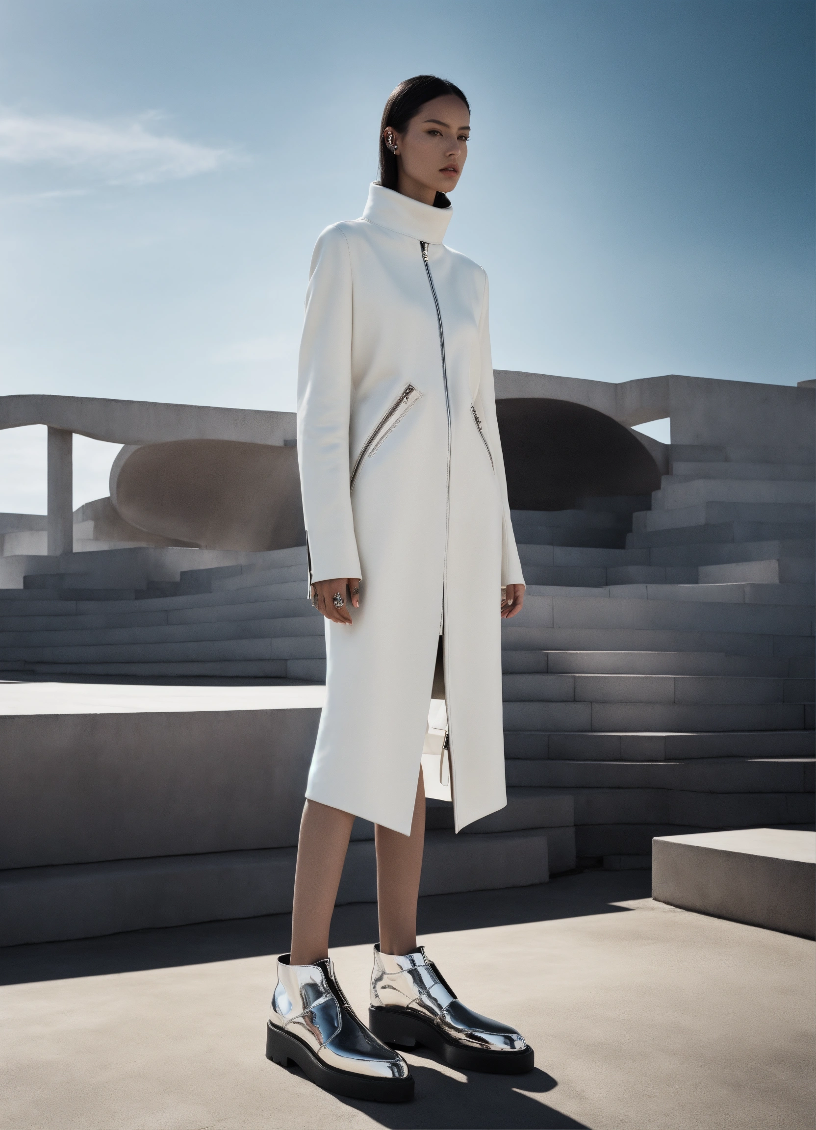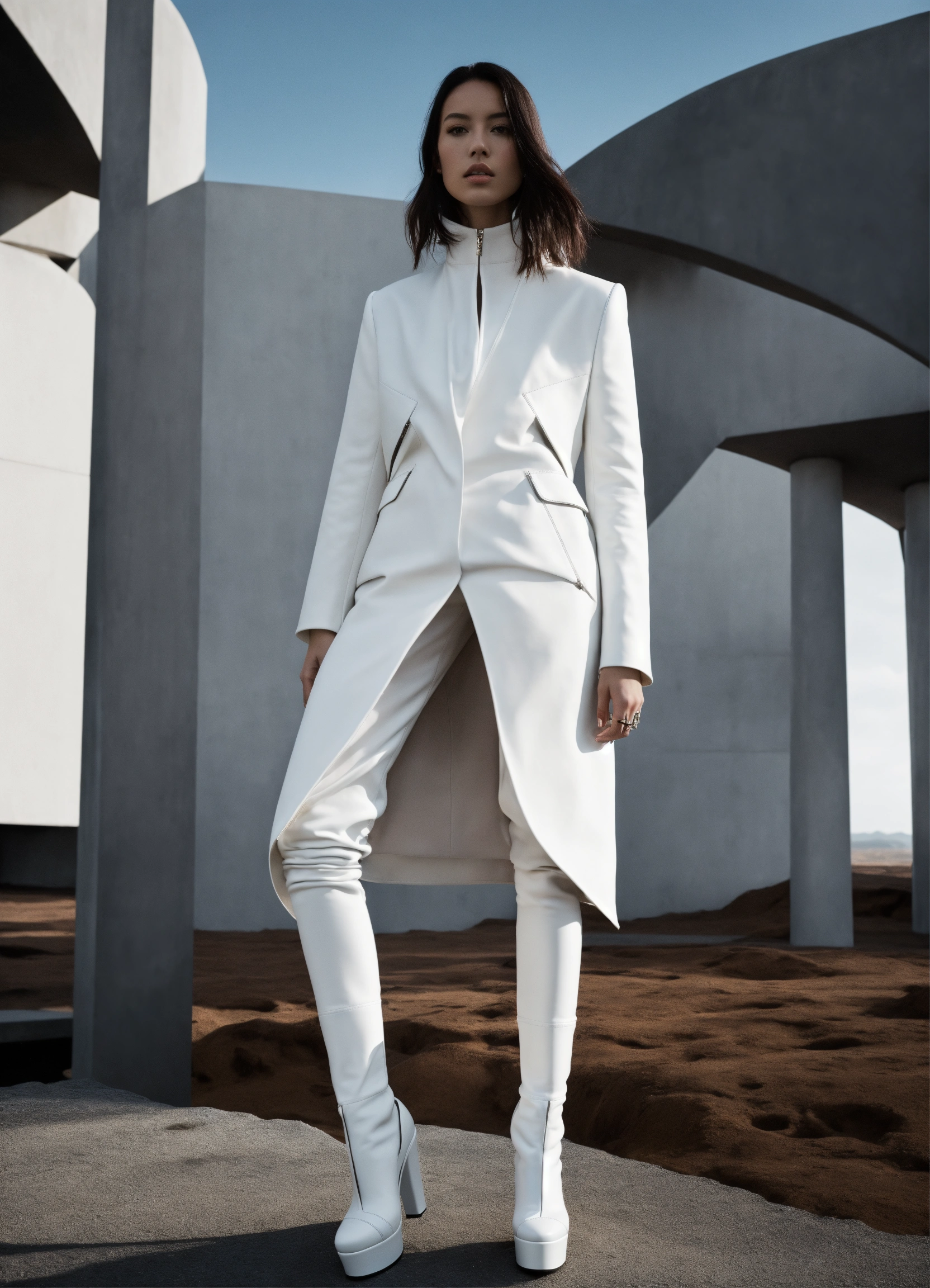 Ultra hd! editorial, rick owens, female model, white and chrome, structured outfit, platform shoes, iso 400, surrealistic, 8k, full frame, landscape, architecture