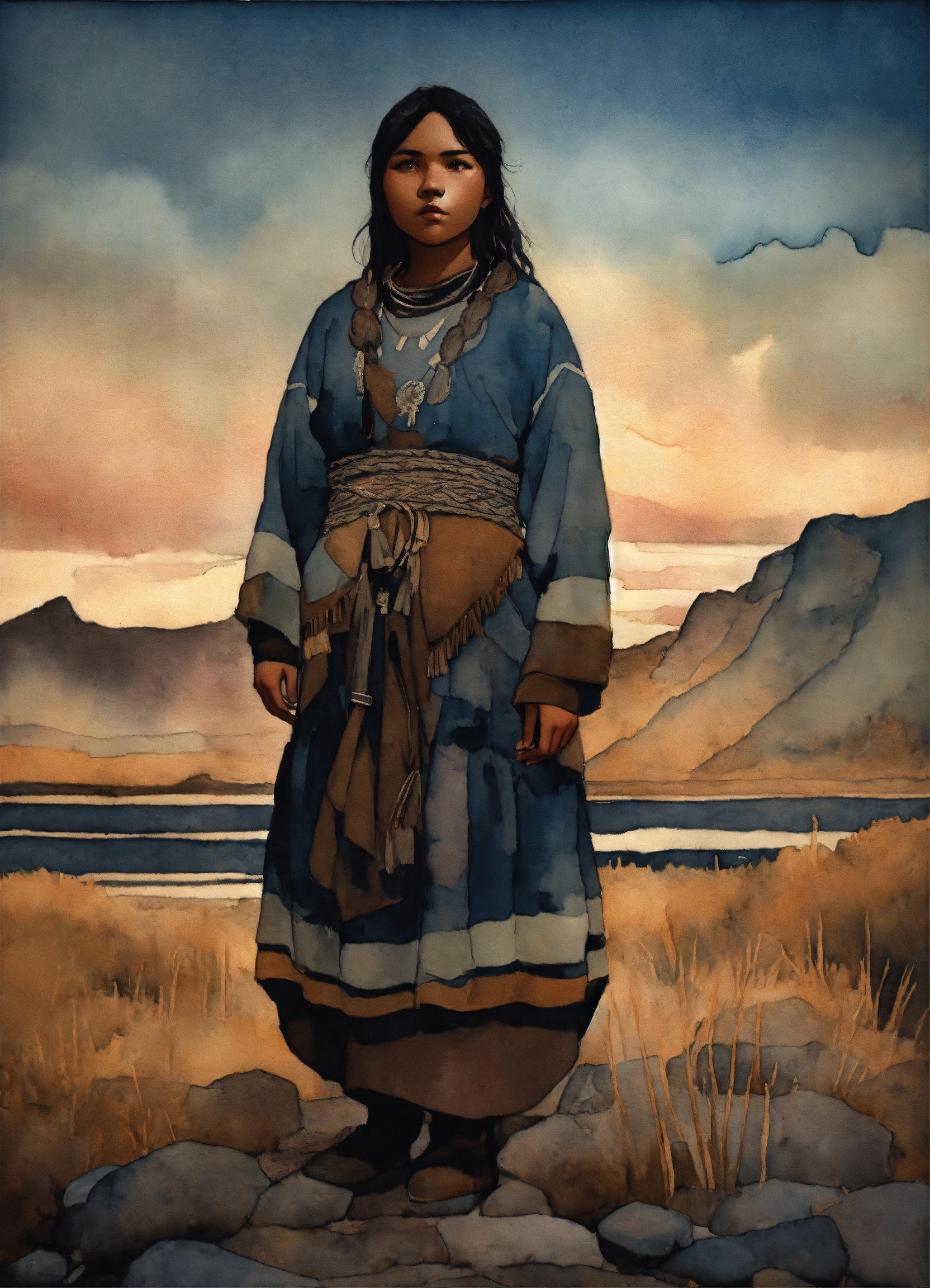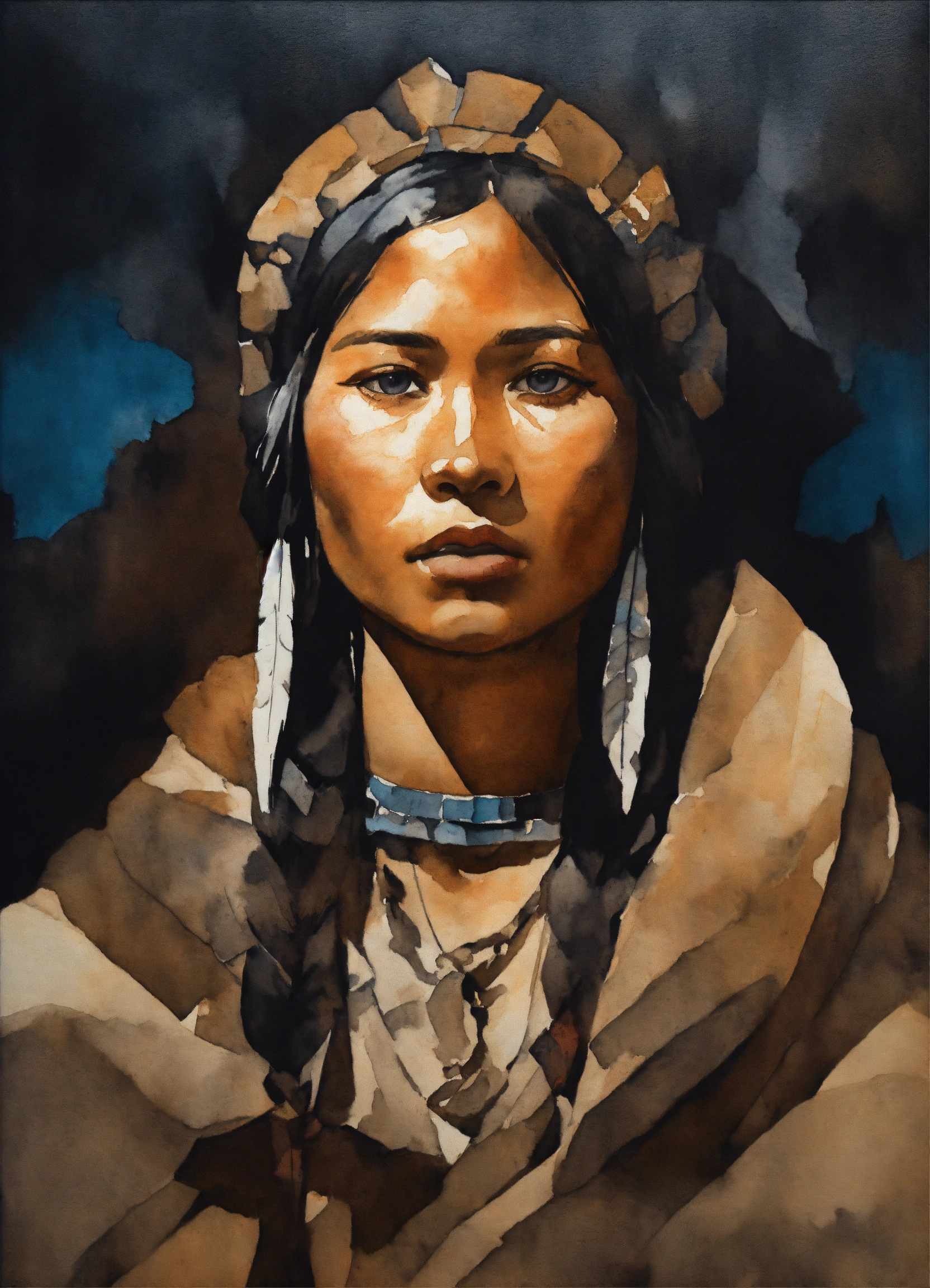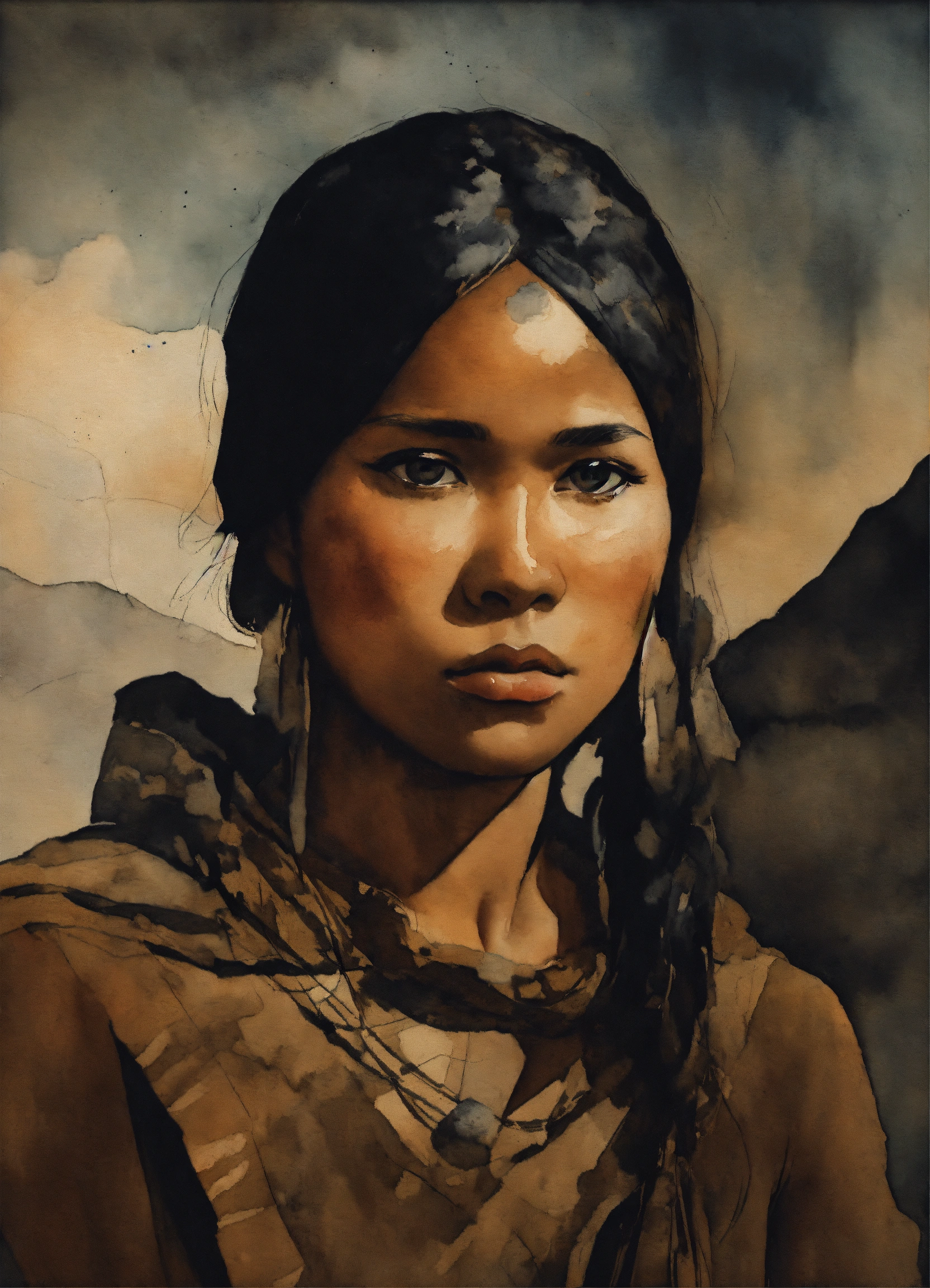 Painting by tom björklund of a young siberian aboriginal woman wearing arctic paleolithic clothing, outlined silhouettes, dark hues, dark and depressing aesthetic, cel shading, watercolor