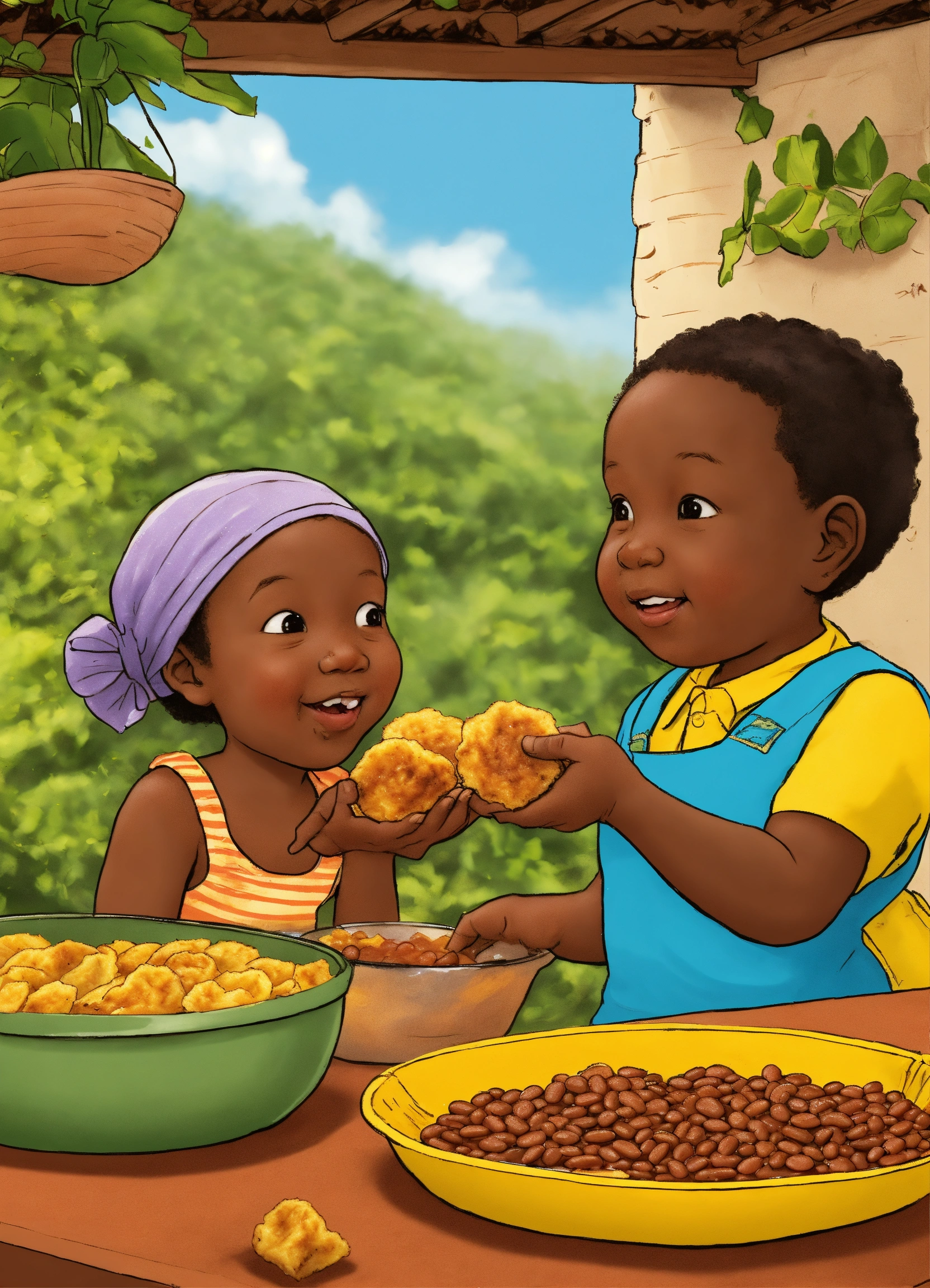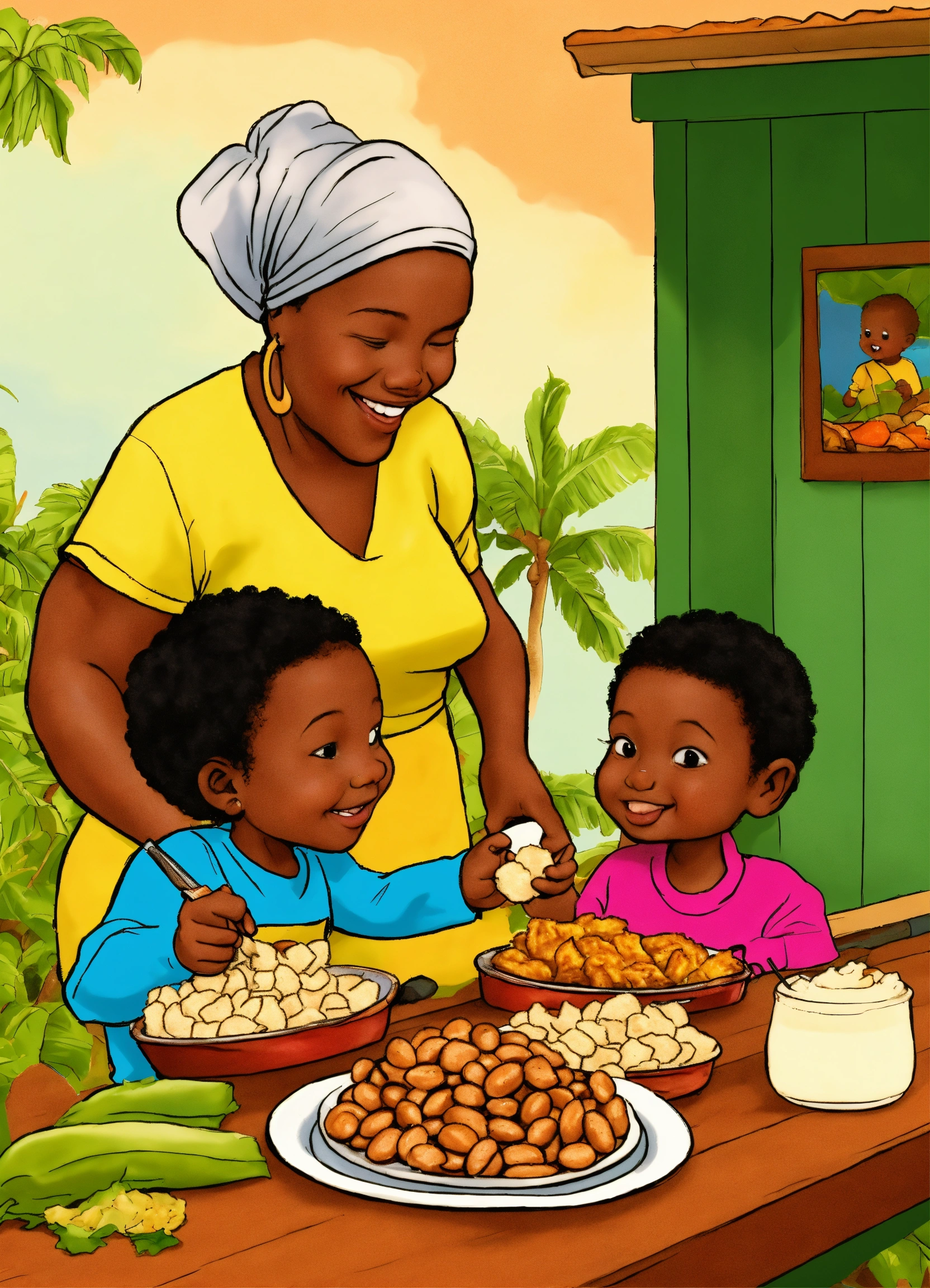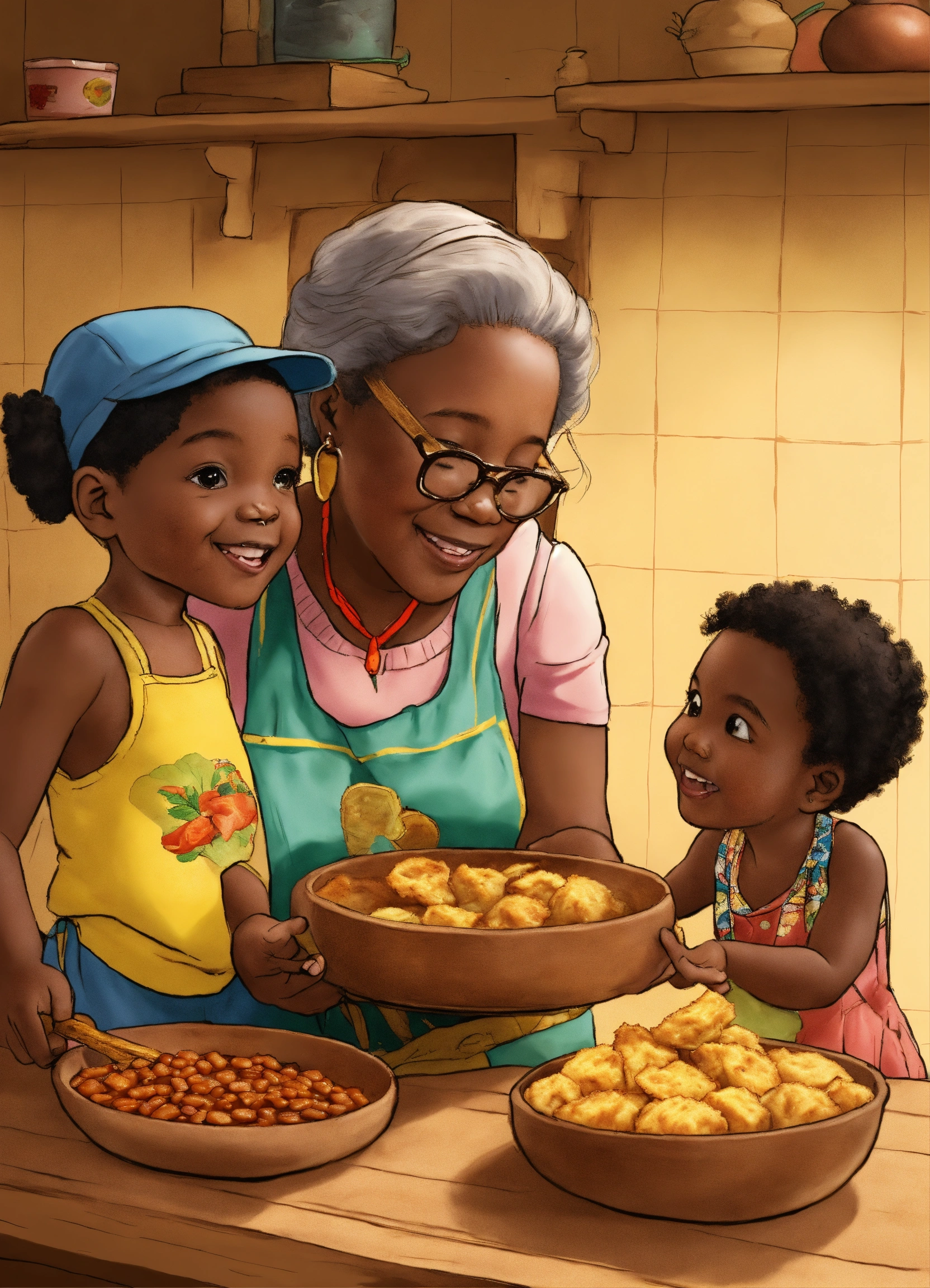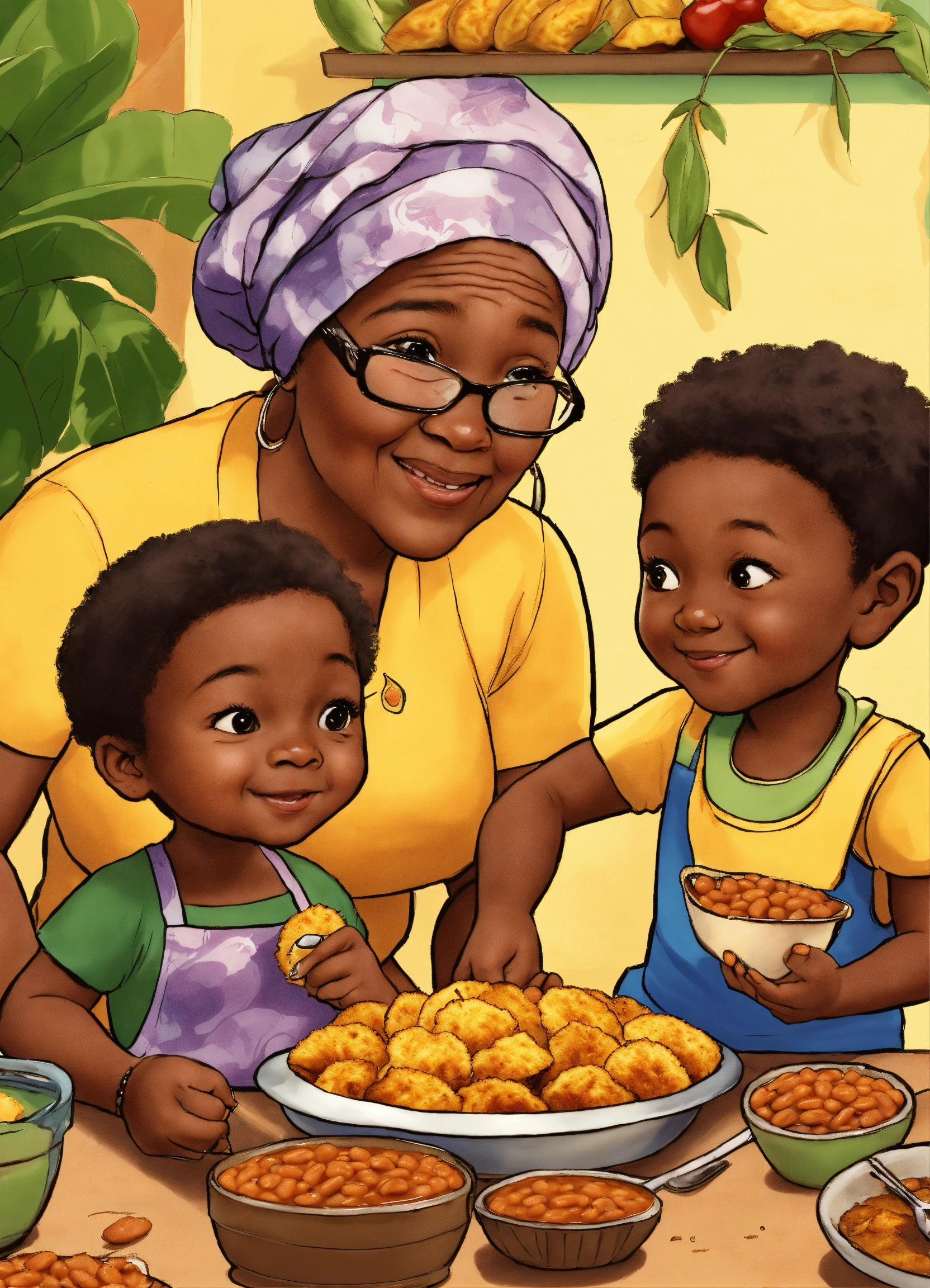 A cartoon of three caribbean 3-year-old children. this a heartwarming illustration of grandma sharing fried dumplings, fried plantains, and baked beans, showing the lesson learned.