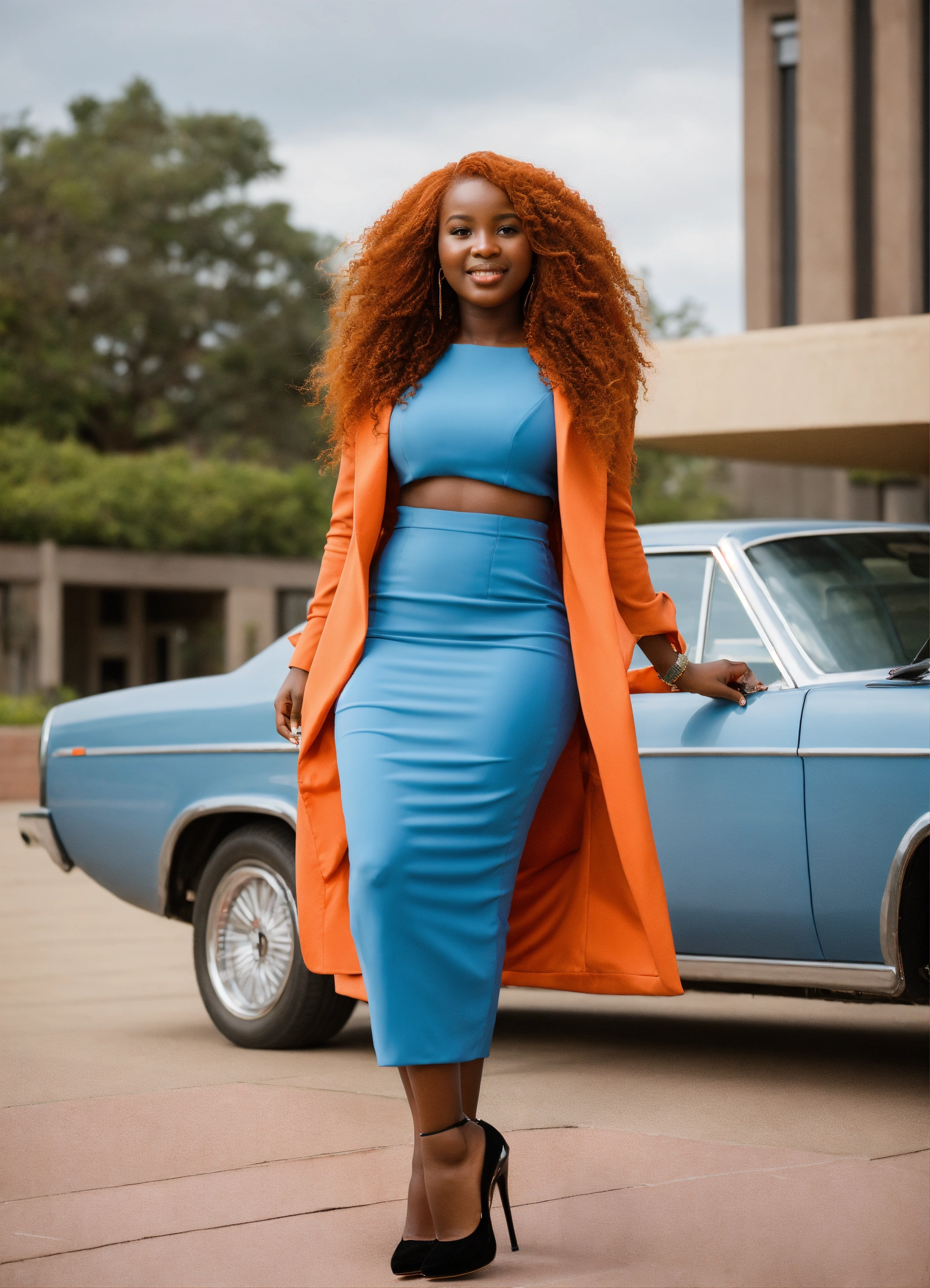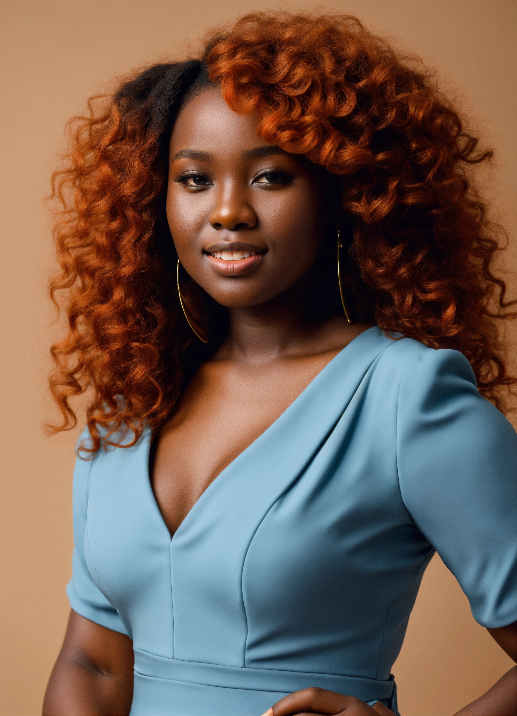 A volumptious, curvacious african graduate student with long reddish-orange curly hair. dressed in a tight light blue formal dress, black high-heels.