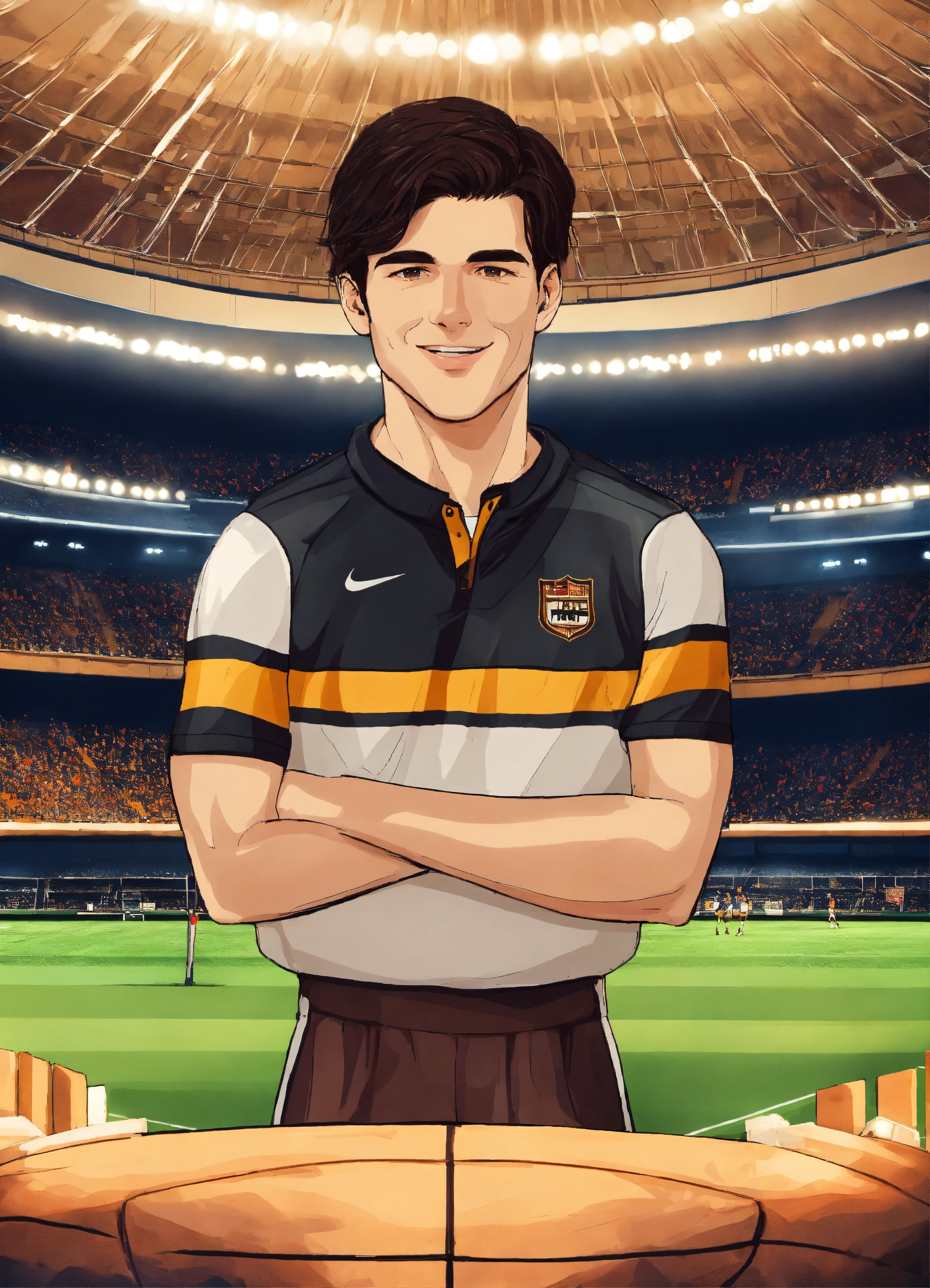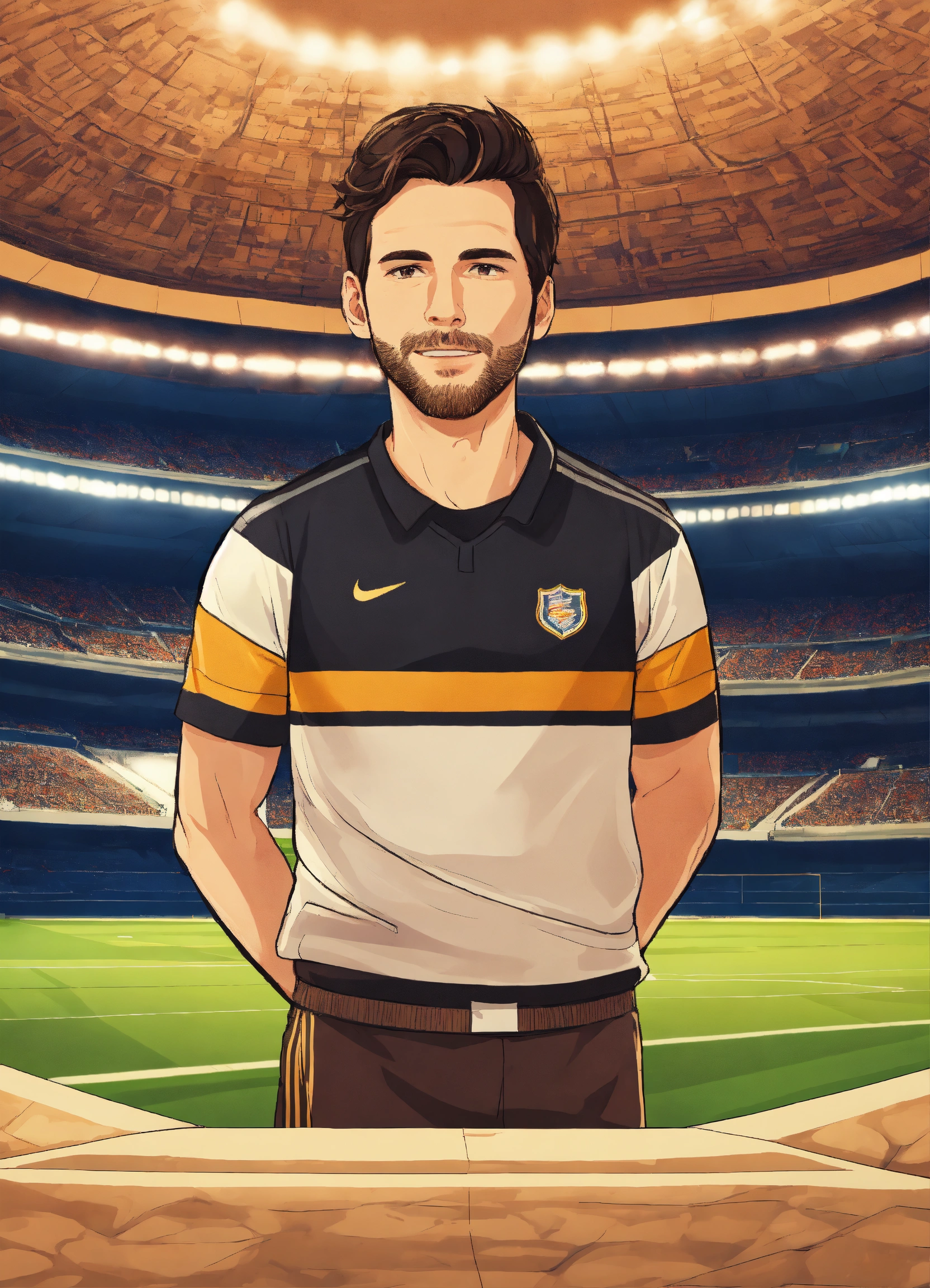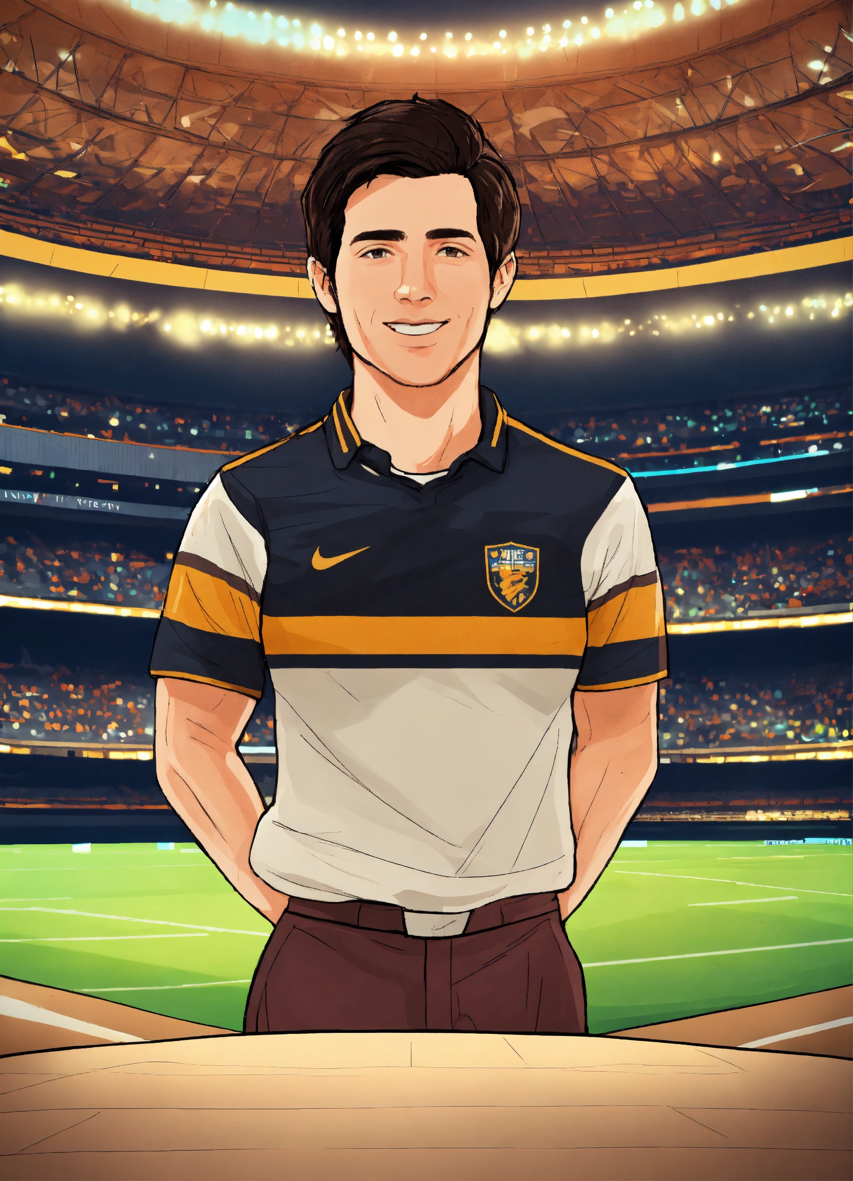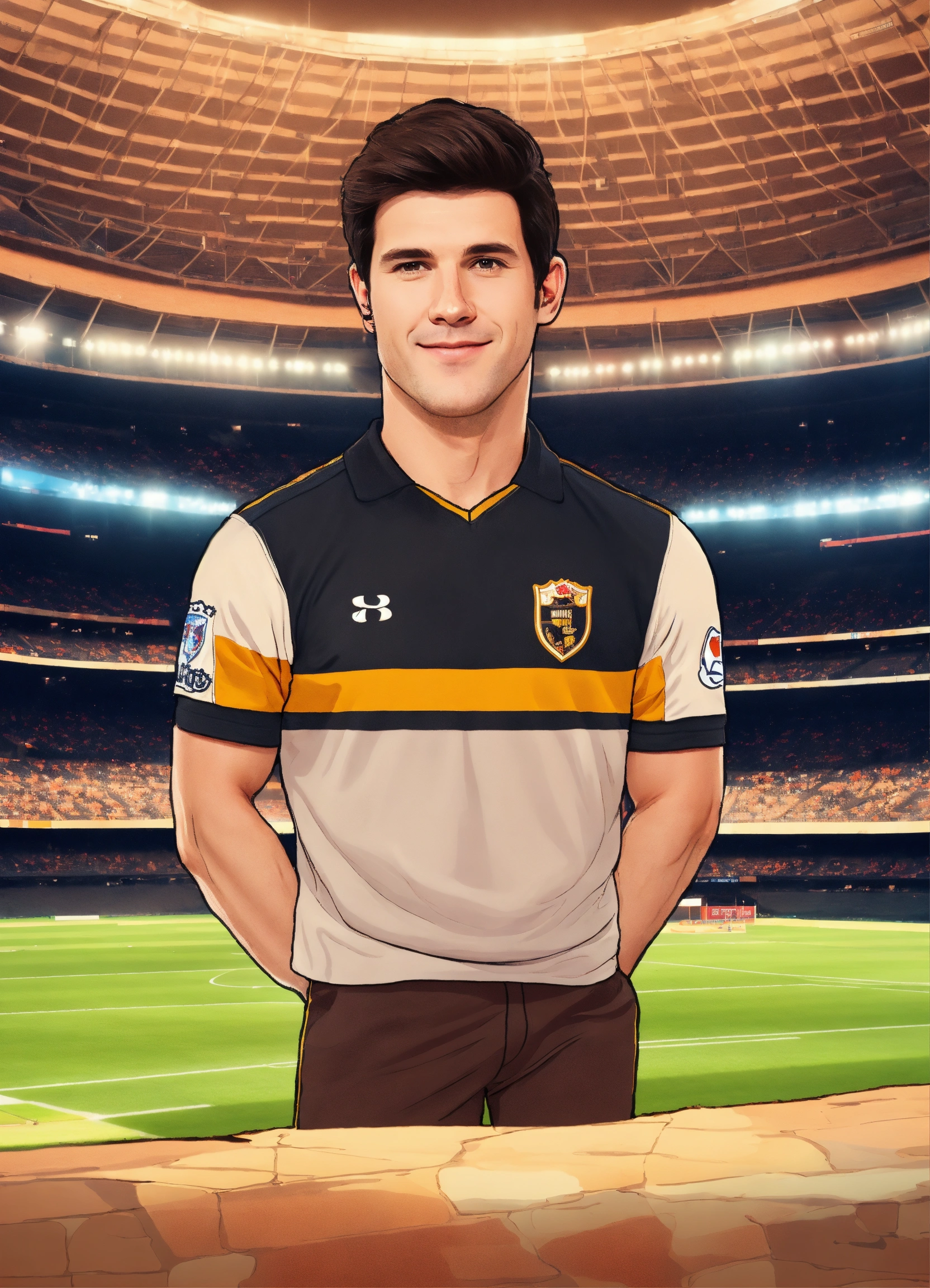 White man with brown/black hair and the background has to be a stadium, it will bes used as a profil picture for a professionel sportsbetter, use a cartoon filter