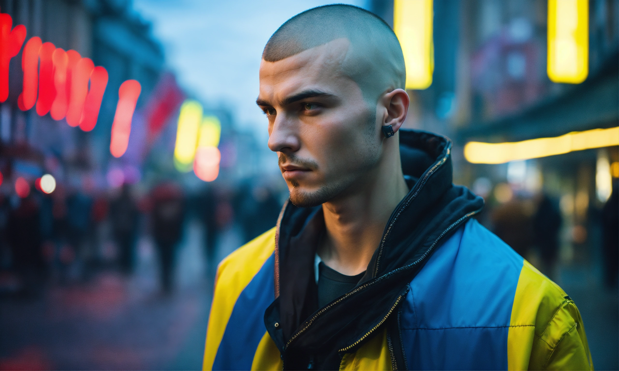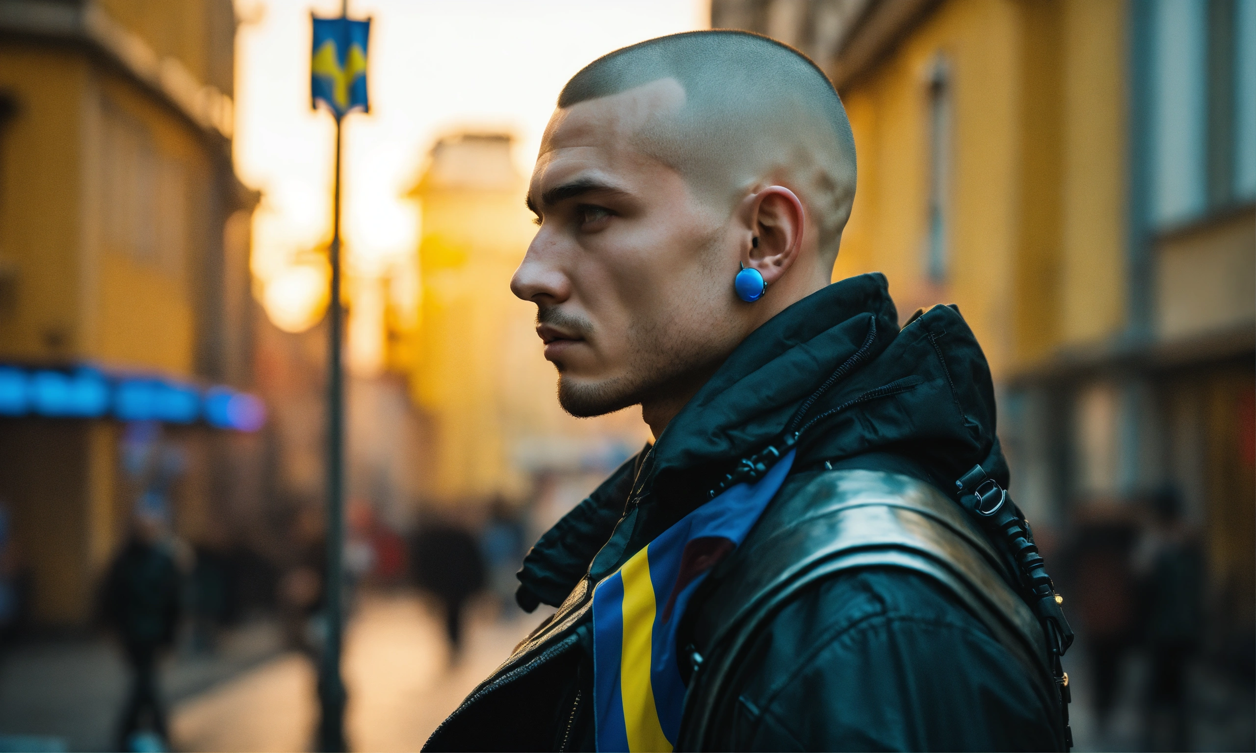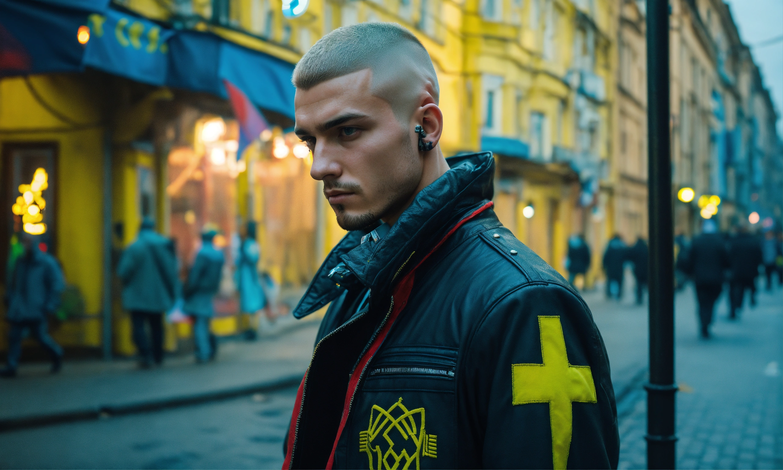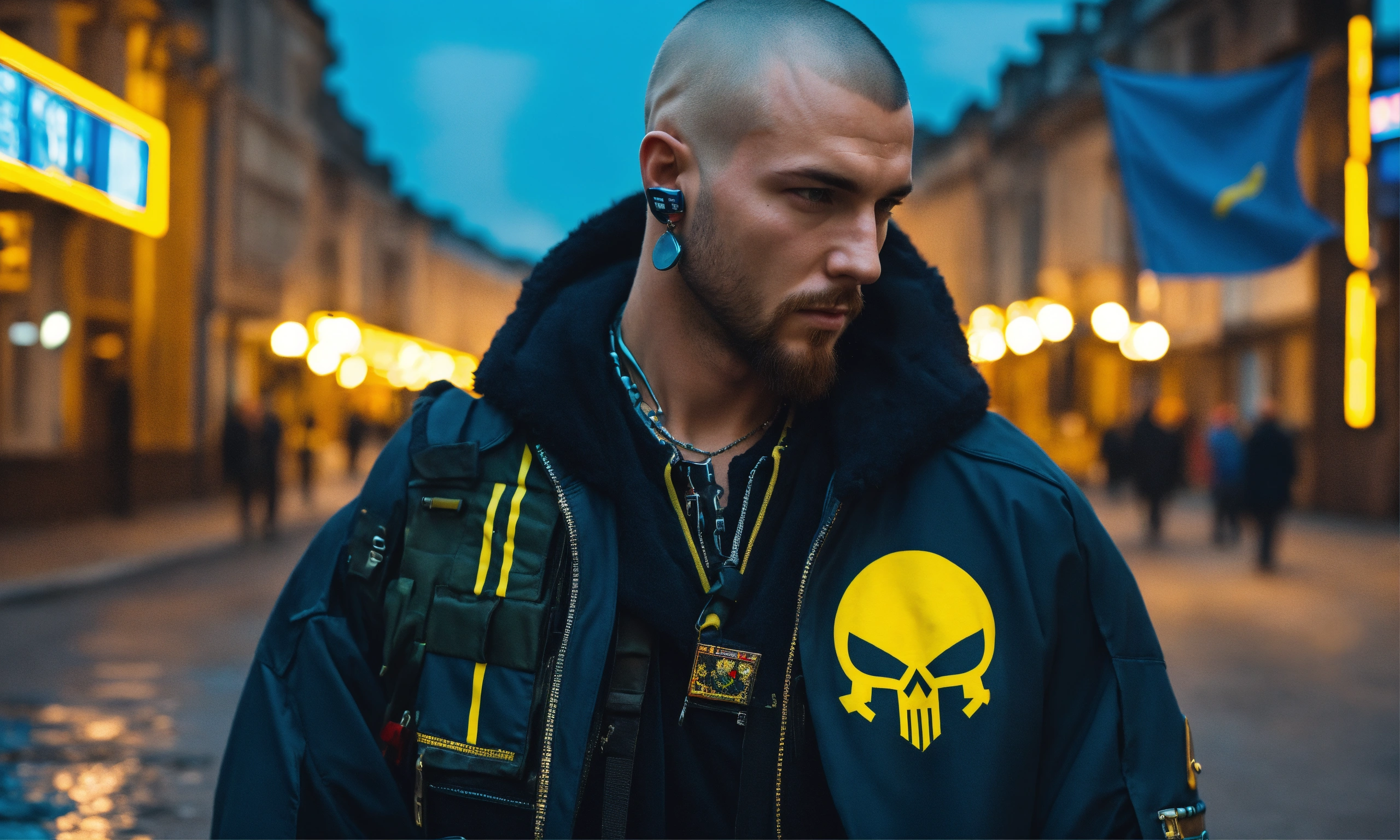 Cyberpunk style, handsome guy in cyber punk city, ukraine, in street, cyberpunk city, shaved head, with flag of ukraine.