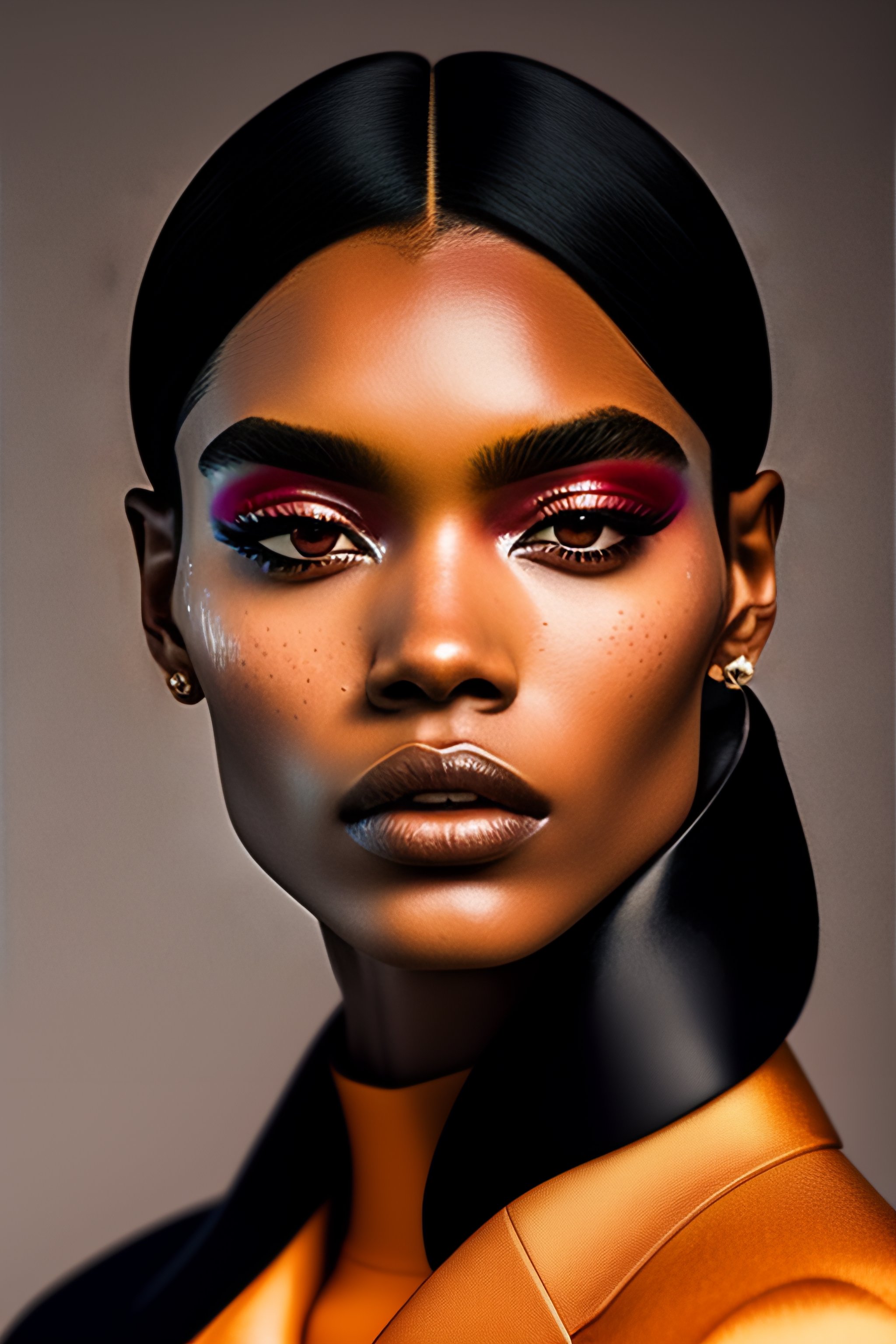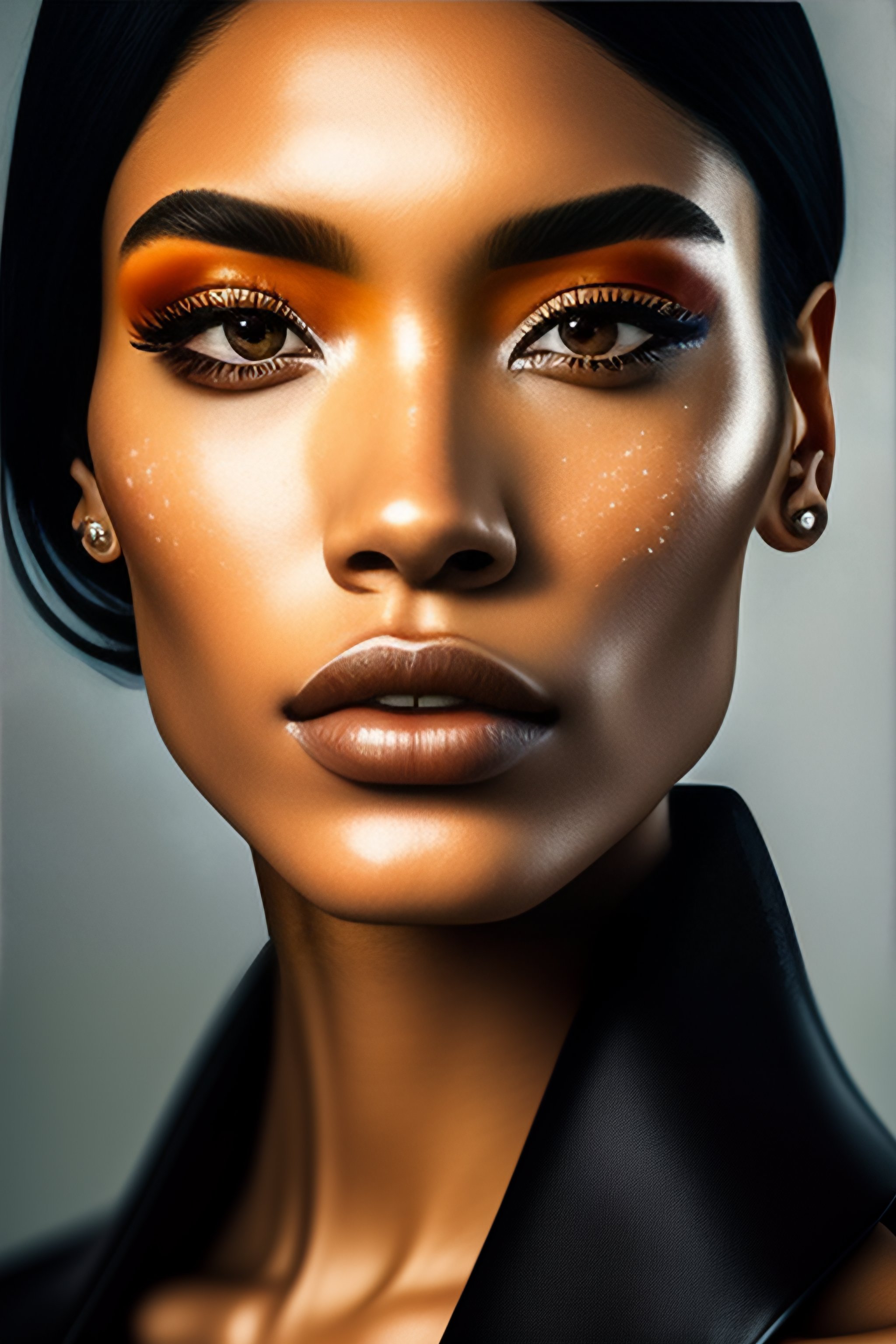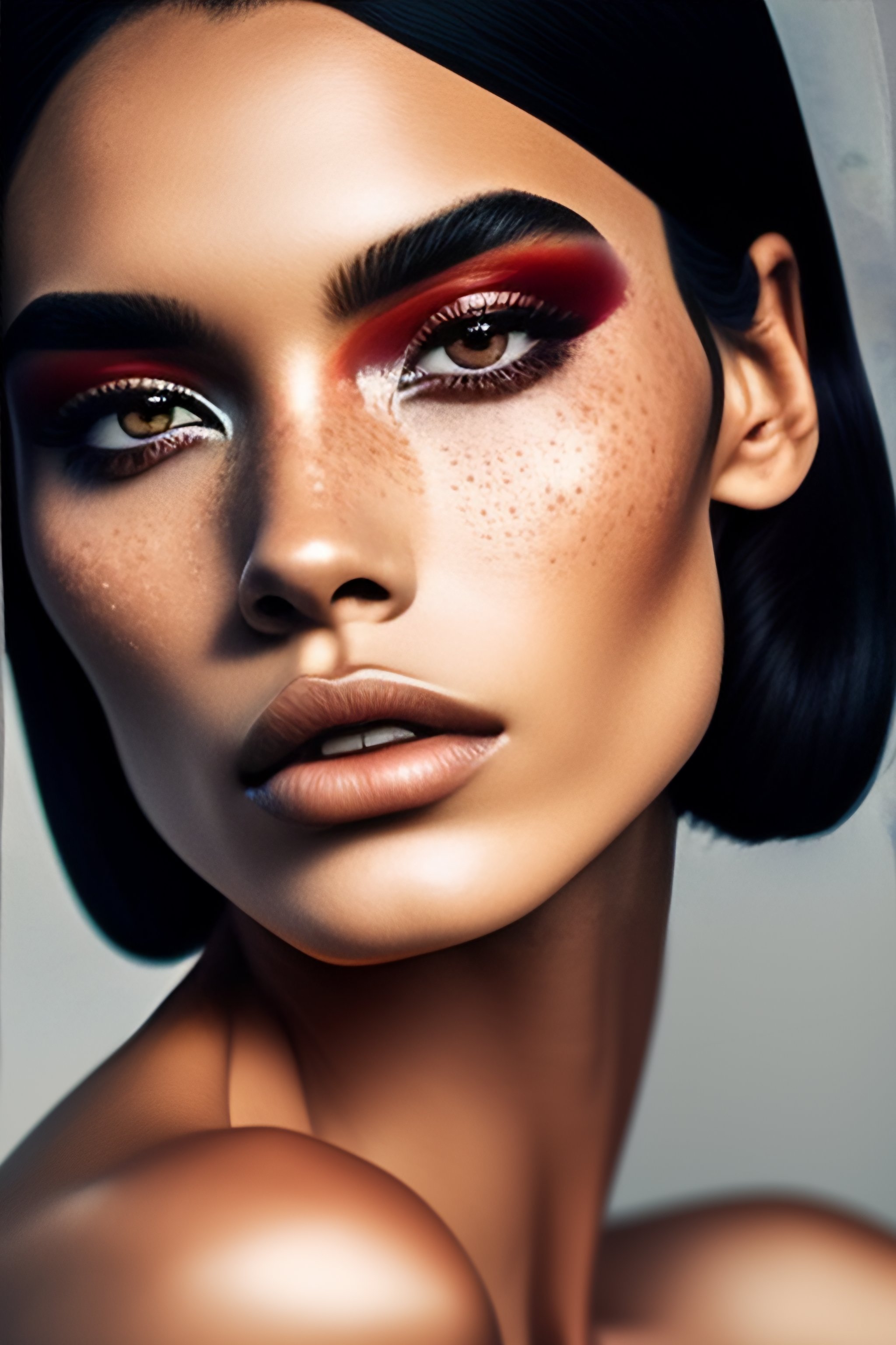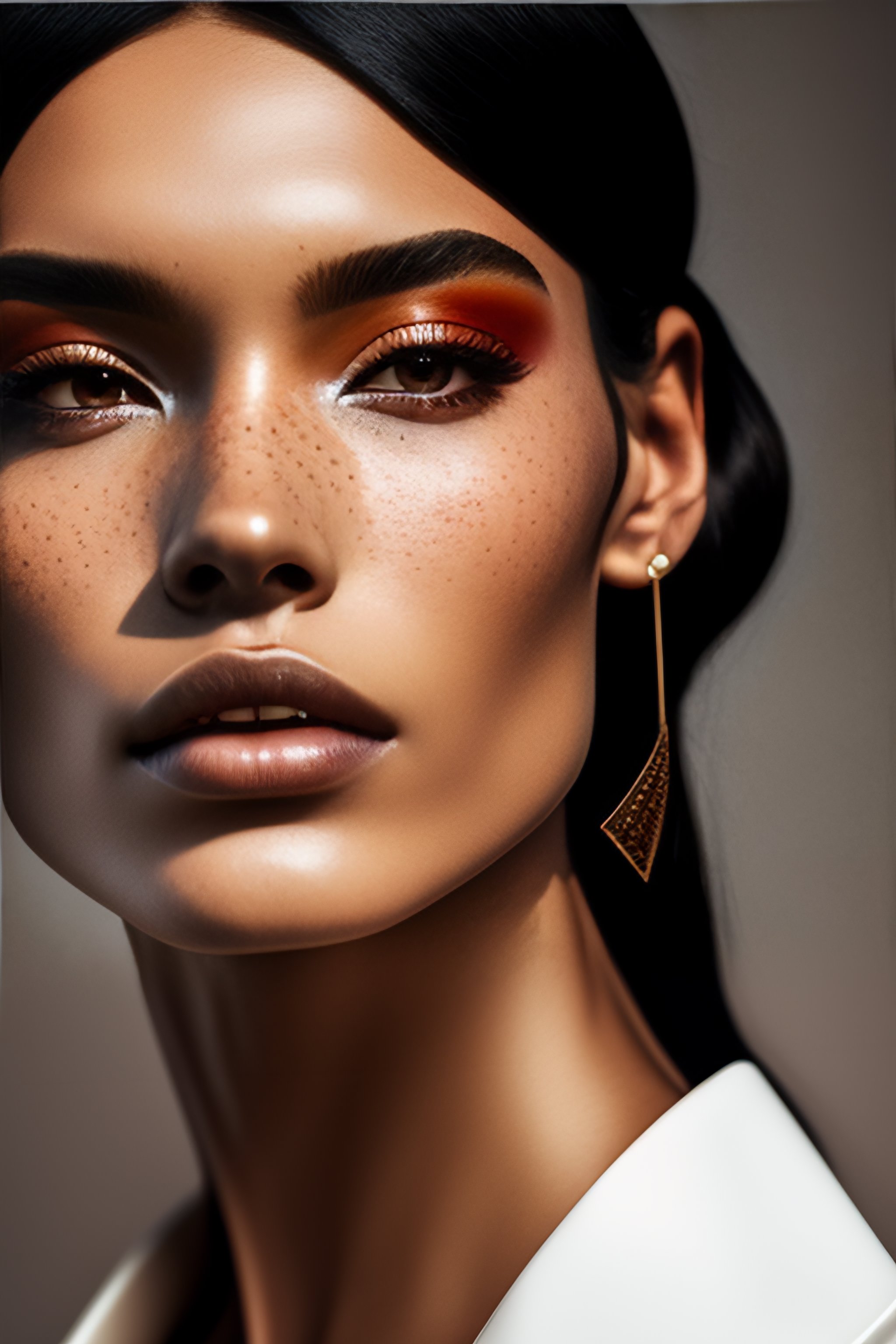 A photo close-up of a beautiful black haired woman with freckles, fashion editorial, studio photography, magazine photography, pointed nose, blurry background