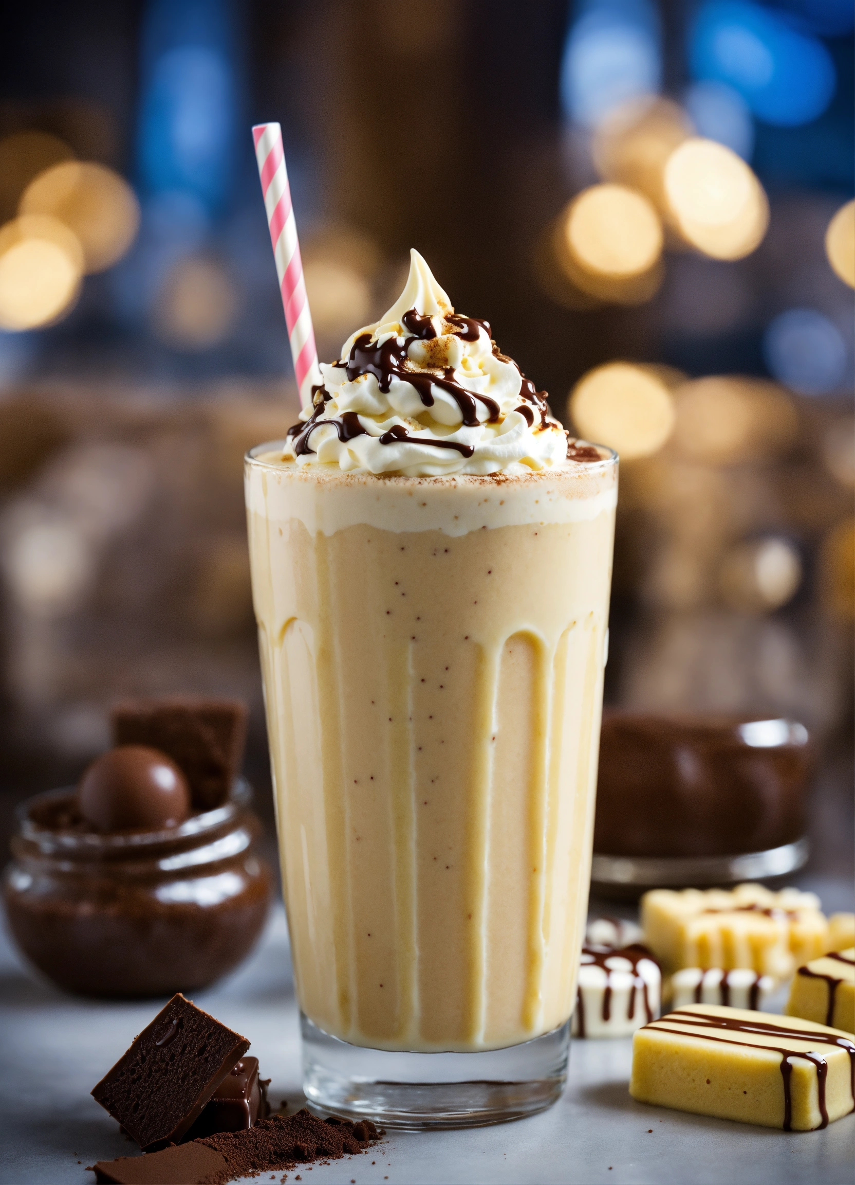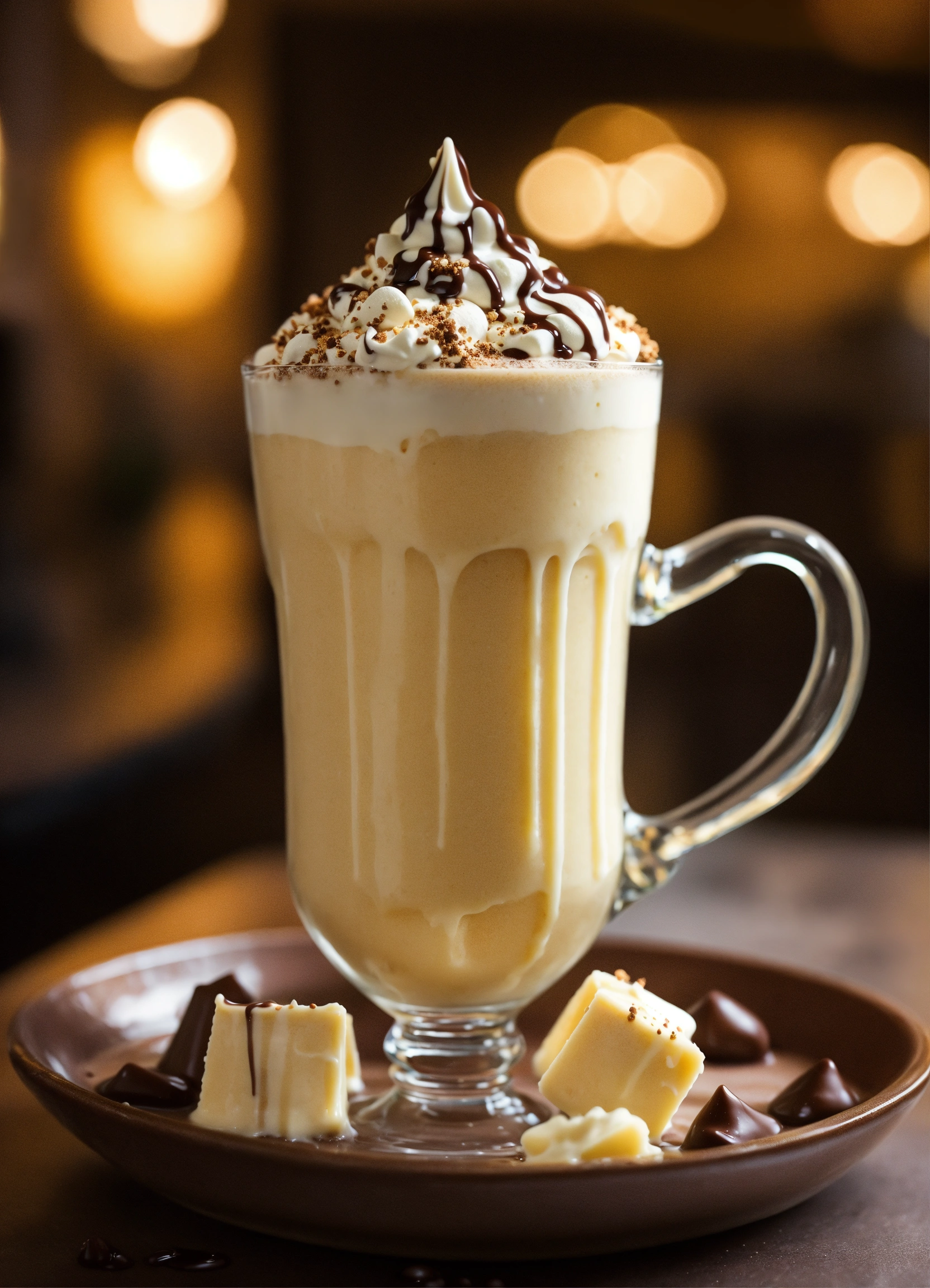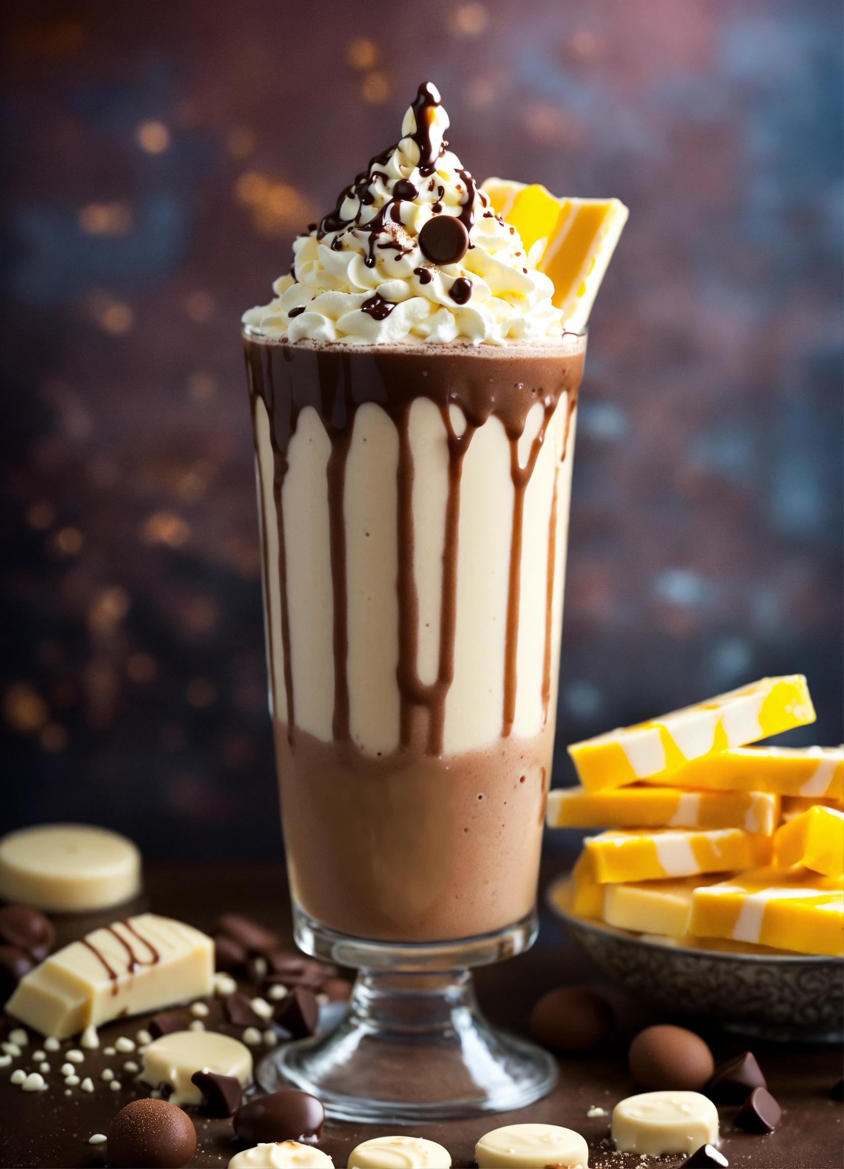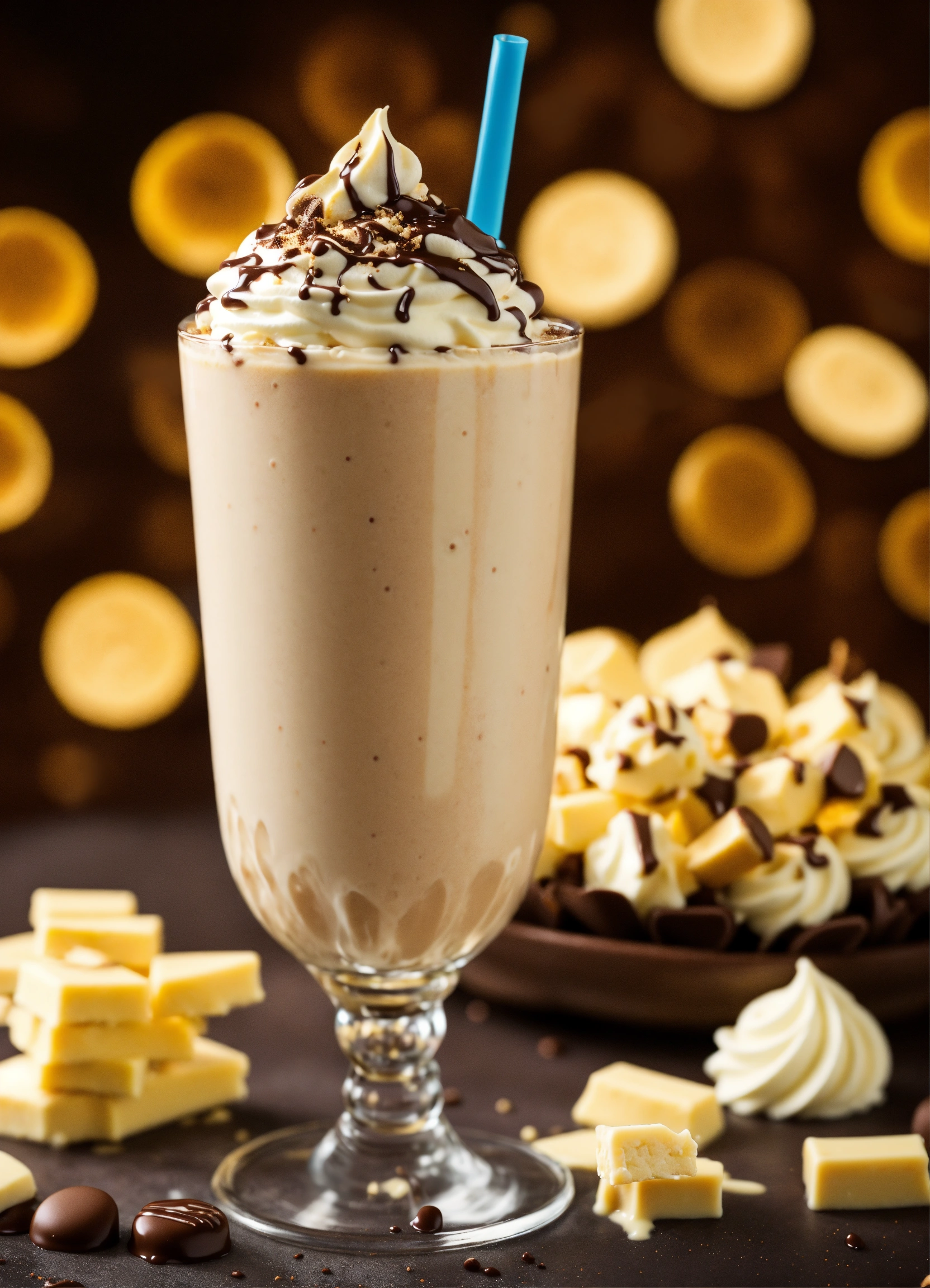 White chocolate smoothie, in a tall glass with whipped cream on top, with chocolate sauce circled on top, plenty of white chocolate bars around, amazing photo, very realistic, elegant and tasty, photography, steaming, f2.8, 50mm lens, intricately detailed, 8k, cinematic production, highly detailed, highly realistic, white chocolate candies all around, candy store in the background