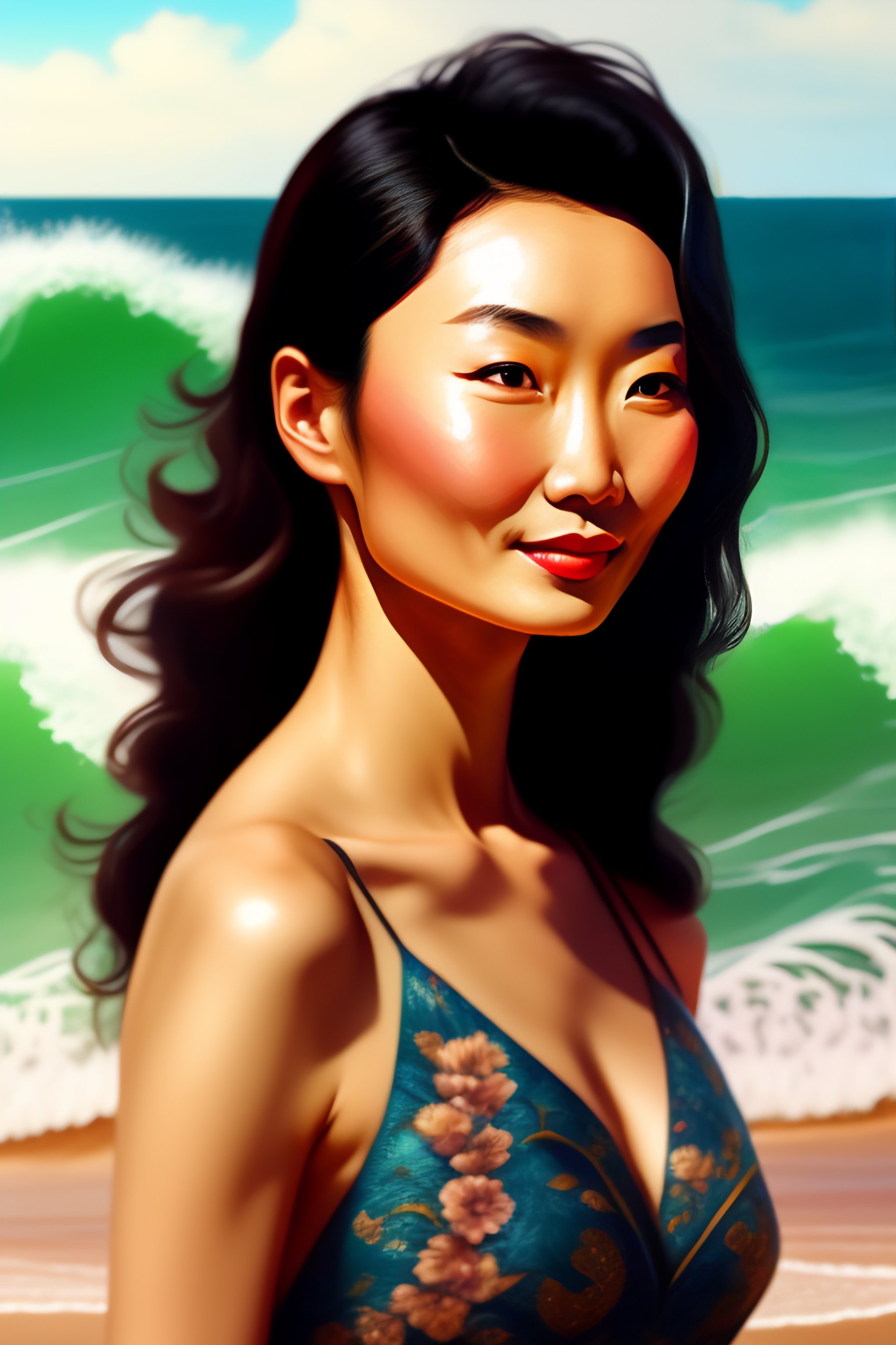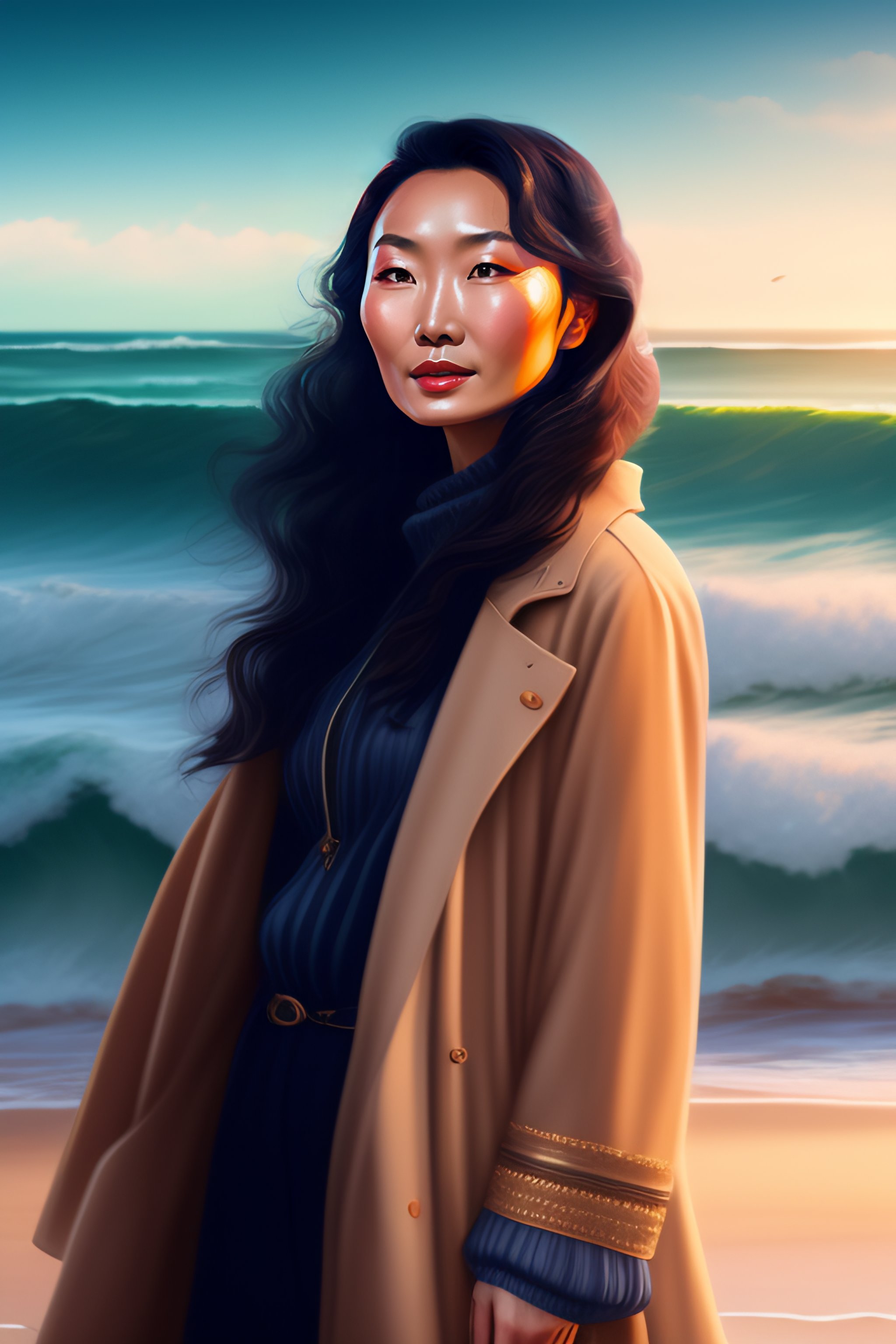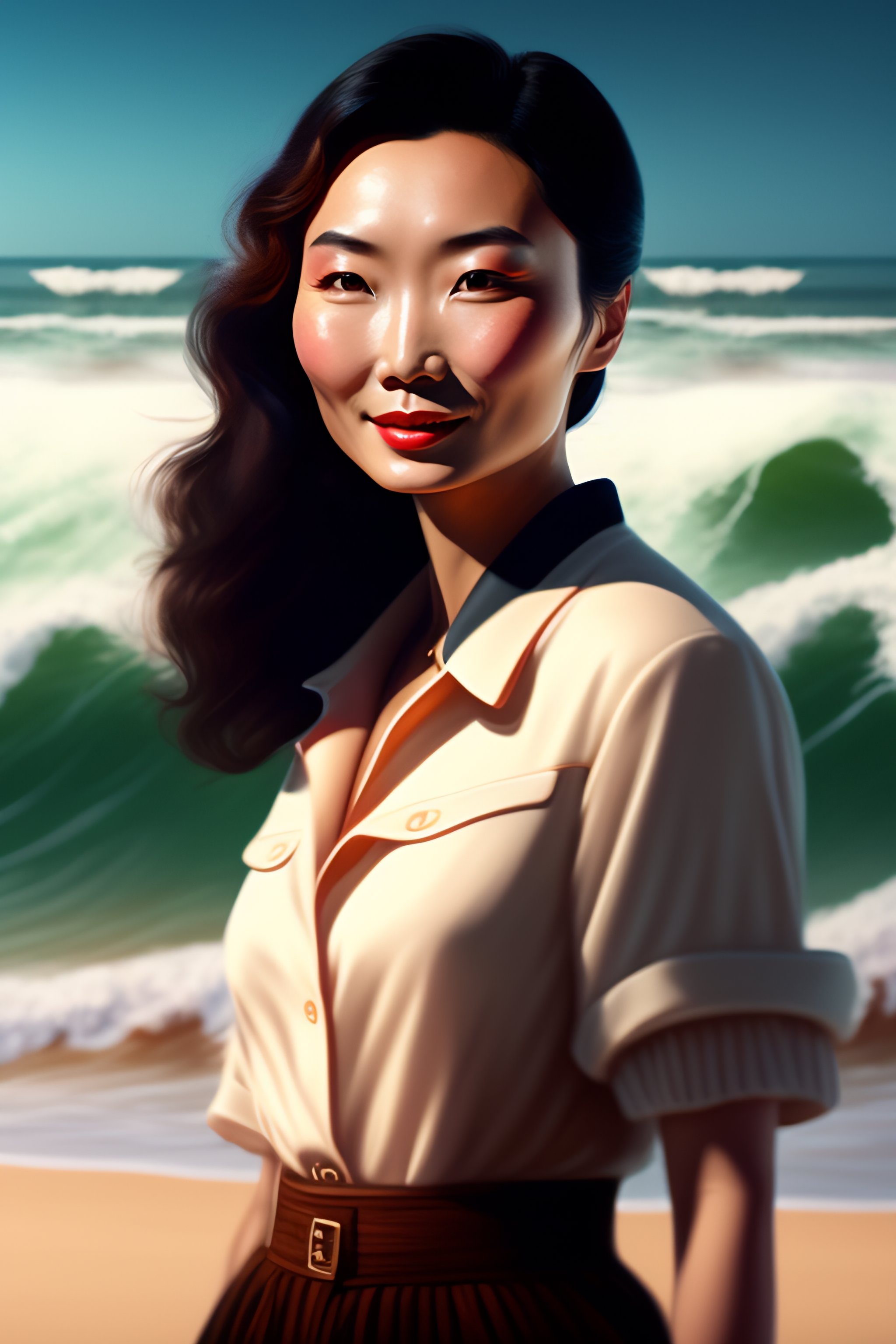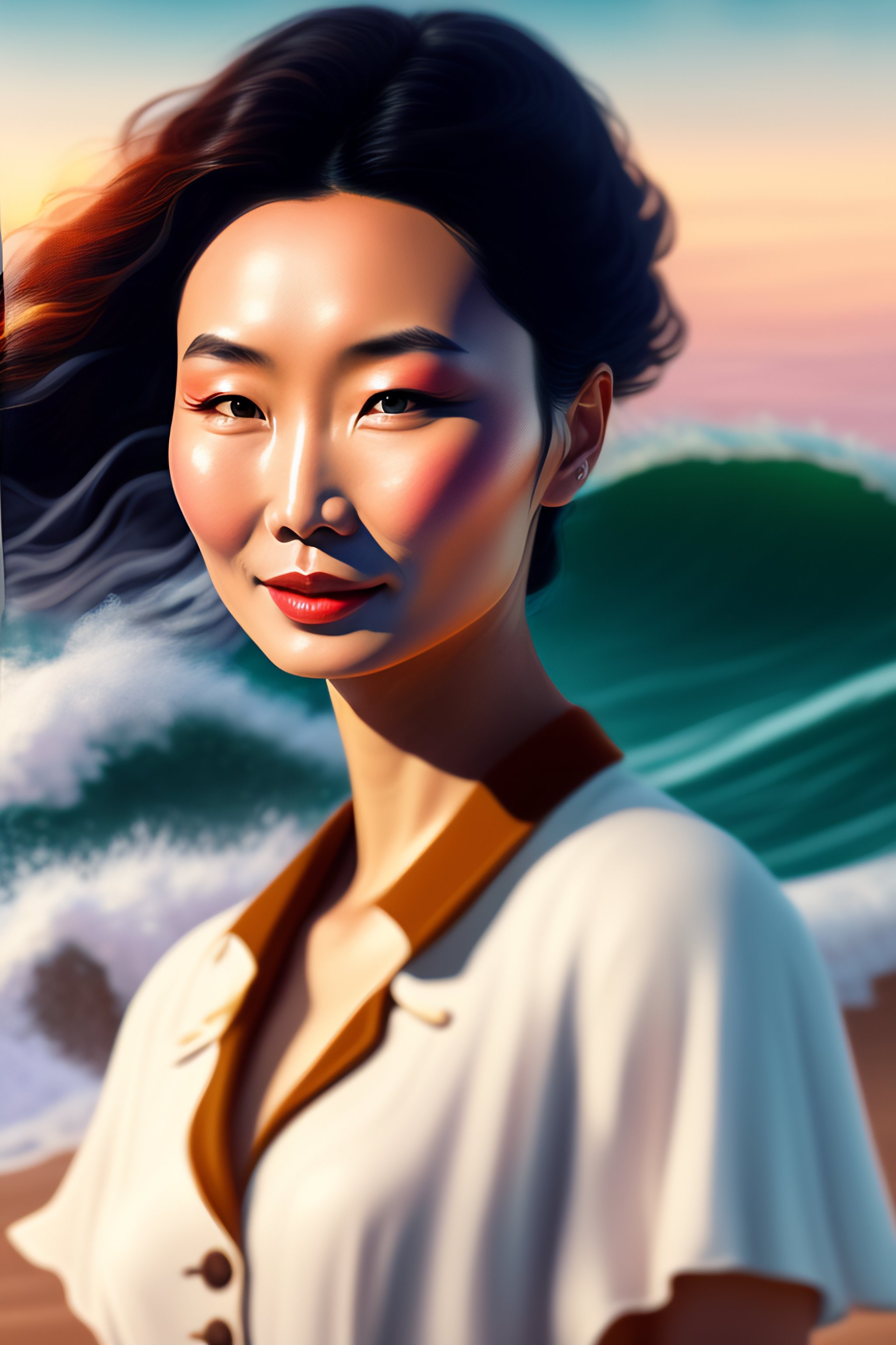 Digital illustration of young maggie cheung, old fashioned, on the beach, high waves in the background, 4k, lots of details, cluttered with stuff