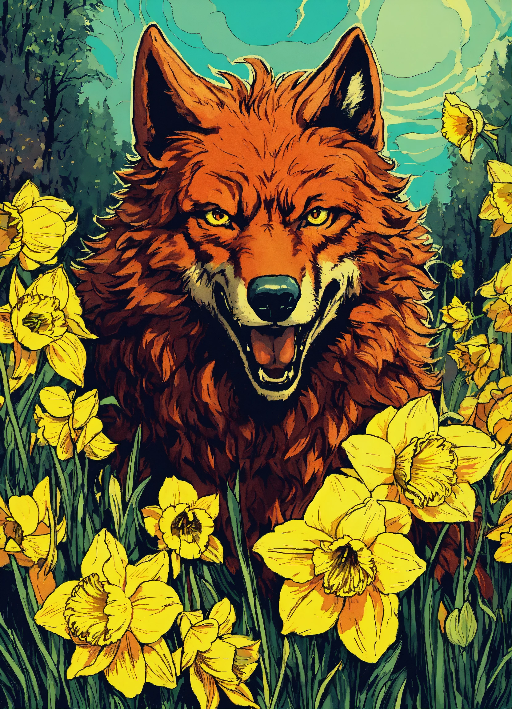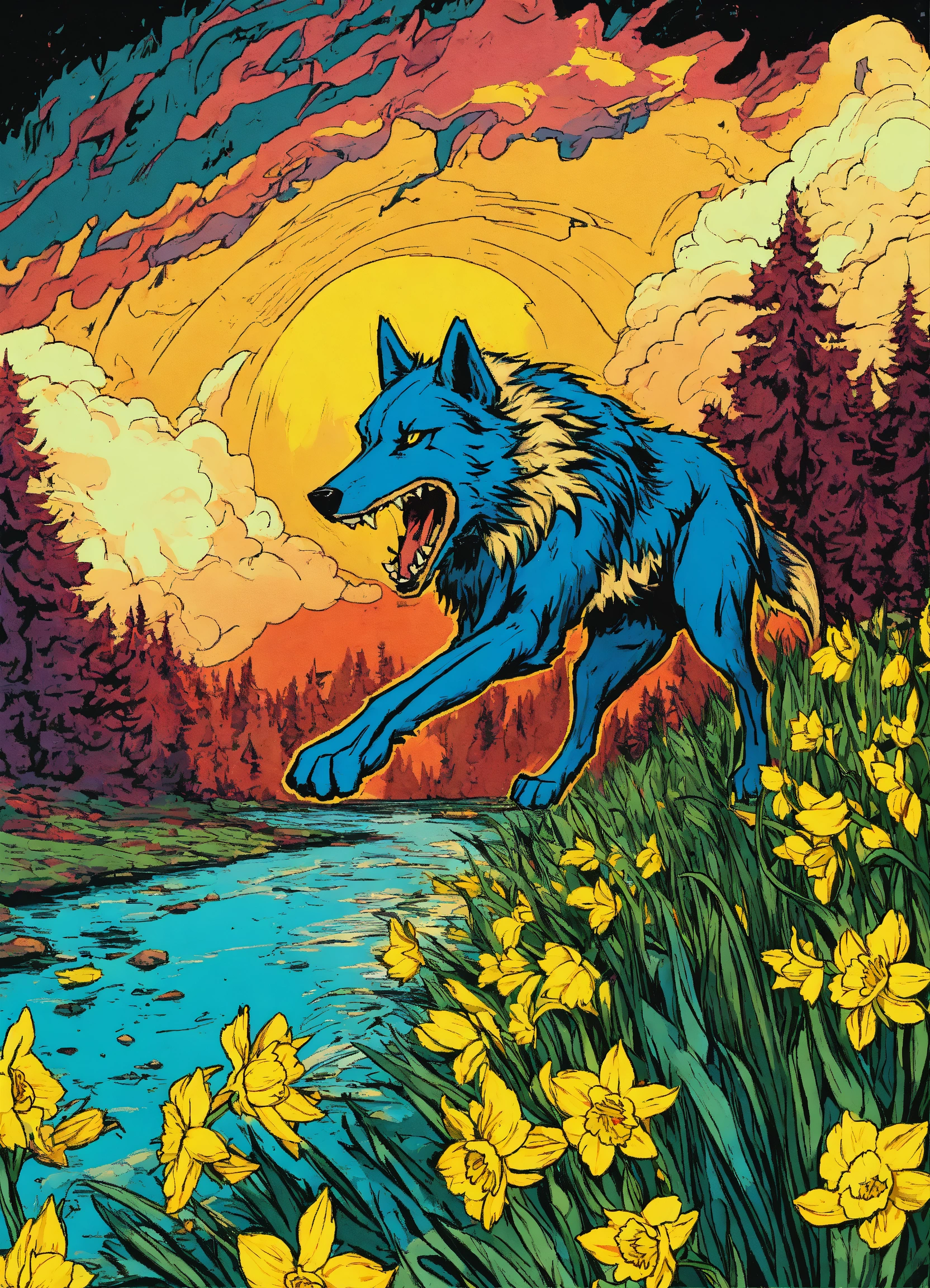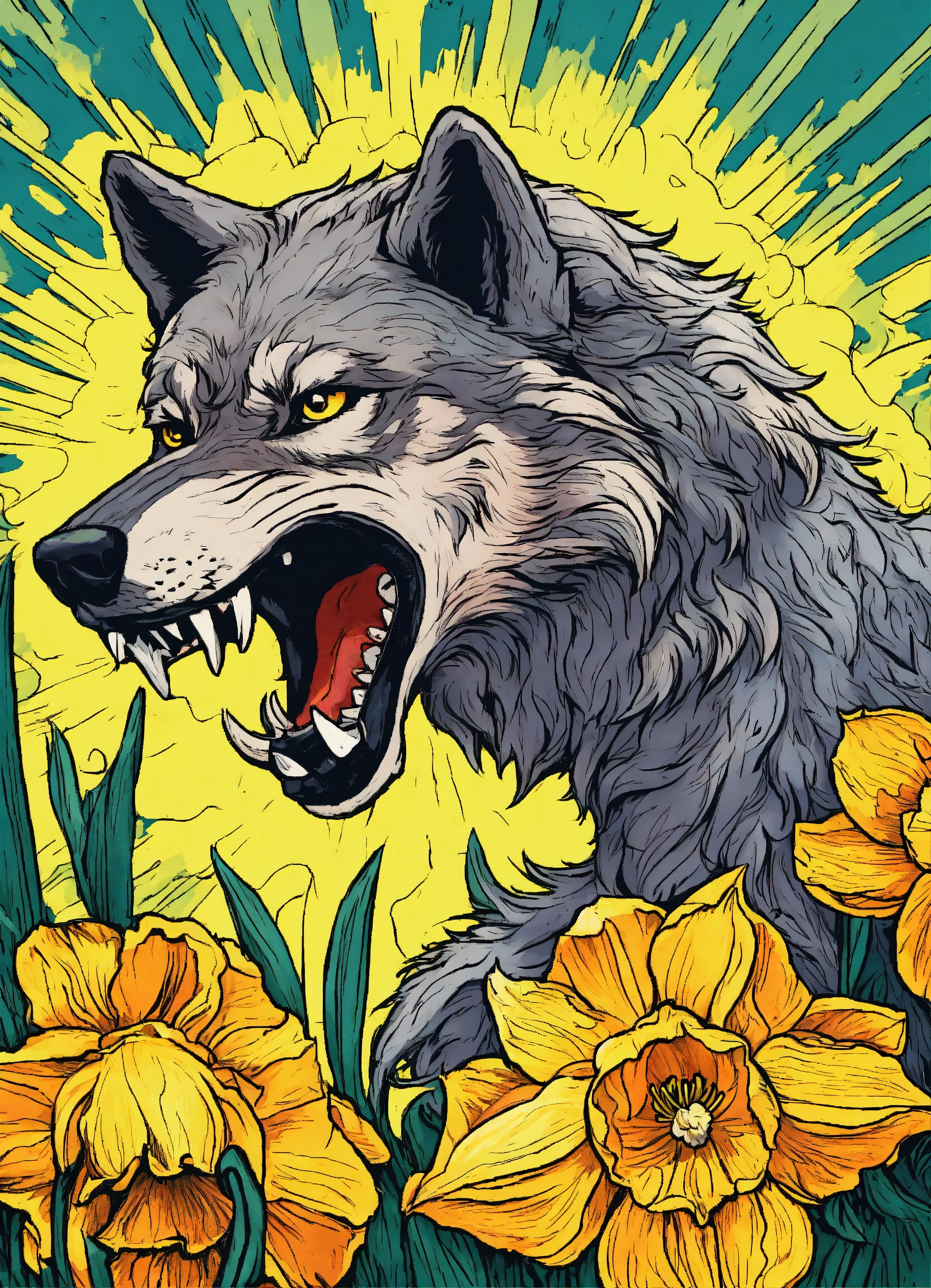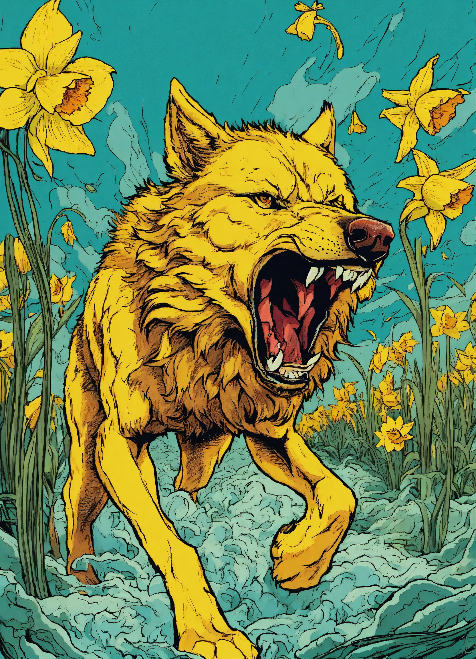 An enraged wolf dive into the daffodil. comics