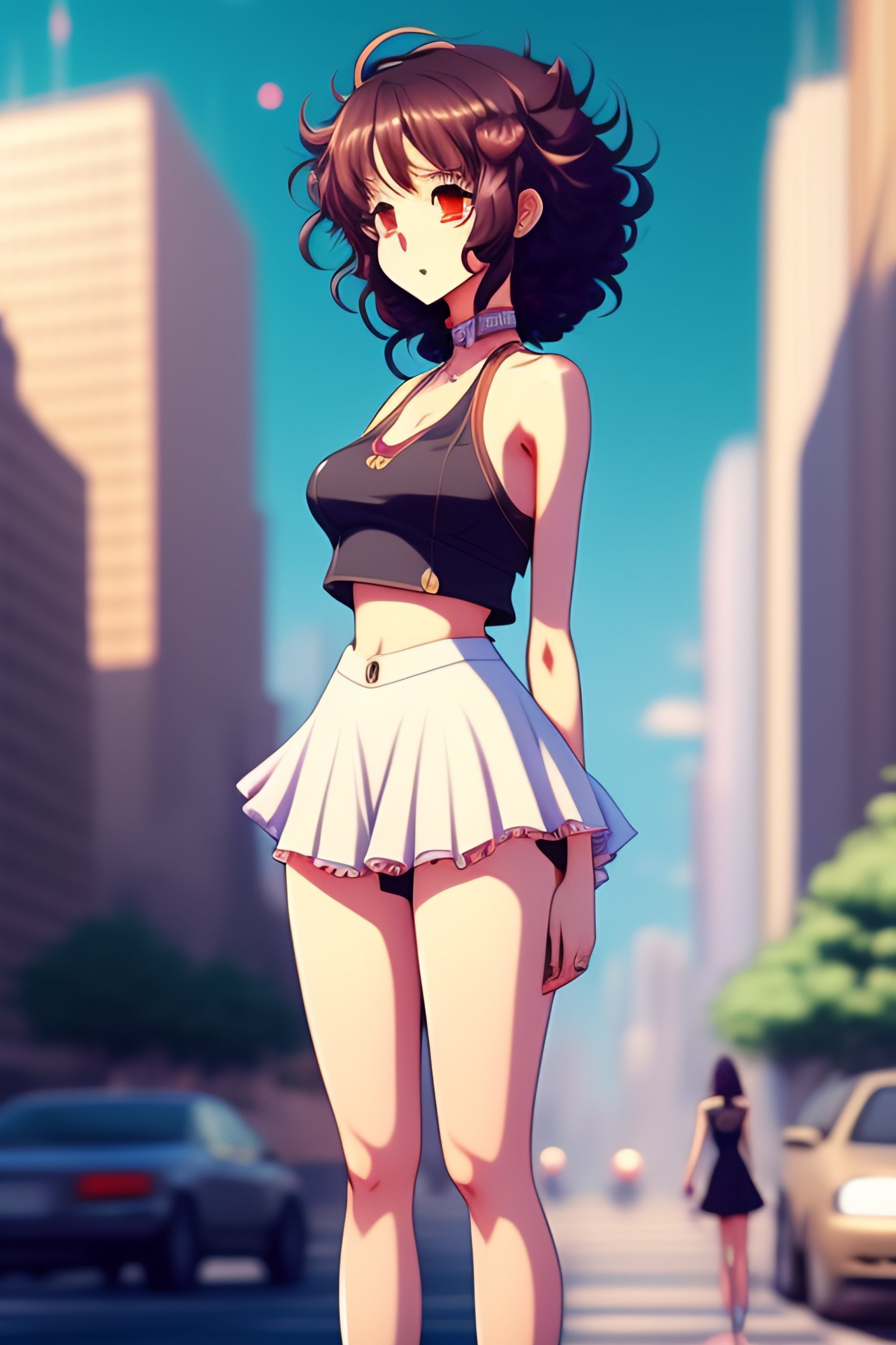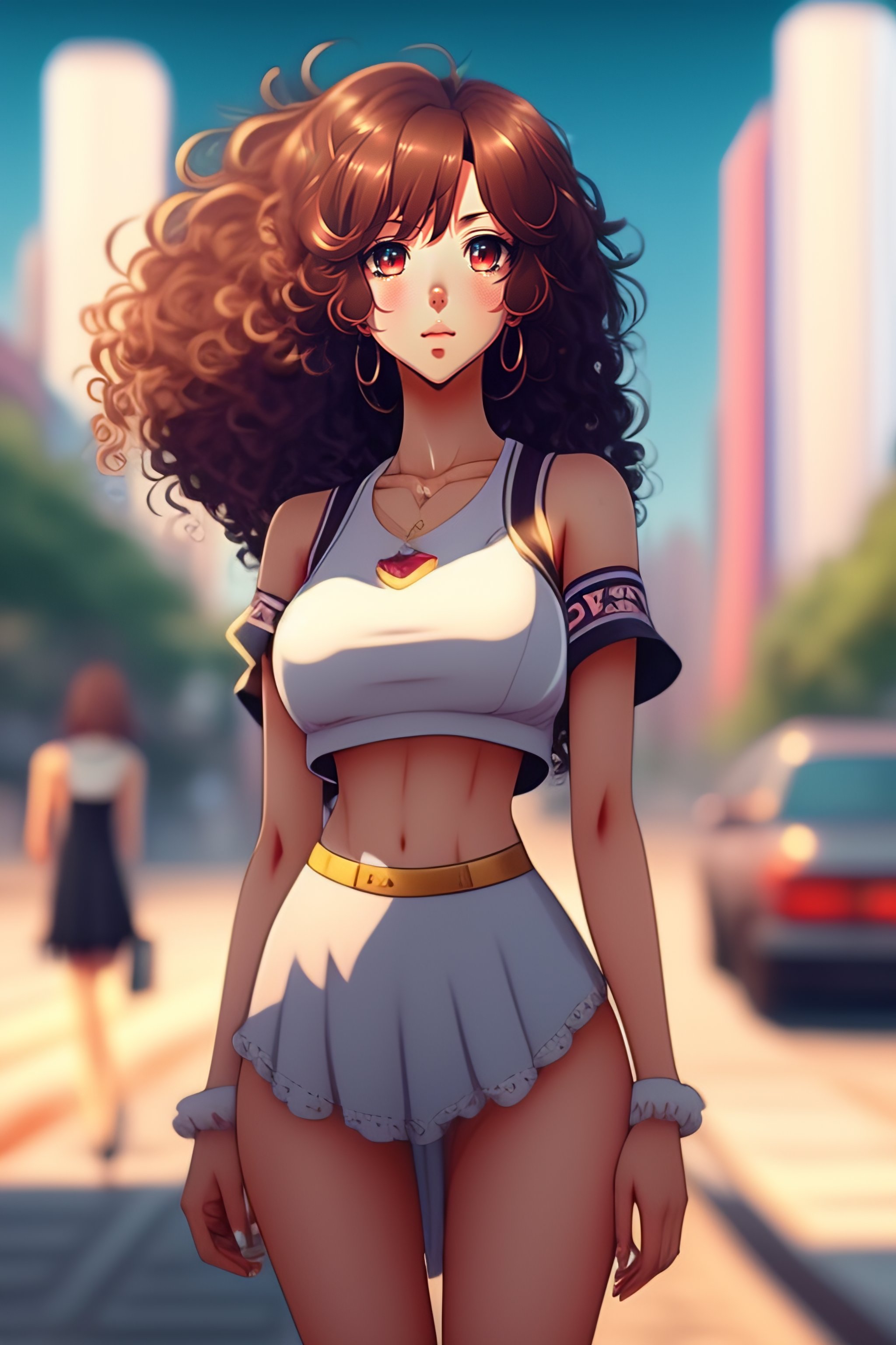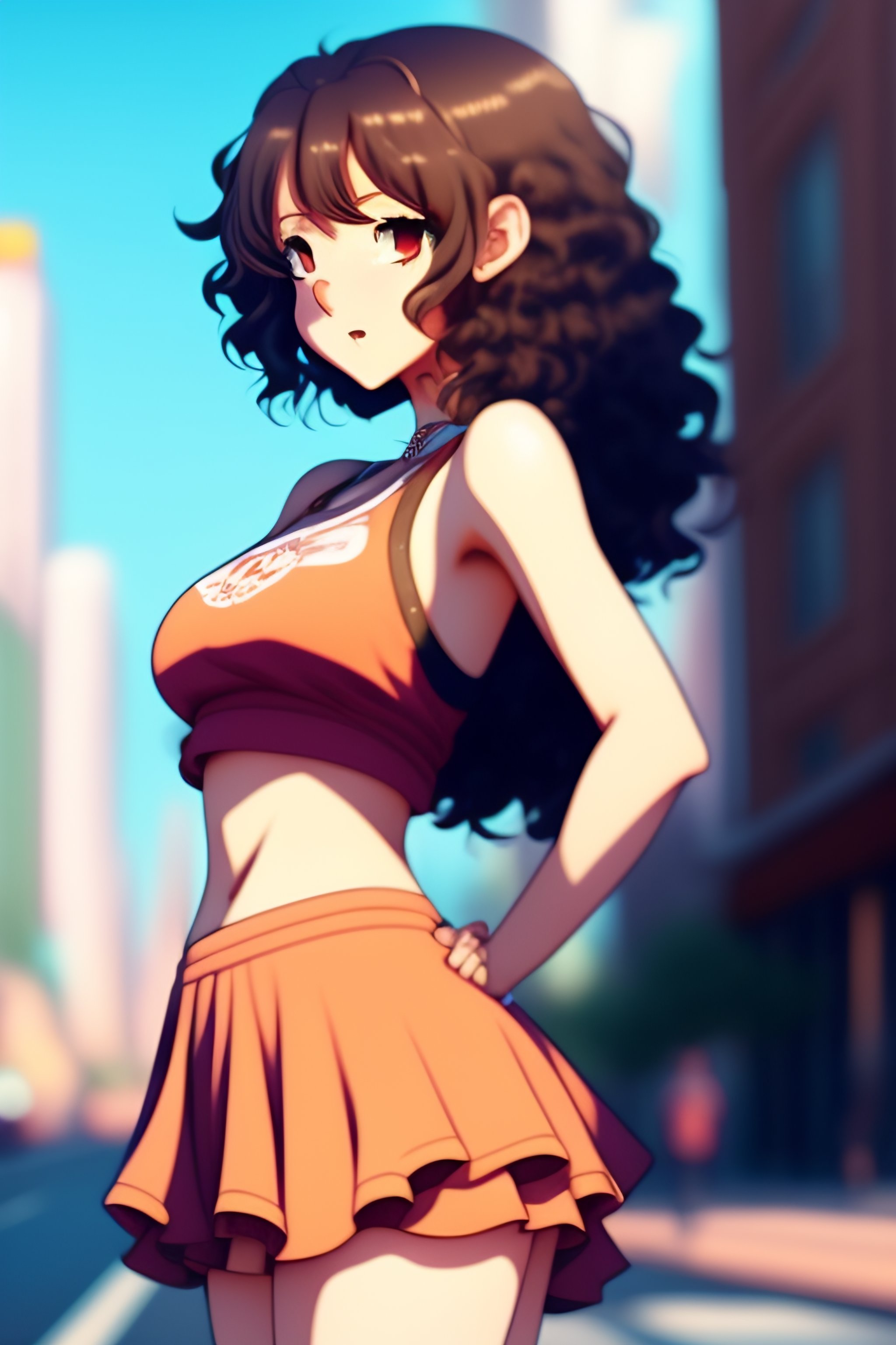 Anime style, cute anime girl, 19 years old, back view, far from camera, medium curly brown hair, skinny, back visible, slim waist, thick, medium bust, hands on hips, short crop top, short skirt, buttocks slightly visible, on side walk in big city