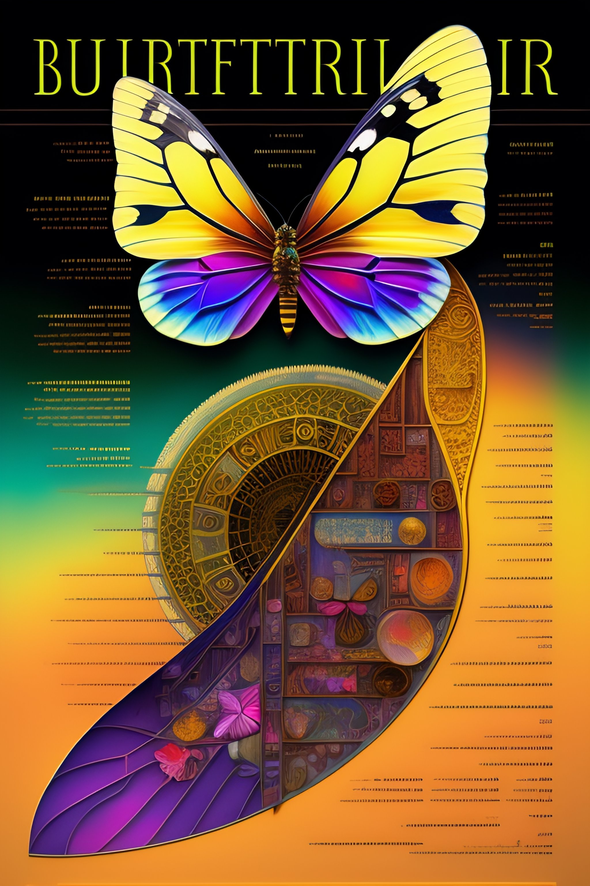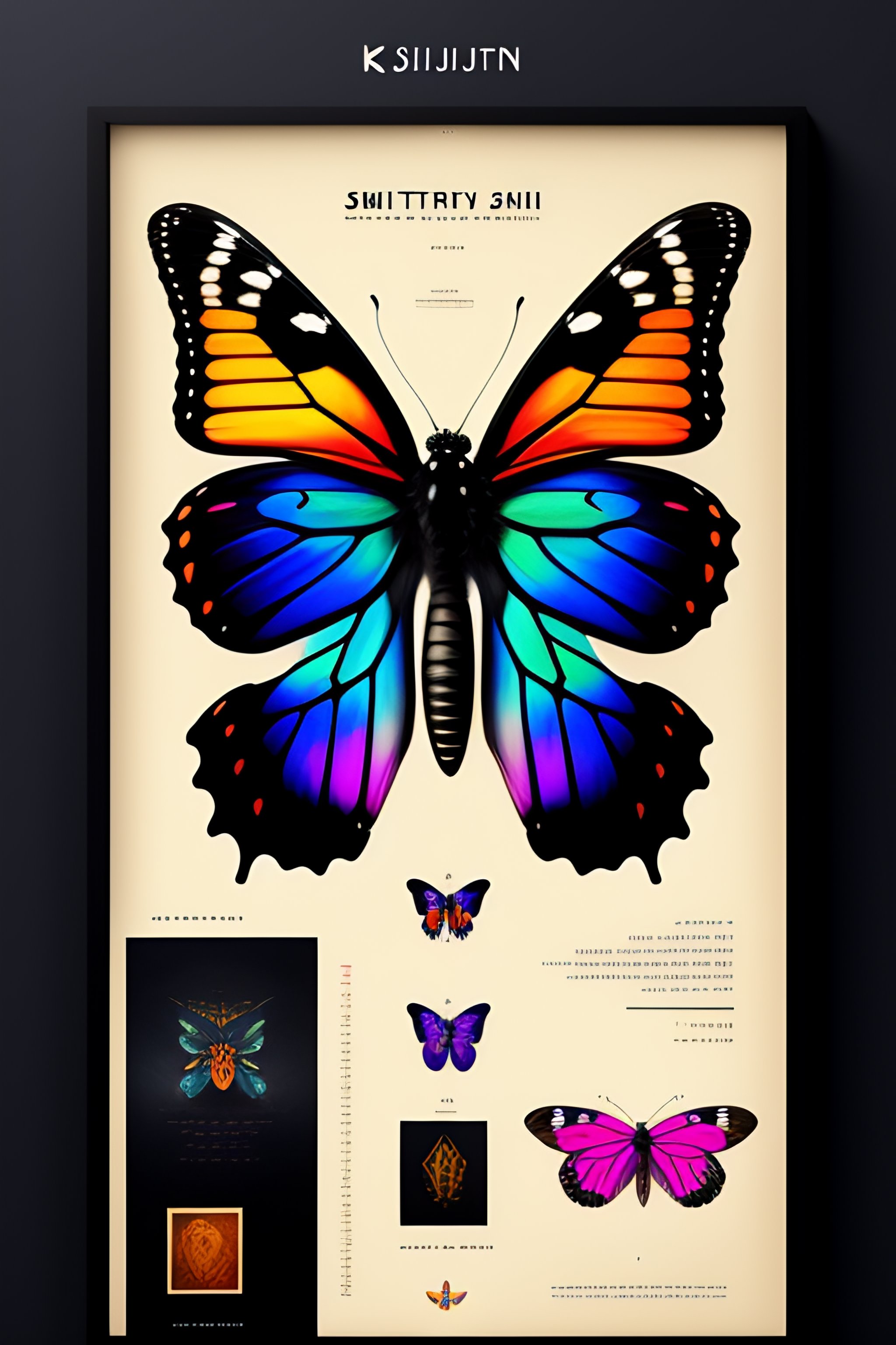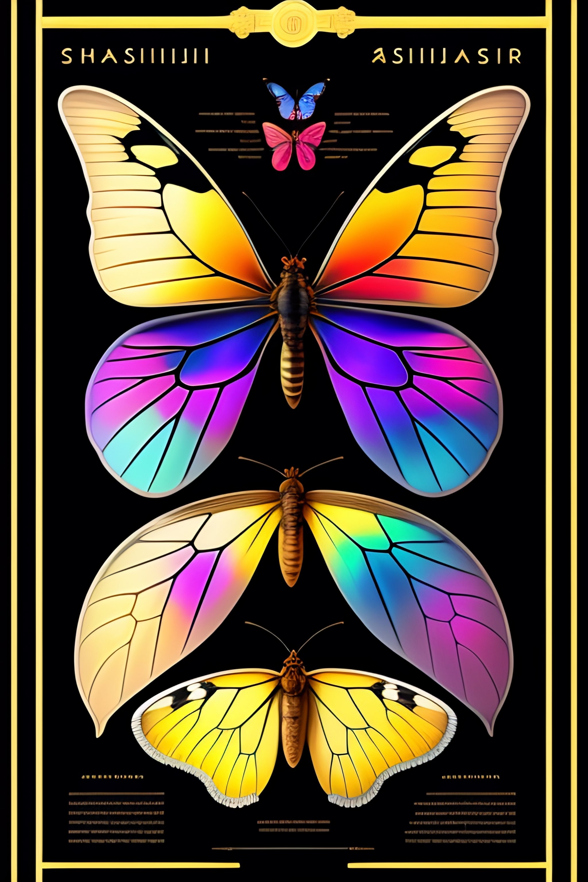 Beautiful butterfly anatomy diagram, bold shūji, chart, schematics, infographic, scientific, measurements, abstract, surreal, collage, new media design, poster, colorful highlights, tarot card, glowing ruins, marginalia, 8k, extremely detailed, dark color palette + style of katsuhiro otomo + masamune shirow + pantone, on black canvas, typography annotations