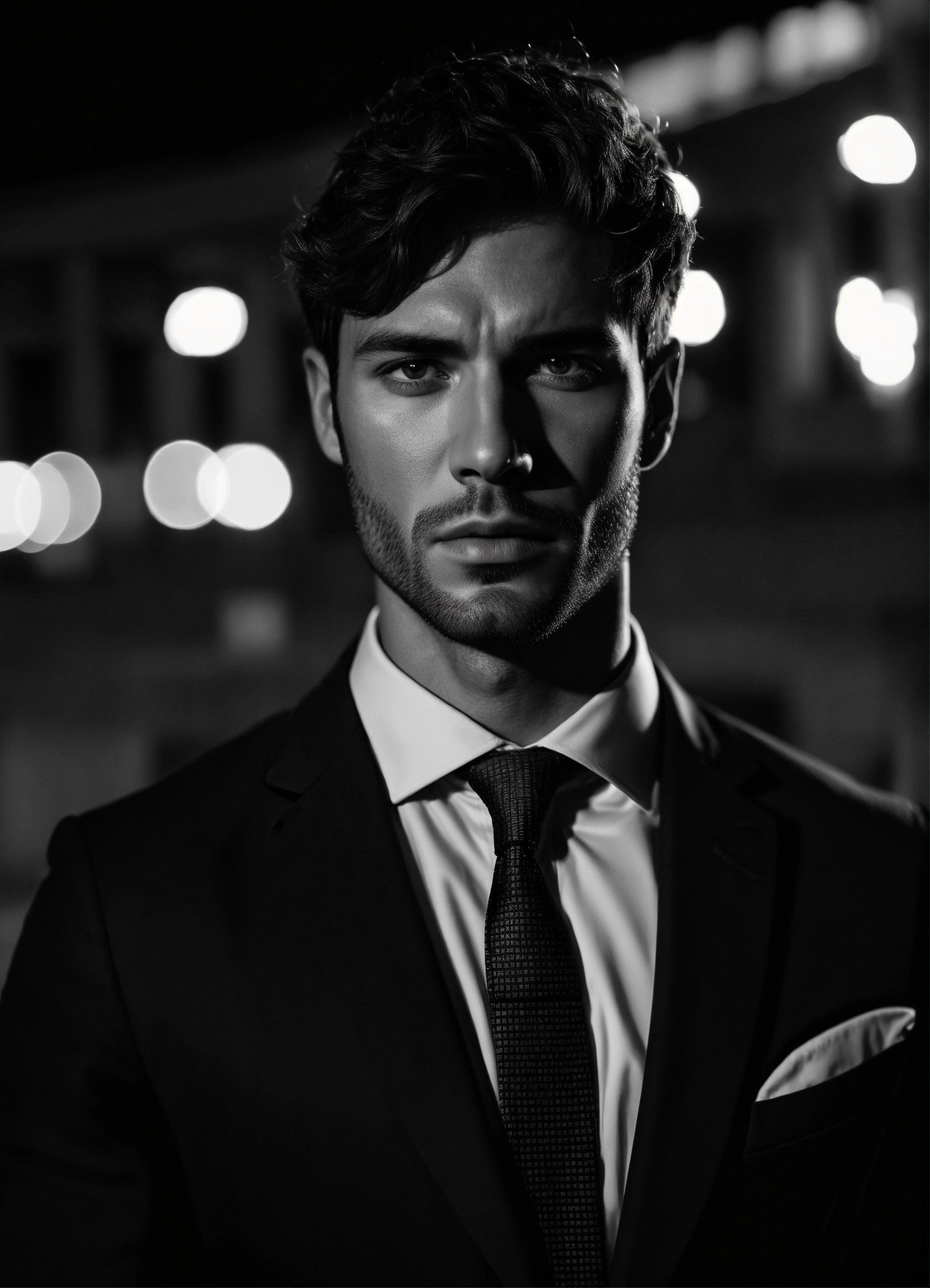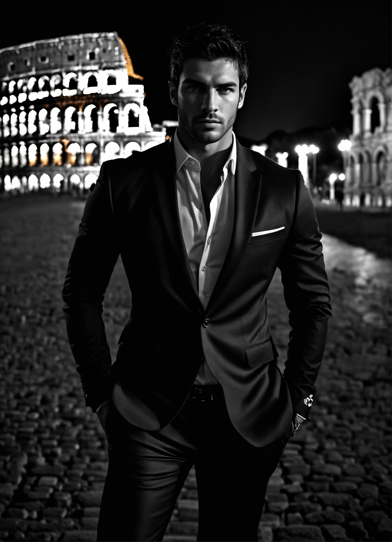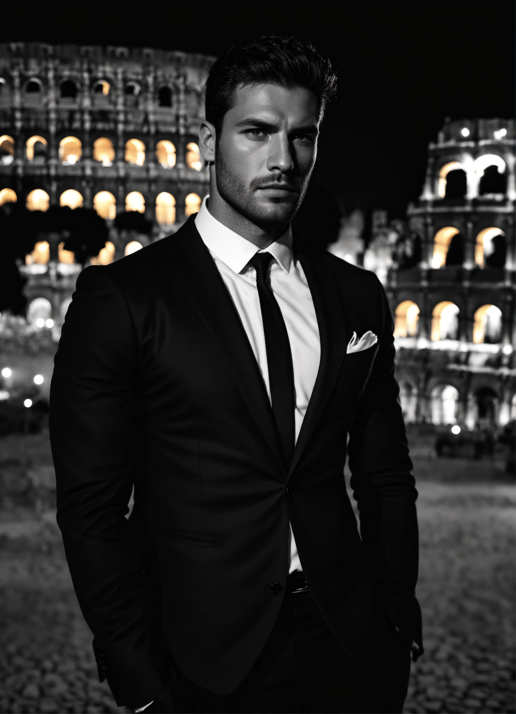 Photo of male model gonçalo teixeira, black and white, realistic, portrait, not painted, very detailed faces, skin with pores, 4k, dark suit, skin not smoothed, desire in the eyes, glowering, looking into the camera, dark shirt. colosseum in rome in full view at night as background