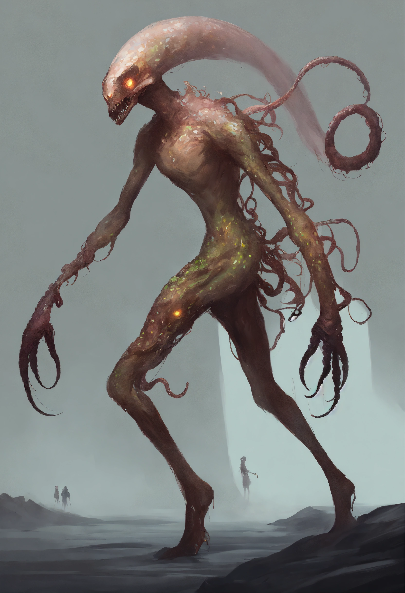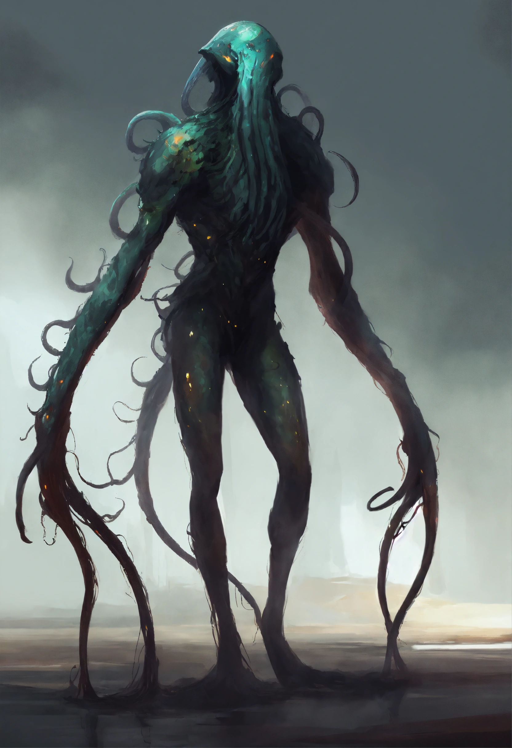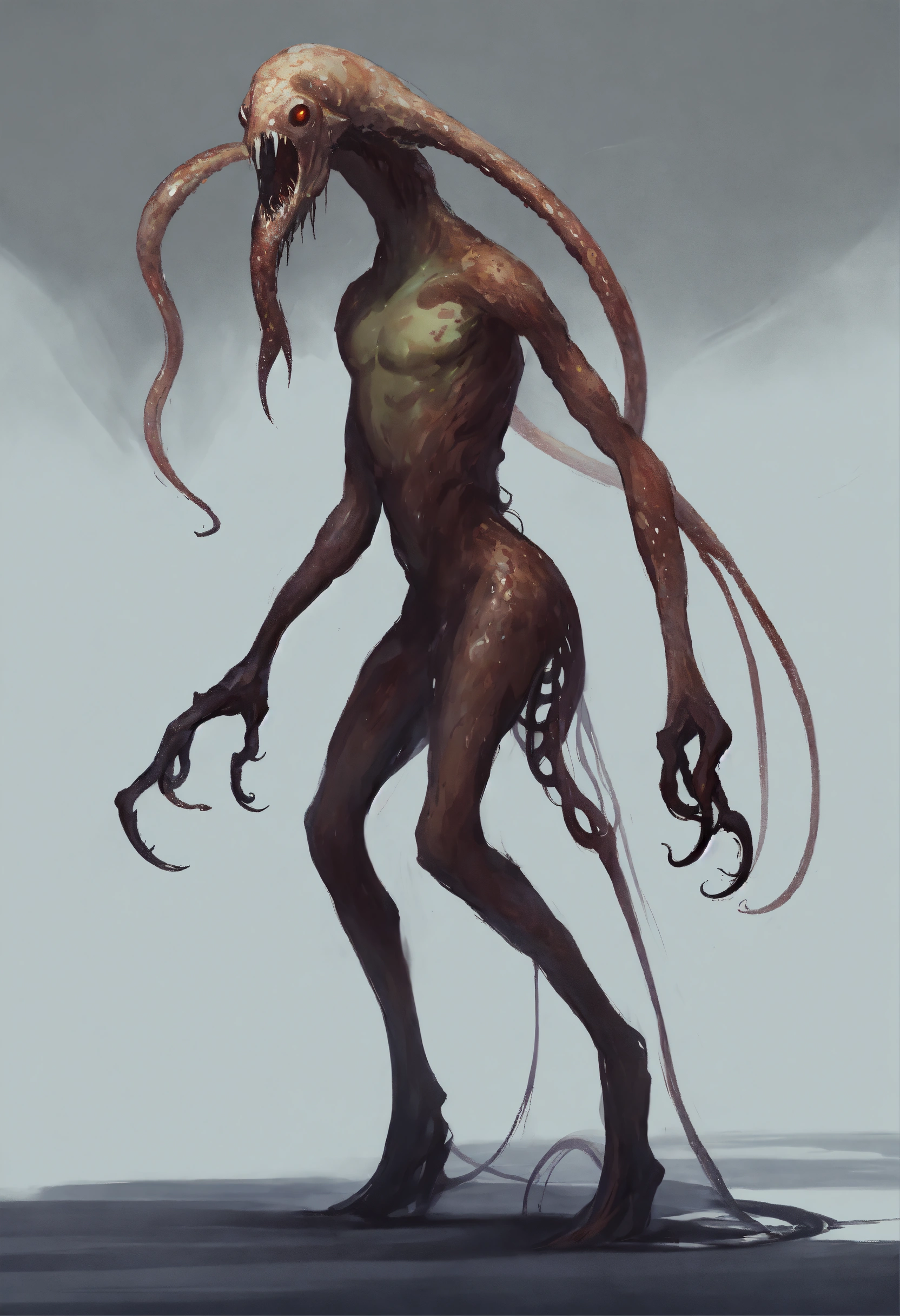 Concept art, side view, digital paintng, skiny ghostly monster, two long legs, tentacle arms, dark skin, clean white background