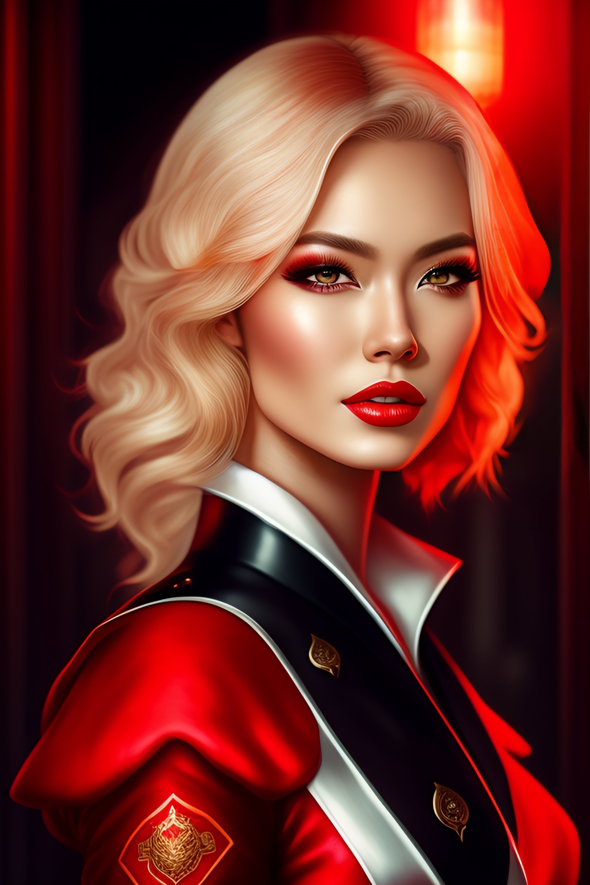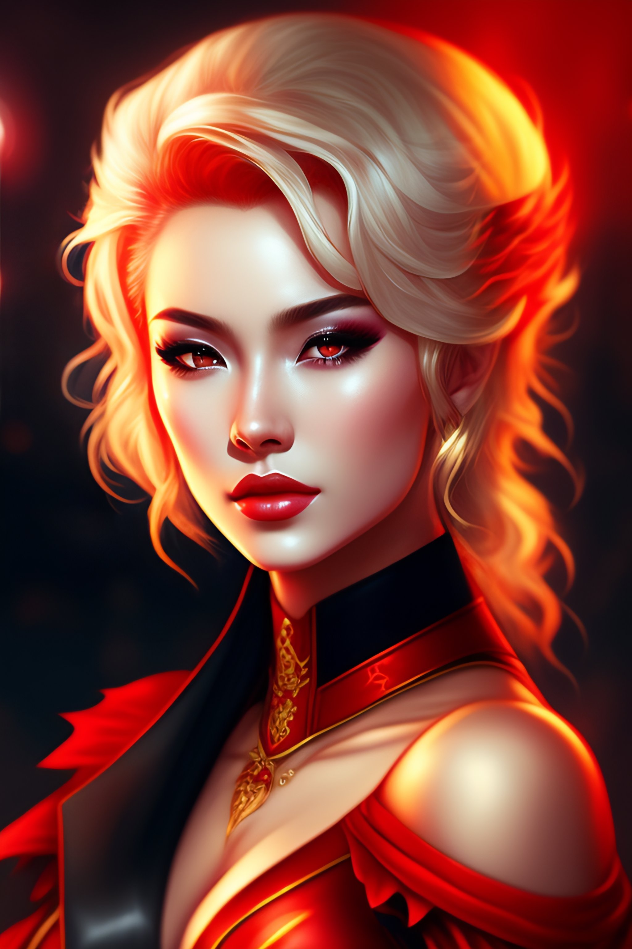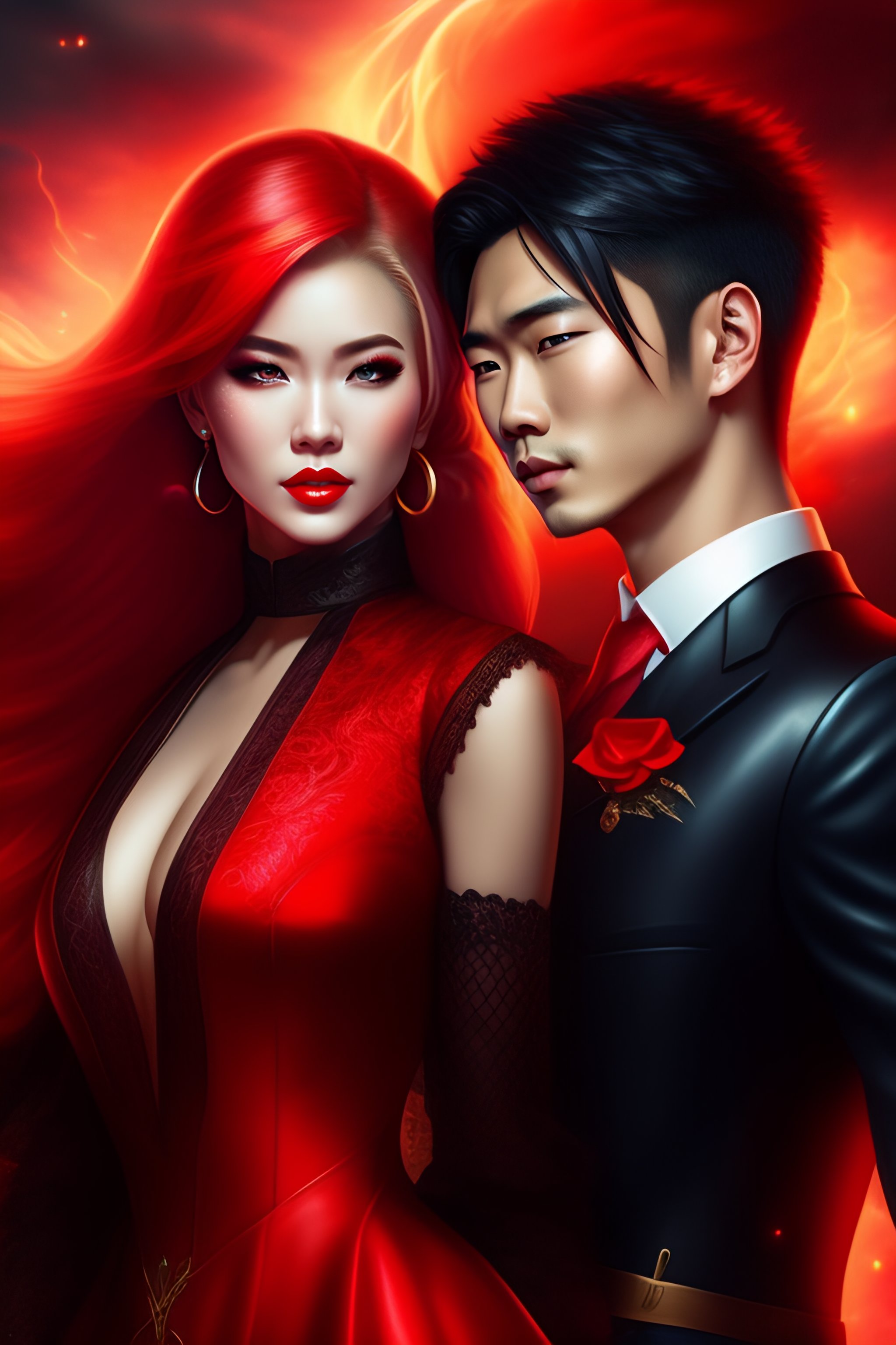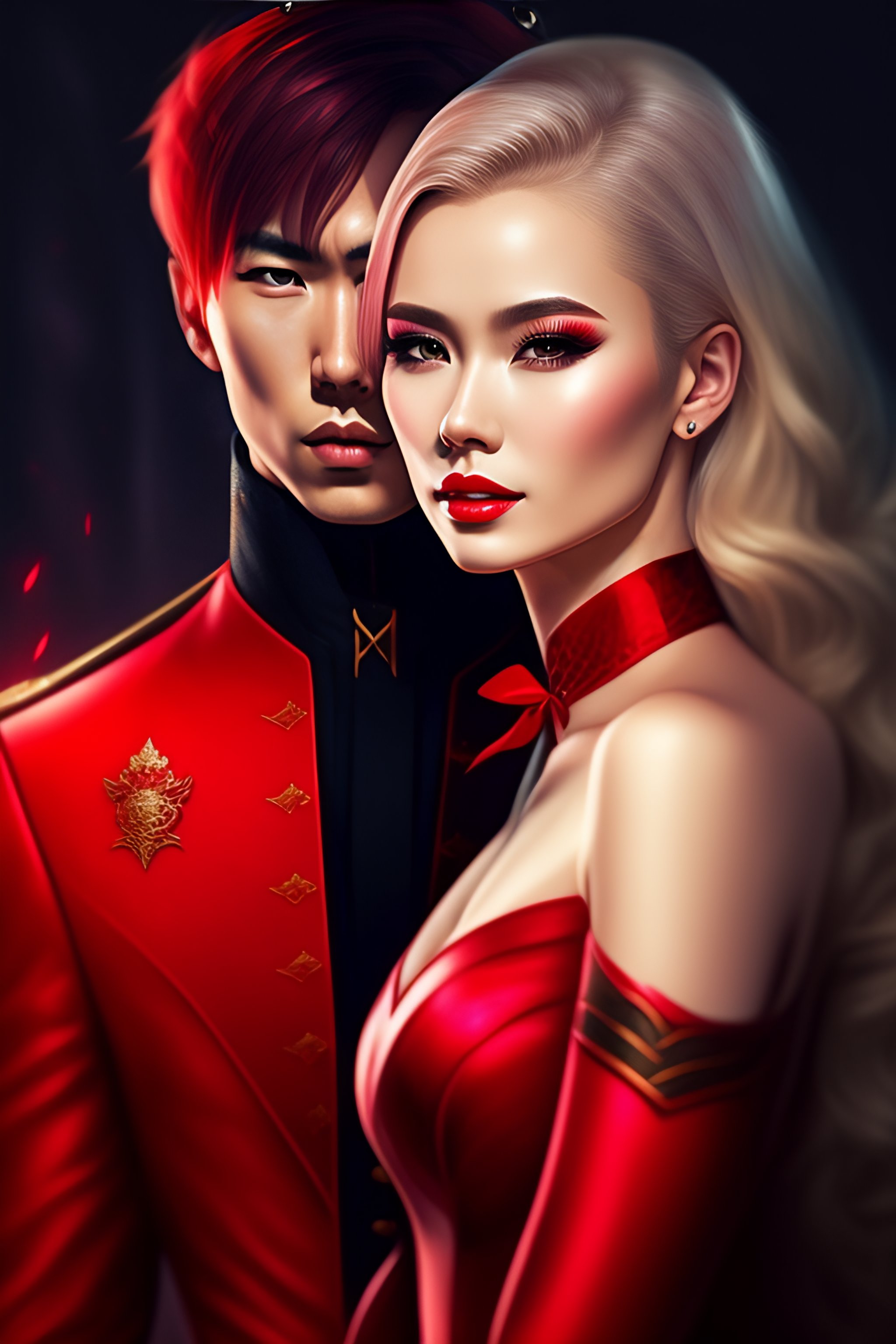 Short blonde hair woman in red dress and handsome japanese vampire young man in black police costume, full body portrait, relax faces, gothic, lightning, long blonde hair, magic, fantasy style, ultra-detailed, art, digital art, 4k, light background style --v 4