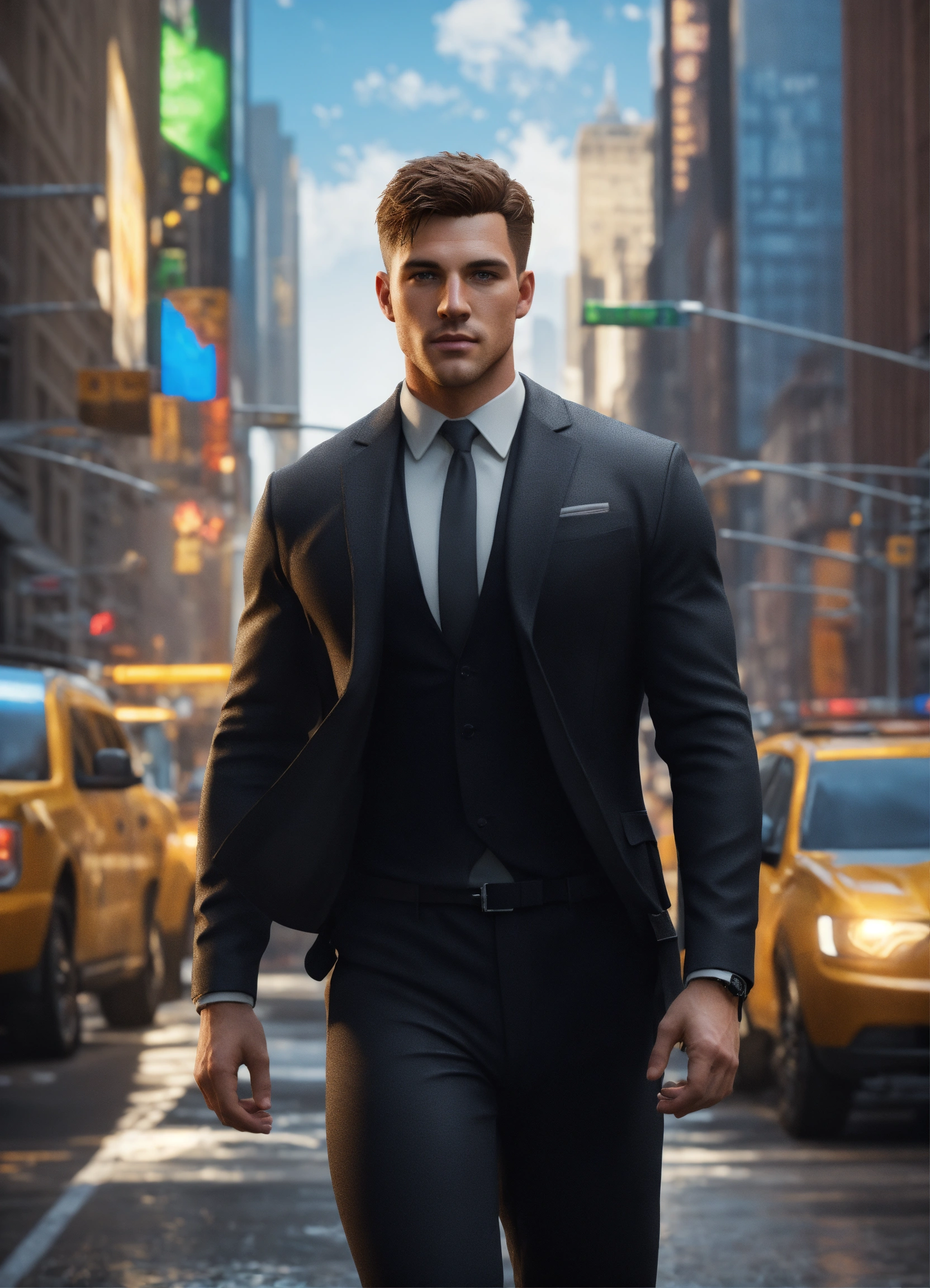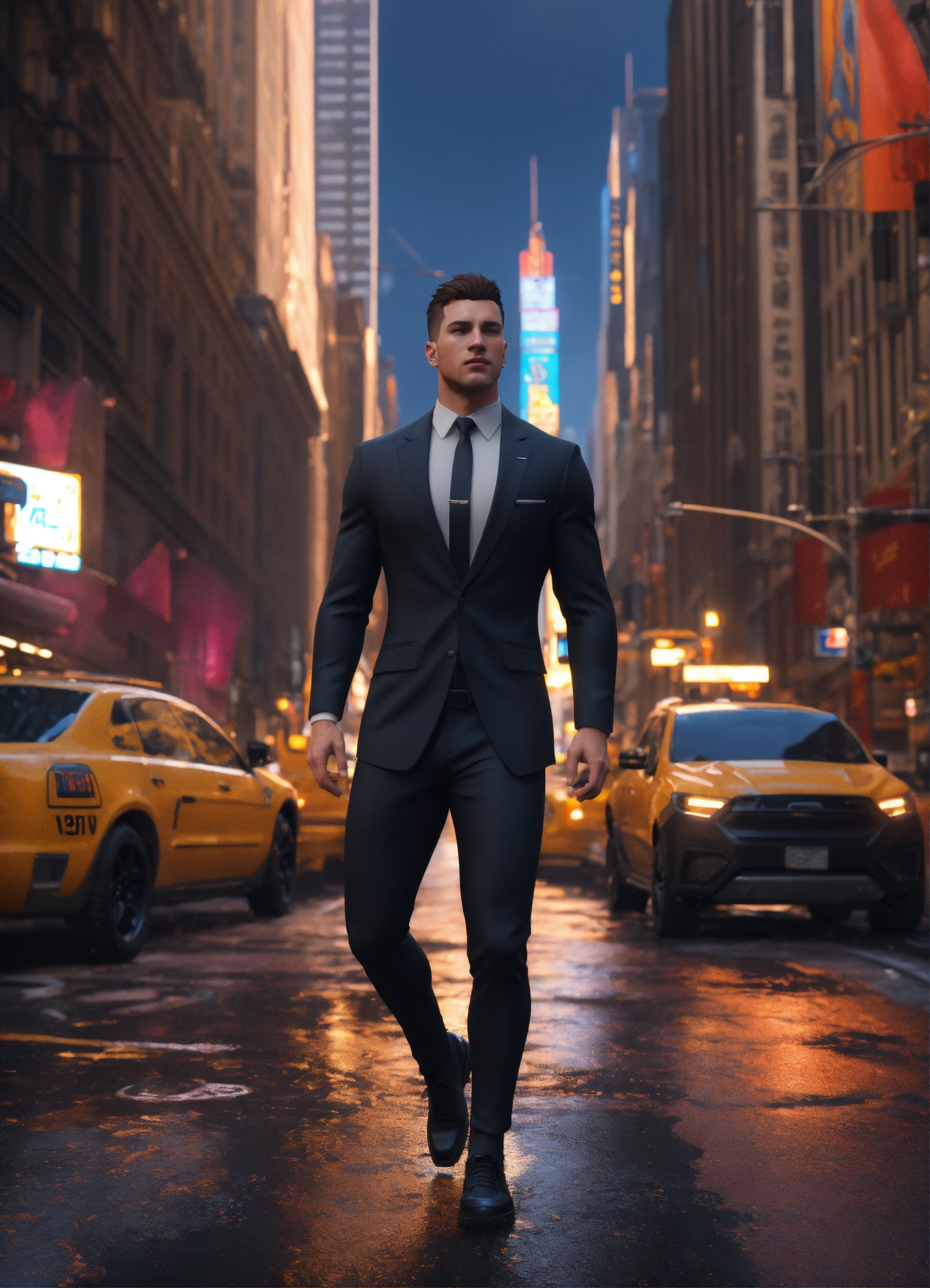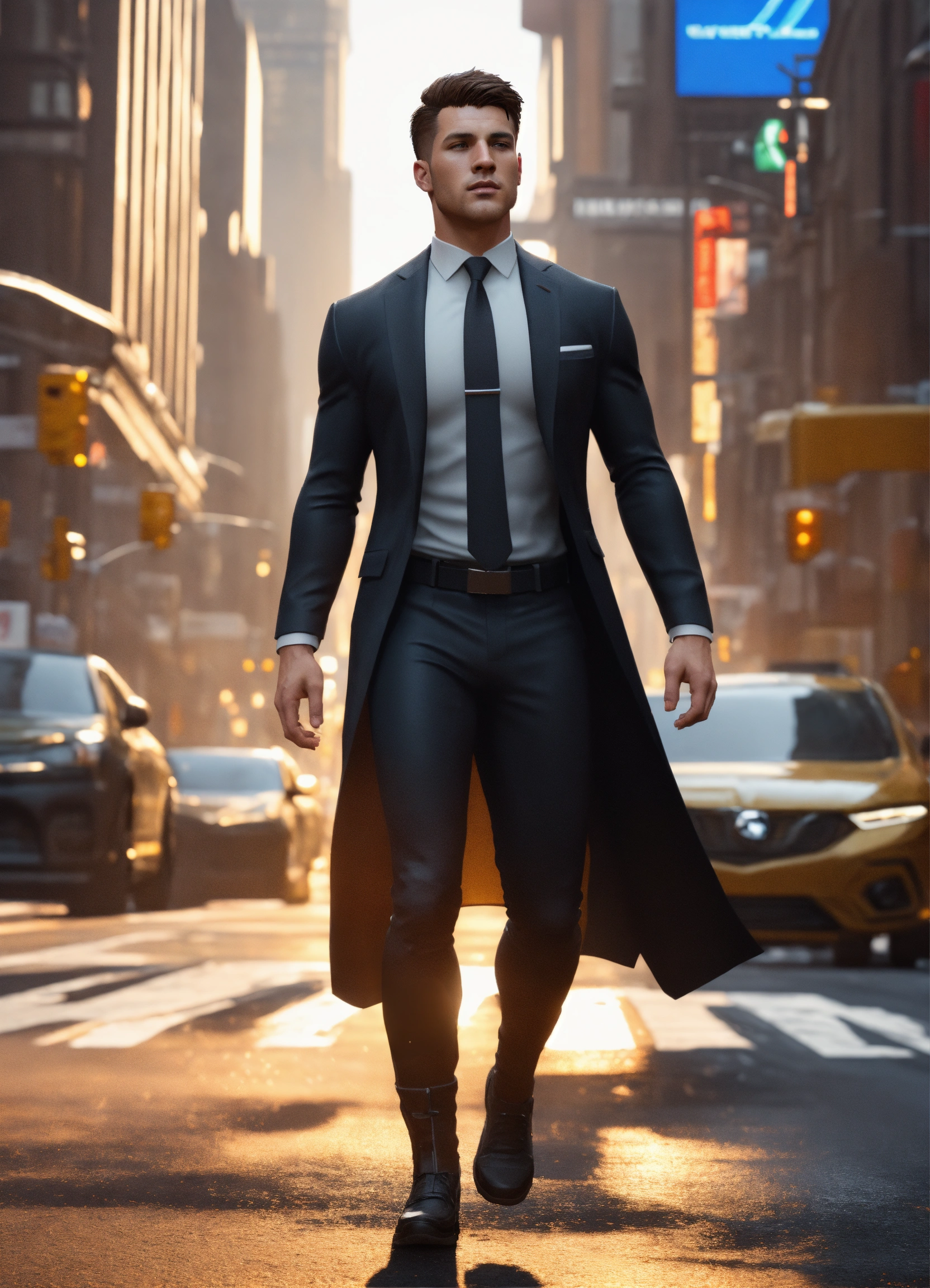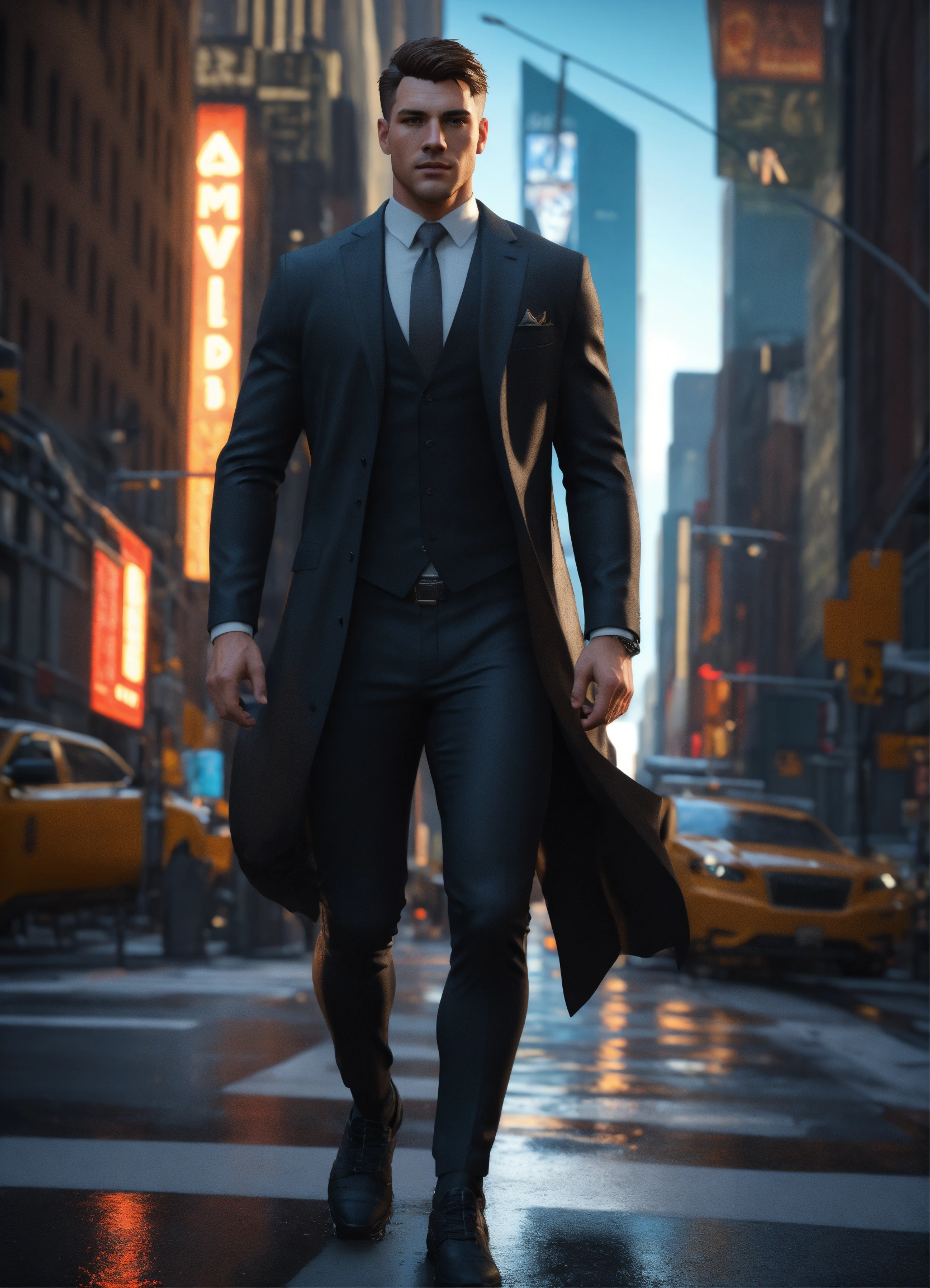 Full body of a handsome, athletic white male, with short brown hair, perfect face clean shaven, a very handsome athletic man, a hero wearing a black stealth suit, in a new york city full body, 8k resolution concept art portrait dynamic lighting hyperdetailed intricately detailed splash art trending on artstation unreal engine 5 volumetric lighting